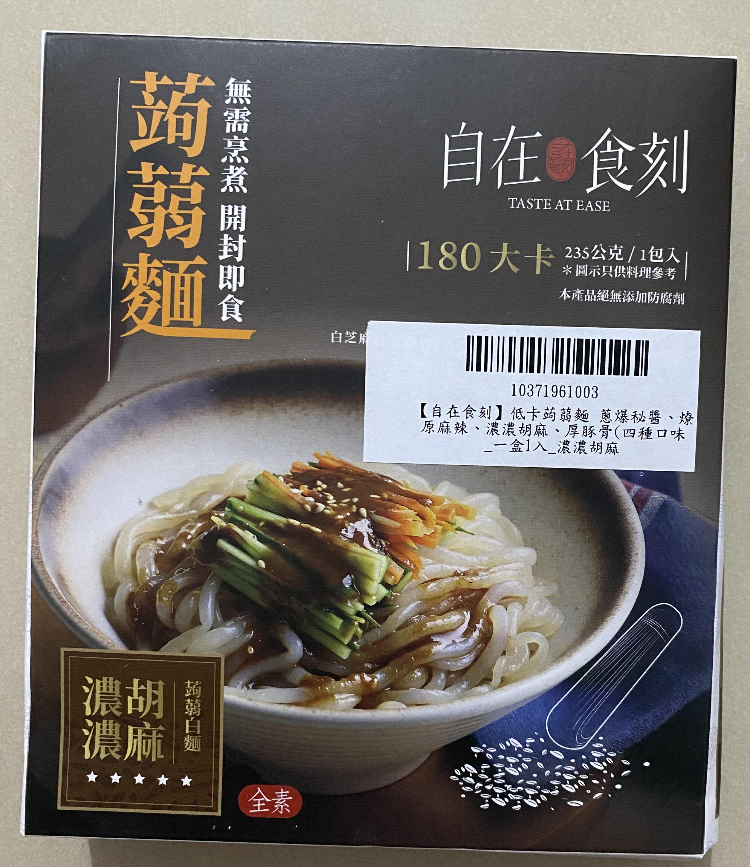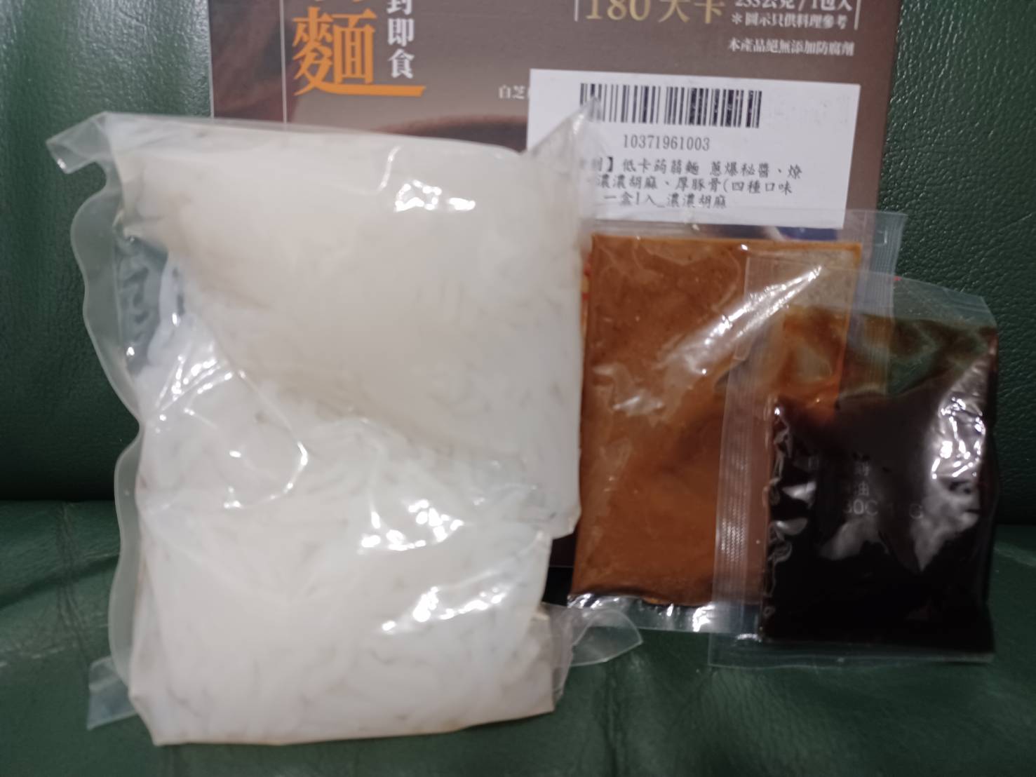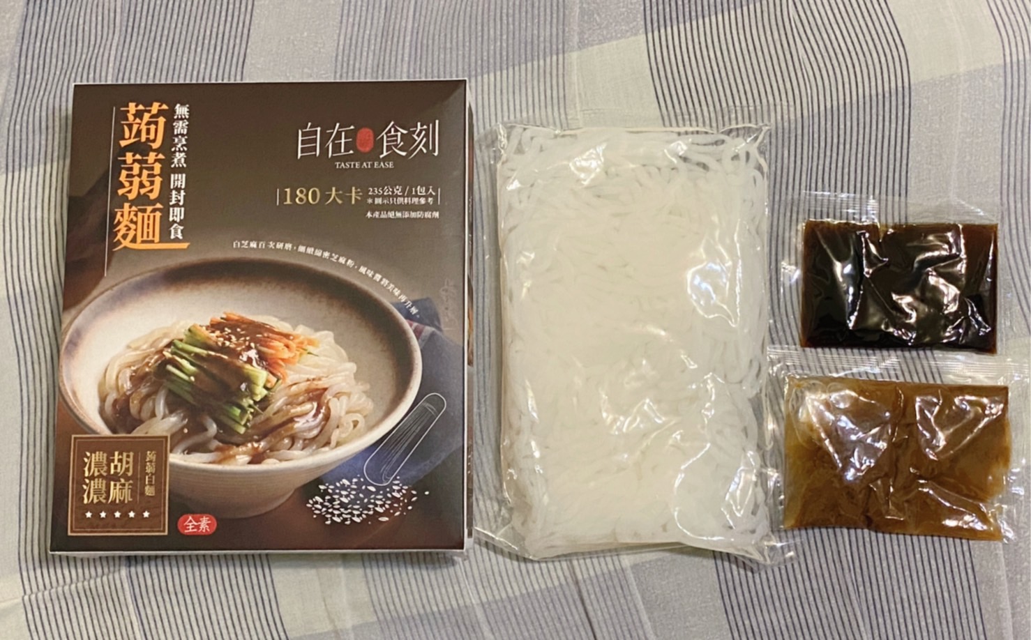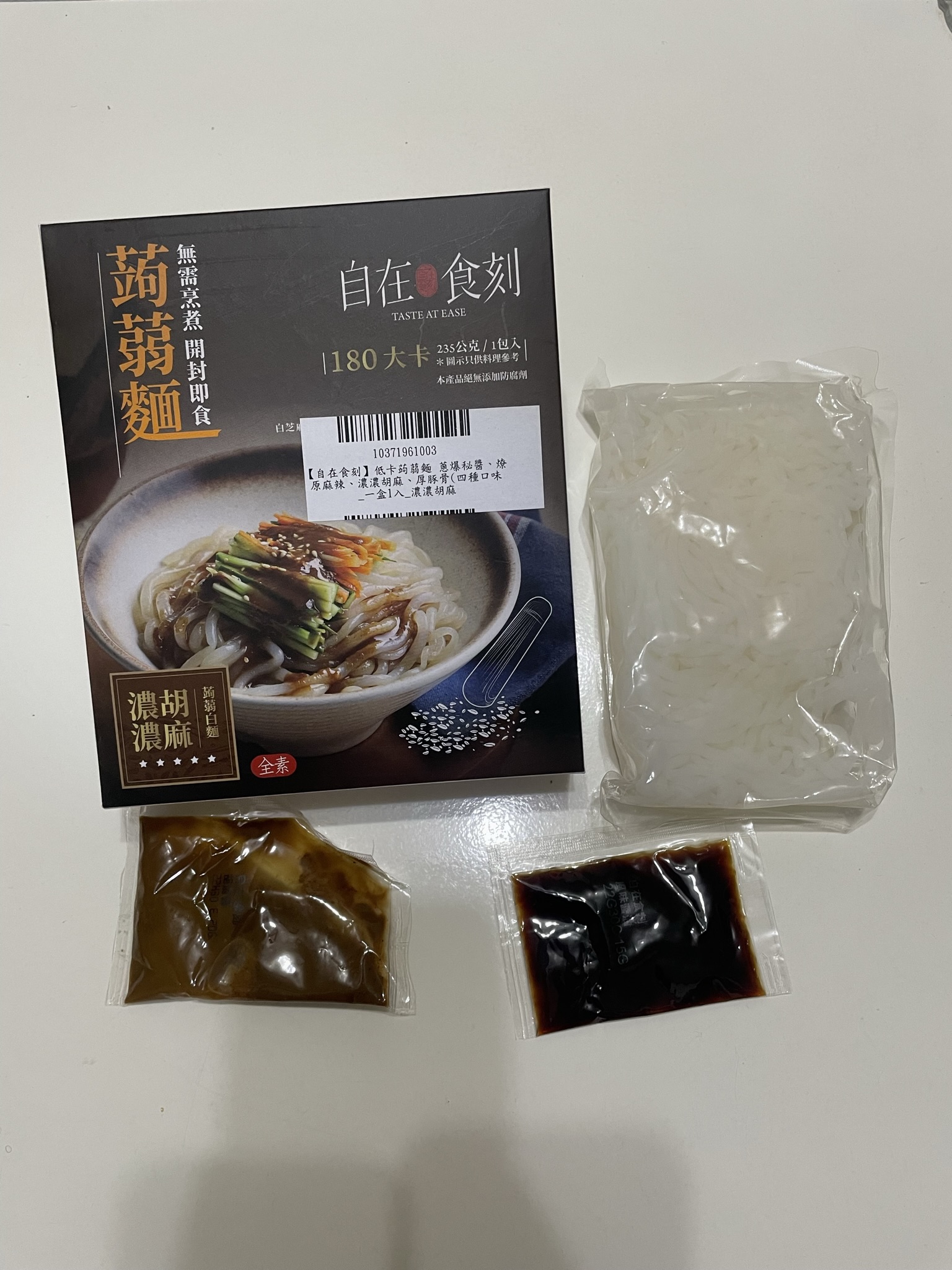 蒟蒻麵:水、蒟蒻精粉、食用氫氧化鈣(凝固用) 胡麻醬:芝麻醬(芝麻)、大豆油、芥花油、黑芝麻、抗氧化劑(混合濃縮生育醇) 風味醬油:水、釀造醬油、蔗糖、果糖、食鹽、L-鈦酸鈉、調味劑(5'-鳥嘌呤核苷 磷酸二鈉、5'-次黃嘌呤核苷磷酸二鈉)、多磷酸鈉、焦糖色素、玉米糖膠、調味 料(小麥發酵蛋白、酵母抽出物、糊精)、甜味劑(甘草萃)