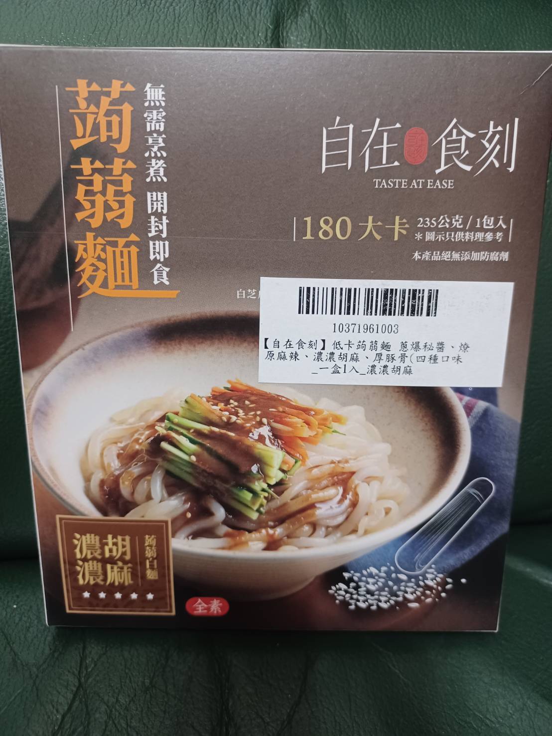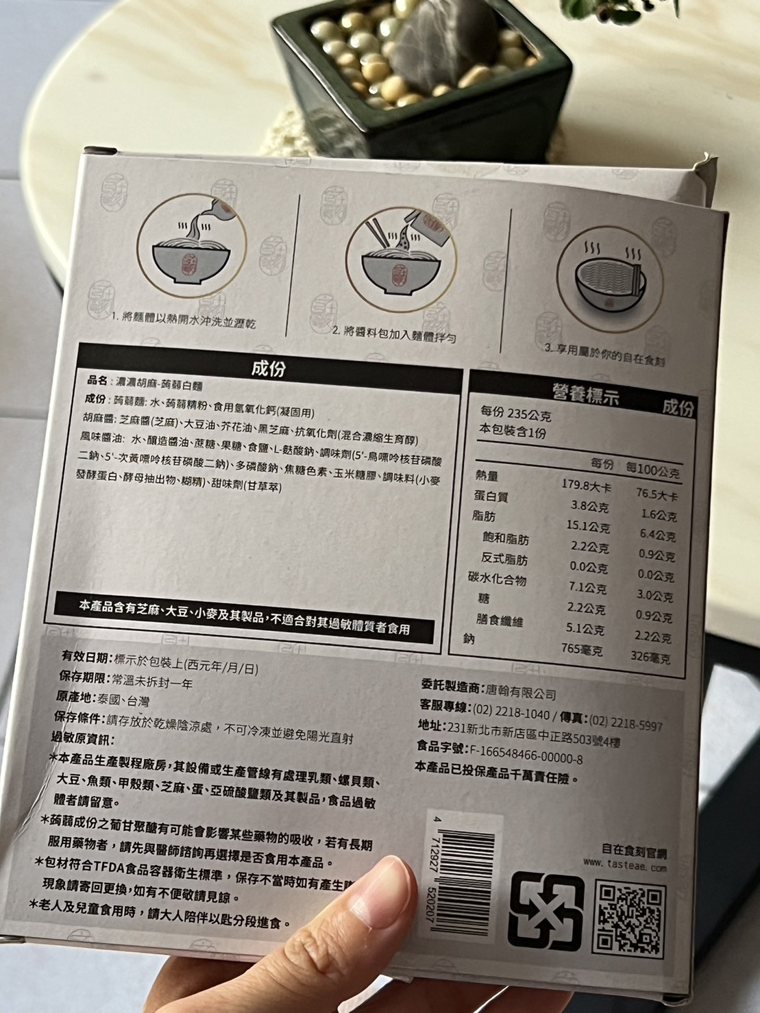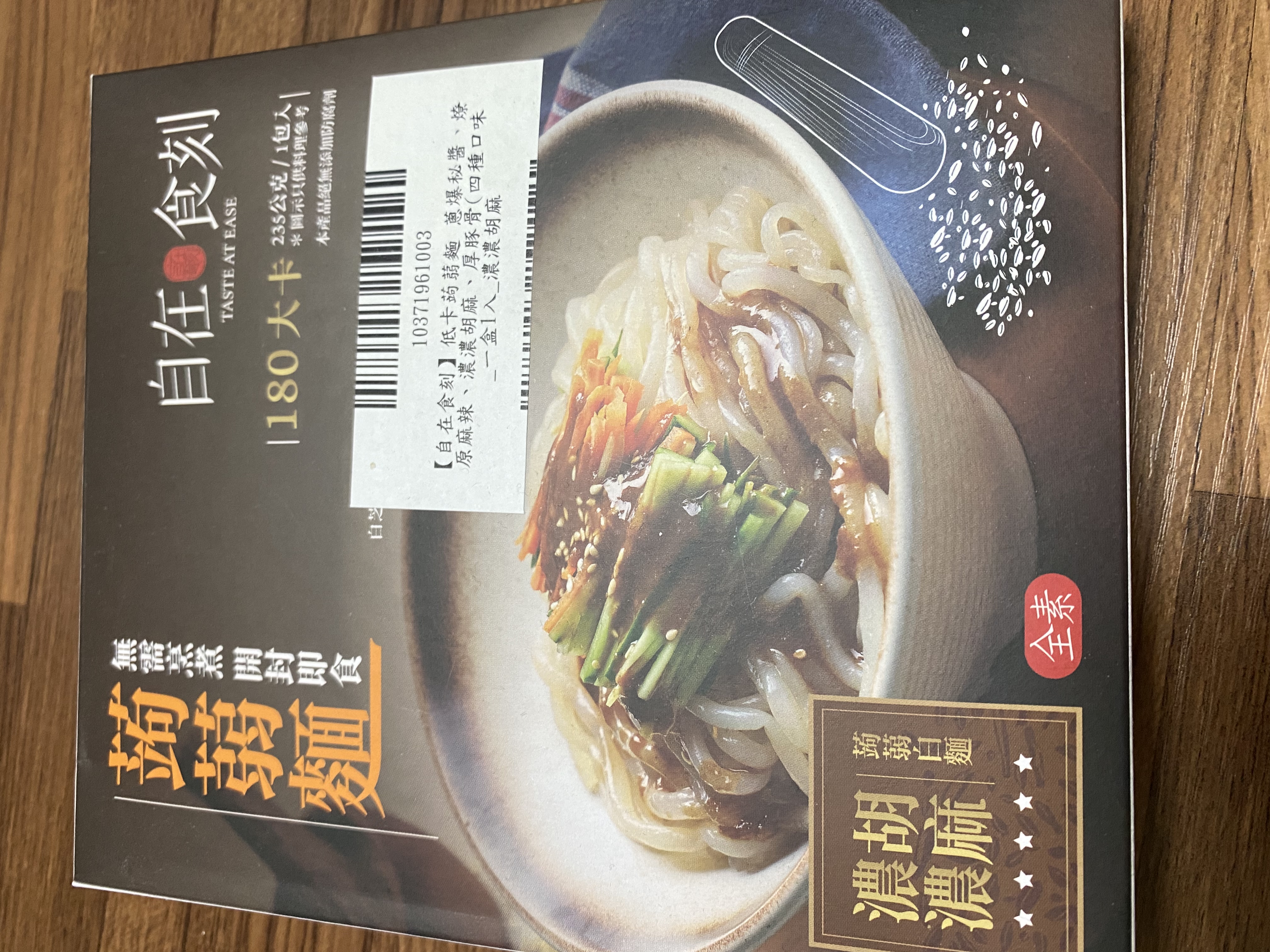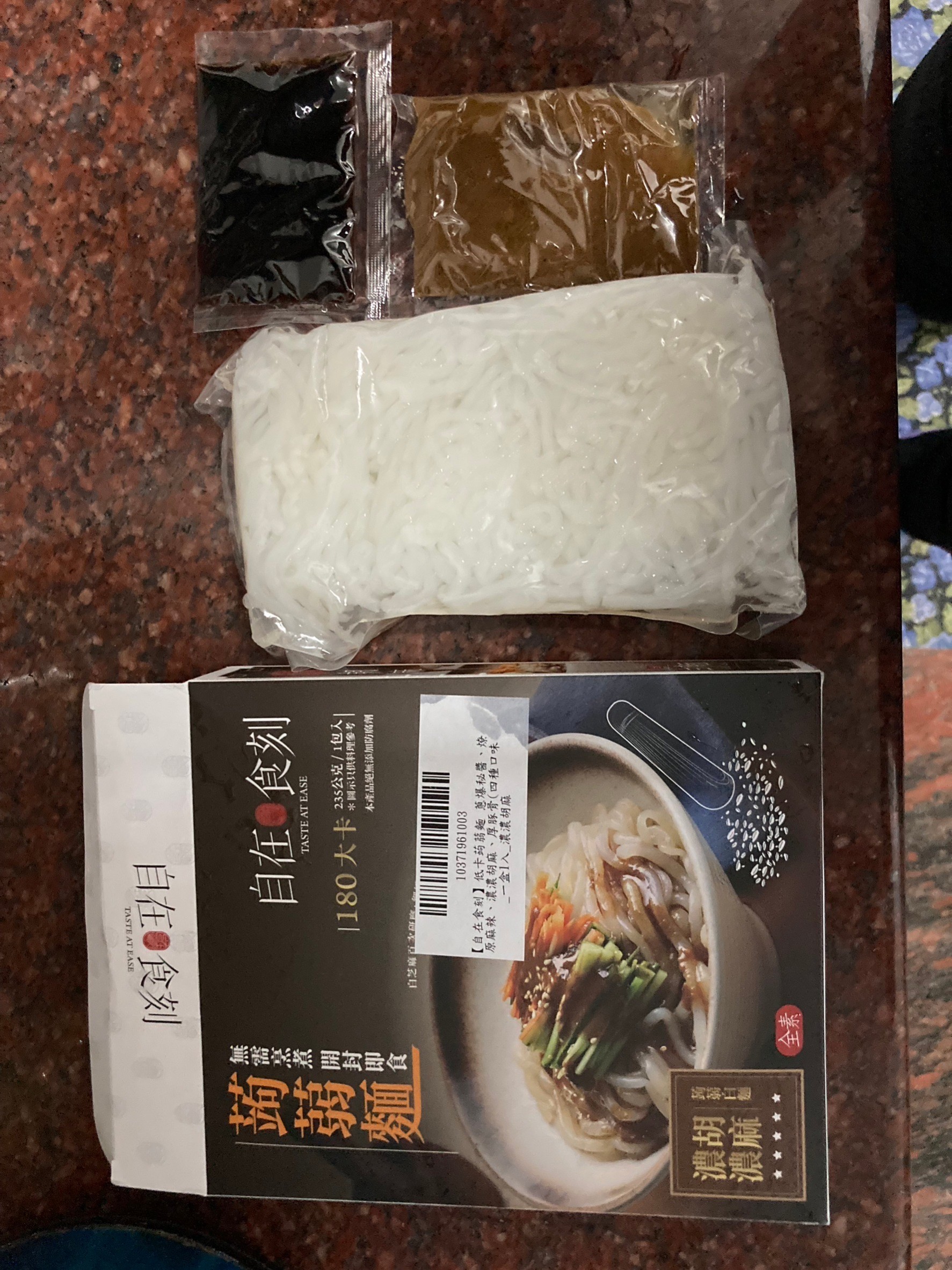 蒟蒻麵:水、蒟蒻精粉、食用氫氧化鈣(凝固用) 胡麻醬:芝麻醬(芝麻)、大豆油、芥花油、黑芝麻、抗氧化劑(混合濃縮生育醇) 風味醬油:水、釀造醬油、蔗糖、果糖、食鹽、L-鈦酸鈉、調味劑(5'-鳥嘌呤核苷 磷酸二鈉、5'-次黃嘌呤核苷磷酸二鈉)、多磷酸鈉、焦糖色素、玉米糖膠、調味 料(小麥發酵蛋白、酵母抽出物、糊精)、甜味劑(甘草萃)