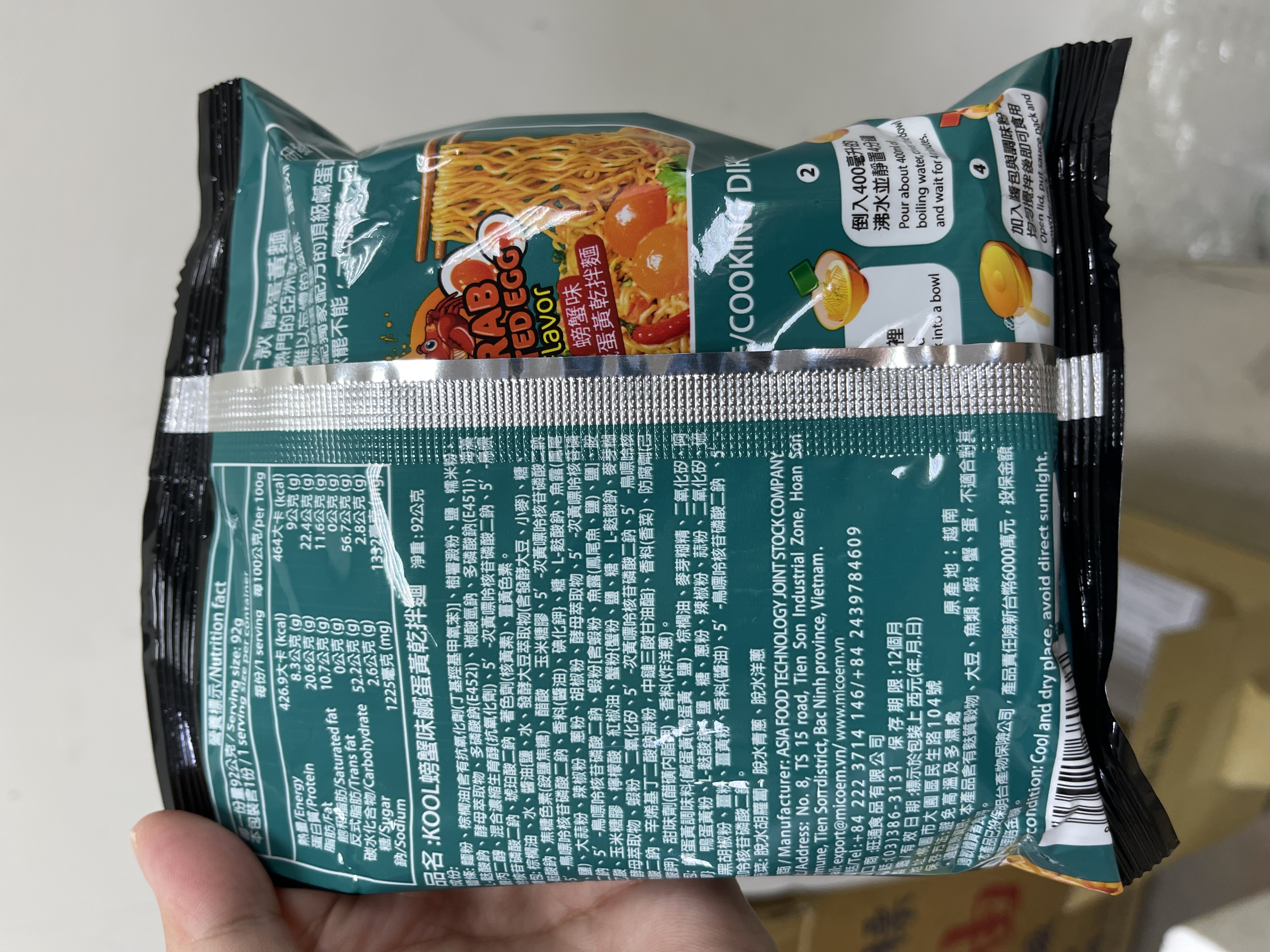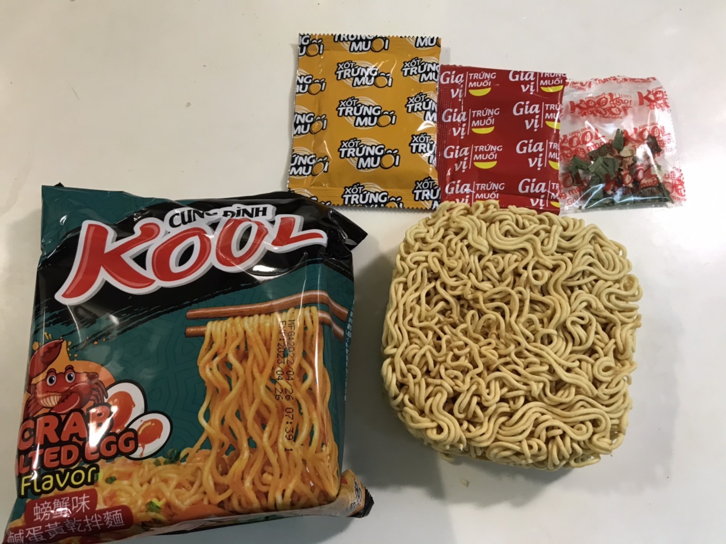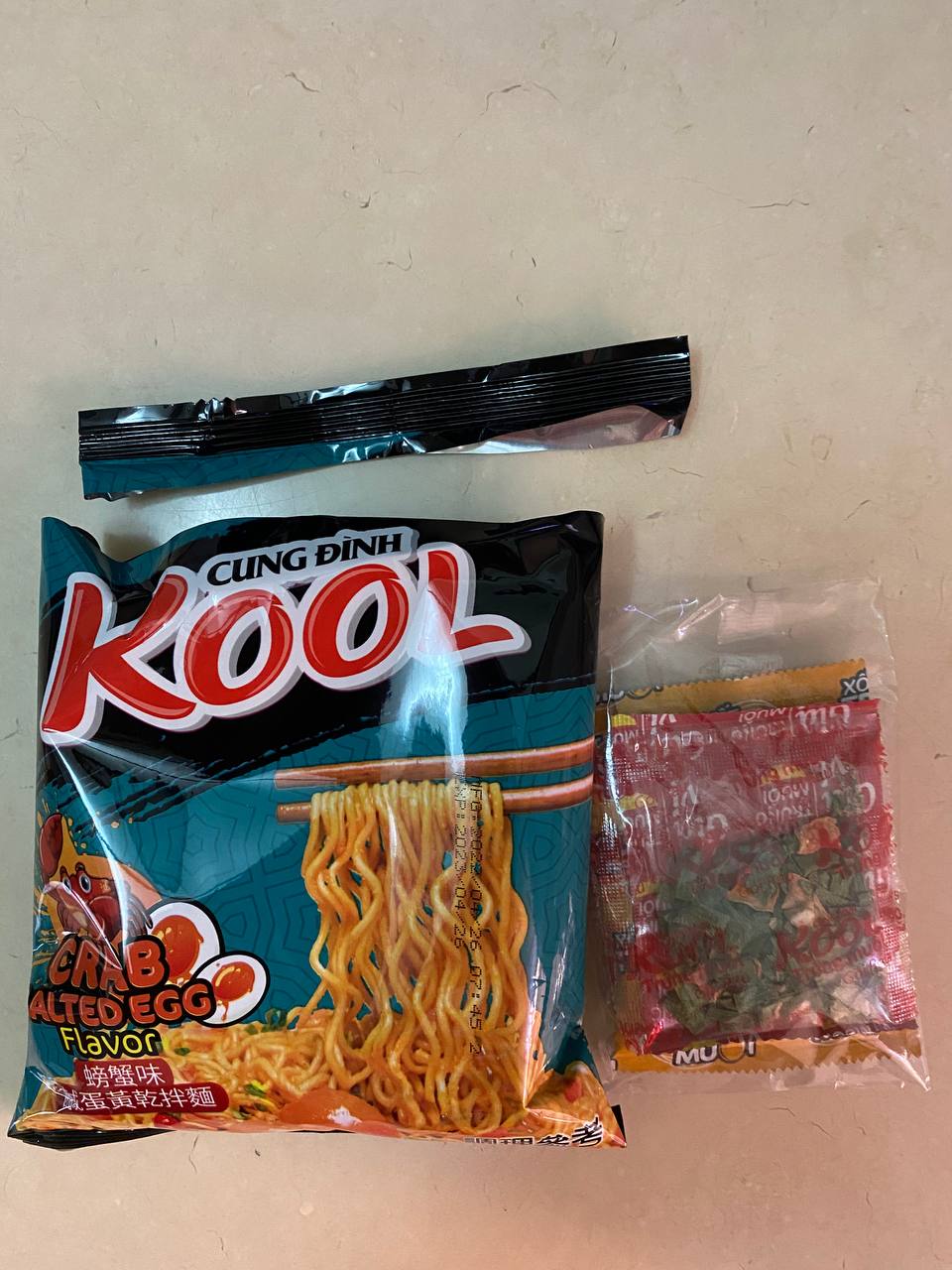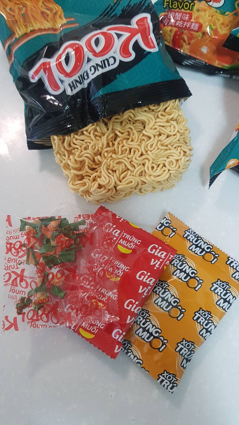 醬包:棕櫚油 、水、醬油{鹽、水、發酵大豆萃取物(含發酵大豆、小麥)、糖、L-麩酸鈉、焦糖色素(銨鹽焦糖)、醋酸 、玉米糖膠、5-次黃嘌呤核苷磷酸二鈉、5-鳥嘌呤核苷磷酸二鈉、香料(醬油)、碘化鉀}、糖、L-麩酸鈉、魚露(鳳尾魚、鹽)、大蒜粉、辣椒粉、蔥粉、胡椒粉、酵母萃取物、5-次黃嘌呤核苷磷酸二鈉、5-鳥嘌呤核苷磷酸二鈉、蝦粉[含蝦粉、魚露(鳳尾魚、鹽)、鹽]、胺基乙酸、玉米糖膠、檸檬酸、紅椒油、蟹粉{蟹粉、鹽、糖、 L-麩酸鈉、麥芽糊精、酵母萃取物、蝦粉、二氧化矽、5-次黃嘌呤核苷磷酸二鈉、5-鳥嘌呤核苷磷酸二鈉、辛烯基丁二酸鈉澱粉, 中鏈三酸甘油酯}、香料(香菜)、防腐劑(己二烯酸鉀)、甜味劑(醋磺內酯鉀)、香料(炸洋蔥)。