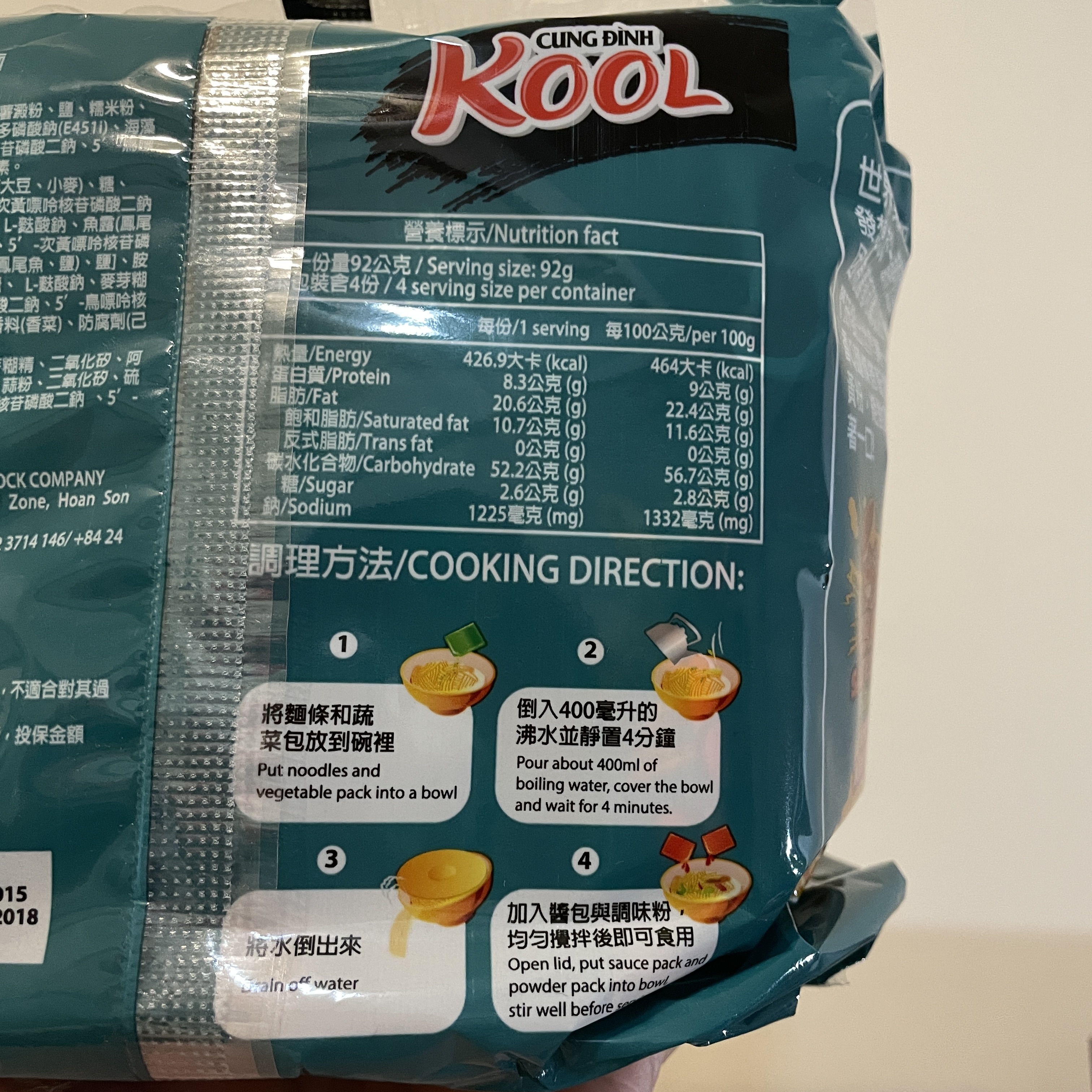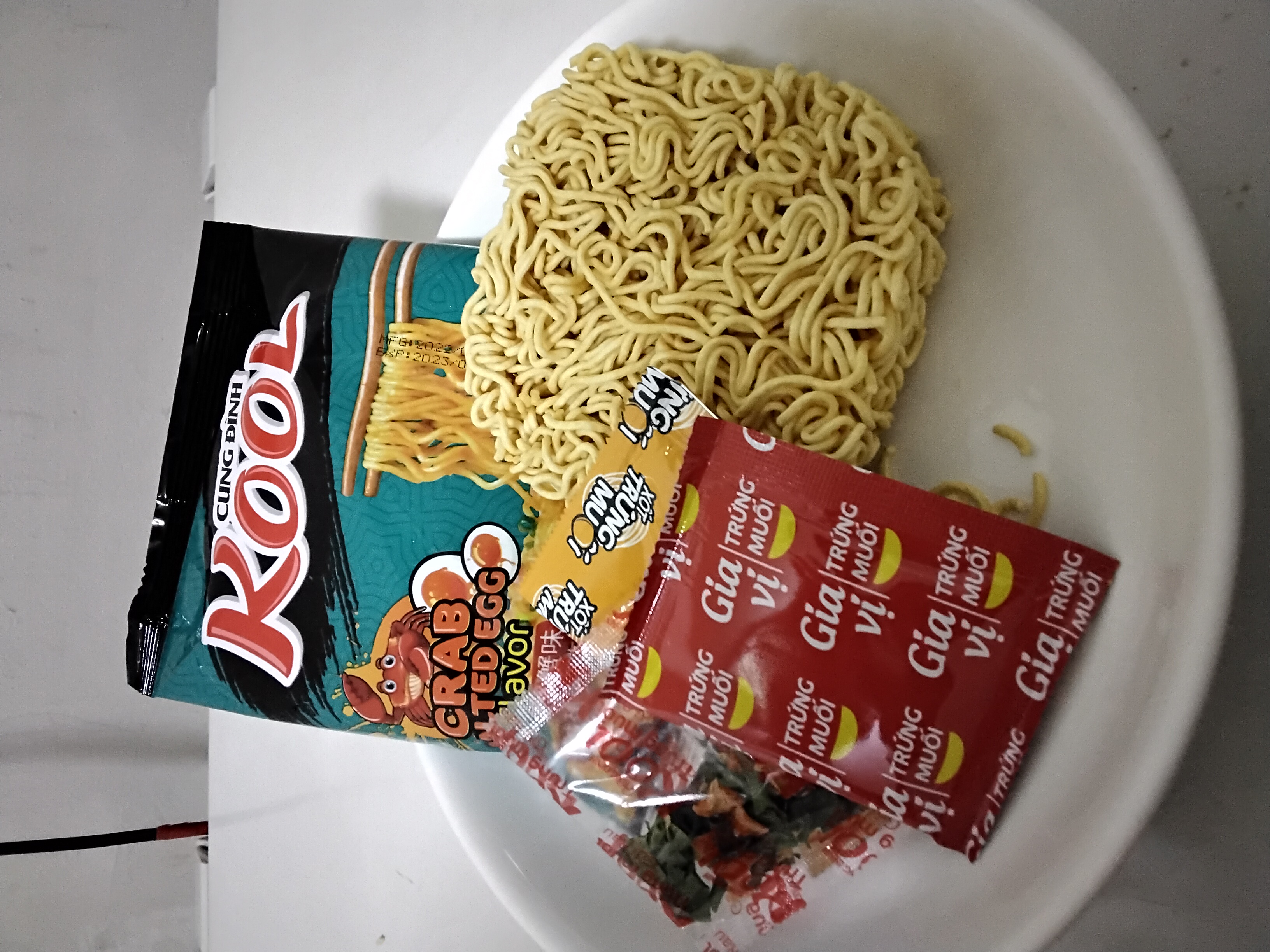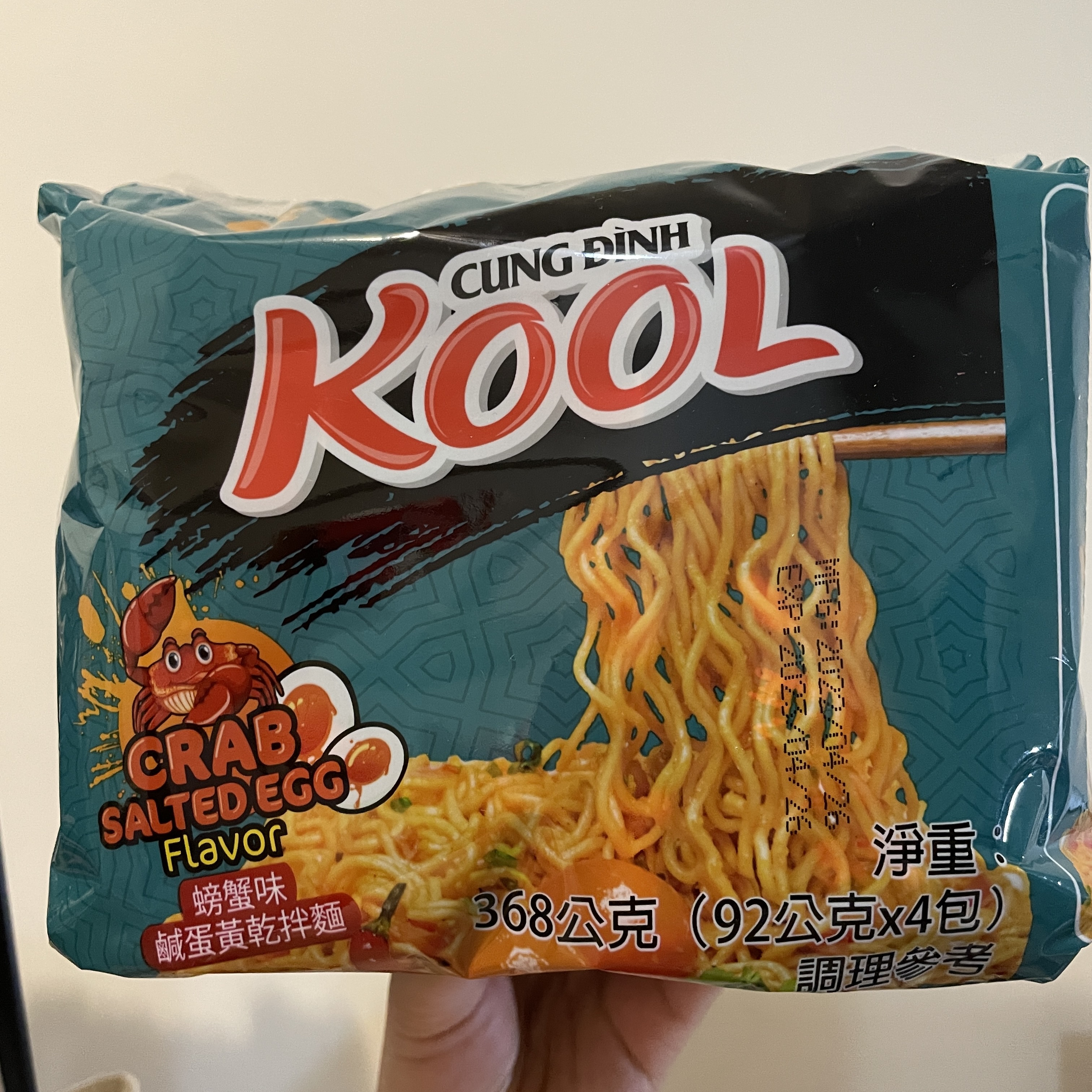 醬包:棕櫚油 、水、醬油{鹽、水、發酵大豆萃取物(含發酵大豆、小麥)、糖、L-麩酸鈉、焦糖色素(銨鹽焦糖)、醋酸 、玉米糖膠、5-次黃嘌呤核苷磷酸二鈉、5-鳥嘌呤核苷磷酸二鈉、香料(醬油)、碘化鉀}、糖、L-麩酸鈉、魚露(鳳尾魚、鹽)、大蒜粉、辣椒粉、蔥粉、胡椒粉、酵母萃取物、5-次黃嘌呤核苷磷酸二鈉、5-鳥嘌呤核苷磷酸二鈉、蝦粉[含蝦粉、魚露(鳳尾魚、鹽)、鹽]、胺基乙酸、玉米糖膠、檸檬酸、紅椒油、蟹粉{蟹粉、鹽、糖、 L-麩酸鈉、麥芽糊精、酵母萃取物、蝦粉、二氧化矽、5-次黃嘌呤核苷磷酸二鈉、5-鳥嘌呤核苷磷酸二鈉、辛烯基丁二酸鈉澱粉, 中鏈三酸甘油酯}、香料(香菜)、防腐劑(己二烯酸鉀)、甜味劑(醋磺內酯鉀)、香料(炸洋蔥)。