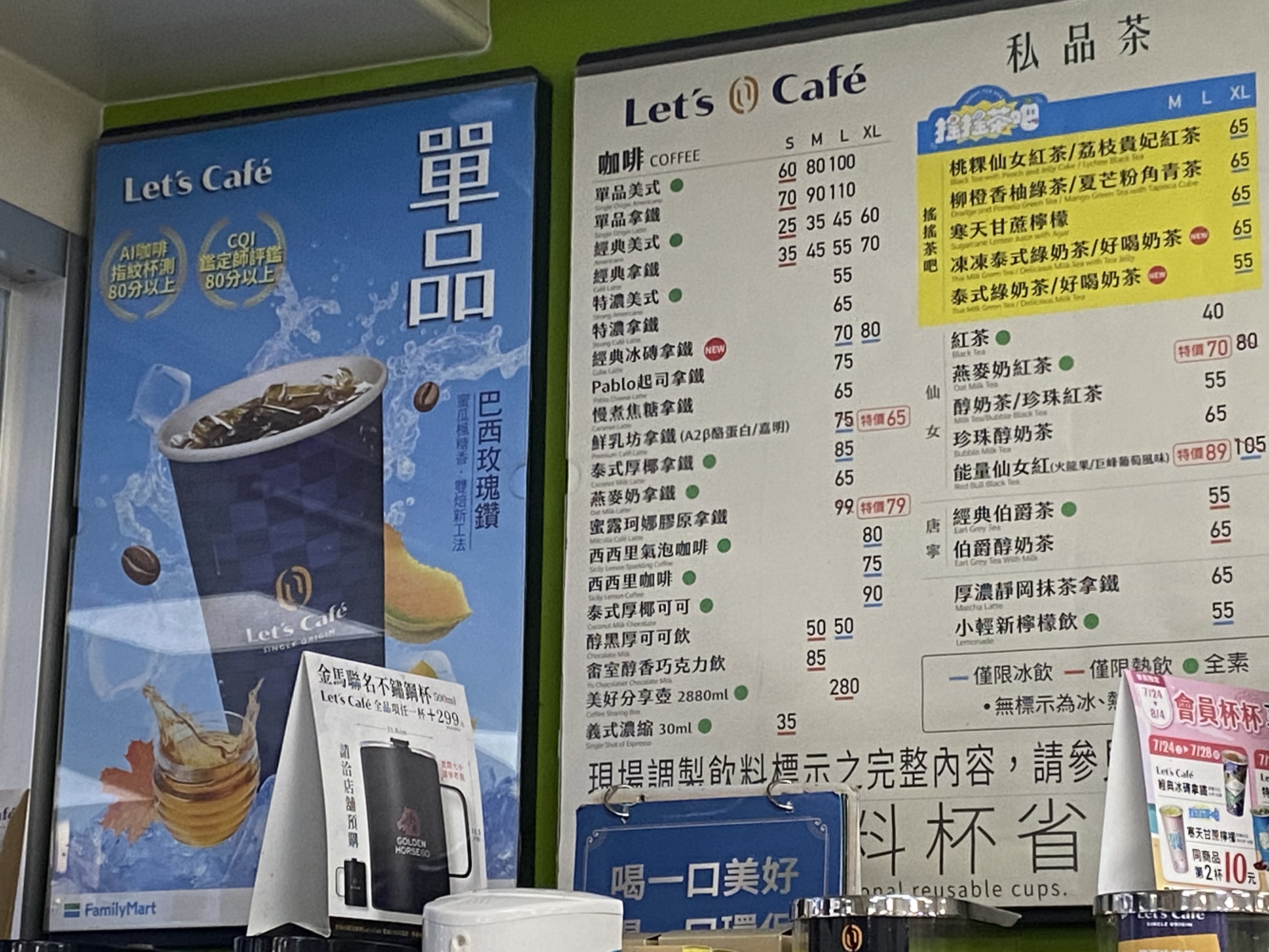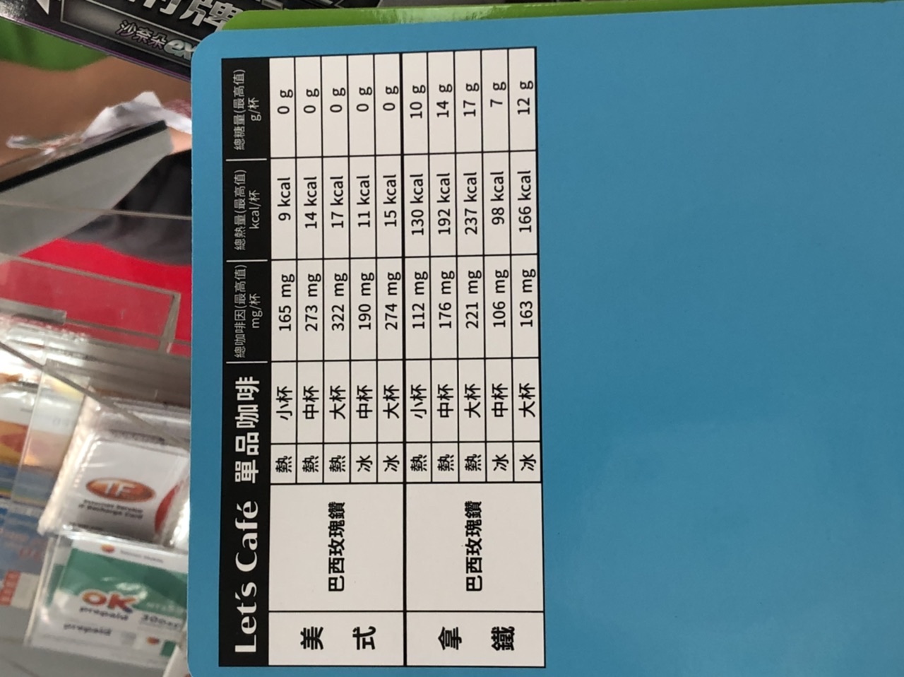 | 品項 | 規格 | 總咖啡因(最高值)mg/杯 | 總熱量(最高值)kcl/杯 | 總糖量(最高值)g/杯 |