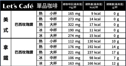 | 美式 | 熱/中杯 | 273mg | 14kcal | 0g |