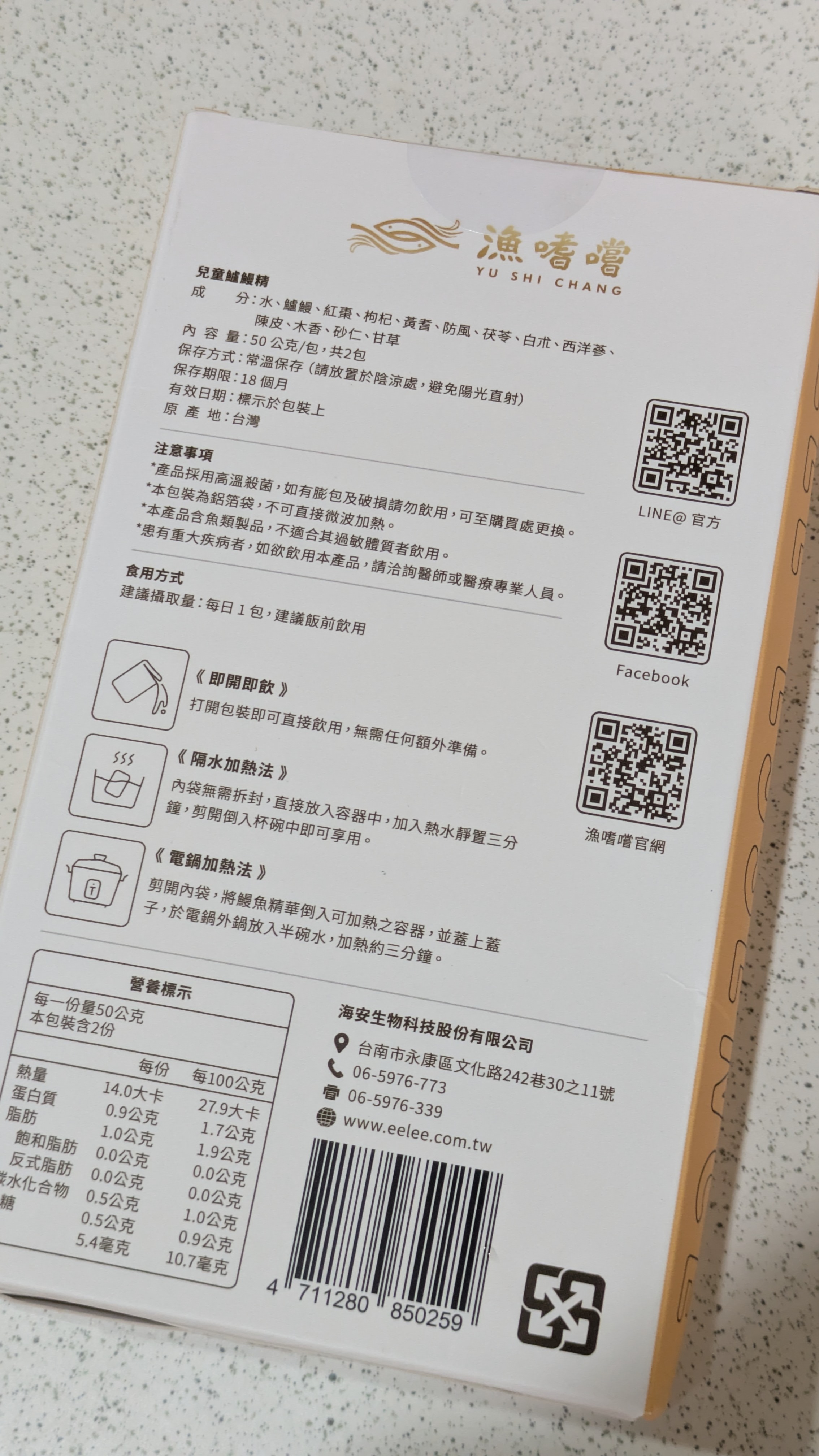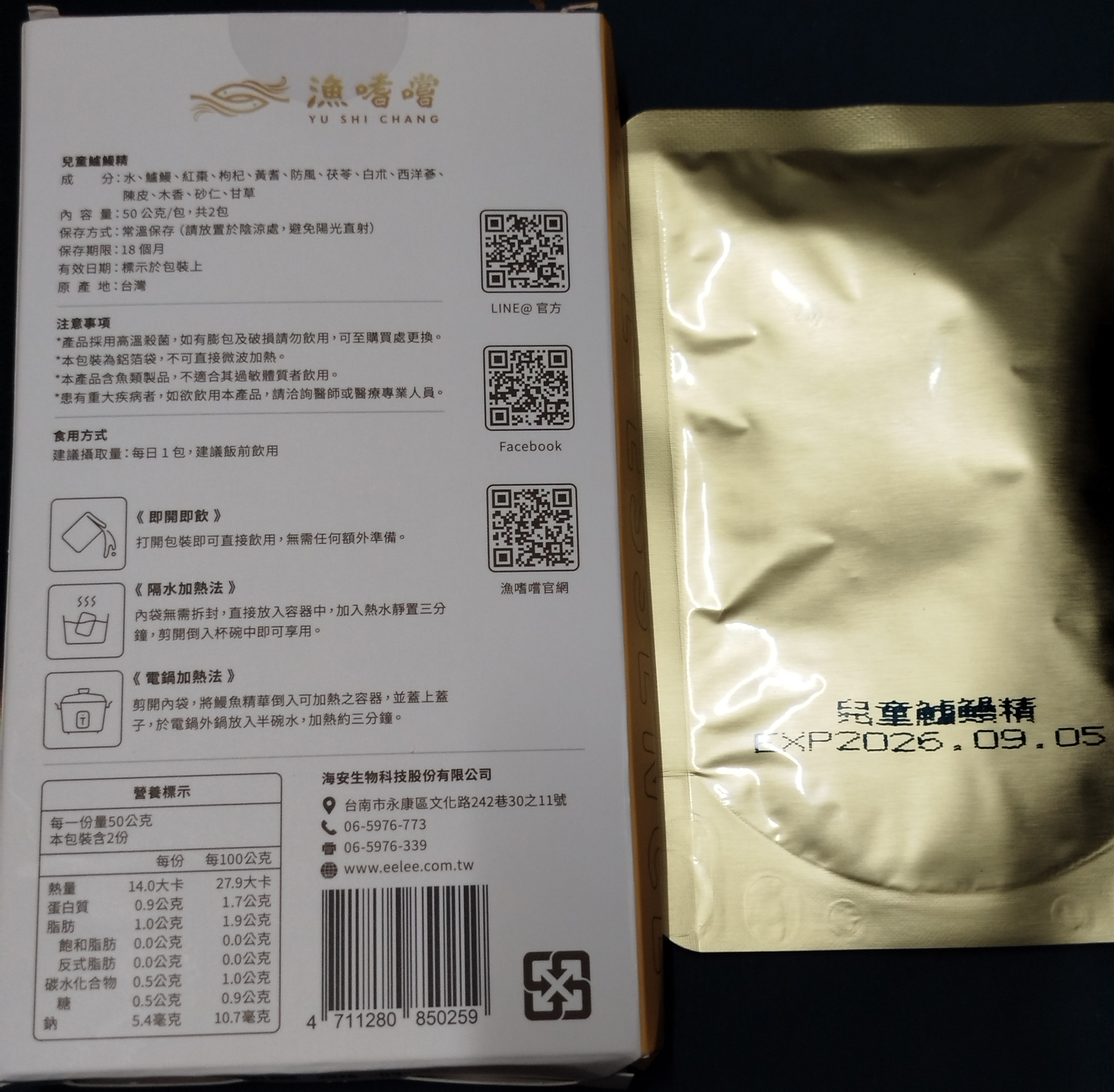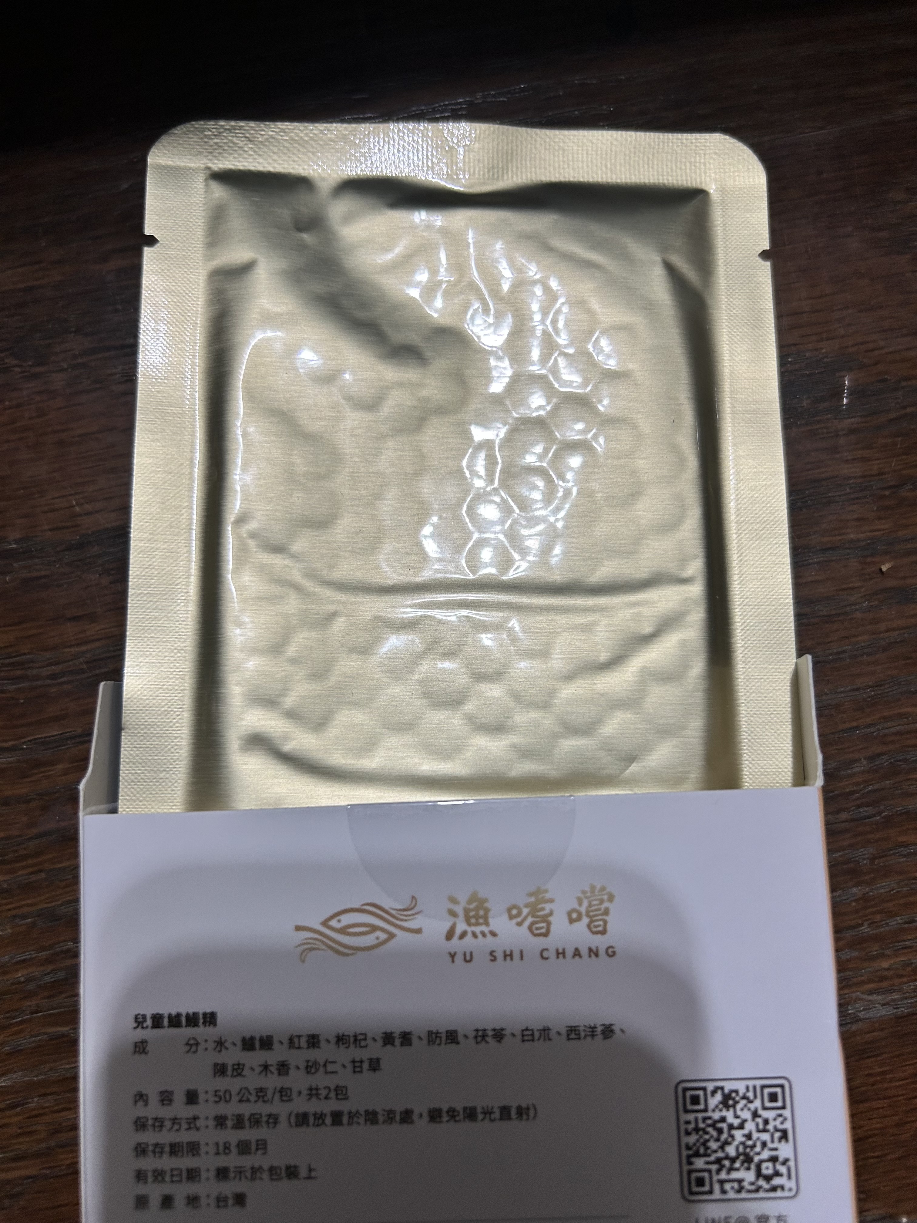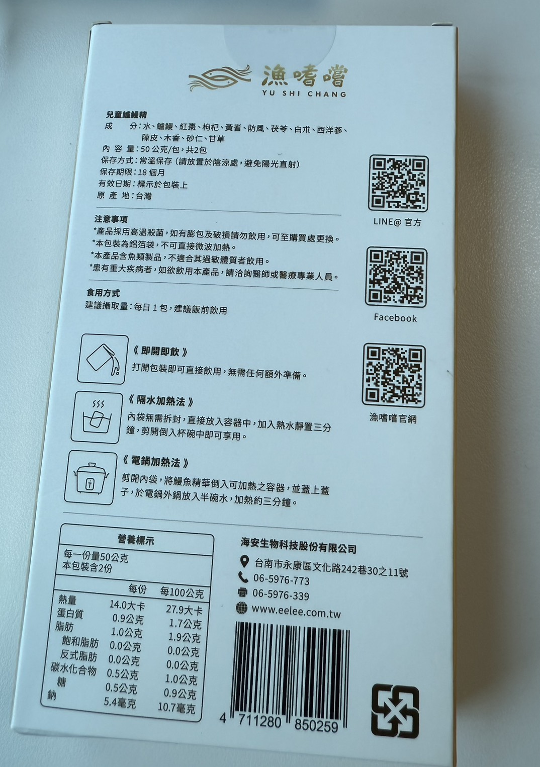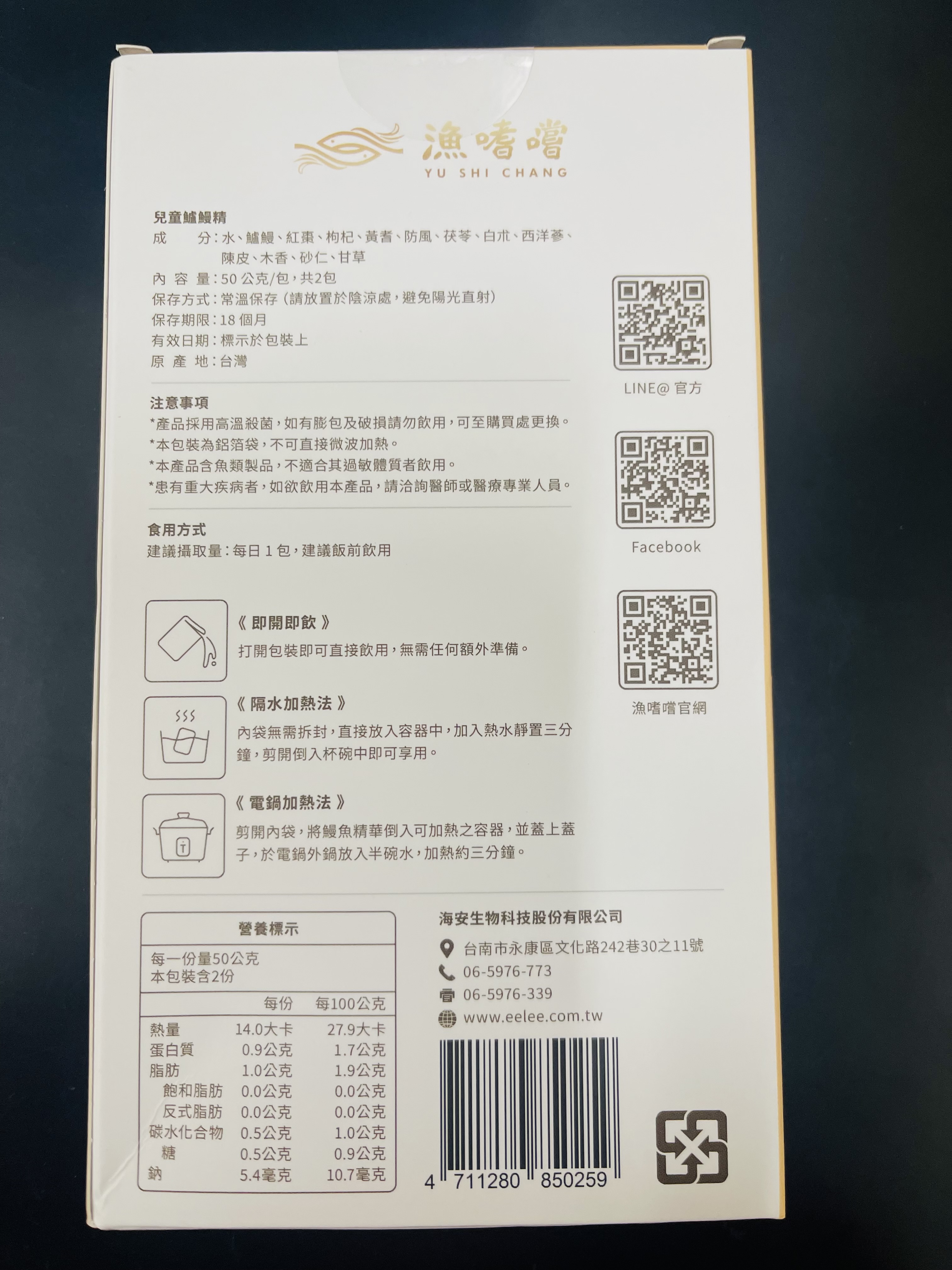 回列表 漁嗜嚐 兒童鱸鰻精 寶貝吃好好 健康沒煩惱 168元/包 所需等級 一般會員以上 所需學分 30 體驗份數 100 關注人數 974 申請人數 234 申請截止 品牌業者:漁嗜嚐 製造廠商 海安生物科技股份有限公司 廠商地址 台南市永康區文化路242巷30之11號 產地 台灣 試用產品規格 50毫克/包(共2包) 食品業者登錄字號 D-189176446-00000-6 投保產品責任險字號 華南產物保險1402-132050105 心得分享 商品介紹 商品成分 使用方法 注意事項 體驗名單 8.8 兒童鱸鰻精 天然健康無腥味 8.9 適合孩童補給營養 8.9 提升孩童精神元氣 8.7 小朋友喜愛程度 8.3 建議推薦 8.8 心得分享 84則 丁瑛子 鑽石達人 34歲 彰化縣 2025/03/13 對兒童鱸鰻精留下評價 10 兒童鱸鰻精是一種專為兒童設計的營養補充品,主要成分通常包含鱸魚精華與鰻魚精華。這些成分富含DHA、EPA、優質蛋白質、維生素A、B群、D等營養素,對兒童的大腦發育、免疫力提升、視力保護及成長發育有幫助。成分天然,無人工添加物或防腐劑 無腥味,口感佳,孩子較易接受 有檢驗合格證明,確保品質與安全適合需要補充營養的兒童食慾不振或偏食的孩子需要補充DHA促進學習專注力的兒童經常感冒、免疫力較弱的小孩 林欣慧 金食達人 29歲 臺南市 2025/03/13 對兒童鱸鰻精留下評價 10 漁嗜嚐 兒童鱸鰻精漁嚐嚐這款專門給兒童喝的鱸鰻精,孩子接受度高,吃魚怕魚腥味的都可以接受,對於小朋友抵抗力及免疫力沒那麼好時,常常容易生病感冒,整個精神狀態不好時是非常好的天然食補,對體力復原及恢復健康很有幫助,隨時補充營養、增強體力,不用放冰箱佔空間,常溫就可以方便保存,喝起來的感覺很香很好喝,清爽順口不油膩而且新鮮香醇好入口、無腥味,隔水加熱也很方便,加入蒸蛋、入菜、湯麵等料理也可以,提升免疫力、抵抗力,增強活力、精神及注意力,小小一包營養滿分,養身不養肉,作為日常營養補充調整體質的好產品,相信體力氣色也會慢慢養起來的. 蔡小雯 金食達人 28歲 宜蘭縣 2025/03/14 對兒童鱸鰻精留下評價 10 這次幸運的可以體驗到【漁嗜嚐 兒童鱸鰻精 】寶貝吃好好 健康沒煩惱一收到貨就迫不急待地打開來嘗鮮外包裝非常可愛,非常吸引小孩的眼球一盒裡面有兩包裝,一包約50毫升成分也很單純,包含鱸鰻以及十一種中藥材我這次沒有加熱,直接開袋即飲偷偷喝了一口,可能因為是要給小孩喝的喝起來甜甜的,很像紅棗桂圓茶完全沒有腥味,或是讓人感受不佳的味道小孩也很可以接受,非常喜歡鱸鰻精富含優質蛋白質、牛磺酸、EPA、DHA及胺基酸,可以增強小孩身體防護力,飯前飲用還可以開胃 陳雅玲 金食達人 33歲 新北市 2025/03/14 對兒童鱸鰻精留下評價 10 很開心這次抽中兒童鱸鰻精的體驗,雖然我是大人,但是選擇營養品時會優先選擇食物單純、較無負擔的兒童款,以下是我體驗完的感想:1.包裝:外包裝用卡通形象的鰻魚讓人一目瞭然,如果是在店內挑選產品,有魚的圖案比較不會買錯(對海鮮過敏的人也能很快避開);上方有標註要3歲以上兒童適用,且背面使用成份單純,除了鱸鰻外就是中藥材。2.口感:之前喝過其他牌的虱目魚精,魚的味道非常重,這次體驗有嚇一跳,我是用電鍋蒸的方式飲用,完全沒有魚味,喝起來比較像茶或不苦的中藥,是兒童可以接受的飲品。但同時也令我好奇產品的鱸鰻比率,是不是中藥材的比例高過鱸鰻很多呢? 查了官網也沒有明確寫到。整體而言,除了有些小疑問外,我對這次的體驗產品非常滿意,清爽無負擔,是會想自己回購的。 張佑安(yuanchang) 鑽石達人 63歲 臺中市 2025/03/15 對兒童鱸鰻精留下評價 10 鱸鰻(又稱鱸鱔)是一種少見的高檔食材,擁有細嫩的肉質與豐富的油脂;與一般鰻魚相比,鱸鰻的油脂分布均勻,燉煮後會釋放出濃郁的鮮香,帶有微微的奶油感;富含膠原蛋白,入口時有微微的黏嘴感;鱸鰻的風味介於淡水鰻與海水魚之間,具有溫和的鮮味。這款兒童鱸鰻精,除上述營養價值外,還附有許多種胺基酸成分,加上中藥配方,將魚腥味徹底去除,無論是冷、熱飲皆相當順口,且飲後口齒留香;雖標榜「兒童」字言,個人認為老少咸宜,值得推薦。 李庭 金食達人 33歲 臺北市 2025/03/15 對兒童鱸鰻精留下評價 10 這次收到的是【漁嗜嚐的兒童鱸鰻精】不要說小朋友,光是我自己都不太喜歡有藥膳味,或是土味的食物~但這次的鱸鰻精真的讓我非常驚豔,他不但沒有腥味,也沒有很重的中藥味喔!雖然說是想要給姊姊的小朋友試試看,自己還是偷偷吃了一包啦 :P個人覺得很香很順口,連小朋友都不會抗拒食用。尤其最近變天忽冷忽熱的,還有諾羅病毒肆虐,天然的防護力真的來的很即時:)小朋友聚在一起總是病毒互相傳染,蠻推薦給有小朋友的家長,或是跟我一樣不喜歡中藥味但又不想跑醫院的大人喔! 謝婷婷 金食達人 46歲 臺中市 2025/03/16 對兒童鱸鰻精留下評價 10 想用魚精給小孩跟老人補身體,尤其是小朋友,魚腥味重了不行,有中藥味不行 ,特別傷老媽子的腦筋。這次試喝的漁嗜嚐 兒童鱸鰻精,是特別為三歲以上兒童設計的,常溫打開的時候,就能聞到淡淡枸杞的香味,加熱出鍋的時候,特別讓我驚喜,居然一點腥味也沒有,之前也買過其他魚精,加熱後,魚腥味都有點令我卻步,而且一定要趁熱喝,一旦涼了,更是喝不入口,可是這次,雖然涼了,也不腥,更沒有濃厚中藥味,清清爽爽,接受度特別高,而且這款鱸鰻精,包裝可愛,加熱飲用