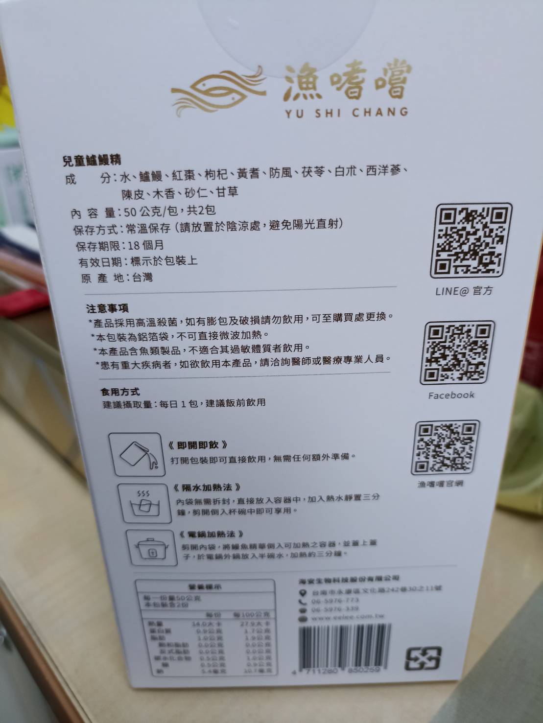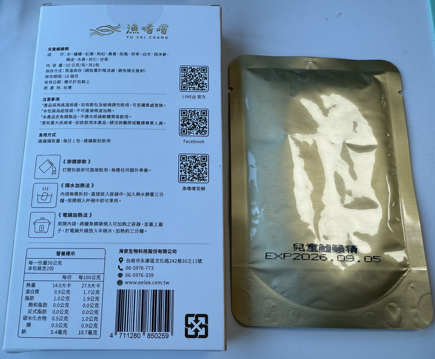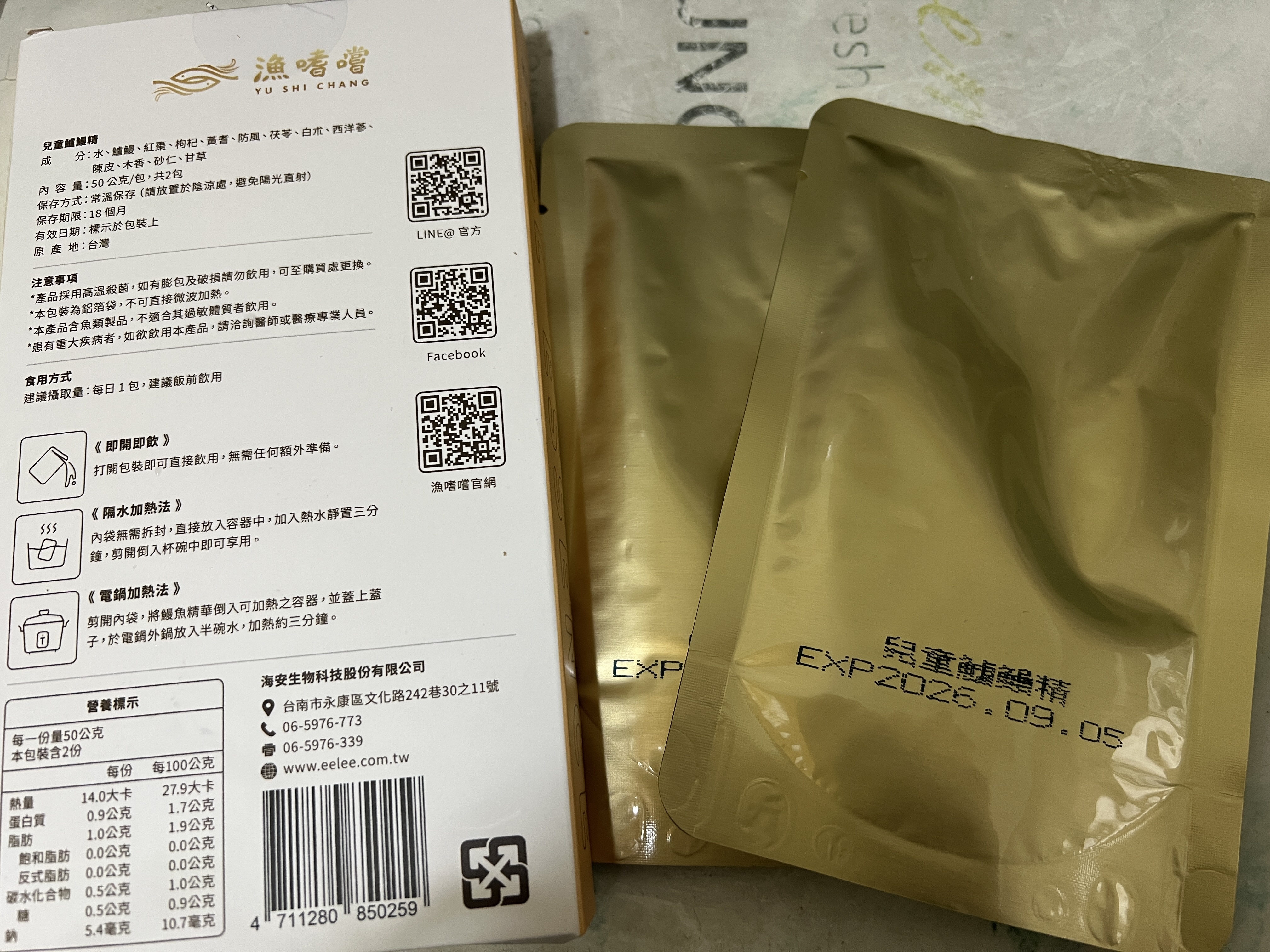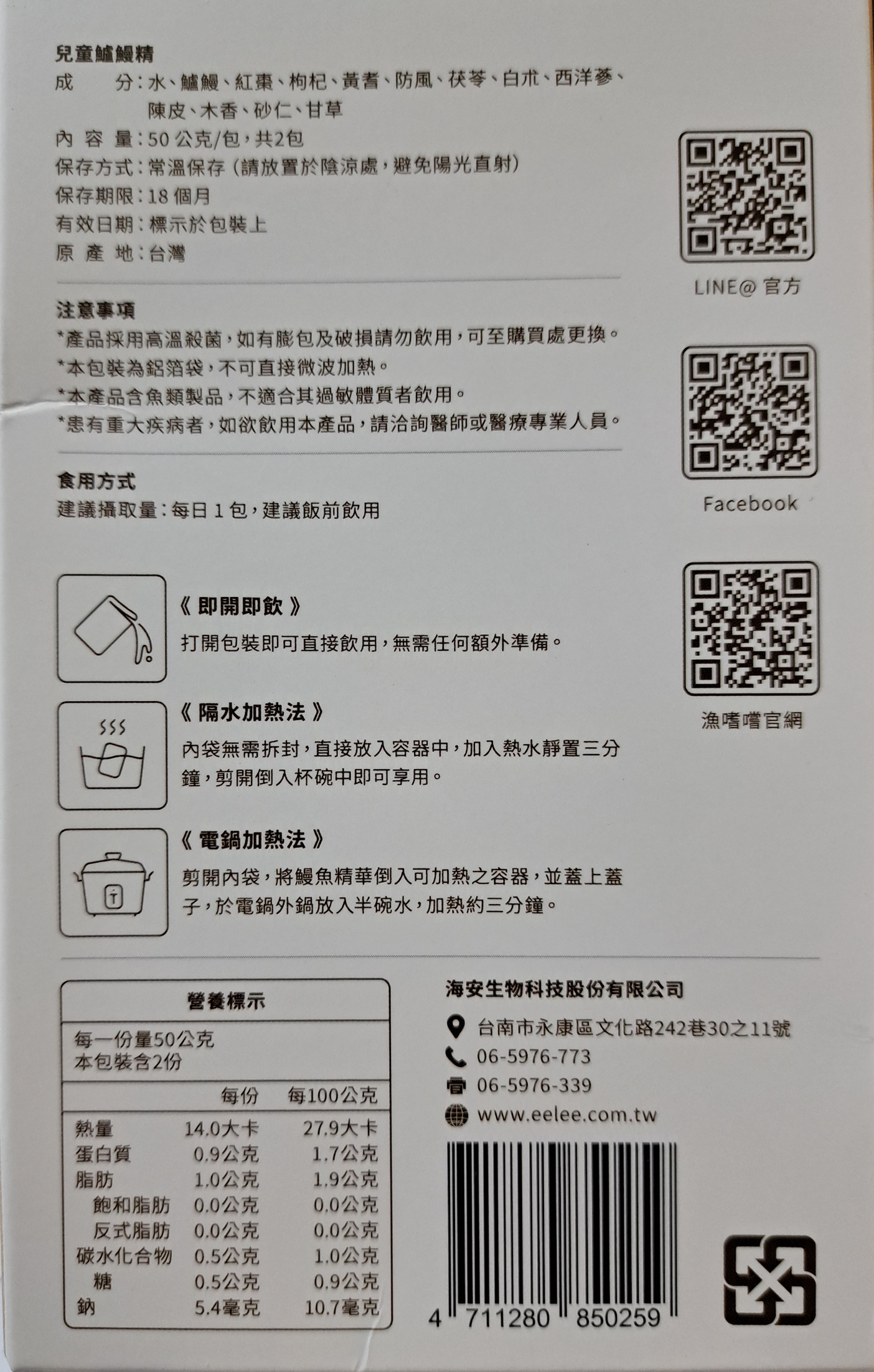 回列表 漁嗜嚐 兒童鱸鰻精 寶貝吃好好 健康沒煩惱 168元/包 所需等級 一般會員以上 所需學分 30 體驗份數 100 關注人數 974 申請人數 234 申請截止 品牌業者:漁嗜嚐 製造廠商 海安生物科技股份有限公司 廠商地址 台南市永康區文化路242巷30之11號 產地 台灣 試用產品規格 50毫克/包(共2包) 食品業者登錄字號 D-189176446-00000-6 投保產品責任險字號 華南產物保險1402-132050105 心得分享 商品介紹 商品成分 使用方法 注意事項 體驗名單 8.8 兒童鱸鰻精 天然健康無腥味 8.9 適合孩童補給營養 8.9 提升孩童精神元氣 8.7 小朋友喜愛程度 8.3 建議推薦 8.8 心得分享 84則 丁瑛子 鑽石達人 34歲 彰化縣 2025/03/13 對兒童鱸鰻精留下評價 10 兒童鱸鰻精是一種專為兒童設計的營養補充品,主要成分通常包含鱸魚精華與鰻魚精華。這些成分富含DHA、EPA、優質蛋白質、維生素A、B群、D等營養素,對兒童的大腦發育、免疫力提升、視力保護及成長發育有幫助。成分天然,無人工添加物或防腐劑 無腥味,口感佳,孩子較易接受 有檢驗合格證明,確保品質與安全適合需要補充營養的兒童食慾不振或偏食的孩子需要補充DHA促進學習專注力的兒童經常感冒、免疫力較弱的小孩 林欣慧 金食達人 29歲 臺南市 2025/03/13 對兒童鱸鰻精留下評價 10 漁嗜嚐 兒童鱸鰻精漁嚐嚐這款專門給兒童喝的鱸鰻精,孩子接受度高,吃魚怕魚腥味的都可以接受,對於小朋友抵抗力及免疫力沒那麼好時,常常容易生病感冒,整個精神狀態不好時是非常好的天然食補,對體力復原及恢復健康很有幫助,隨時補充營養、增強體力,不用放冰箱佔空間,常溫就可以方便保存,喝起來的感覺很香很好喝,清爽順口不油膩而且新鮮香醇好入口、無腥味,隔水加熱也很方便,加入蒸蛋、入菜、湯麵等料理也可以,提升免疫力、抵抗力,增強活力、精神及注意力,小小一包營養滿分,養身不養肉,作為日常營養補充調整體質的好產品,相信體力氣色也會慢慢養起來的. 蔡小雯 金食達人 28歲 宜蘭縣 2025/03/14 對兒童鱸鰻精留下評價 10 這次幸運的可以體驗到【漁嗜嚐 兒童鱸鰻精 】寶貝吃好好 健康沒煩惱一收到貨就迫不急待地打開來嘗鮮外包裝非常可愛,非常吸引小孩的眼球一盒裡面有兩包裝,一包約50毫升成分也很單純,包含鱸鰻以及十一種中藥材我這次沒有加熱,直接開袋即飲偷偷喝了一口,可能因為是要給小孩喝的喝起來甜甜的,很像紅棗桂圓茶完全沒有腥味,或是讓人感受不佳的味道小孩也很可以接受,非常喜歡鱸鰻精富含優質蛋白質、牛磺酸、EPA、DHA及胺基酸,可以增強小孩身體防護力,飯前飲用還可以開胃 陳雅玲 金食達人 33歲 新北市 2025/03/14 對兒童鱸鰻精留下評價 10 很開心這次抽中兒童鱸鰻精的體驗,雖然我是大人,但是選擇營養品時會優先選擇食物單純、較無負擔的兒童款,以下是我體驗完的感想:1.包裝:外包裝用卡通形象的鰻魚讓人一目瞭然,如果是在店內挑選產品,有魚的圖案比較不會買錯(對海鮮過敏的人也能很快避開);上方有標註要3歲以上兒童適用,且背面使用成份單純,除了鱸鰻外就是中藥材。2.口感:之前喝過其他牌的虱目魚精,魚的味道非常重,這次體驗有嚇一跳,我是用電鍋蒸的方式飲用,完全沒有魚味,喝起來比較像茶或不苦的中藥,是兒童可以接受的飲品。但同時也令我好奇產品的鱸鰻比率,是不是中藥材的比例高過鱸鰻很多呢? 查了官網也沒有明確寫到。整體而言,除了有些小疑問外,我對這次的體驗產品非常滿意,清爽無負擔,是會想自己回購的。 張佑安(yuanchang) 鑽石達人 63歲 臺中市 2025/03/15 對兒童鱸鰻精留下評價 10 鱸鰻(又稱鱸鱔)是一種少見的高檔食材,擁有細嫩的肉質與豐富的油脂;與一般鰻魚相比,鱸鰻的油脂分布均勻,燉煮後會釋放出濃郁的鮮香,帶有微微的奶油感;富含膠原蛋白,入口時有微微的黏嘴感;鱸鰻的風味介於淡水鰻與海水魚之間,具有溫和的鮮味。這款兒童鱸鰻精,除上述營養價值外,還附有許多種胺基酸成分,加上中藥配方,將魚腥味徹底去除,無論是冷、熱飲皆相當順口,且飲後口齒留香;雖標榜「兒童」字言,個人認為老少咸宜,值得推薦。 李庭 金食達人 33歲 臺北市 2025/03/15 對兒童鱸鰻精留下評價 10 這次收到的是【漁嗜嚐的兒童鱸鰻精】不要說小朋友,光是我自己都不太喜歡有藥膳味,或是土味的食物~但這次的鱸鰻精真的讓我非常驚豔,他不但沒有腥味,也沒有很重的中藥味喔!雖然說是想要給姊姊的小朋友試試看,自己還是偷偷吃了一包啦 :P個人覺得很香很順口,連小朋友都不會抗拒食用。尤其最近變天忽冷忽熱的,還有諾羅病毒肆虐,天然的防護力真的來的很即時:)小朋友聚在一起總是病毒互相傳染,蠻推薦給有小朋友的家長,或是跟我一樣不喜歡中藥味但又不想跑醫院的大人喔! 謝婷婷 金食達人 46歲 臺中市 2025/03/16 對兒童鱸鰻精留下評價 10 想用魚精給小孩跟老人補身體,尤其是小朋友,魚腥味重了不行,有中藥味不行 ,特別傷老媽子的腦筋。這次試喝的漁嗜嚐 兒童鱸鰻精,是特別為三歲以上兒童設計的,常溫打開的時候,就能聞到淡淡枸杞的香味,加熱出鍋的時候,特別讓我驚喜,居然一點腥味也沒有,之前也買過其他魚精,加熱後,魚腥味都有點令我卻步,而且一定要趁熱喝,一旦涼了,更是喝不入口,可是這次,雖然涼了,也不腥,更沒有濃厚中藥味,清清爽爽,接受度特別高,而且這款鱸鰻精,包裝可愛,加熱飲用