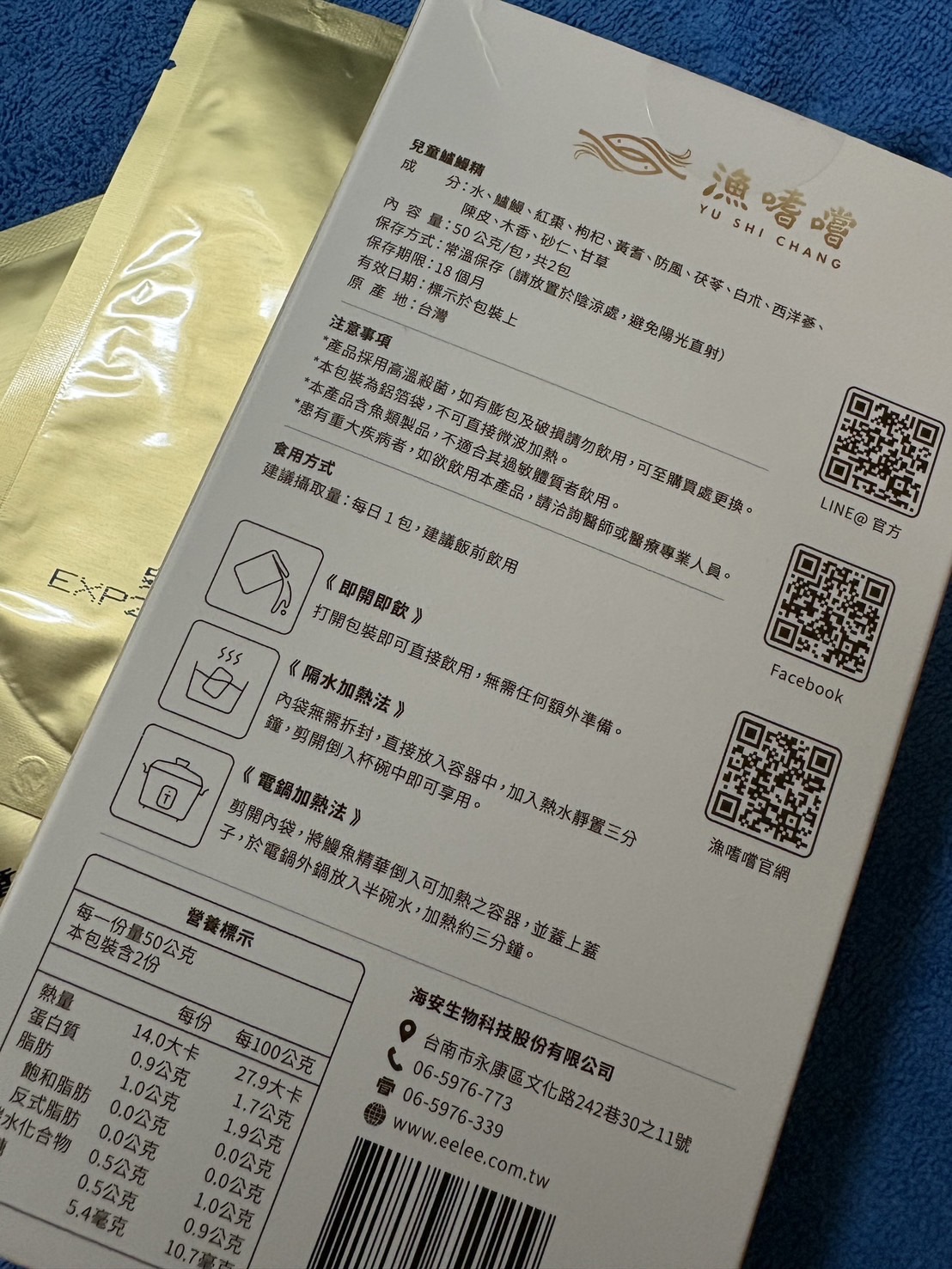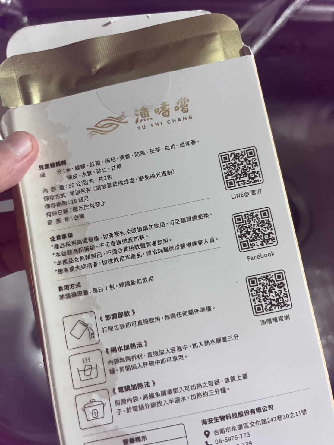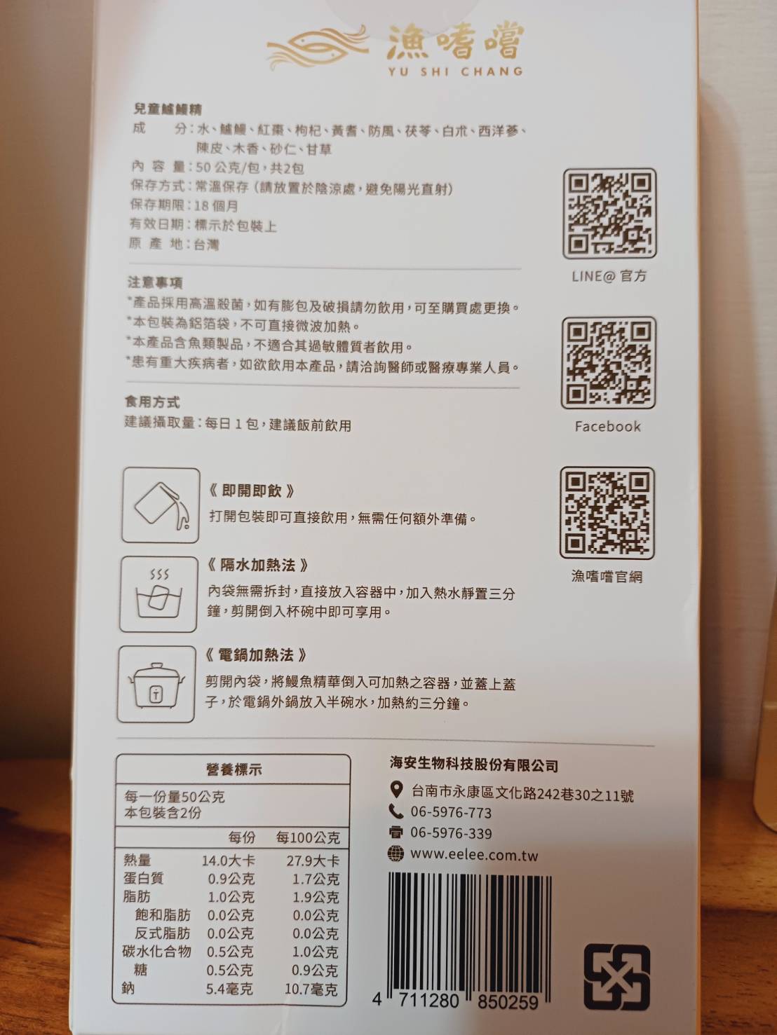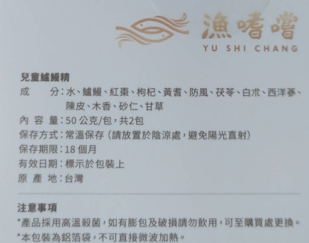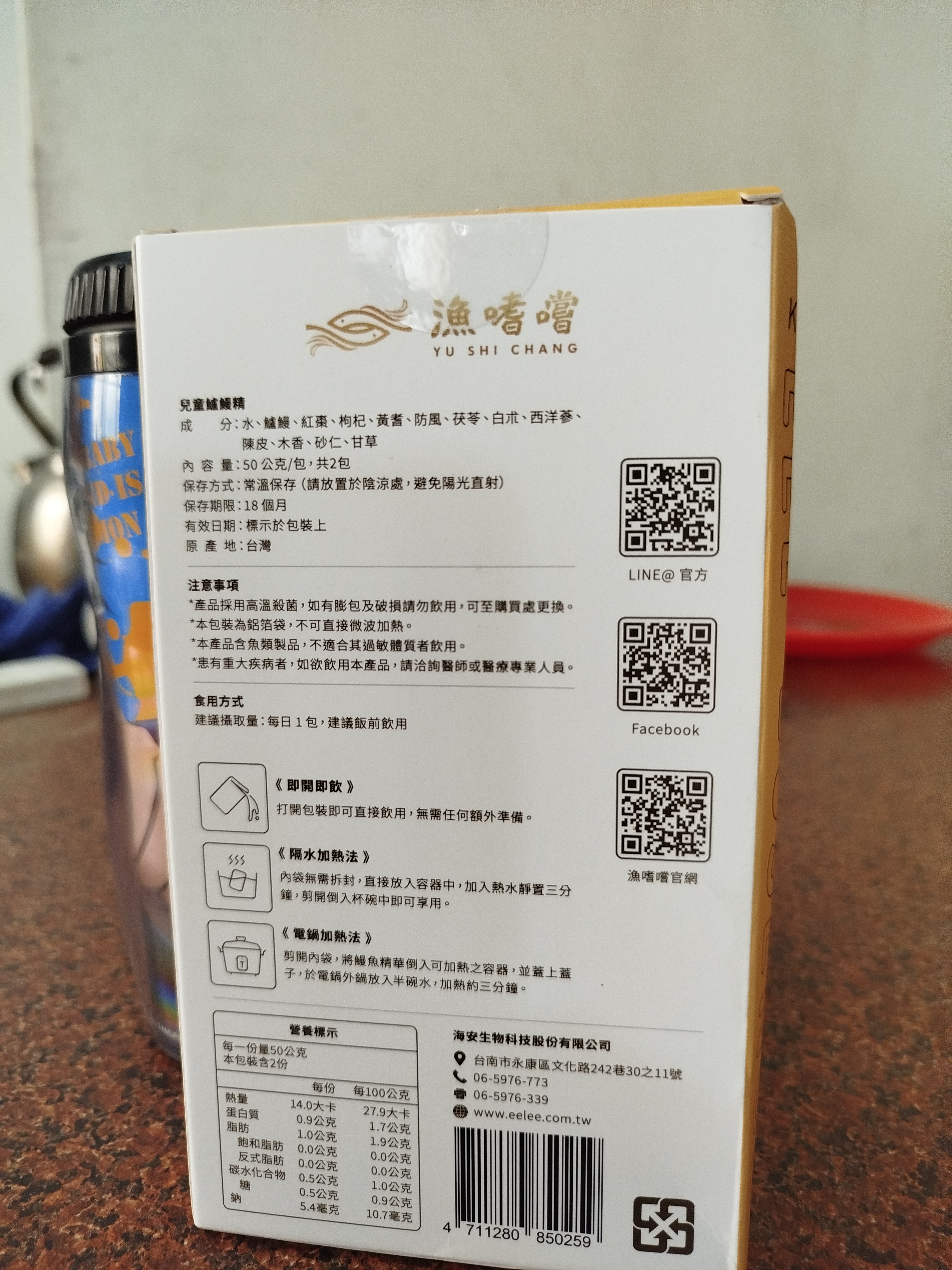 回列表 漁嗜嚐 兒童鱸鰻精 寶貝吃好好 健康沒煩惱 168元/包 所需等級 一般會員以上 所需學分 30 體驗份數 100 關注人數 974 申請人數 234 申請截止 品牌業者:漁嗜嚐 製造廠商 海安生物科技股份有限公司 廠商地址 台南市永康區文化路242巷30之11號 產地 台灣 試用產品規格 50毫克/包(共2包) 食品業者登錄字號 D-189176446-00000-6 投保產品責任險字號 華南產物保險1402-132050105 心得分享 商品介紹 商品成分 使用方法 注意事項 體驗名單 8.8 兒童鱸鰻精 天然健康無腥味 8.9 適合孩童補給營養 8.9 提升孩童精神元氣 8.7 小朋友喜愛程度 8.3 建議推薦 8.8 心得分享 84則 丁瑛子 鑽石達人 34歲 彰化縣 2025/03/13 對兒童鱸鰻精留下評價 10 兒童鱸鰻精是一種專為兒童設計的營養補充品,主要成分通常包含鱸魚精華與鰻魚精華。這些成分富含DHA、EPA、優質蛋白質、維生素A、B群、D等營養素,對兒童的大腦發育、免疫力提升、視力保護及成長發育有幫助。成分天然,無人工添加物或防腐劑 無腥味,口感佳,孩子較易接受 有檢驗合格證明,確保品質與安全適合需要補充營養的兒童食慾不振或偏食的孩子需要補充DHA促進學習專注力的兒童經常感冒、免疫力較弱的小孩 林欣慧 金食達人 29歲 臺南市 2025/03/13 對兒童鱸鰻精留下評價 10 漁嗜嚐 兒童鱸鰻精漁嚐嚐這款專門給兒童喝的鱸鰻精,孩子接受度高,吃魚怕魚腥味的都可以接受,對於小朋友抵抗力及免疫力沒那麼好時,常常容易生病感冒,整個精神狀態不好時是非常好的天然食補,對體力復原及恢復健康很有幫助,隨時補充營養、增強體力,不用放冰箱佔空間,常溫就可以方便保存,喝起來的感覺很香很好喝,清爽順口不油膩而且新鮮香醇好入口、無腥味,隔水加熱也很方便,加入蒸蛋、入菜、湯麵等料理也可以,提升免疫力、抵抗力,增強活力、精神及注意力,小小一包營養滿分,養身不養肉,作為日常營養補充調整體質的好產品,相信體力氣色也會慢慢養起來的. 蔡小雯 金食達人 28歲 宜蘭縣 2025/03/14 對兒童鱸鰻精留下評價 10 這次幸運的可以體驗到【漁嗜嚐 兒童鱸鰻精 】寶貝吃好好 健康沒煩惱一收到貨就迫不急待地打開來嘗鮮外包裝非常可愛,非常吸引小孩的眼球一盒裡面有兩包裝,一包約50毫升成分也很單純,包含鱸鰻以及十一種中藥材我這次沒有加熱,直接開袋即飲偷偷喝了一口,可能因為是要給小孩喝的喝起來甜甜的,很像紅棗桂圓茶完全沒有腥味,或是讓人感受不佳的味道小孩也很可以接受,非常喜歡鱸鰻精富含優質蛋白質、牛磺酸、EPA、DHA及胺基酸,可以增強小孩身體防護力,飯前飲用還可以開胃 陳雅玲 金食達人 33歲 新北市 2025/03/14 對兒童鱸鰻精留下評價 10 很開心這次抽中兒童鱸鰻精的體驗,雖然我是大人,但是選擇營養品時會優先選擇食物單純、較無負擔的兒童款,以下是我體驗完的感想:1.包裝:外包裝用卡通形象的鰻魚讓人一目瞭然,如果是在店內挑選產品,有魚的圖案比較不會買錯(對海鮮過敏的人也能很快避開);上方有標註要3歲以上兒童適用,且背面使用成份單純,除了鱸鰻外就是中藥材。2.口感:之前喝過其他牌的虱目魚精,魚的味道非常重,這次體驗有嚇一跳,我是用電鍋蒸的方式飲用,完全沒有魚味,喝起來比較像茶或不苦的中藥,是兒童可以接受的飲品。但同時也令我好奇產品的鱸鰻比率,是不是中藥材的比例高過鱸鰻很多呢? 查了官網也沒有明確寫到。整體而言,除了有些小疑問外,我對這次的體驗產品非常滿意,清爽無負擔,是會想自己回購的。 張佑安(yuanchang) 鑽石達人 63歲 臺中市 2025/03/15 對兒童鱸鰻精留下評價 10 鱸鰻(又稱鱸鱔)是一種少見的高檔食材,擁有細嫩的肉質與豐富的油脂;與一般鰻魚相比,鱸鰻的油脂分布均勻,燉煮後會釋放出濃郁的鮮香,帶有微微的奶油感;富含膠原蛋白,入口時有微微的黏嘴感;鱸鰻的風味介於淡水鰻與海水魚之間,具有溫和的鮮味。這款兒童鱸鰻精,除上述營養價值外,還附有許多種胺基酸成分,加上中藥配方,將魚腥味徹底去除,無論是冷、熱飲皆相當順口,且飲後口齒留香;雖標榜「兒童」字言,個人認為老少咸宜,值得推薦。 李庭 金食達人 33歲 臺北市 2025/03/15 對兒童鱸鰻精留下評價 10 這次收到的是【漁嗜嚐的兒童鱸鰻精】不要說小朋友,光是我自己都不太喜歡有藥膳味,或是土味的食物~但這次的鱸鰻精真的讓我非常驚豔,他不但沒有腥味,也沒有很重的中藥味喔!雖然說是想要給姊姊的小朋友試試看,自己還是偷偷吃了一包啦 :P個人覺得很香很順口,連小朋友都不會抗拒食用。尤其最近變天忽冷忽熱的,還有諾羅病毒肆虐,天然的防護力真的來的很即時:)小朋友聚在一起總是病毒互相傳染,蠻推薦給有小朋友的家長,或是跟我一樣不喜歡中藥味但又不想跑醫院的大人喔! 謝婷婷 金食達人 46歲 臺中市 2025/03/16 對兒童鱸鰻精留下評價 10 想用魚精給小孩跟老人補身體,尤其是小朋友,魚腥味重了不行,有中藥味不行 ,特別傷老媽子的腦筋。這次試喝的漁嗜嚐 兒童鱸鰻精,是特別為三歲以上兒童設計的,常溫打開的時候,就能聞到淡淡枸杞的香味,加熱出鍋的時候,特別讓我驚喜,居然一點腥味也沒有,之前也買過其他魚精,加熱後,魚腥味都有點令我卻步,而且一定要趁熱喝,一旦涼了,更是喝不入口,可是這次,雖然涼了,也不腥,更沒有濃厚中藥味,清清爽爽,接受度特別高,而且這款鱸鰻精,包裝可愛,加熱飲用
