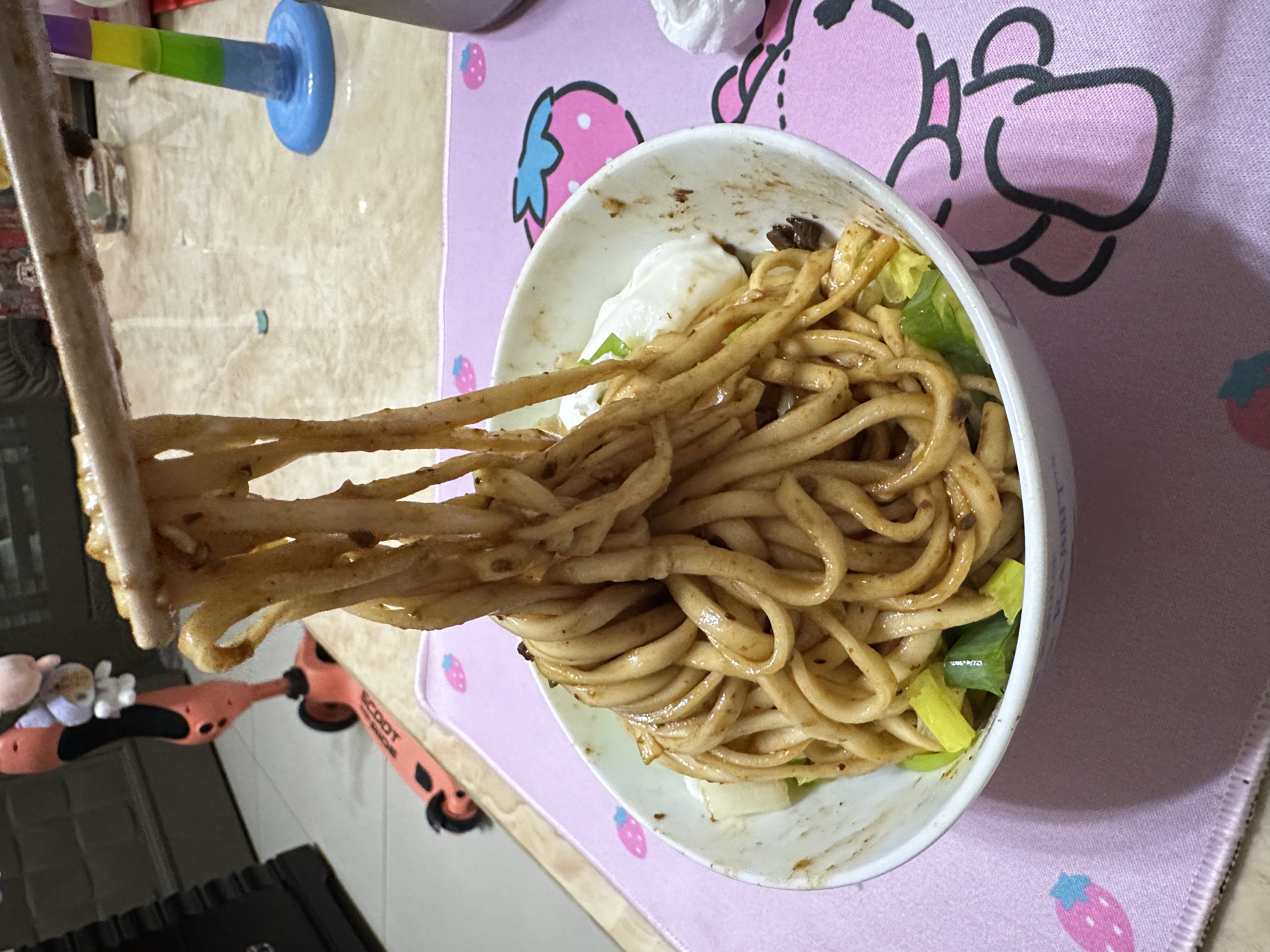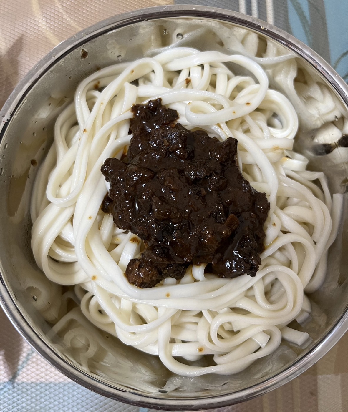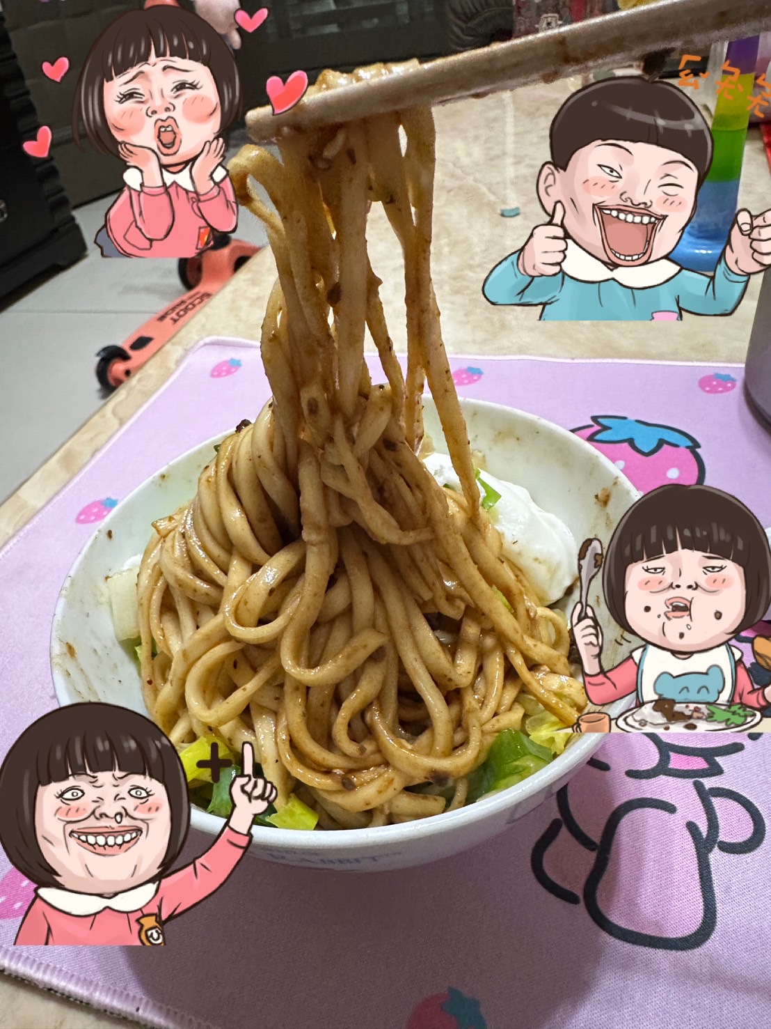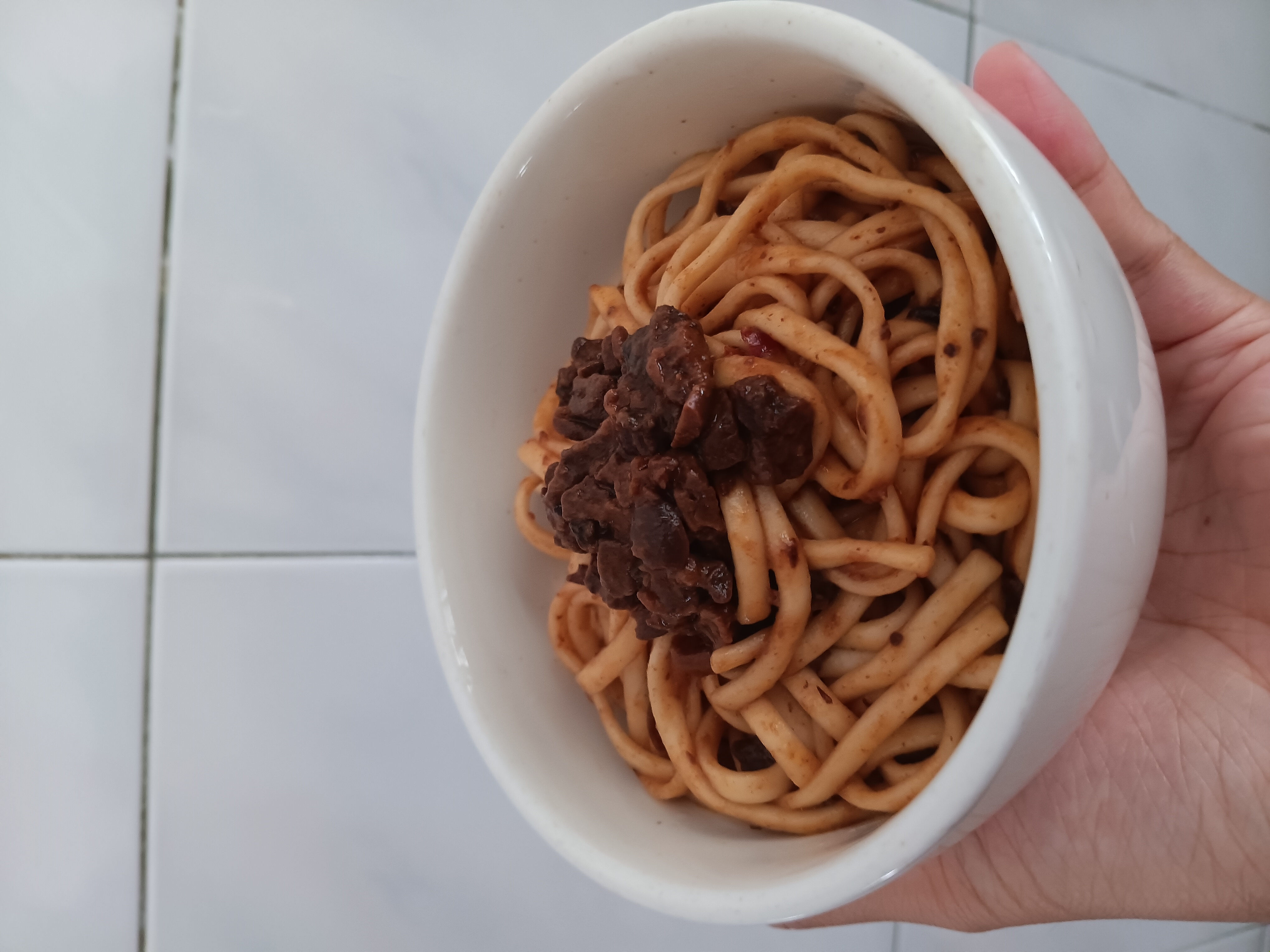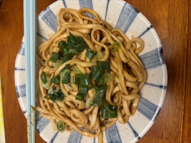 2、瀝乾麵條,倒入醬料包後視情況加入20-30cc的熱開水拌勻