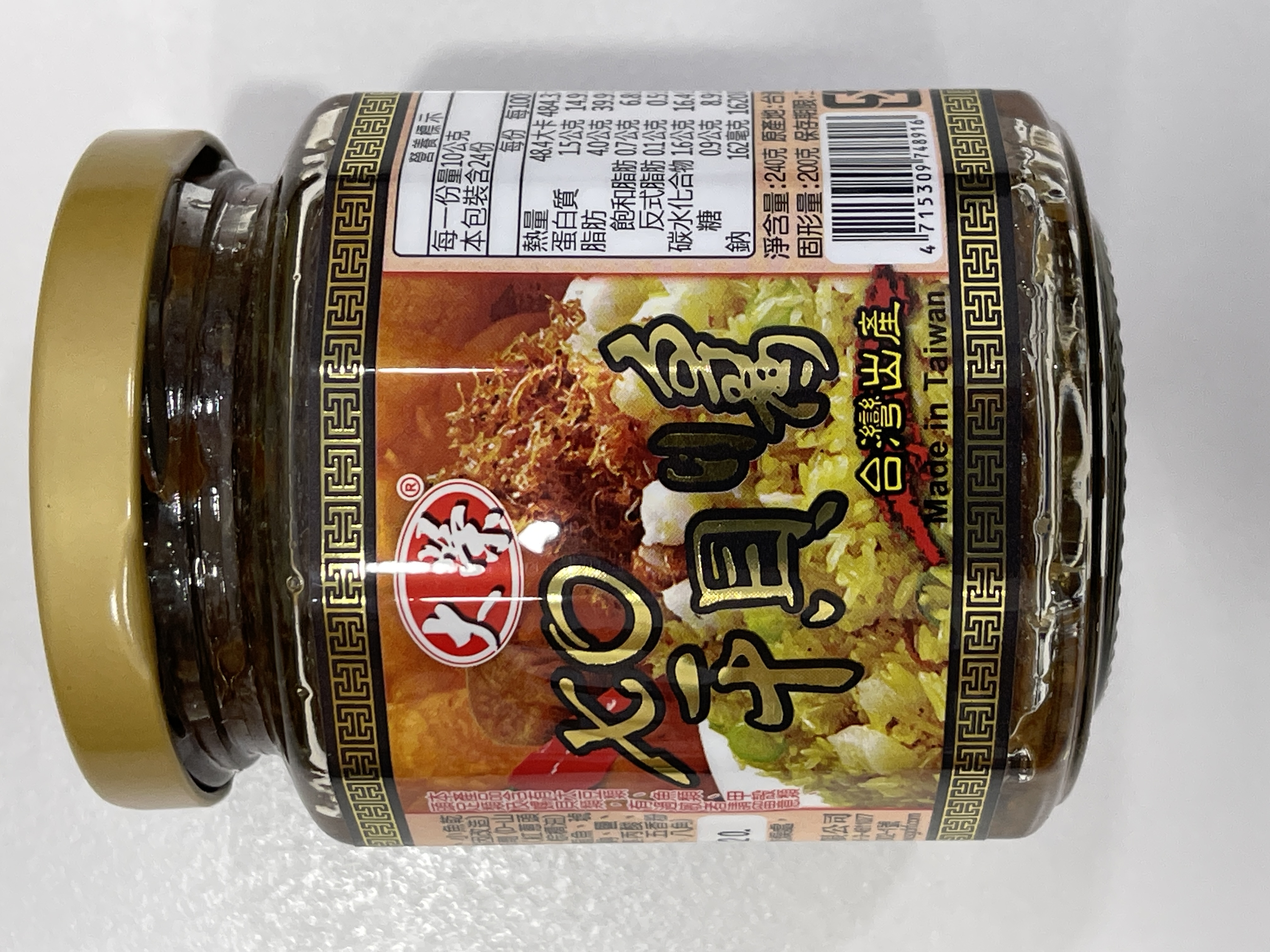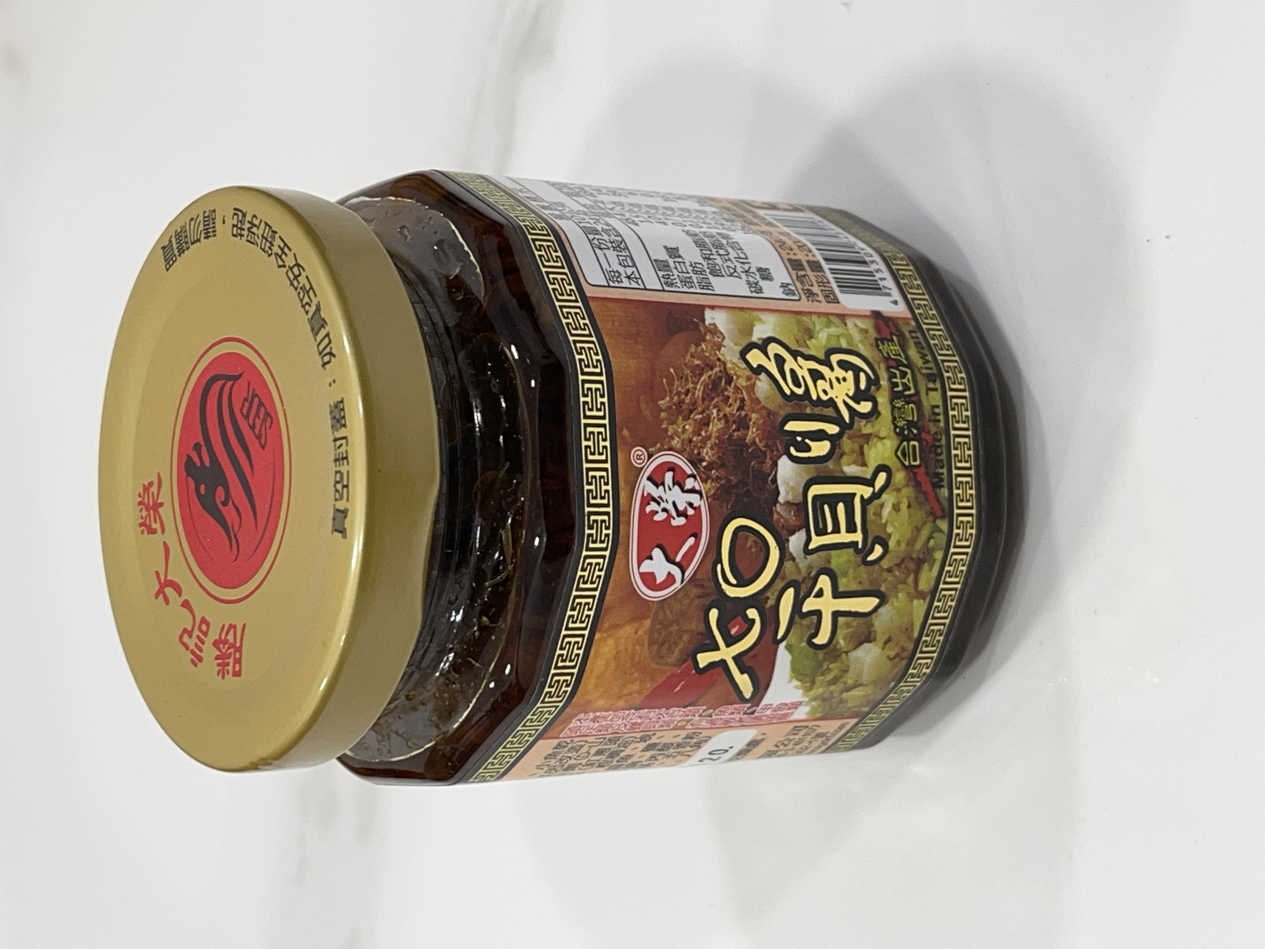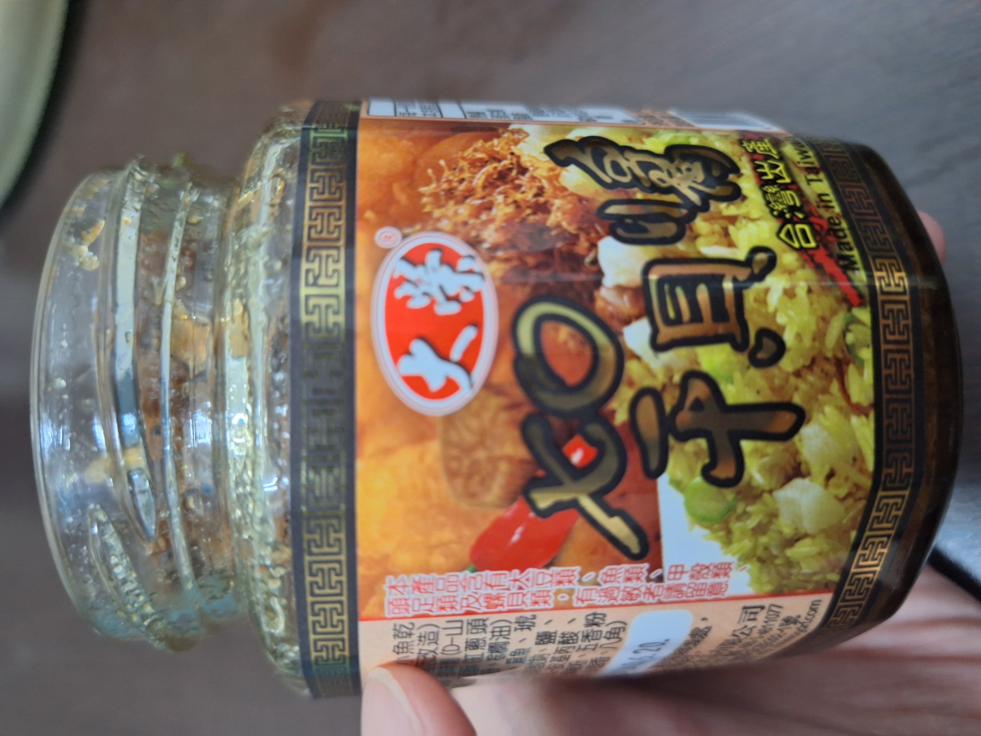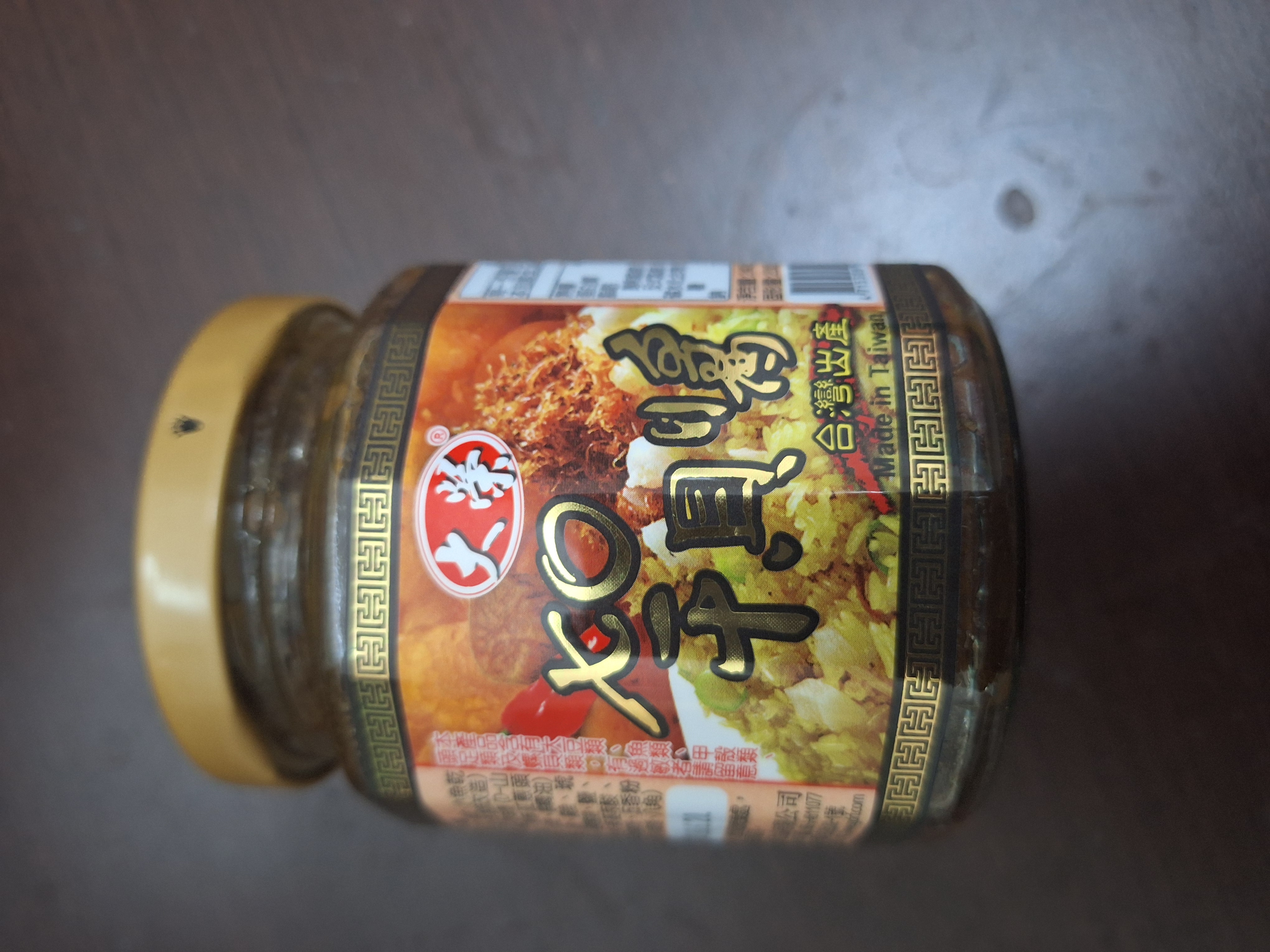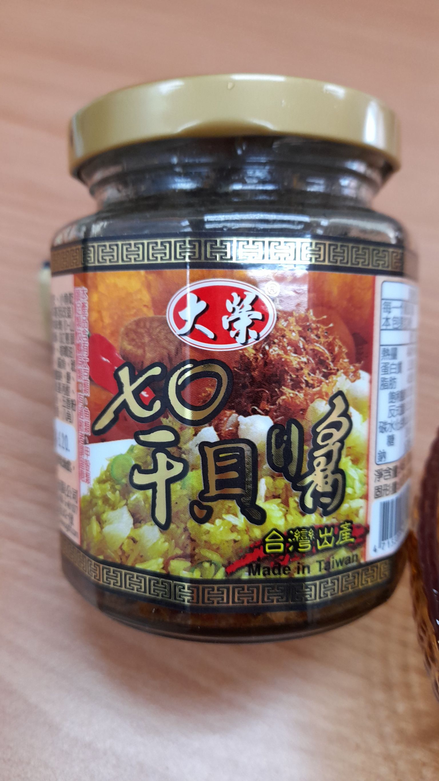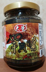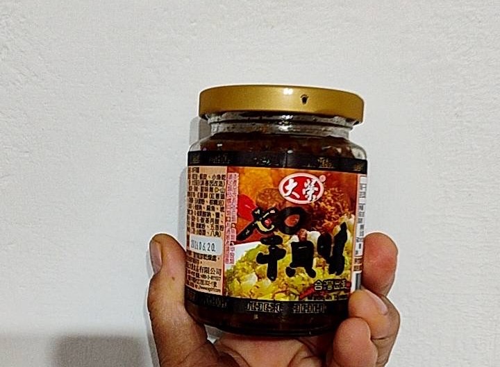 黃豆油、蝦 皮、小魚乾、糖、大豆蛋白(非基因改造)、魷魚、辣椒、甜味劑(D-山梨醇液70%)、紅蔥酥(紅蔥頭、洋蔥頭、玉米澱粉、棕櫚油)、珠貝、L-麩酸鈉、扁魚、琥珀酸二鈉、DL-蘋果酸鈉、鹽、蝦米、蒜粉、DL-胺基丙酸、干貝、薑粉、線椒粉、五香粉(肉桂、丁香、小茴香、八角)