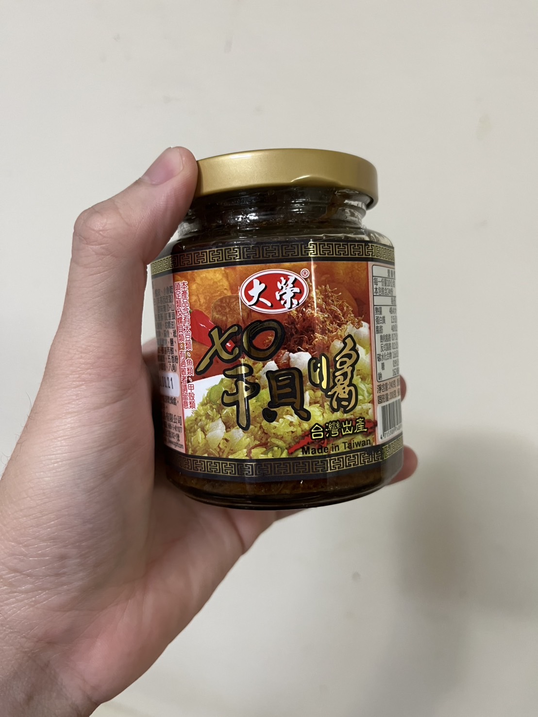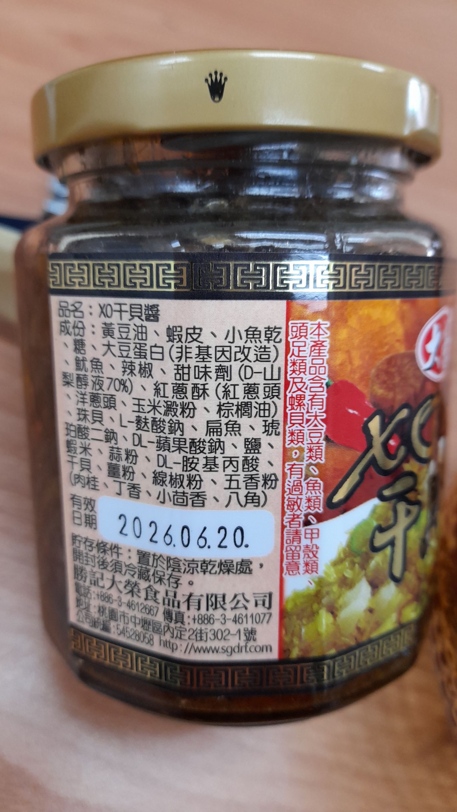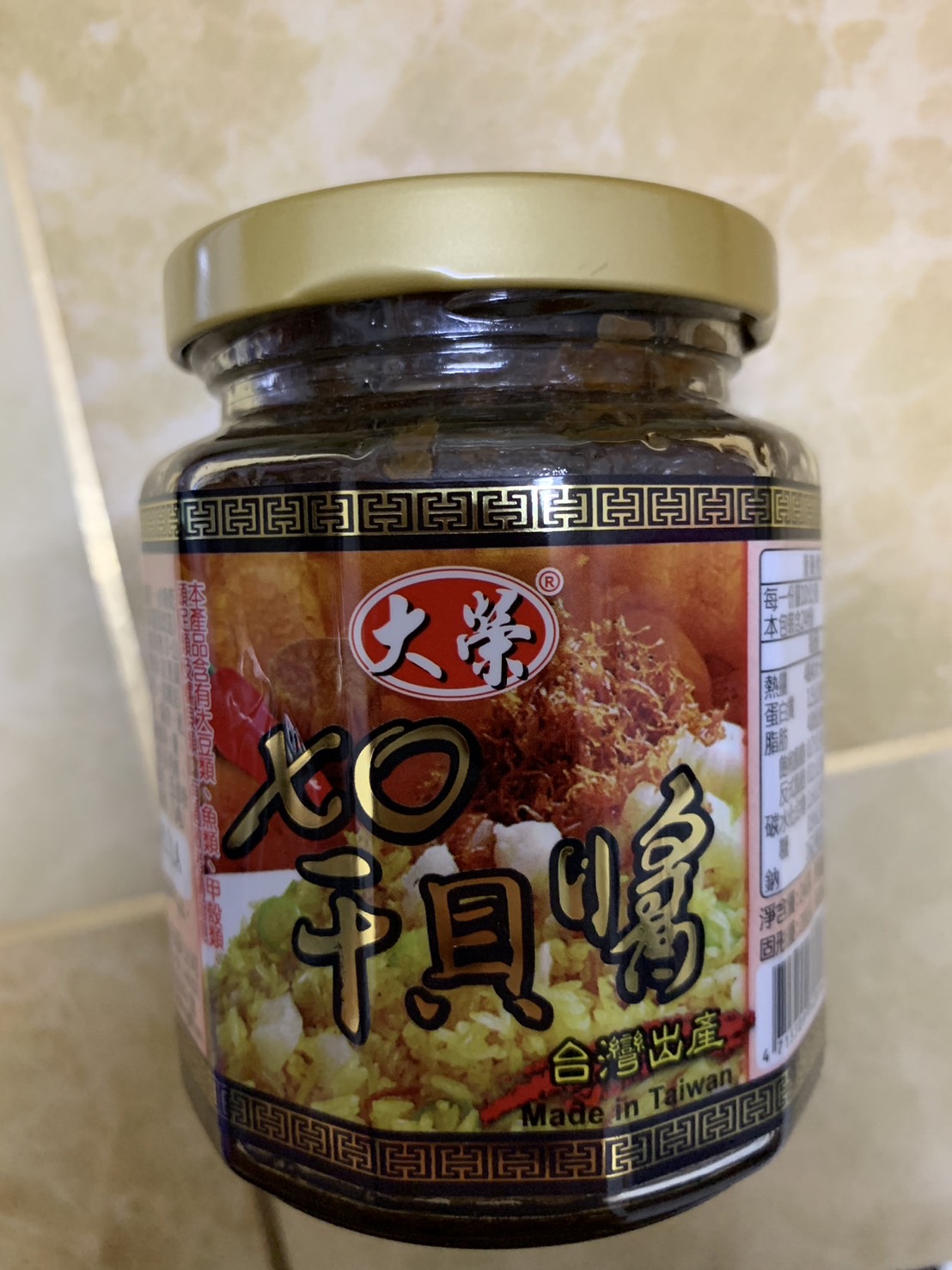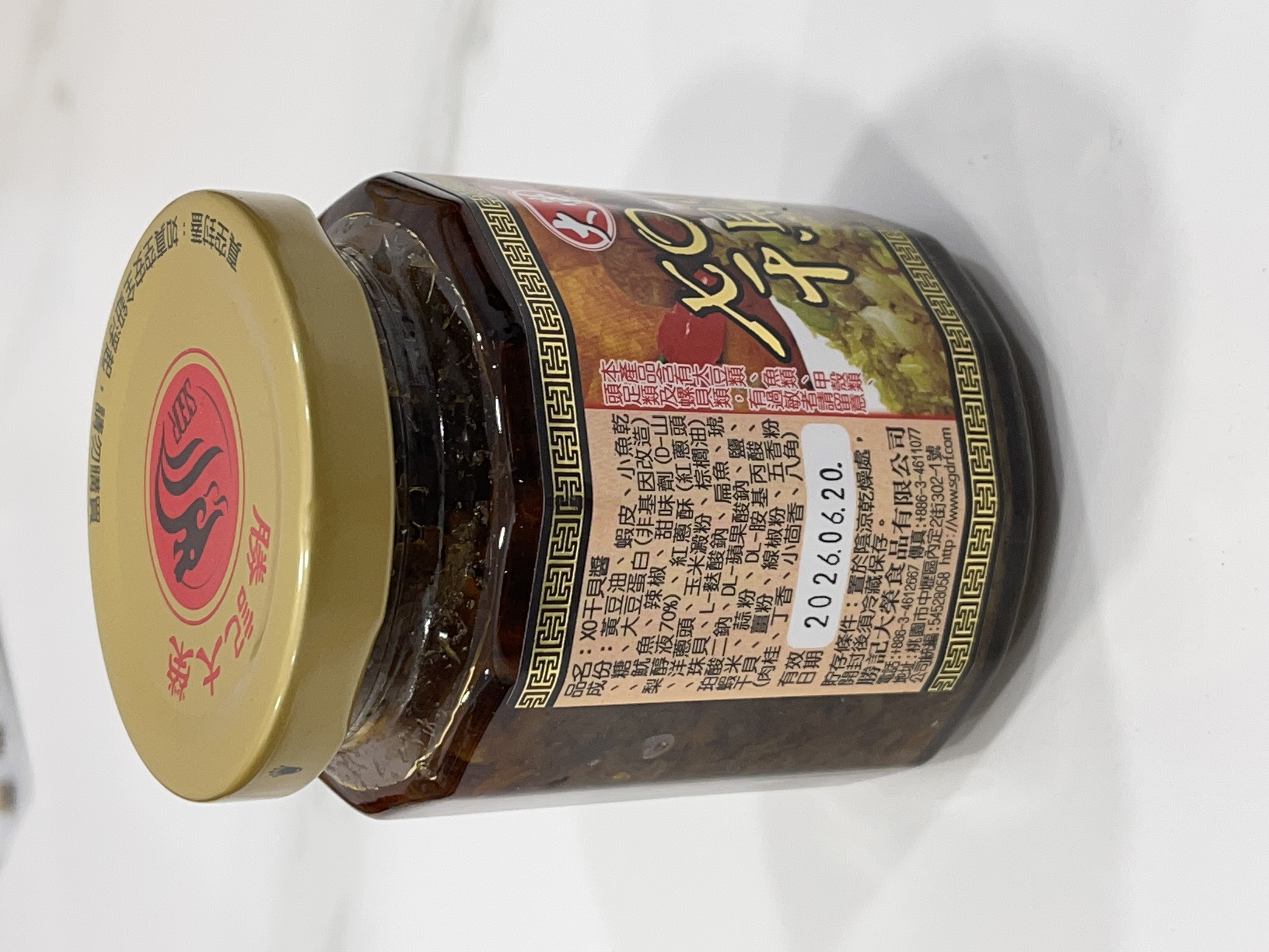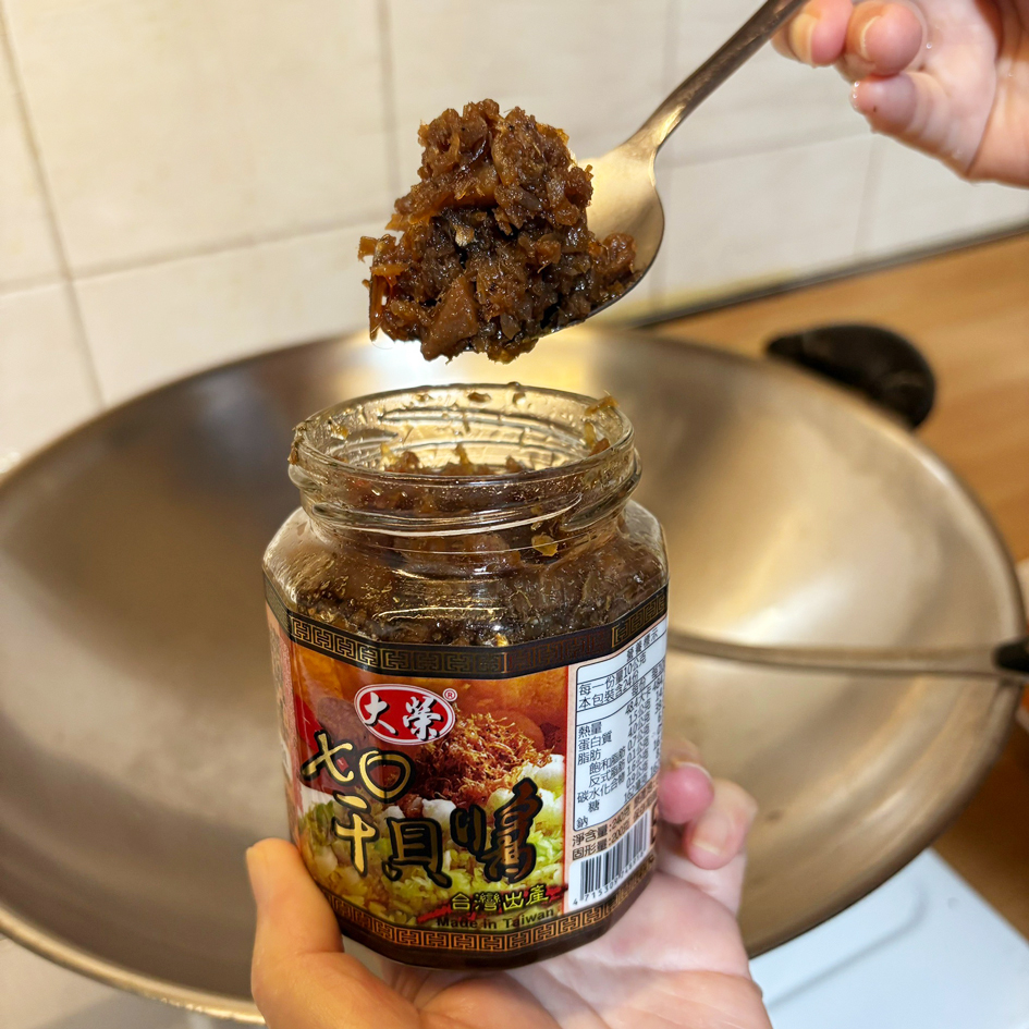 黃豆油、蝦 皮、小魚乾、糖、大豆蛋白(非基因改造)、魷魚、辣椒、甜味劑(D-山梨醇液70%)、紅蔥酥(紅蔥頭、洋蔥頭、玉米澱粉、棕櫚油)、珠貝、L-麩酸鈉、扁魚、琥珀酸二鈉、DL-蘋果酸鈉、鹽、蝦米、蒜粉、DL-胺基丙酸、干貝、薑粉、線椒粉、五香粉(肉桂、丁香、小茴香、八角)