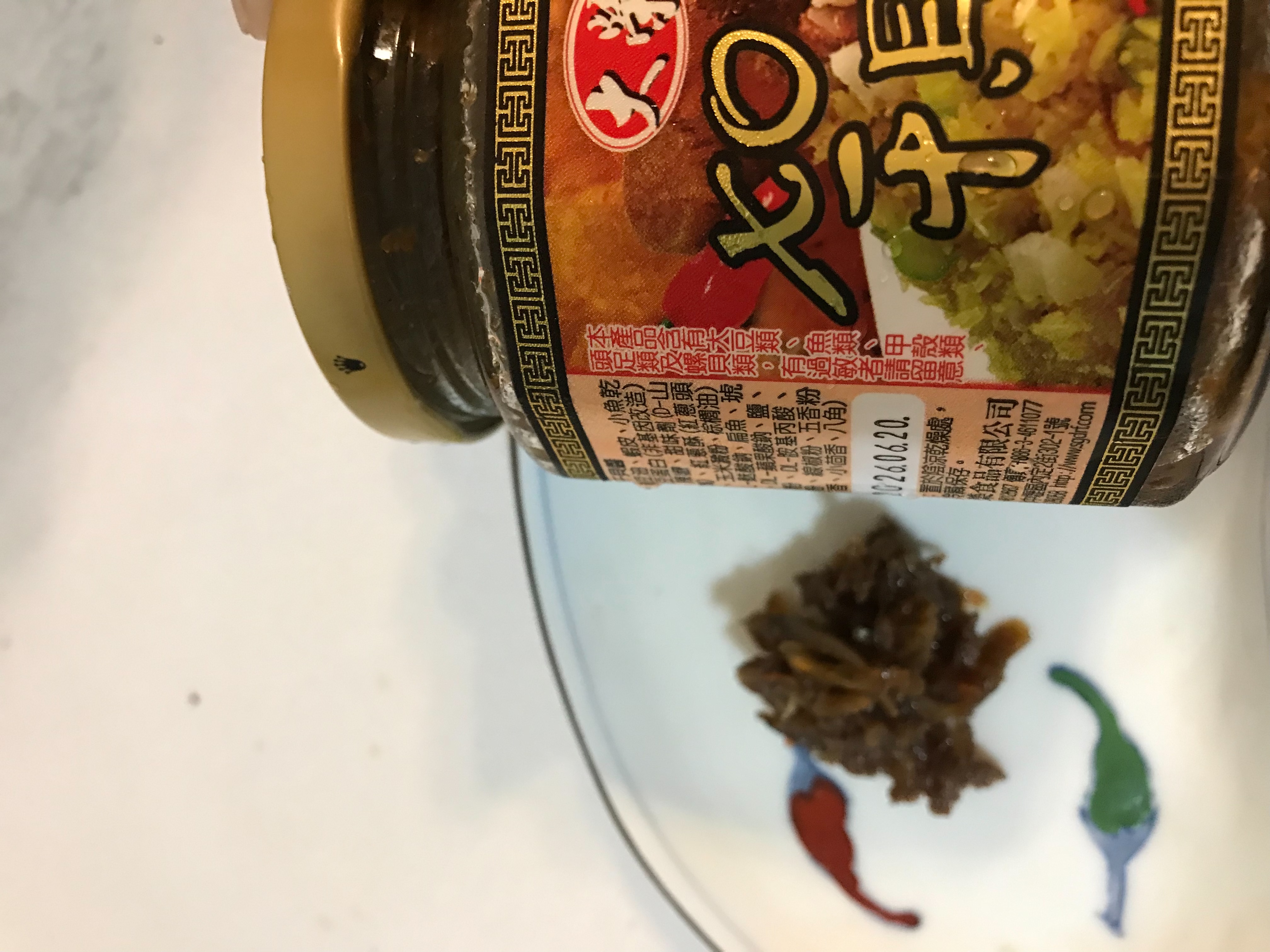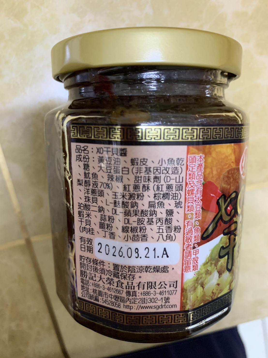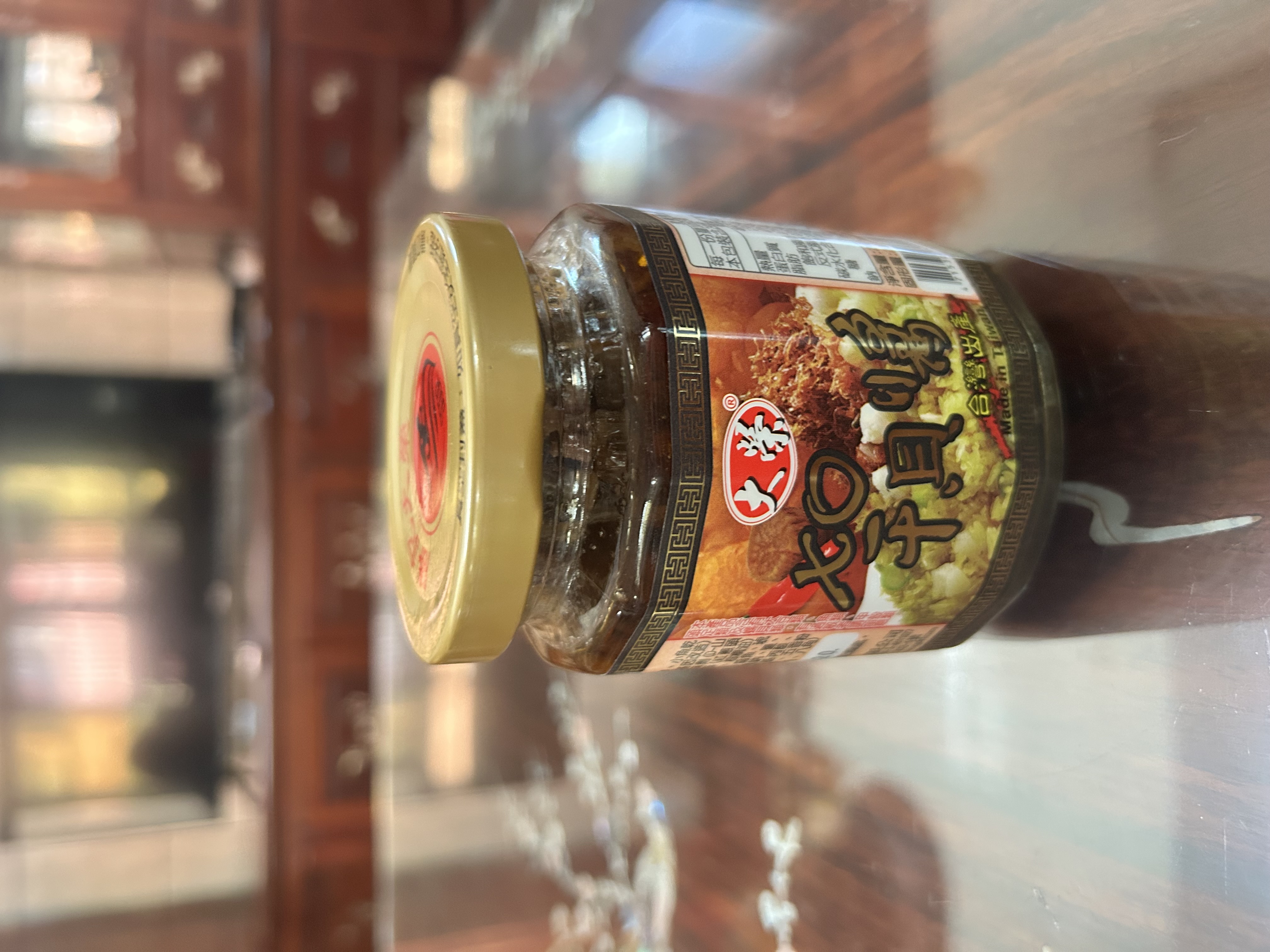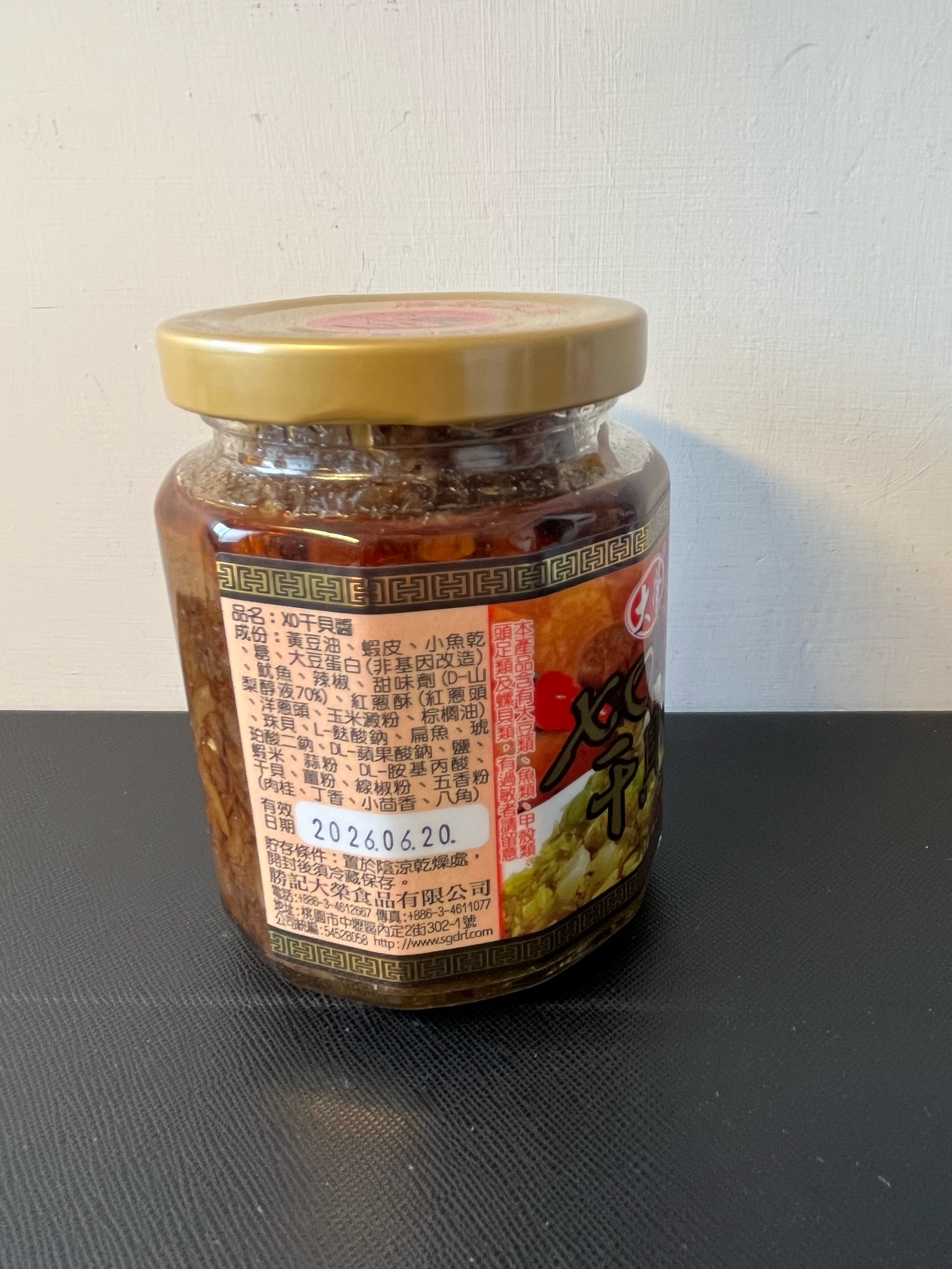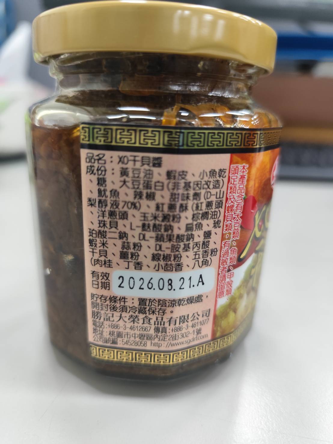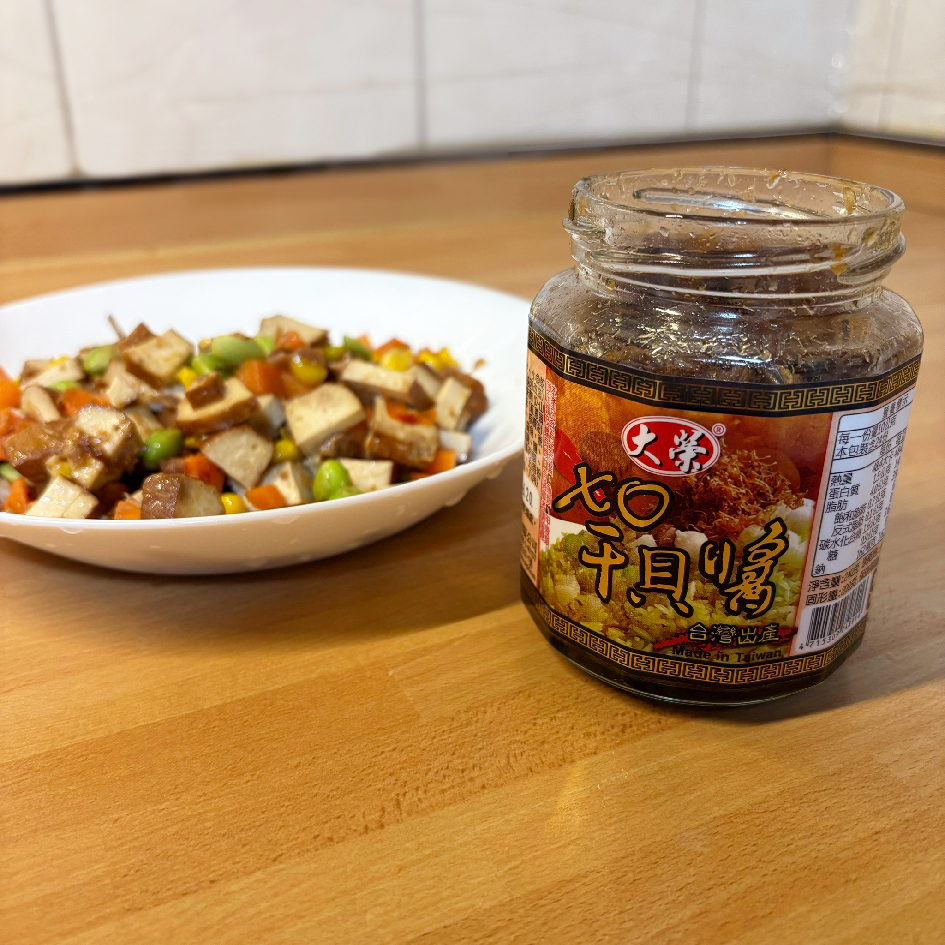 黃豆油、蝦 皮、小魚乾、糖、大豆蛋白(非基因改造)、魷魚、辣椒、甜味劑(D-山梨醇液70%)、紅蔥酥(紅蔥頭、洋蔥頭、玉米澱粉、棕櫚油)、珠貝、L-麩酸鈉、扁魚、琥珀酸二鈉、DL-蘋果酸鈉、鹽、蝦米、蒜粉、DL-胺基丙酸、干貝、薑粉、線椒粉、五香粉(肉桂、丁香、小茴香、八角)