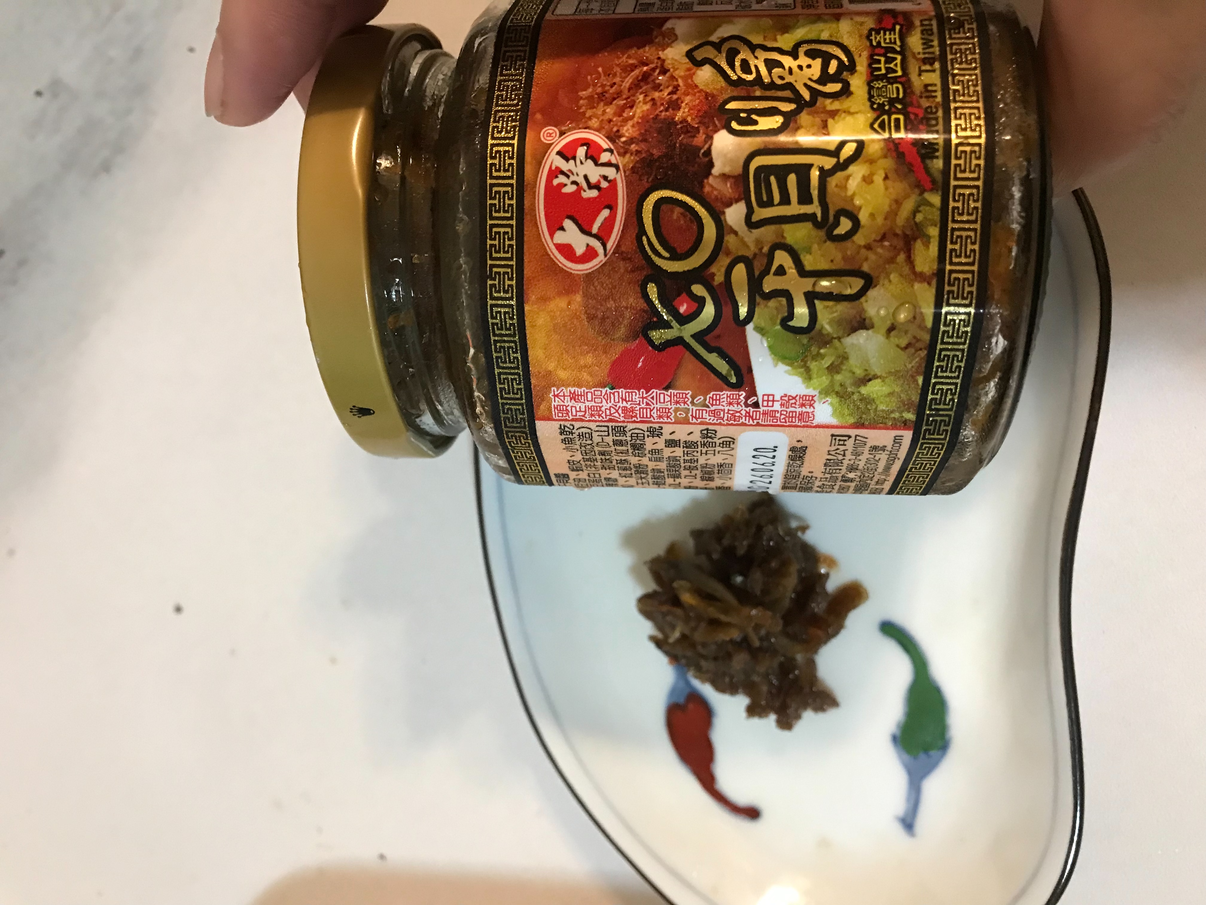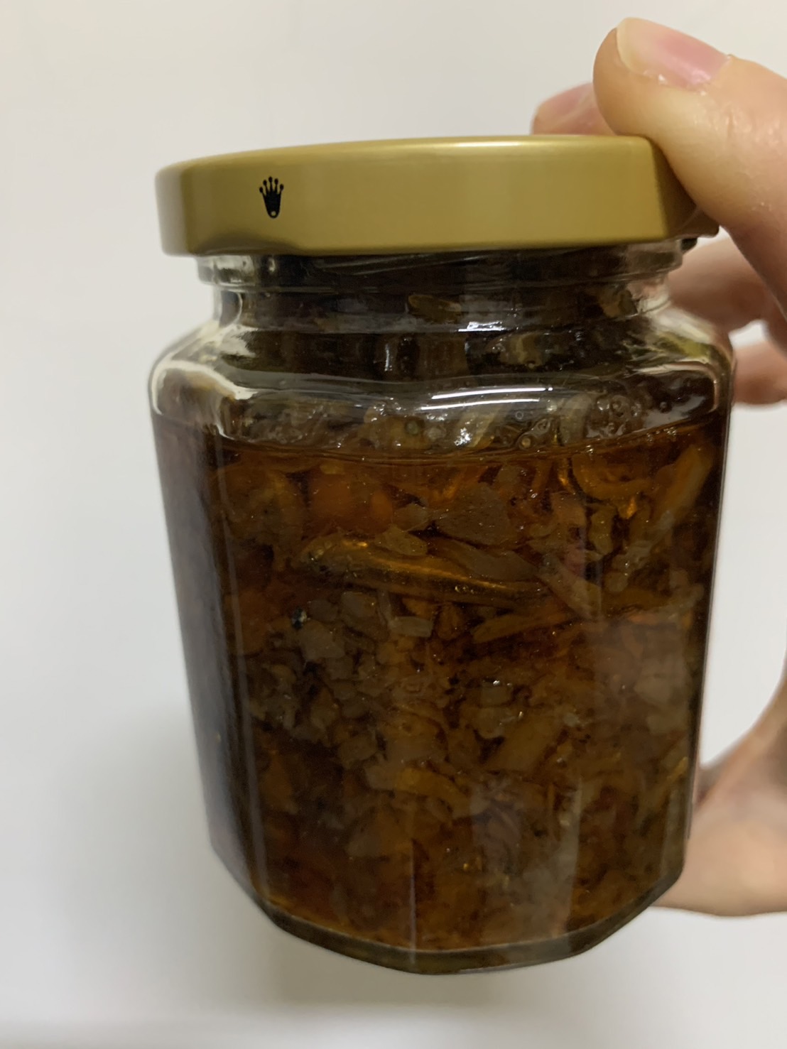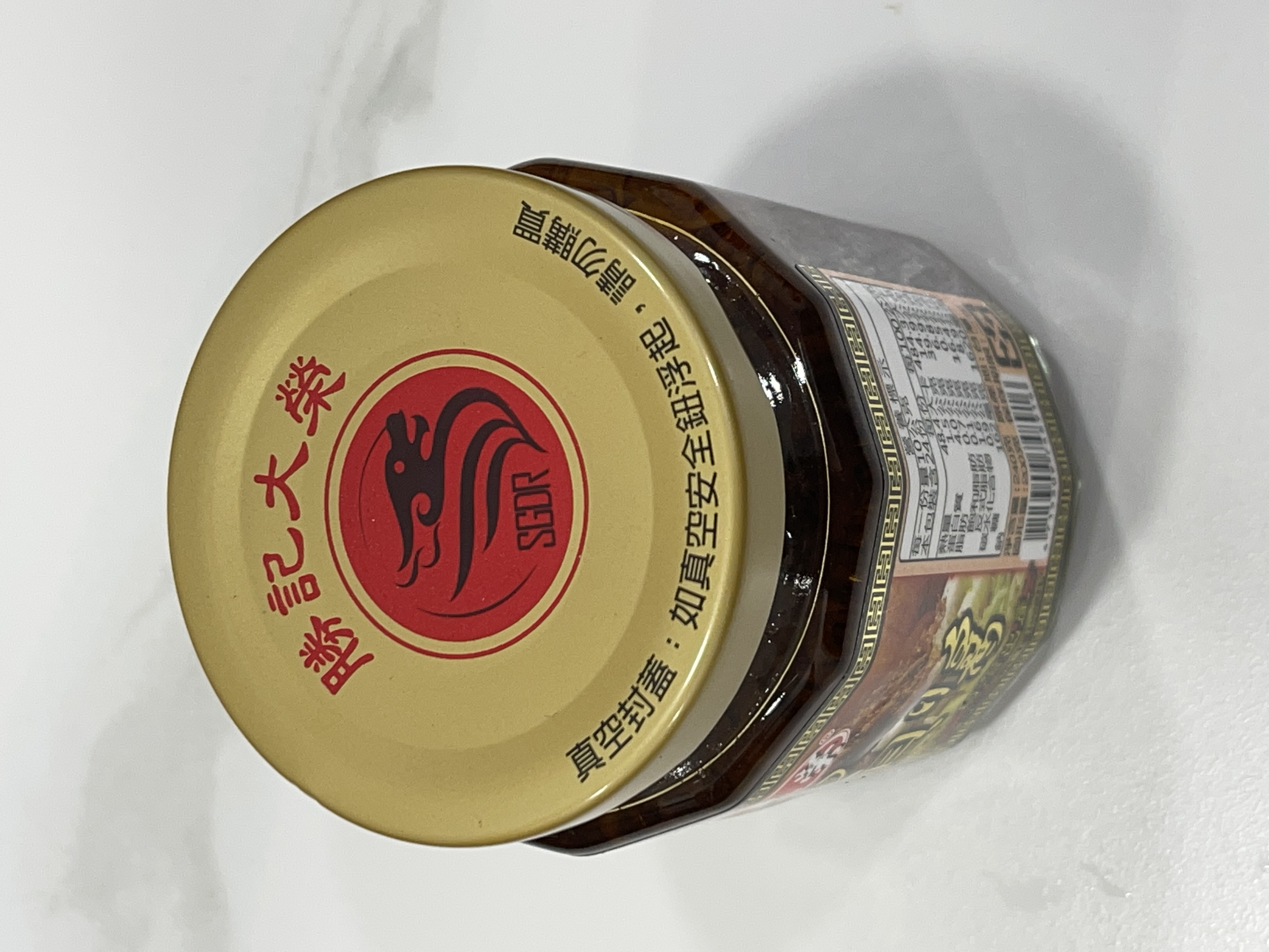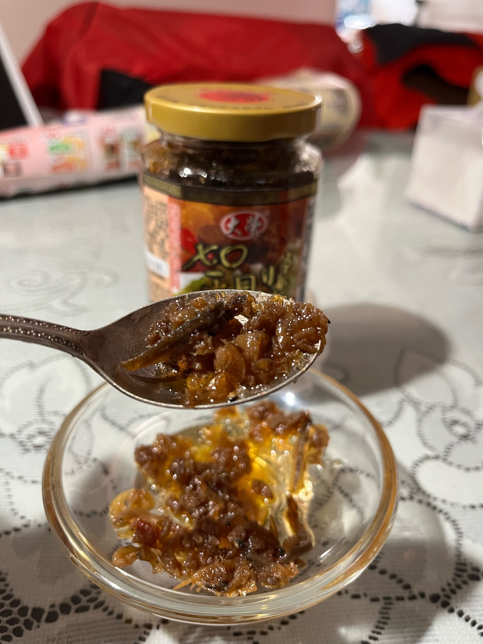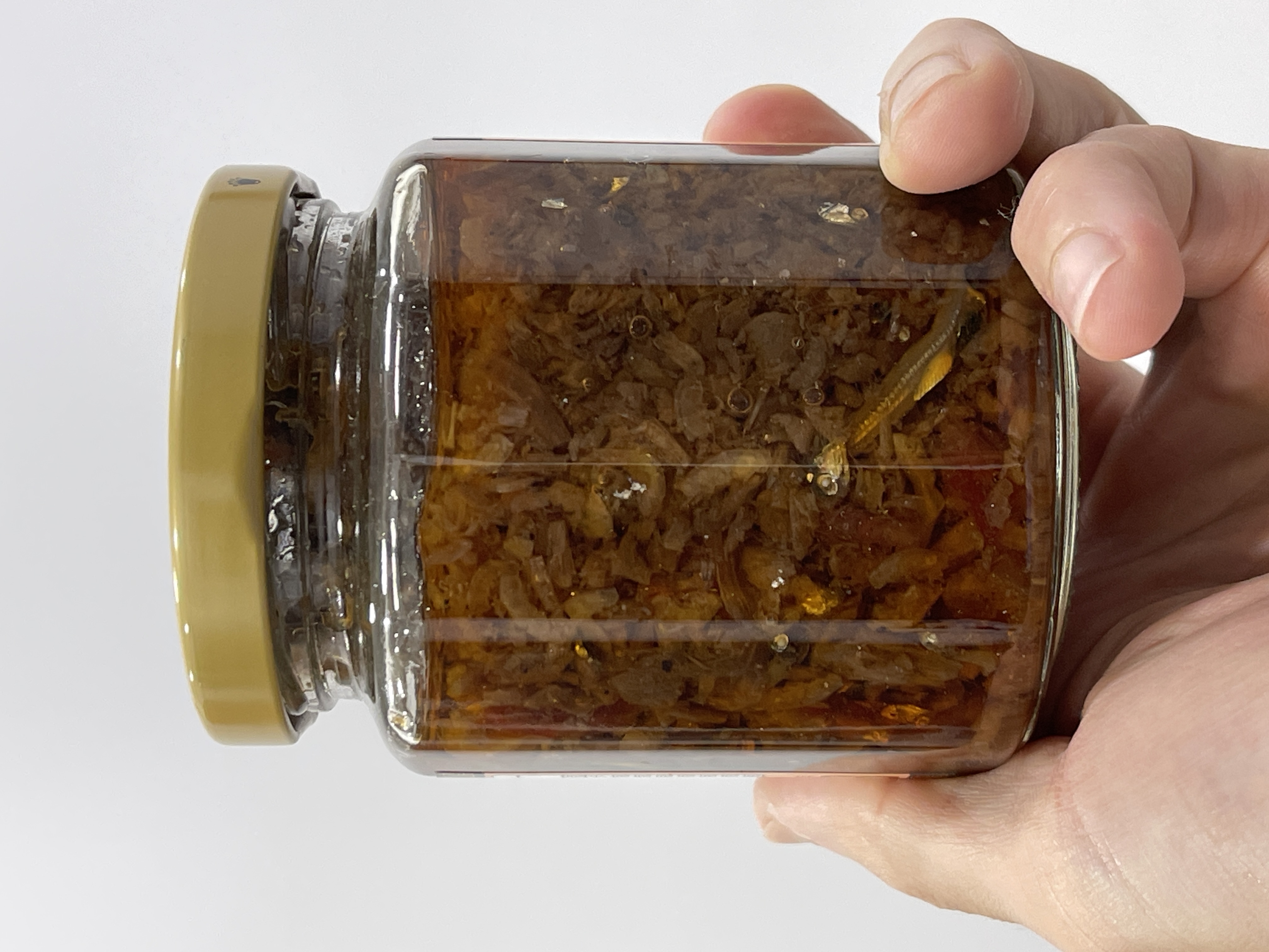 黃豆油、蝦 皮、小魚乾、糖、大豆蛋白(非基因改造)、魷魚、辣椒、甜味劑(D-山梨醇液70%)、紅蔥酥(紅蔥頭、洋蔥頭、玉米澱粉、棕櫚油)、珠貝、L-麩酸鈉、扁魚、琥珀酸二鈉、DL-蘋果酸鈉、鹽、蝦米、蒜粉、DL-胺基丙酸、干貝、薑粉、線椒粉、五香粉(肉桂、丁香、小茴香、八角)