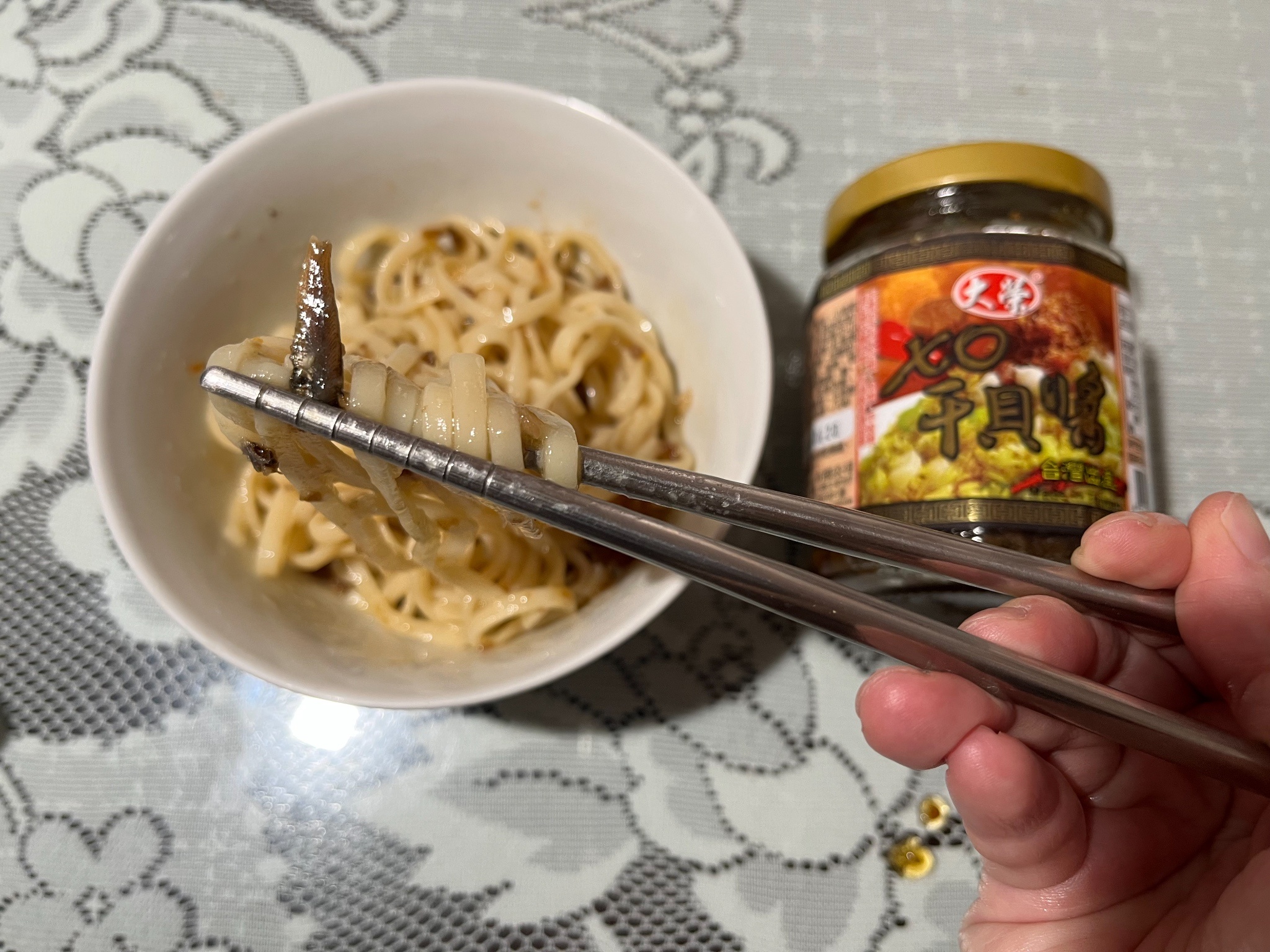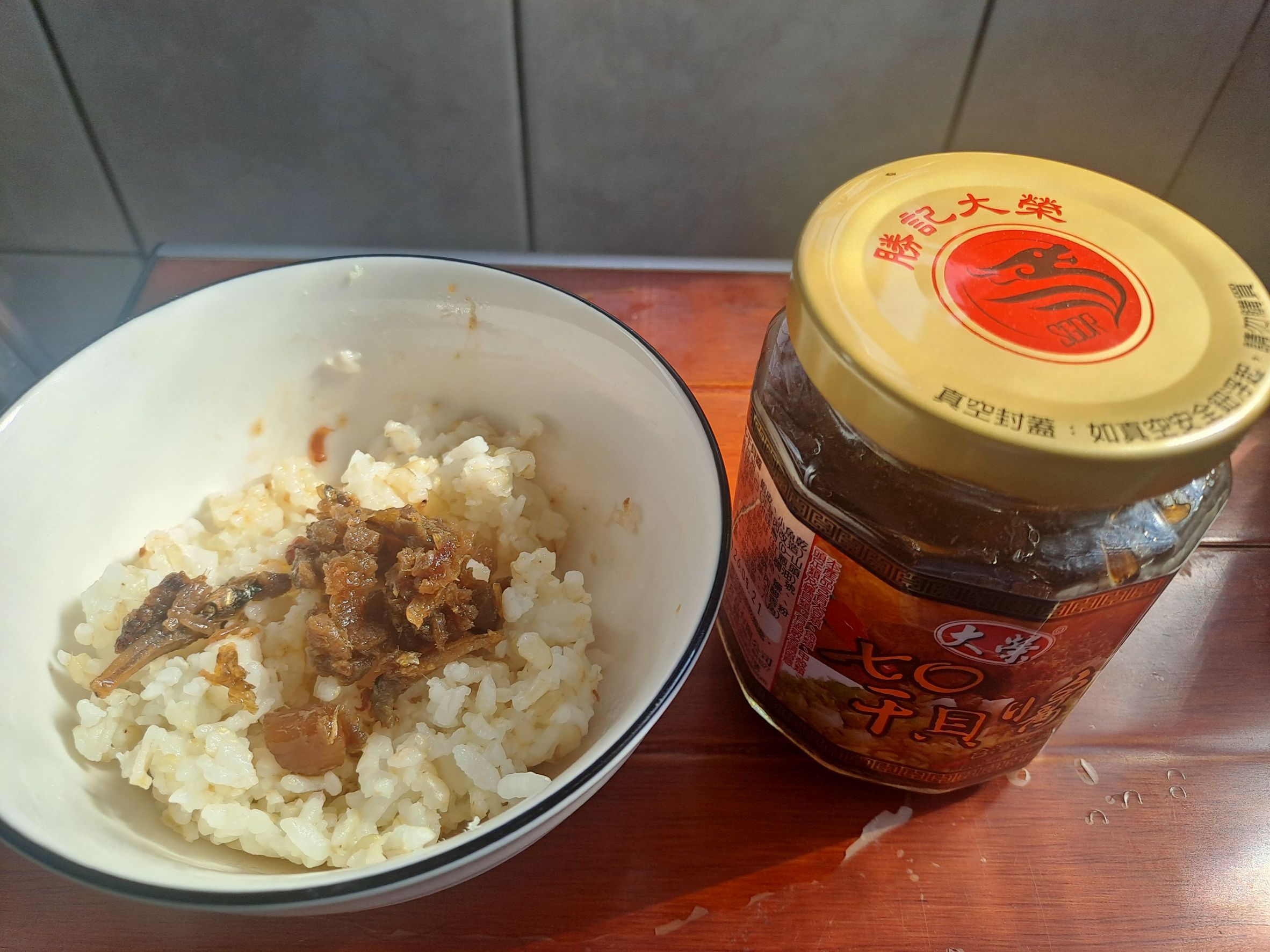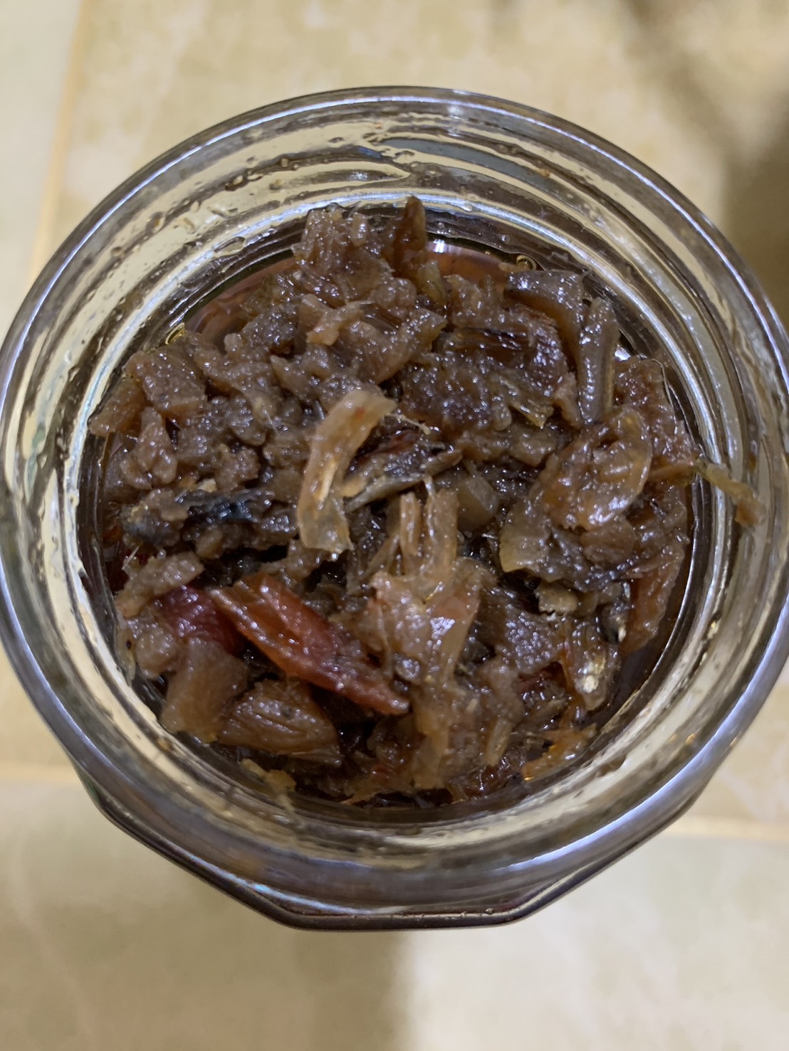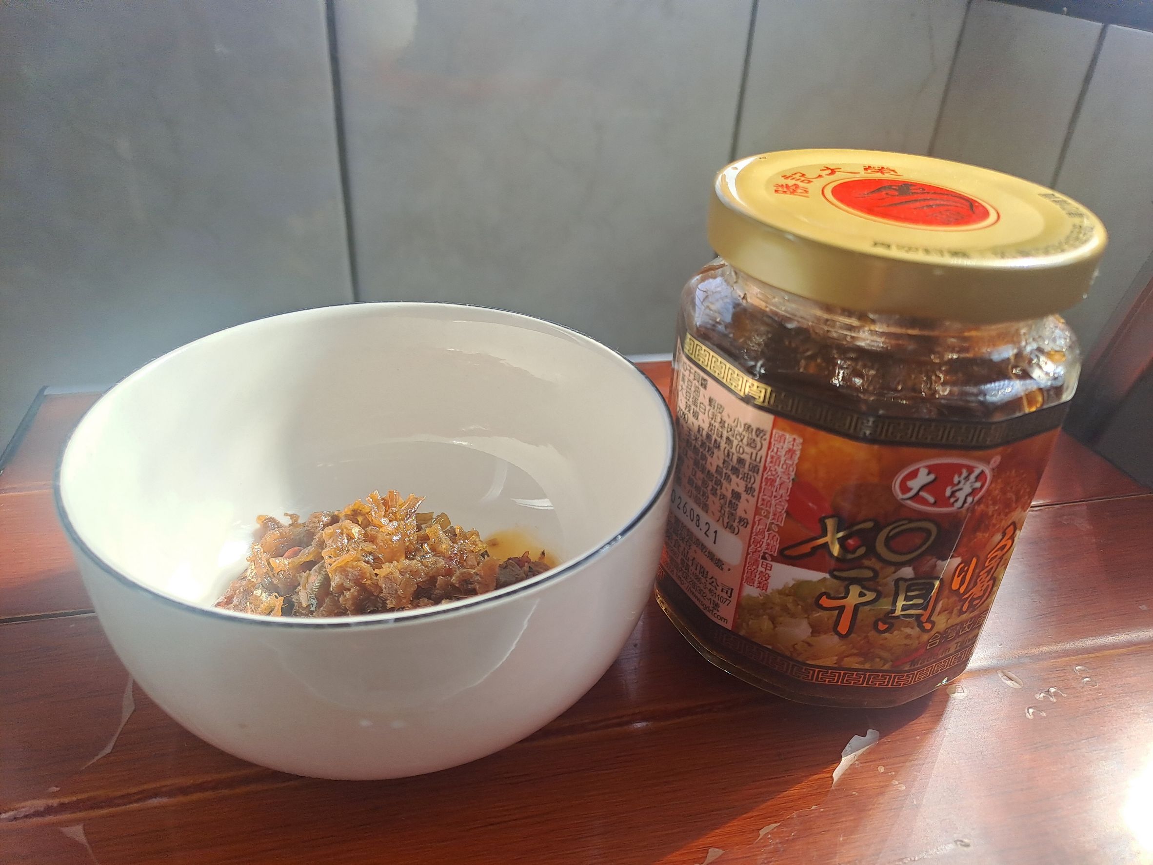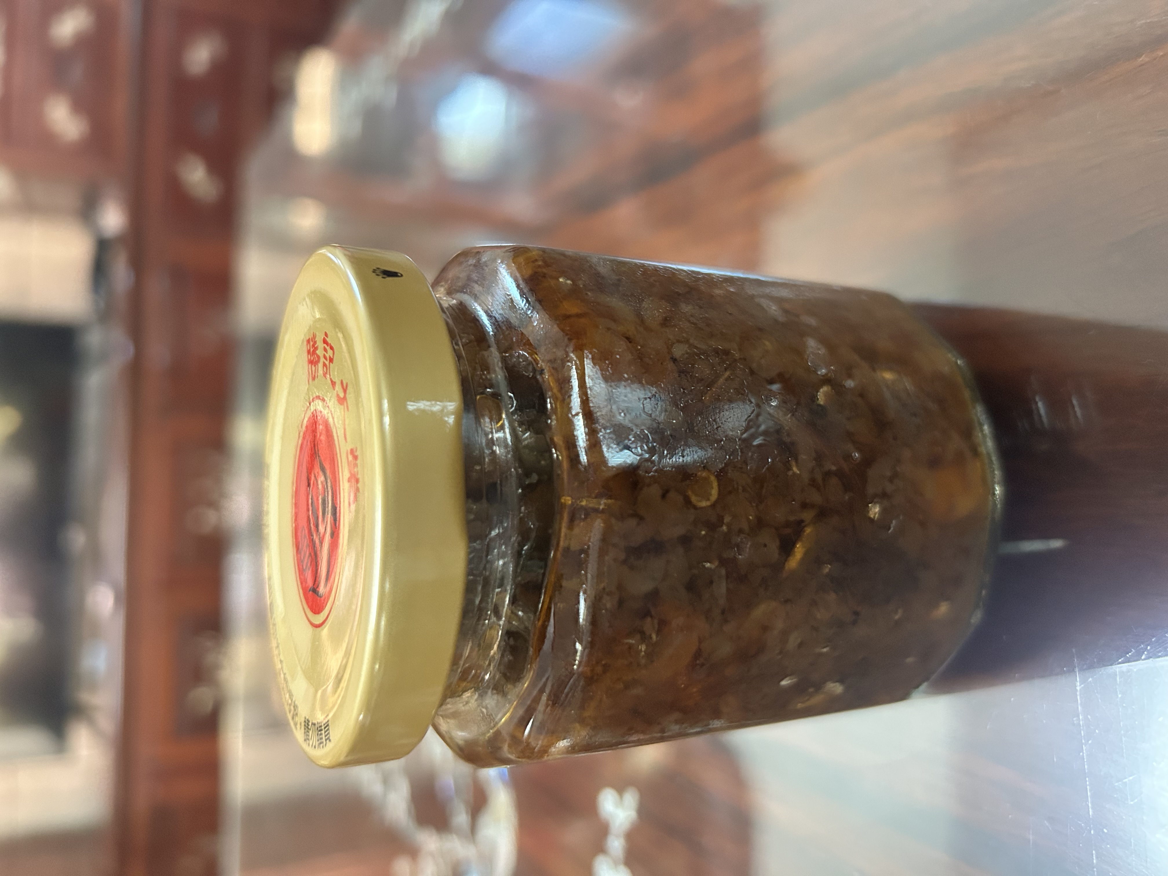 黃豆油、蝦 皮、小魚乾、糖、大豆蛋白(非基因改造)、魷魚、辣椒、甜味劑(D-山梨醇液70%)、紅蔥酥(紅蔥頭、洋蔥頭、玉米澱粉、棕櫚油)、珠貝、L-麩酸鈉、扁魚、琥珀酸二鈉、DL-蘋果酸鈉、鹽、蝦米、蒜粉、DL-胺基丙酸、干貝、薑粉、線椒粉、五香粉(肉桂、丁香、小茴香、八角)