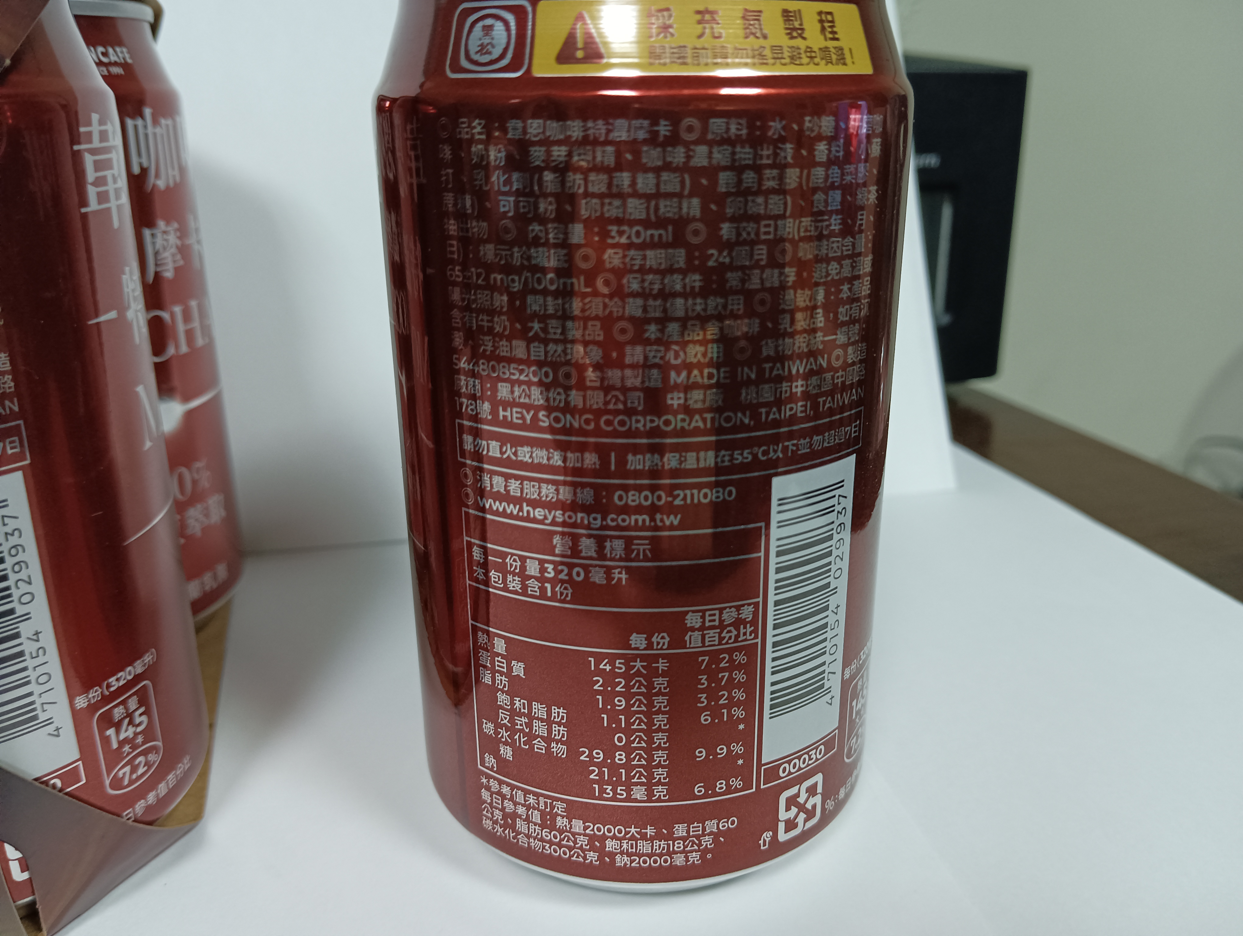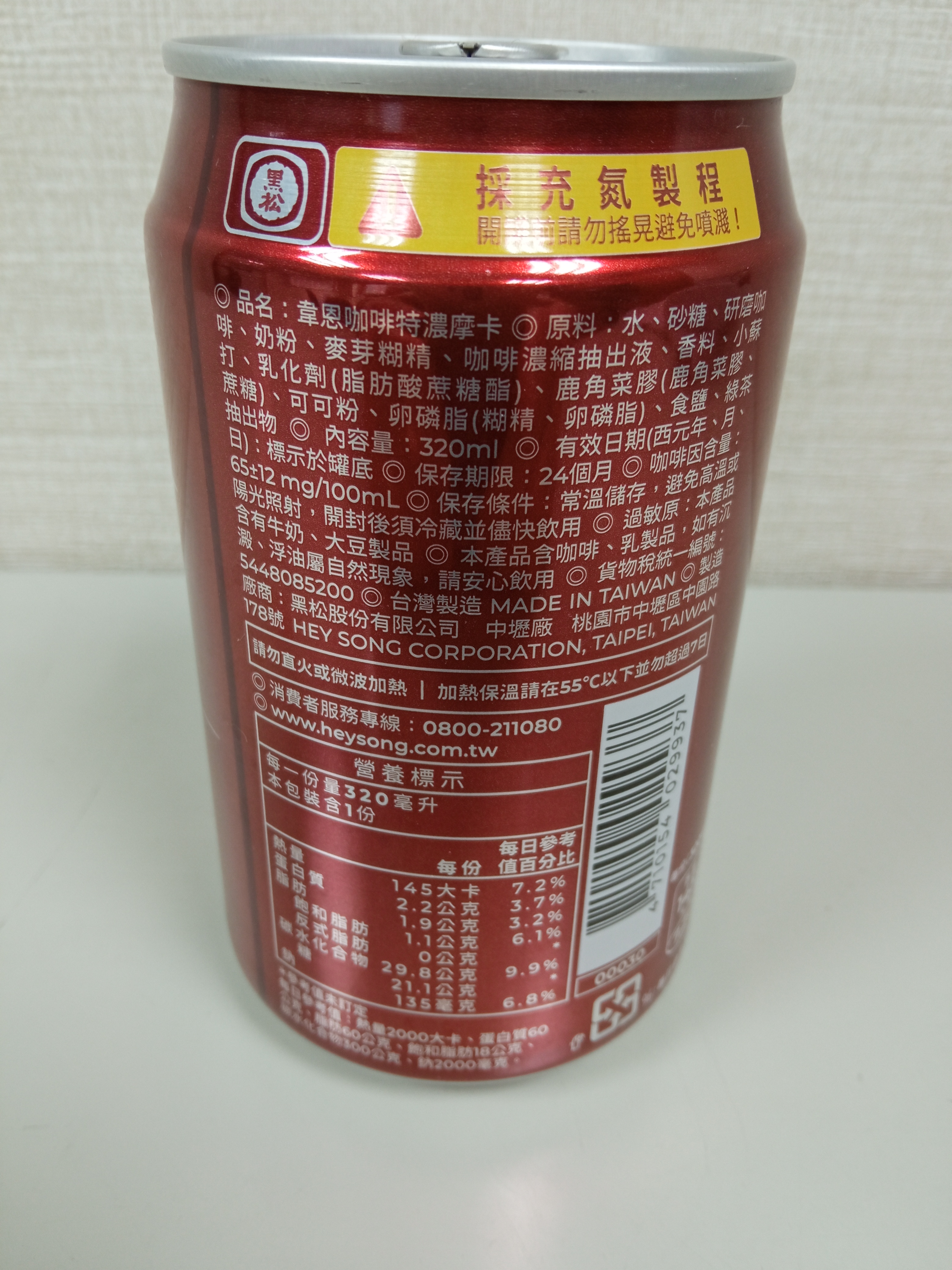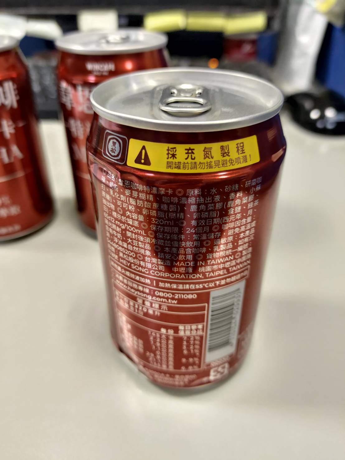 水、砂糖、研磨咖啡、奶粉、麥芽糊精、咖啡濃縮抽出液、香料、小蘇打、乳化劑 脂肪酸蔗糖酯 、鹿角菜膠 鹿角菜膠、蔗糖 、可可粉、卵磷脂 糊精、卵磷脂 、食鹽、綠茶抽出物
