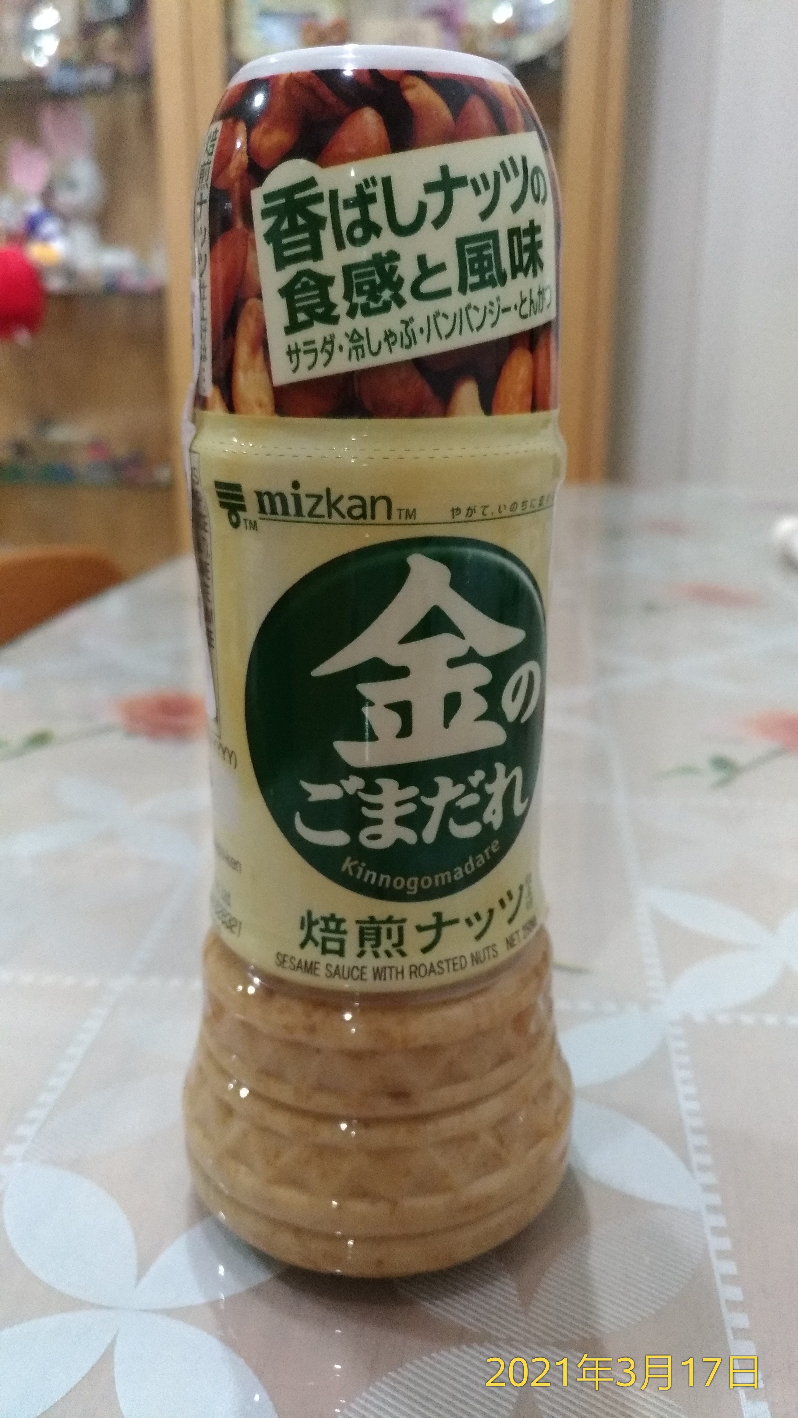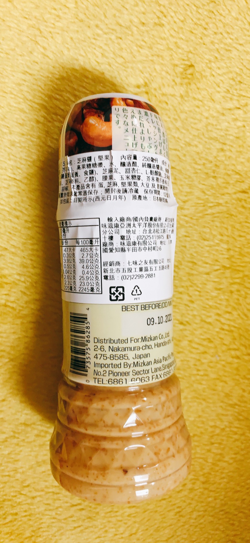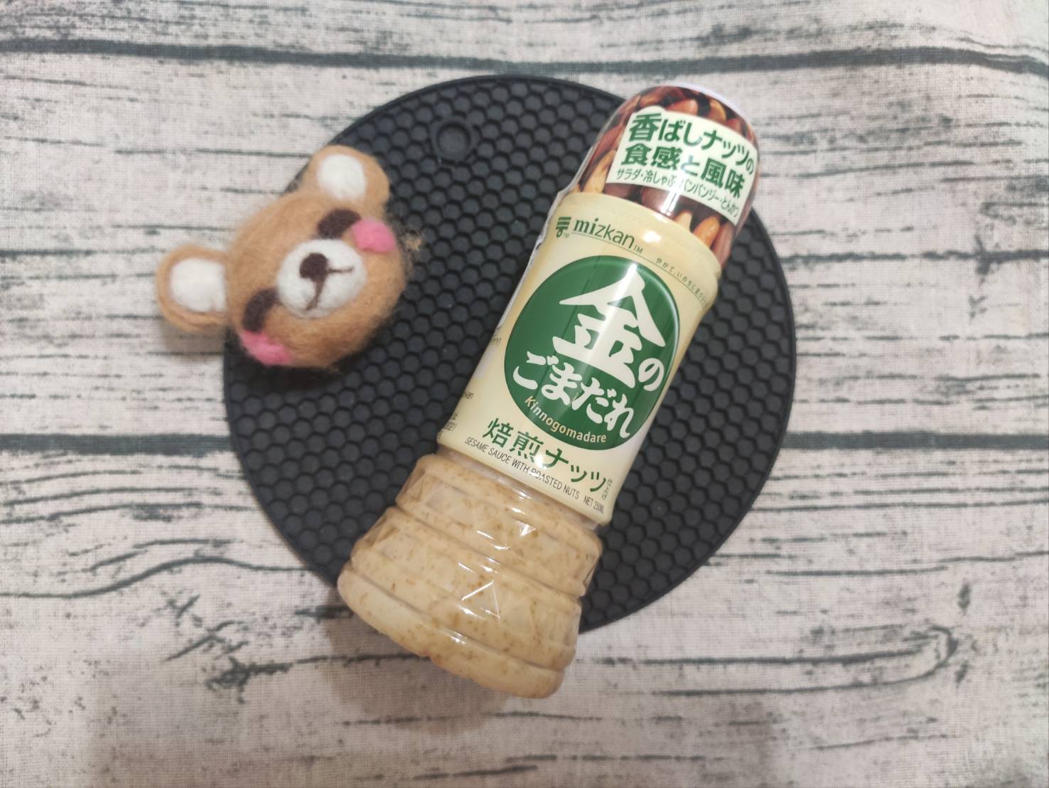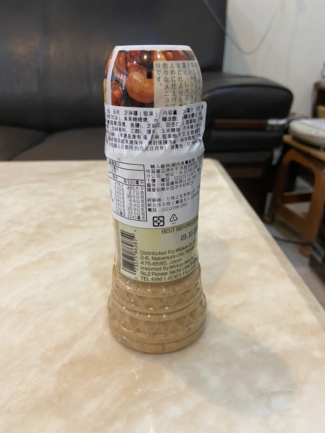 食用植物油脂(大豆油,芥花油),果糖葡萄糖糖漿,水,釀造醋,純釀造醬油,食鹽,芝麻粉,加鹽蛋黃,芝麻泥,杏仁,L-麩酸鈉,腰果,花生,複方香料(花生油,香料,乙醇,混合濃縮生育醇),芝麻複方香料[食用油脂(芝麻油,米油,芥花油,椰子油),香料,混合濃縮生育醇],玉米糖膠,芥末複方香料(玉米油,香料),香辛料(胡椒)。