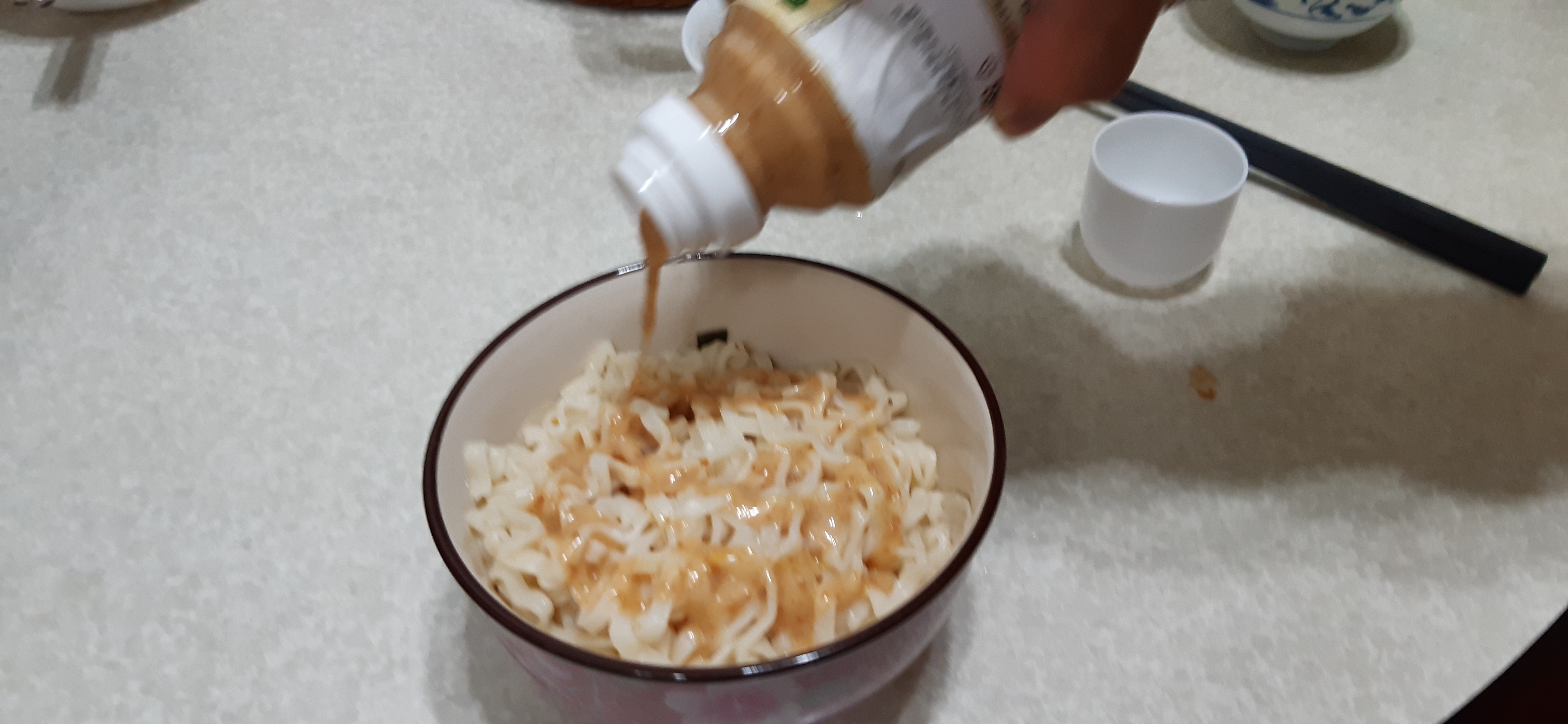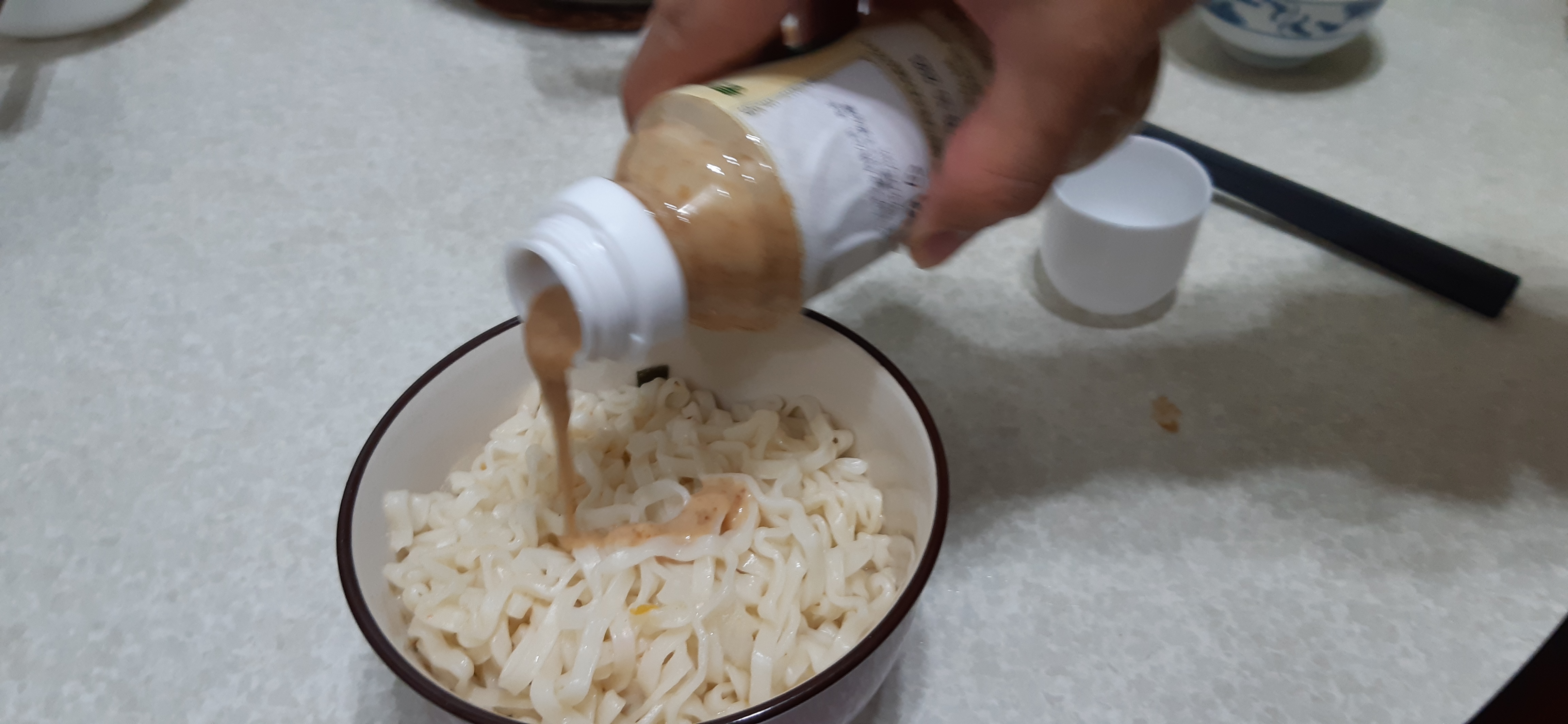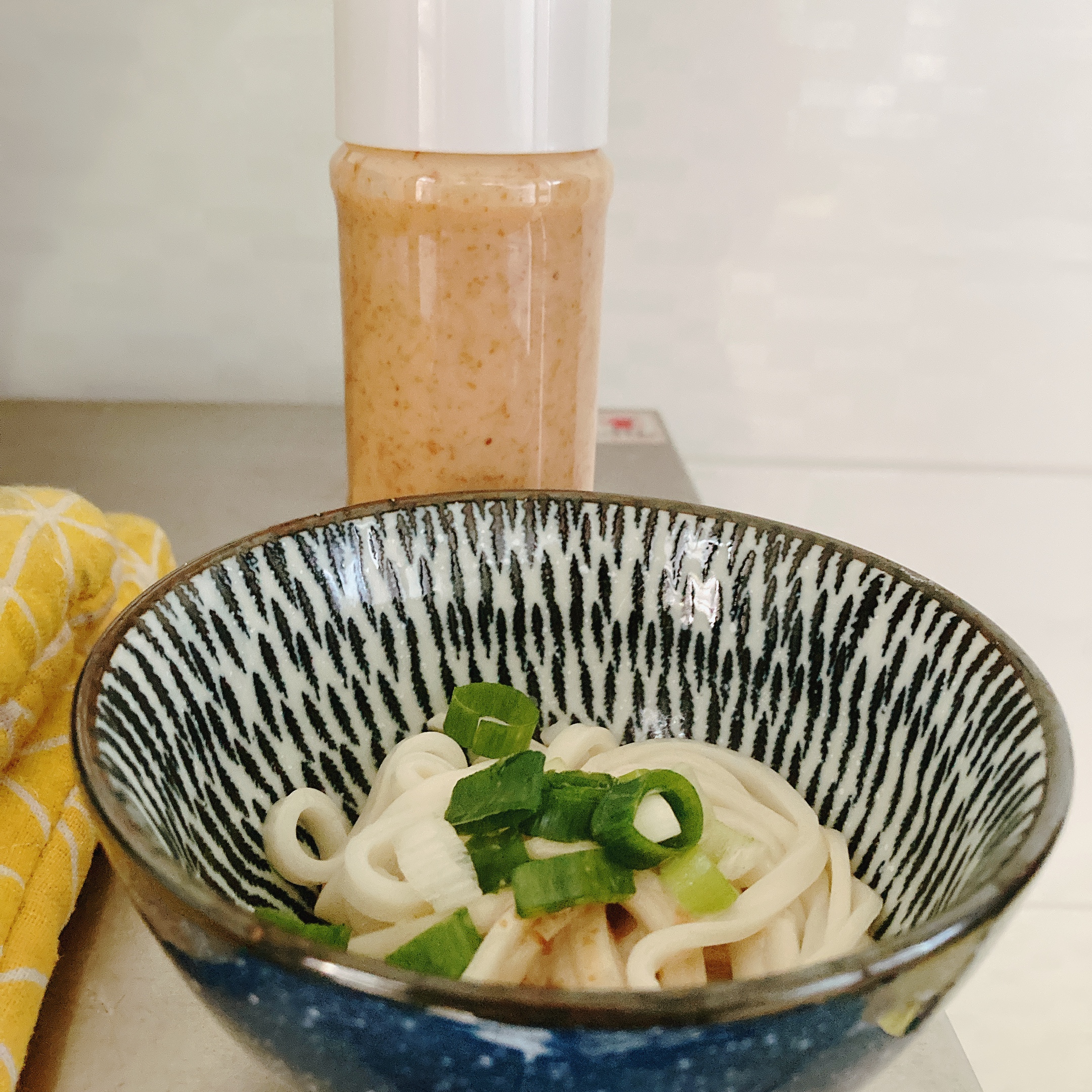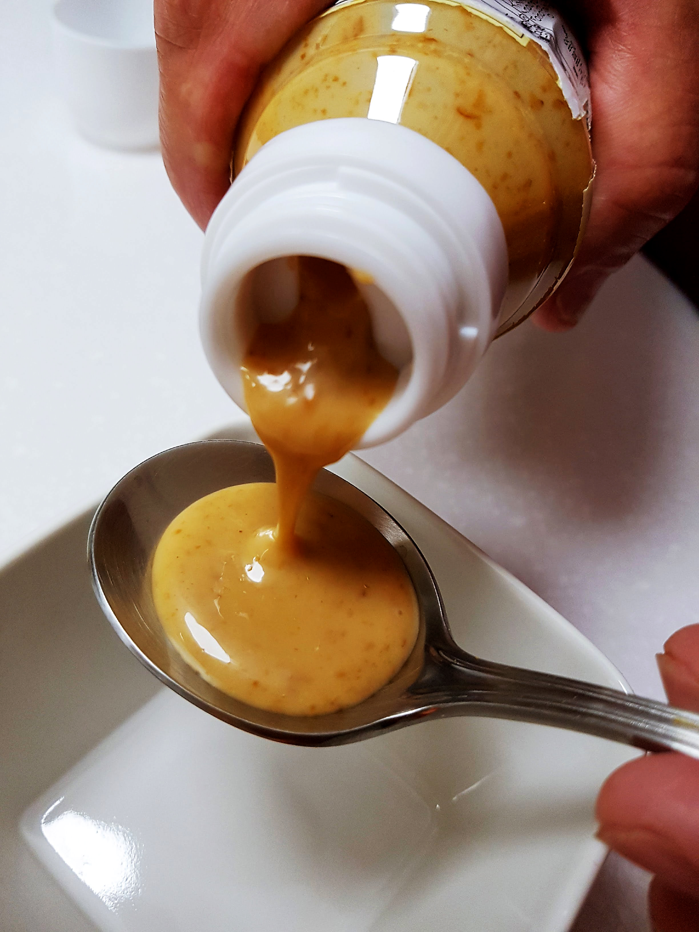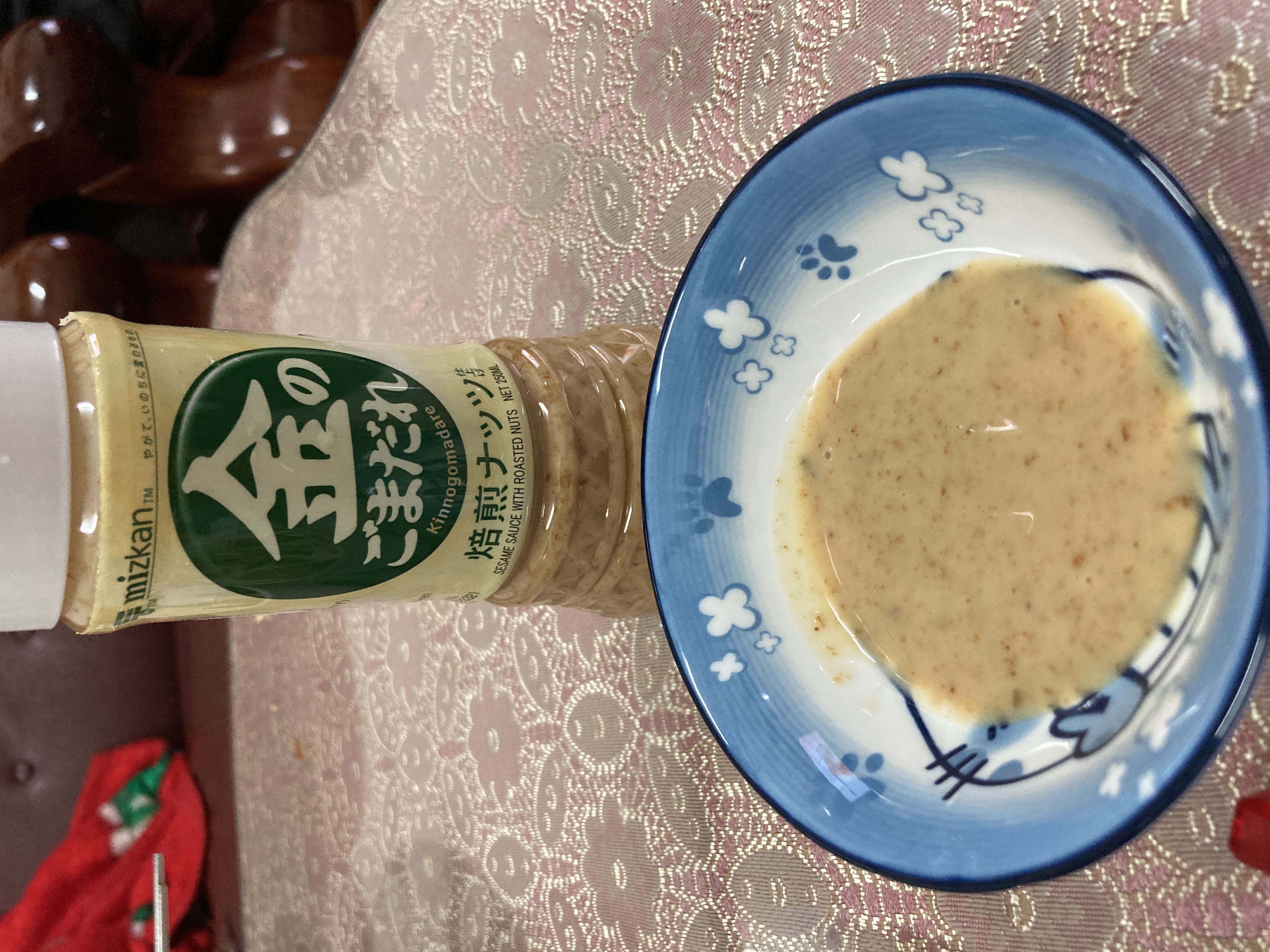 食用植物油脂(大豆油,芥花油),果糖葡萄糖糖漿,水,釀造醋,純釀造醬油,食鹽,芝麻粉,加鹽蛋黃,芝麻泥,杏仁,L-麩酸鈉,腰果,花生,複方香料(花生油,香料,乙醇,混合濃縮生育醇),芝麻複方香料[食用油脂(芝麻油,米油,芥花油,椰子油),香料,混合濃縮生育醇],玉米糖膠,芥末複方香料(玉米油,香料),香辛料(胡椒)。