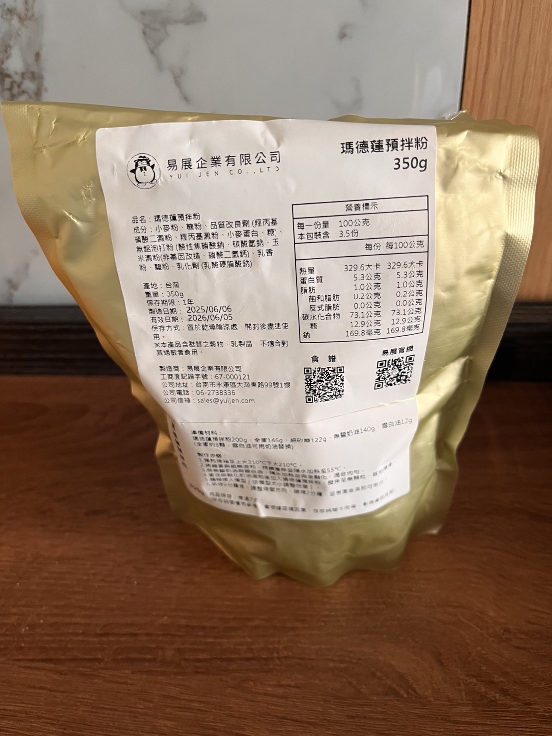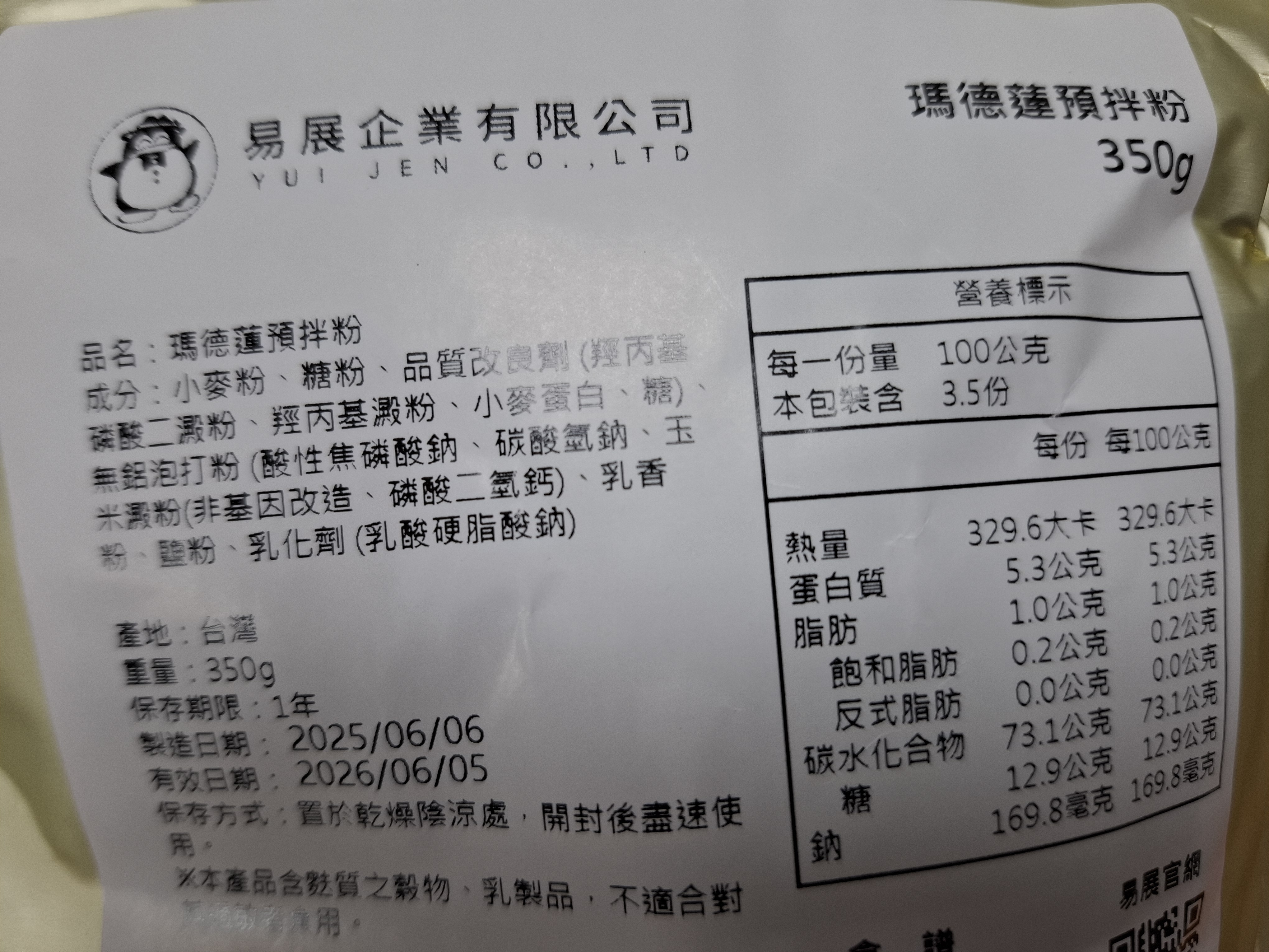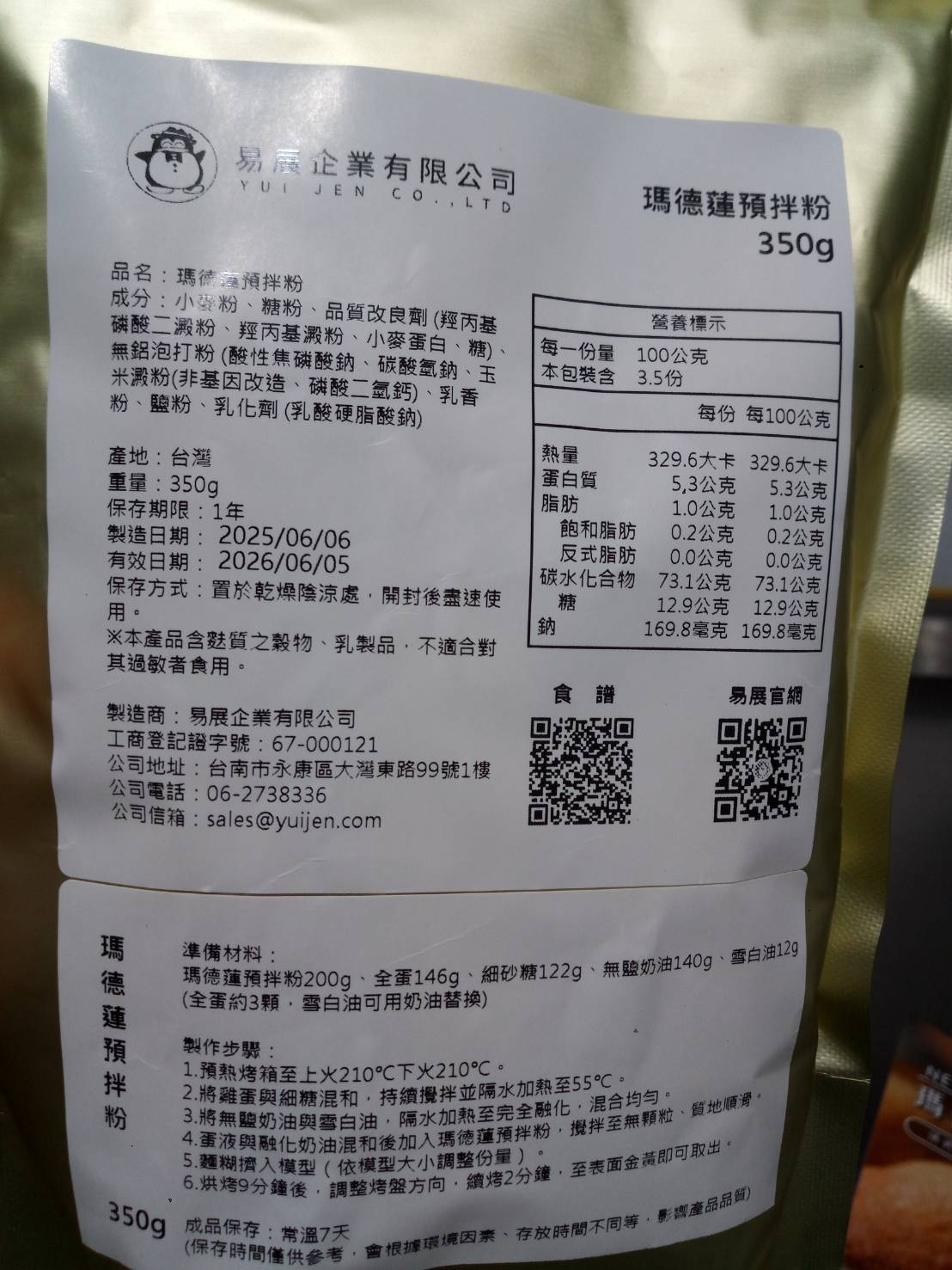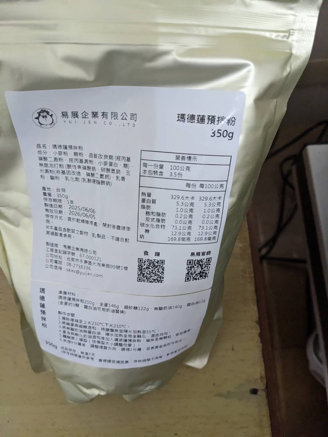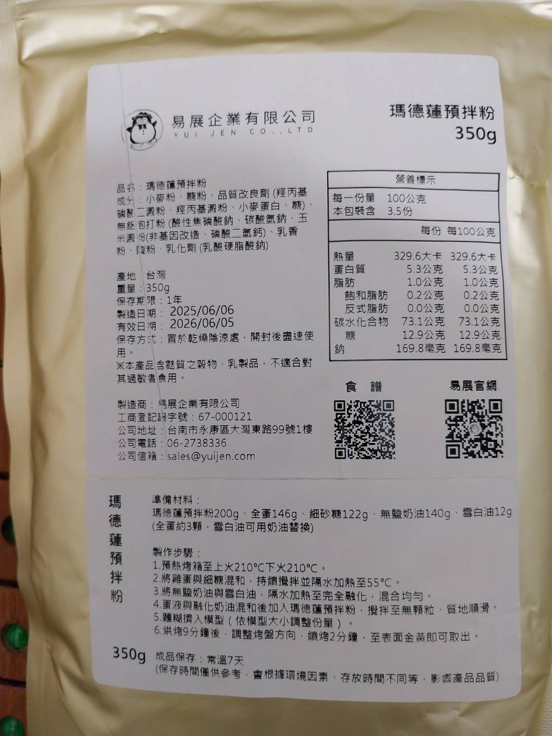 回列表 易展瑪德蓮預拌粉:30分鐘立即出爐,讓你新手變大師 市價190元 (免費申請) 所需等級 一般會員以上 所需學分 30 體驗份數 30 關注人數 1766 申請人數 143 申請截止 品牌業者:易展企業有限公司 負責廠商 易展企業有限公司 廠商地址 台南市永康區大灣東路99號 產地 台灣 試用產品規格 350g 食品業者登錄字號 D-116227019-00000-9 投保產品責任險字號 0506字第24AML0003736號 心得分享 商品介紹 商品成分 使用方法 注意事項 體驗名單 8.8 易展瑪德蓮預拌粉:30分鐘立即出爐,讓你新手變大師 包裝美學 8.3 製作方便 8.8 甜味適中 8.8 口感蓬鬆 9.0 建議推薦 8.8 心得分享 24則 陳諭萱 鑽石達人 27歲 臺南市 2025/07/17 對易展瑪德蓮預拌粉:30分鐘立即出爐,讓你新手變大師留下評價 9 瑪德蓮是經典的法式甜點,不敗的品項擁有一群死忠愛好者,例如我!這款瑪德蓮預拌粉真的是甜點愛好者的福音,只要一包預拌粉就可以讓你省去調配食譜的困擾、原料的浪費及甜點品質的不一致,在家也可以輕鬆做出高級甜點。標榜三十分鐘就可以立即出爐的產品,究竟有多厲害呢!你只需要有烤箱、有雞蛋、有無鹽奶油及砂糖,和這包厲害的瑪德蓮預拌粉,就能讓甜點店裡香氣逼人的瑪德蓮大功告成,對於新手十分友善唷!進階一點,如果想增加其他風味,例如茶口味、果醬、麻糬等也都是可以的,建議製作原味瑪德蓮上手後,也可以嘗試研發處自己獨特的喜好風味。總之,很推薦給想在家自己嘗試做甜點的你,或是想免除研發苦惱的新手甜點師,一個字讚! 莊佳縈 鑽石達人 32歲 臺中市 2025/07/18 對易展瑪德蓮預拌粉:30分鐘立即出爐,讓你新手變大師留下評價 9 │易展瑪德蓮預拌粉│感謝食力與易展企業有限公司品牌業者合作才有機會收到食力體驗品-易展瑪德蓮預拌粉貼心提供瑪德蓮食譜製作時間非常迅速30分鐘立即出爐新手也能輕鬆做出完美瑪德蓮蓬蓬肚正統法式比例鬆軟外酥讓口味多樣化更加豐富隨即開啟家人們的食慾👉成分內容物小麥粉、糖粉、品質改良劑 (羥丙基磷酸二澱粉、羥丙基澱粉、小麥蛋白、糖)、無鋁泡打粉(酸性焦磷酸鈉、碳酸氫鈉、玉米澱粉(非基因改造)、磷酸二氫鈣)、乳香粉、鹽粉、乳化劑 (乳酸硬脂酸鈉)👉過敏原資訊本產品含有乳製品、麩質之穀物及其製品,不適合對其過敏體質者食用👉營養標示每一份量100公克本包裝含3.5份每份熱量 329.6Kcal蛋白質 5.3g脂肪 1.0g 飽和脂肪 0.2g 反式脂肪 0.0g碳水化合物 73.1g 糖 12.9g鈉 169.8mg👉食用方法準備材料:瑪德蓮預拌粉200g全蛋146g細砂糖122g無鹽奶油140g雪白油12g(全蛋約3顆,雪白油可用奶油替換) 製作步驟:1.預熱烤箱至上火210°C下火210°C。2.將雞蛋與細糖混和,持續攪拌並隔水加熱至55°C。3.將無鹽奶油與雪白油,隔水加熱至完全融化,混合均勻。4.蛋液與融化奶油混和後加入瑪德蓮預拌粉,攪拌至無顆粒、質地順滑。5.麵糊擠入模型(依模型大小調整份量)。6.烘烤9分鐘後,調整烤盤方向,續烤2分鐘,至表面金黃即可取出。 徐梅燕 鑽石達人 39歲 苗栗縣 2025/07/18 對易展瑪德蓮預拌粉:30分鐘立即出爐,讓你新手變大師留下評價 10 其實一開始是沒想抽易展瑪德蓮預拌粉,因為要實作怕麻煩,後來覺得蠻慶幸最後有機會試吃~很久不曾做過點心,工具和需要的材料隨手都有,易展瑪德蓮預拌粉很方便,只要依照包裝後面的作法就能做出好吃的瑪德蓮,工具部份我還是有上點奶油比較好脫模。易展瑪德蓮預拌粉打開包裝時就有淡淡的香味,要拌入液體時也很好混勻,不會有顆粒,烤好口感有點像雞蛋糕又稍微扎實些,我是做原味還有玫瑰花醬口味,因為先前試吃的玫瑰花醬還有所以添加進去沒想到很香,所以可以多試驗一些不同口味~易展瑪德蓮預拌粉算是以後如果想吃瑪德蓮也願意自己操作的材料,味道上蠻喜歡,甜度也可以自己調整,操作上也很簡易省了打發蛋的步驟,算是簡易點心材料~ 尤引呈 鑽石達人 33歲 臺中市 2025/07/19 對易展瑪德蓮預拌粉:30分鐘立即出爐,讓你新手變大師留下評價 10 這次的試驗品為瑪德蓮預拌粉,並非平常一般的直接試吃品,需要一點手作時間,首先從拿到實體包裝,質感美感設計就相當舒適宜人,而且還貼心附有食譜材料及作法,由於大部分的材料所需已經事先添加在預拌粉整合,對於新手及懶人真得相當親切方便,只要準備雞蛋和細砂糖混合隔水加熱,再把無鹽奶油和雪白油隔水加熱混合,之後將兩者與預拌粉再混合攪拌即可倒入模具送入烤箱,從頭到尾時間都是花在備齊食材,攪拌混合,烤箱出爐,製作方法簡單速成,而且原料食材都很簡單輕易找齊,像我這種不常做烘焙的人,只為這一次性的烘焙,食材及工具都無須花太多心思備齊,況且雪白油也有替代品供參考使用,而我則是使用豬油替代,所以基本上食材就算有剩,一般廚房家庭都能消耗使用完畢,不會有那種為了做某西點而購買一次性某材料,然後做完這次成品就丟著再也用不到的情況發生,最後製成由於我沒有模具,所以索性直接倒入烤盤,直接做成像是派餅糕點一般,而非瑪德蓮式的小塊糕餅,味道甜度口感真的是相當一級棒,最重要的一點是成品出爐易脫模,不沾黏好清洗好收尾,超有烘焙成就感,不給滿分真的說不過去。 洪碧珍 鑽石達人 70歲 彰化縣 2025/07/20 對易展瑪德蓮預拌粉:30分鐘立即出爐,讓你新手變大師留下評價 9 這款 瑪德蓮預拌粉 真的像甜點界的超級英雄—