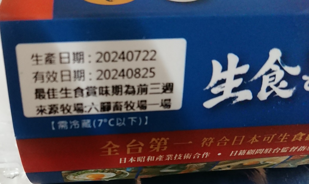 請冷藏7°C以下,若超過生食賞味期限,請於有效期限內充分加熱食用。