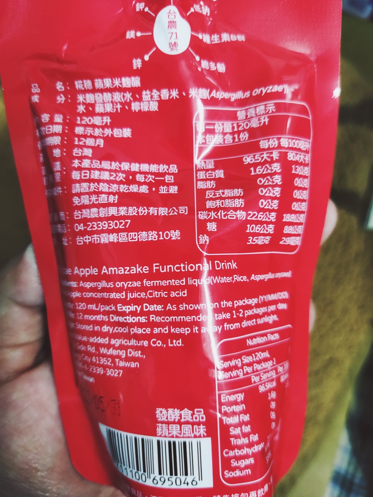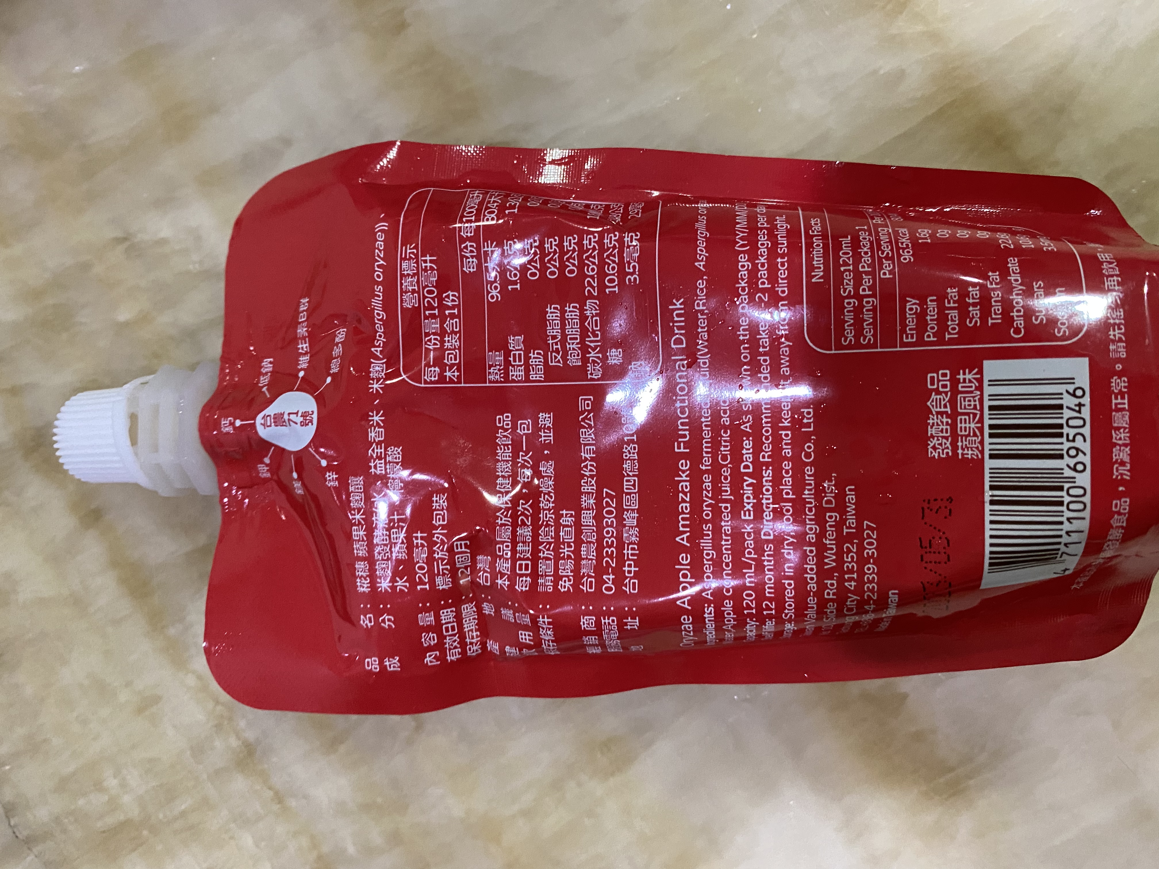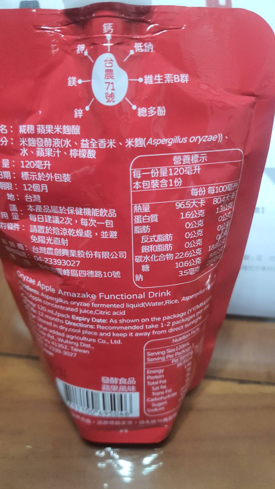 回列表 台灣農創 糀穗-百香果/蘋果米麴釀 自然發酵甘甜味 營養滿分健康補給 市價120元 所需等級 一般會員以上 所需學分 50 體驗份數 15 關注人數 1316 申請人數 276 申請截止 品牌業者:台灣農創 負責廠商 台灣農創興業股份有限公司 廠商地址 台中市霧峰區四德路10號4樓 產地 台灣 試用產品規格 120公克/包 食品業者登錄字號 B-183600141-00000-2 投保產品責任險字號 已投保華南產物保險產品責任險 心得分享 商品介紹 商品成分 使用方法 注意事項 體驗名單 7.7 台灣農創 糀穗-百香果/蘋果米麴釀(隨機出貨) 包裝美學 7.8 風味香氣 7.2 甜度適中 8.2 使用便利 8.7 建議推薦 7.4 心得分享 13則 張智慧 銀食達人 65歲 新北市 2022/09/30 對台灣農創 糀穗-百香果/蘋果米麴釀(隨機出貨)留下評價 10 有吃過台農71號益全香米,喜歡帶有芋香、軟Q口感的米粒。第一次飲用米麴釀,以為會有醋或酒的味道,實際喝起來像糯米酒釀,是微甜、略稠的蘋果口味,天然發酵的益全香米,感覺很滋補,如果不是建議飲用量的標示,會覺得120毫升喝起來不過癮。 Yu Juan Zhang 金食達人 37歲 基隆市 2022/10/01 對台灣農創 糀穗-百香果/蘋果米麴釀(隨機出貨)留下評價 7 打開後能聞到一股淡淡的發酵味,應該就是米麴的味道。以機能飲品來說很方便飲用,只要打開就能補充營養素。包裝是紅色的,很符合蘋果口味的主題。喝下去最明顯的是酸味,但不會很酸,是好入口而且可以接受的酸度,整體甜度不高,但蘋果味也不明顯。喝入口也能品嚐到些微的米麴味,如果是當飲料喝不算是好喝的口味,但以機能飲品來說是可以接受的口味。 黃毓玲 金食達人 56歲 臺中市 2022/10/01 對台灣農創 糀穗-百香果/蘋果米麴釀(隨機出貨)留下評價 7 這次收到的是蘋果米麴釀!由臺農71號益全香米含有鈣,鈉,鉀,鎂,鋅製造而成大米麴菌釀加入蘋果原汁與檸檬酸而成的保健飲品。加入適量的冰塊與開水,在初秋嚴熱的午後時刻,冰冰涼涼的蘋果汁香味入喉甘醇濃郁,瞬間人清爽許多涼意!一口接著一口往胃裡的大海流入,精神變得飽滿,舒服了起伏。 angel 鑽石達人 55歲 嘉義市 2022/10/01 對台灣農創 糀穗-百香果/蘋果米麴釀(隨機出貨)留下評價 9 感謝食力提供這款糀穗-百香果米麴釀的試飲~查了一下為何取名為「糀穗」?台灣農創表示因日本德川時代首先創造了漢字「糀」,代表是蒸好的米上綻放的米花,而這款產品是以霧峰在地豐收、高品質的有機益全香米加上米麴釀造,所製作出天然發酵的飲品,因此取名為「糀穗」。而米麴釀就是日本的甘酒,是一款源自日本奈良時期的傳統甜飲!雖然有「酒」字但其實完全沒有酒精喔~小孩孕婦皆適宜。唯一美中不足的是小小一包單價還算有點高但營養成分還是很夠的,並沒有添加其他醣類,營養素包含鈣、鉀、鎂、維生素B群、總多酚等多種豐富微量營養素,快速補充能量,健康滿滿! 夏鳳寶 鑽石達人 62歲 臺南市 2022/10/02 對台灣農創 糀穗-百香果/蘋果米麴釀(隨機出貨)留下評價 9 這次的試吃品我收到的是蘋果口味,它是用米麴自然發酵,再加入蘋果汁,味道聞起來有淡淡的蘋果香,喝起來甜甜的很順口,本來想會不會有酸酸的發酵味,真的一點都沒有,一下子就喝完了,有些意猶未盡!多喝些酵素米麴可以增加排洩的順暢,對腸胃道的健康很有幫助,這款產品加入了果汁,讓我們更能接受也更想食用!值得推薦! 黃思寰 鑽石達人 49歲 屏東縣 2022/10/03 對台灣農創 糀穗-百香果/蘋果米麴釀(隨機出貨)留下評價 6 謝謝網上提供的試用我覺得喝起來像是「無酒精版」的小米酒加上酸酸甜甜的可爾必思味講實在話,我喝不習慣耶,哈哈~因為喝可爾必思怎麼會跑出小米酒味呢喝小米酒怎麼會跑出可爾必思味呢覺得兩者混在一起會覺得怪怪的 趙思婷 金食達人 30歲 新北市 2022/10/03 對台灣農創 糀穗-百香果/蘋果米麴釀(隨機出貨)留下評價 7 味道滿特別的,比較不是一般大眾能接受的口味,或許是平常沒有嘗試這種類型的飲料,但家裡的長輩跟小朋友都比較喝不習慣😅包裝的部分方便飲用,帶出去在外引用也很方便,份量不多喝完也不會太有負擔包裝滿可愛的,但就是家人對味道的接受度較低 許耘彰 鑽石達人 44歲 彰化縣 2022/10/04 對台灣農創 糀穗-百香果/蘋果米麴釀(隨機出貨)留下評價 7 前幾日收到包裹,打開後裡面只有一包、一包120cc,一包販售價格120元,標示也沒寫什麼特殊功能,只看到一小段文字寫一天2次一次一包,是有寫保健機能飲品,不過還是不太懂有什麼功效。包裝底部是透明的,可以直接看到飲料的顏色,打開後倒在杯子顏色就如同蘋果汁,聞起來有淡淡蘋果汁和一些些發酵的味道,飲用起來就像粉粉的蘋果汁,說不上好喝也不難喝,若是沒喝過的人可以嘗試看看。 周添町 鑽石達人 76歲 彰化縣 2022/10/04 對台灣農創 糀穗-百香果/蘋果米麴釀(隨機出貨)留下評價 7 前幾日收到包裹,卻一直忘記試喝,放在旁邊一直到今天才想起來,感覺試喝拍照。包裝跟最近市面上常見的醋飲品一樣,可以壓很扁喝完的垃圾很少,底部可以直接看到飲料的顏色,跟蘋果汁很像,不過有點像另外又混合白色粉末的那種濁濁的感覺,打開飲用就直接是蘋果汁味道,於是喝一半剩的放冰箱,看看味道是否會不一樣,冰過再飲用味道也是蘋果汁味道不過有種粉粉的感覺,整體味道還可以。 Lai Cher 鑽石達人 41歲 高雄市 2022/10/05 對台灣農創 糀穗-百香果/蘋