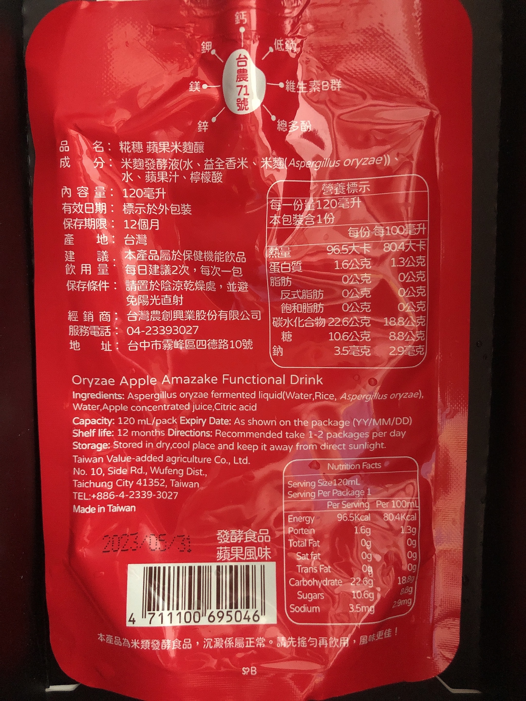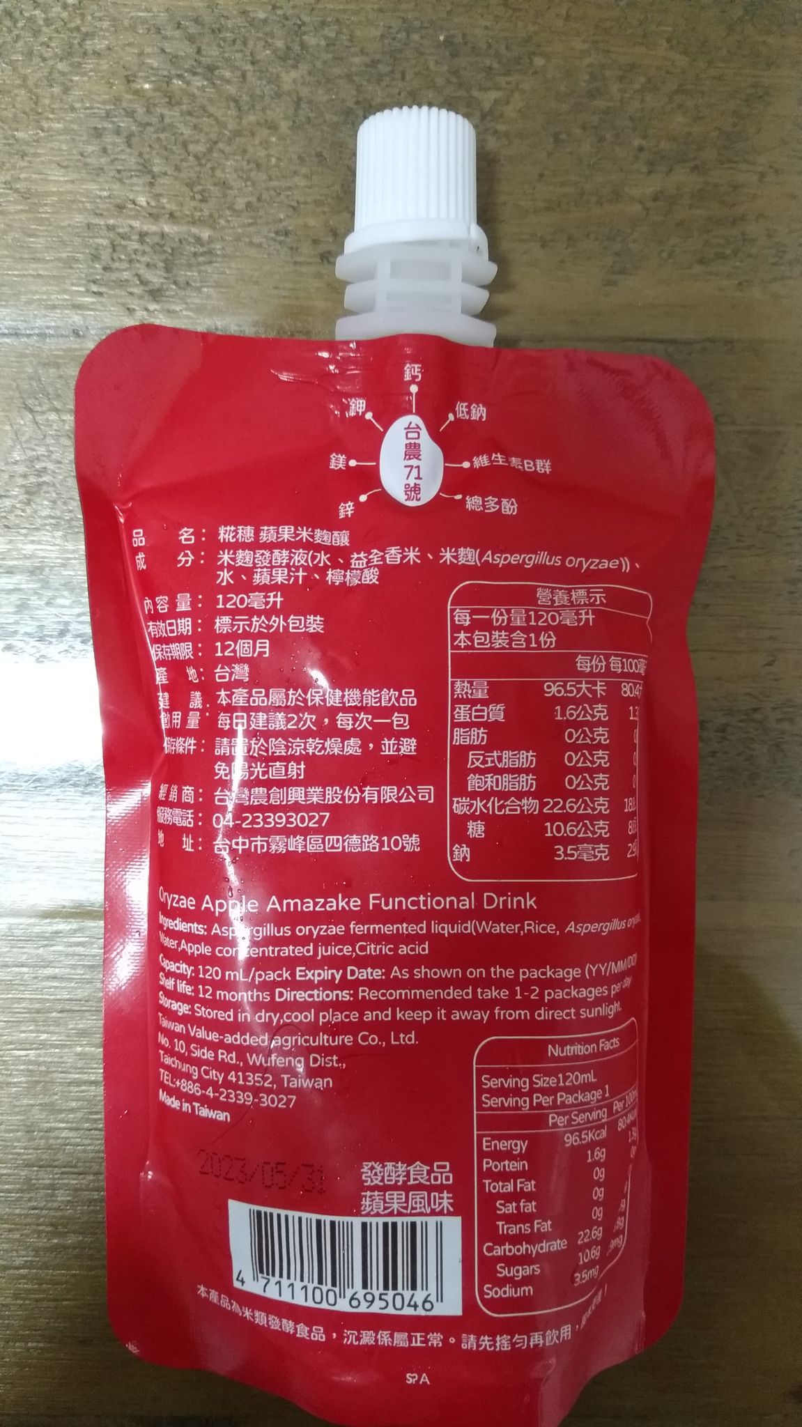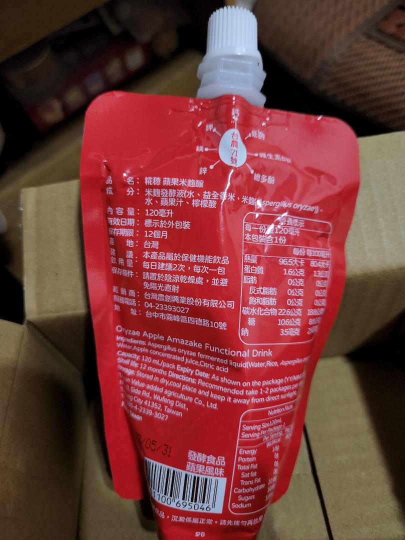 回列表 台灣農創 糀穗-百香果/蘋果米麴釀 自然發酵甘甜味 營養滿分健康補給 市價120元 所需等級 一般會員以上 所需學分 50 體驗份數 15 關注人數 1316 申請人數 276 申請截止 品牌業者:台灣農創 負責廠商 台灣農創興業股份有限公司 廠商地址 台中市霧峰區四德路10號4樓 產地 台灣 試用產品規格 120公克/包 食品業者登錄字號 B-183600141-00000-2 投保產品責任險字號 已投保華南產物保險產品責任險 心得分享 商品介紹 商品成分 使用方法 注意事項 體驗名單 7.7 台灣農創 糀穗-百香果/蘋果米麴釀(隨機出貨) 包裝美學 7.8 風味香氣 7.2 甜度適中 8.2 使用便利 8.7 建議推薦 7.4 心得分享 13則 張智慧 銀食達人 65歲 新北市 2022/09/30 對台灣農創 糀穗-百香果/蘋果米麴釀(隨機出貨)留下評價 10 有吃過台農71號益全香米,喜歡帶有芋香、軟Q口感的米粒。第一次飲用米麴釀,以為會有醋或酒的味道,實際喝起來像糯米酒釀,是微甜、略稠的蘋果口味,天然發酵的益全香米,感覺很滋補,如果不是建議飲用量的標示,會覺得120毫升喝起來不過癮。 Yu Juan Zhang 金食達人 37歲 基隆市 2022/10/01 對台灣農創 糀穗-百香果/蘋果米麴釀(隨機出貨)留下評價 7 打開後能聞到一股淡淡的發酵味,應該就是米麴的味道。以機能飲品來說很方便飲用,只要打開就能補充營養素。包裝是紅色的,很符合蘋果口味的主題。喝下去最明顯的是酸味,但不會很酸,是好入口而且可以接受的酸度,整體甜度不高,但蘋果味也不明顯。喝入口也能品嚐到些微的米麴味,如果是當飲料喝不算是好喝的口味,但以機能飲品來說是可以接受的口味。 黃毓玲 金食達人 56歲 臺中市 2022/10/01 對台灣農創 糀穗-百香果/蘋果米麴釀(隨機出貨)留下評價 7 這次收到的是蘋果米麴釀!由臺農71號益全香米含有鈣,鈉,鉀,鎂,鋅製造而成大米麴菌釀加入蘋果原汁與檸檬酸而成的保健飲品。加入適量的冰塊與開水,在初秋嚴熱的午後時刻,冰冰涼涼的蘋果汁香味入喉甘醇濃郁,瞬間人清爽許多涼意!一口接著一口往胃裡的大海流入,精神變得飽滿,舒服了起伏。 angel 鑽石達人 55歲 嘉義市 2022/10/01 對台灣農創 糀穗-百香果/蘋果米麴釀(隨機出貨)留下評價 9 感謝食力提供這款糀穗-百香果米麴釀的試飲~查了一下為何取名為「糀穗」?台灣農創表示因日本德川時代首先創造了漢字「糀」,代表是蒸好的米上綻放的米花,而這款產品是以霧峰在地豐收、高品質的有機益全香米加上米麴釀造,所製作出天然發酵的飲品,因此取名為「糀穗」。而米麴釀就是日本的甘酒,是一款源自日本奈良時期的傳統甜飲!雖然有「酒」字但其實完全沒有酒精喔~小孩孕婦皆適宜。唯一美中不足的是小小一包單價還算有點高但營養成分還是很夠的,並沒有添加其他醣類,營養素包含鈣、鉀、鎂、維生素B群、總多酚等多種豐富微量營養素,快速補充能量,健康滿滿! 夏鳳寶 鑽石達人 62歲 臺南市 2022/10/02 對台灣農創 糀穗-百香果/蘋果米麴釀(隨機出貨)留下評價 9 這次的試吃品我收到的是蘋果口味,它是用米麴自然發酵,再加入蘋果汁,味道聞起來有淡淡的蘋果香,喝起來甜甜的很順口,本來想會不會有酸酸的發酵味,真的一點都沒有,一下子就喝完了,有些意猶未盡!多喝些酵素米麴可以增加排洩的順暢,對腸胃道的健康很有幫助,這款產品加入了果汁,讓我們更能接受也更想食用!值得推薦! 黃思寰 鑽石達人 49歲 屏東縣 2022/10/03 對台灣農創 糀穗-百香果/蘋果米麴釀(隨機出貨)留下評價 6 謝謝網上提供的試用我覺得喝起來像是「無酒精版」的小米酒加上酸酸甜甜的可爾必思味講實在話,我喝不習慣耶,哈哈~因為喝可爾必思怎麼會跑出小米酒味呢喝小米酒怎麼會跑出可爾必思味呢覺得兩者混在一起會覺得怪怪的 趙思婷 金食達人 30歲 新北市 2022/10/03 對台灣農創 糀穗-百香果/蘋果米麴釀(隨機出貨)留下評價 7 味道滿特別的,比較不是一般大眾能接受的口味,或許是平常沒有嘗試這種類型的飲料,但家裡的長輩跟小朋友都比較喝不習慣😅包裝的部分方便飲用,帶出去在外引用也很方便,份量不多喝完也不會太有負擔包裝滿可愛的,但就是家人對味道的接受度較低 許耘彰 鑽石達人 44歲 彰化縣 2022/10/04 對台灣農創 糀穗-百香果/蘋果米麴釀(隨機出貨)留下評價 7 前幾日收到包裹,打開後裡面只有一包、一包120cc,一包販售價格120元,標示也沒寫什麼特殊功能,只看到一小段文字寫一天2次一次一包,是有寫保健機能飲品,不過還是不太懂有什麼功效。包裝底部是透明的,可以直接看到飲料的顏色,打開後倒在杯子顏色就如同蘋果汁,聞起來有淡淡蘋果汁和一些些發酵的味道,飲用起來就像粉粉的蘋果汁,說不上好喝也不難喝,若是沒喝過的人可以嘗試看看。 周添町 鑽石達人 76歲 彰化縣 2022/10/04 對台灣農創 糀穗-百香果/蘋果米麴釀(隨機出貨)留下評價 7 前幾日收到包裹,卻一直忘記試喝,放在旁邊一直到今天才想起來,感覺試喝拍照。包裝跟最近市面上常見的醋飲品一樣,可以壓很扁喝完的垃圾很少,底部可以直接看到飲料的顏色,跟蘋果汁很像,不過有點像另外又混合白色粉末的那種濁濁的感覺,打開飲用就直接是蘋果汁味道,於是喝一半剩的放冰箱,看看味道是否會不一樣,冰過再飲用味道也是蘋果汁味道不過有種粉粉的感覺,整體味道還可以。 Lai Cher 鑽石達人 41歲 高雄市 2022/10/05 對台灣農創 糀穗-百香果/蘋