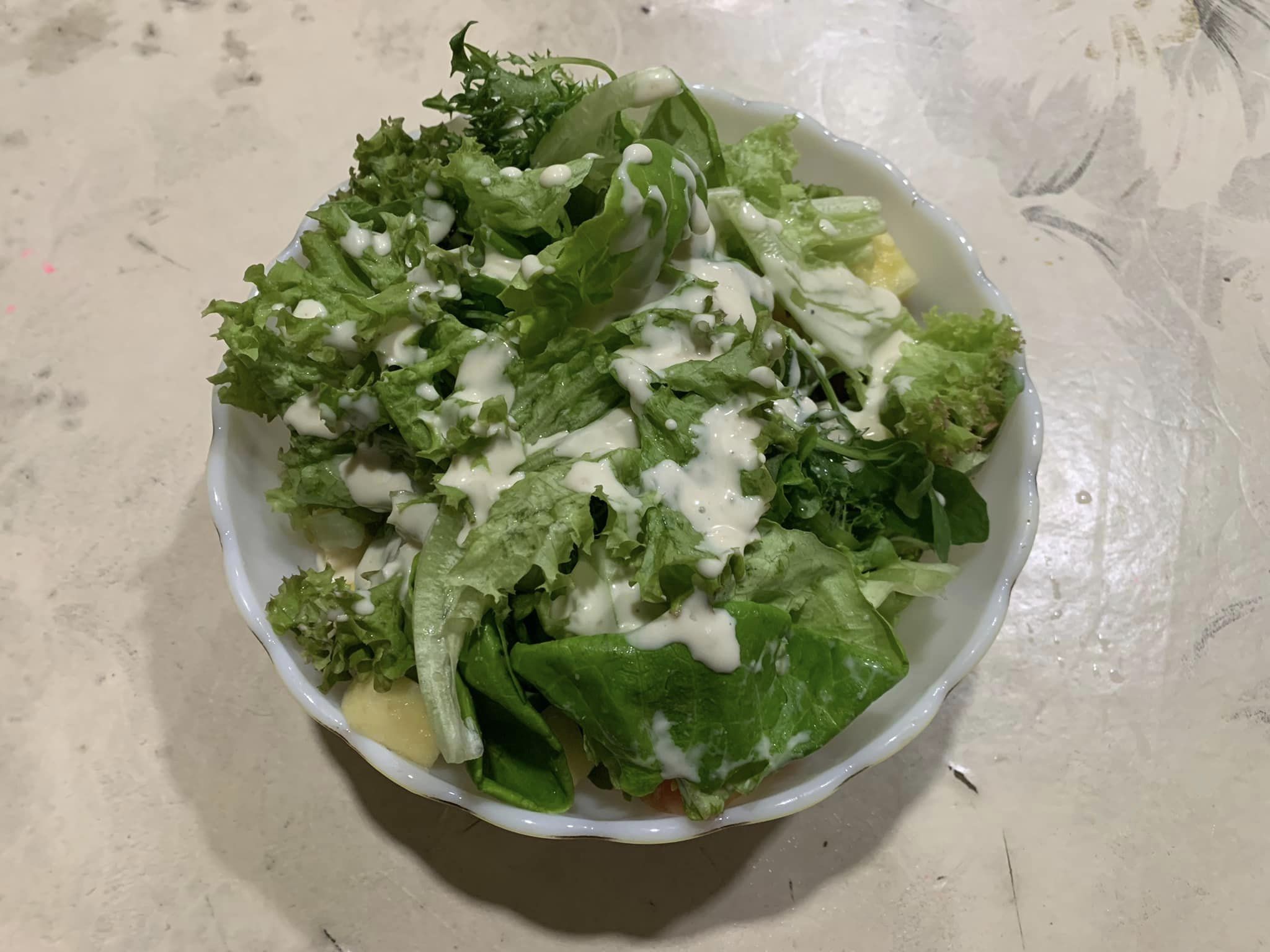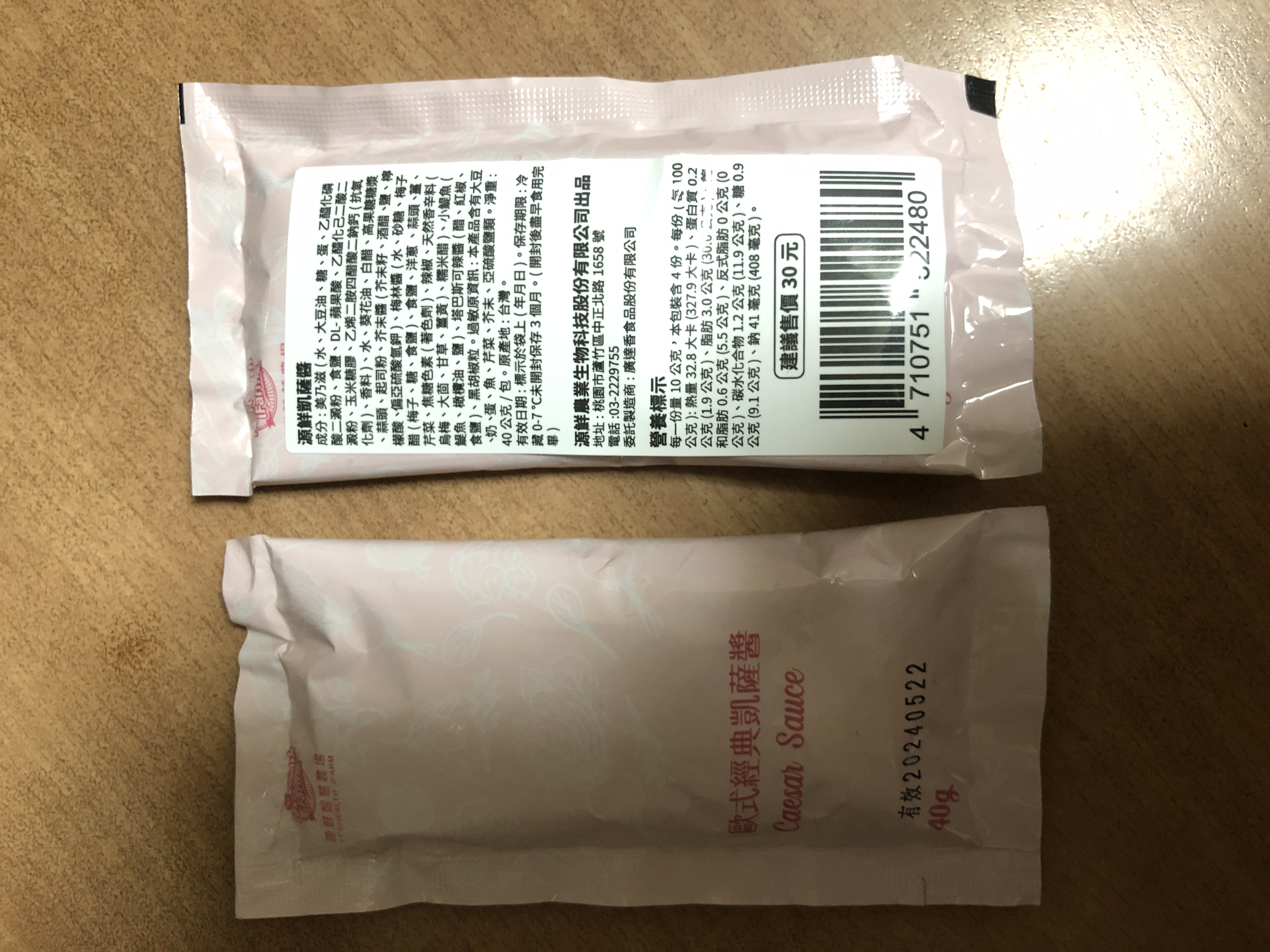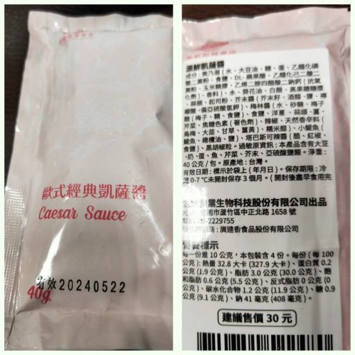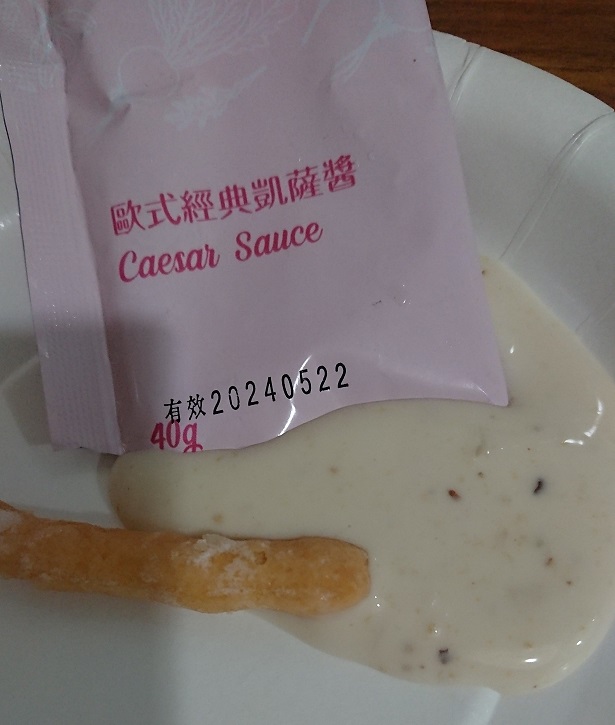 凱薩醬:美奶滋(水、大豆油、糖、蛋、乙醯化磷酸二澱粉、食鹽、 DL-蘋果酸、乙醯化己二酸二澱粉、玉米糖膠、乙烯二胺四醋酸二鈉鈣(抗氧化劑)、香料)、水、葵花油、白醋、高果糖糖漿、蒜頭、起司粉、芥末醬(芥末籽、酒醋、鹽、檸檬酸、偏亞硫酸氫鉀)、梅林醬(水、砂糖、梅子醋(梅子、糖、食鹽)、食鹽、洋蔥、蒜頭、薑、芹菜、焦糖色素(著色劑)、辣椒、天然香辛料(烏梅、大茴、甘草、薑黃)、糯米醋)、小鯷魚(鯷魚、橄欖油、鹽)、塔巴斯可辣醬(醋、紅椒、食鹽)、黑胡椒