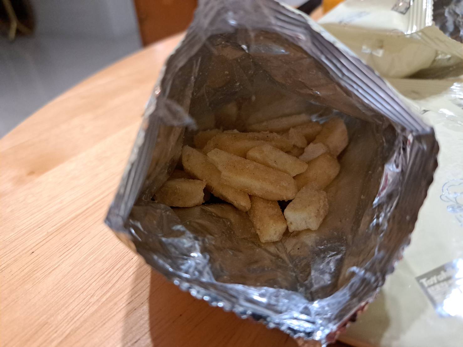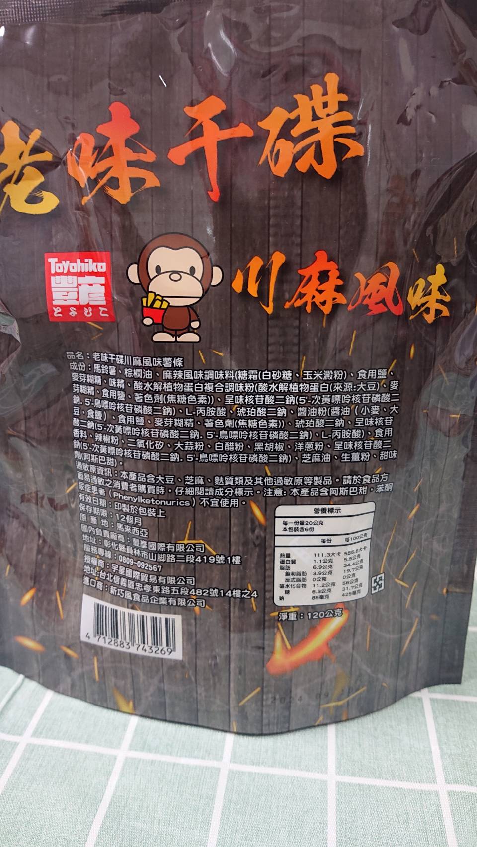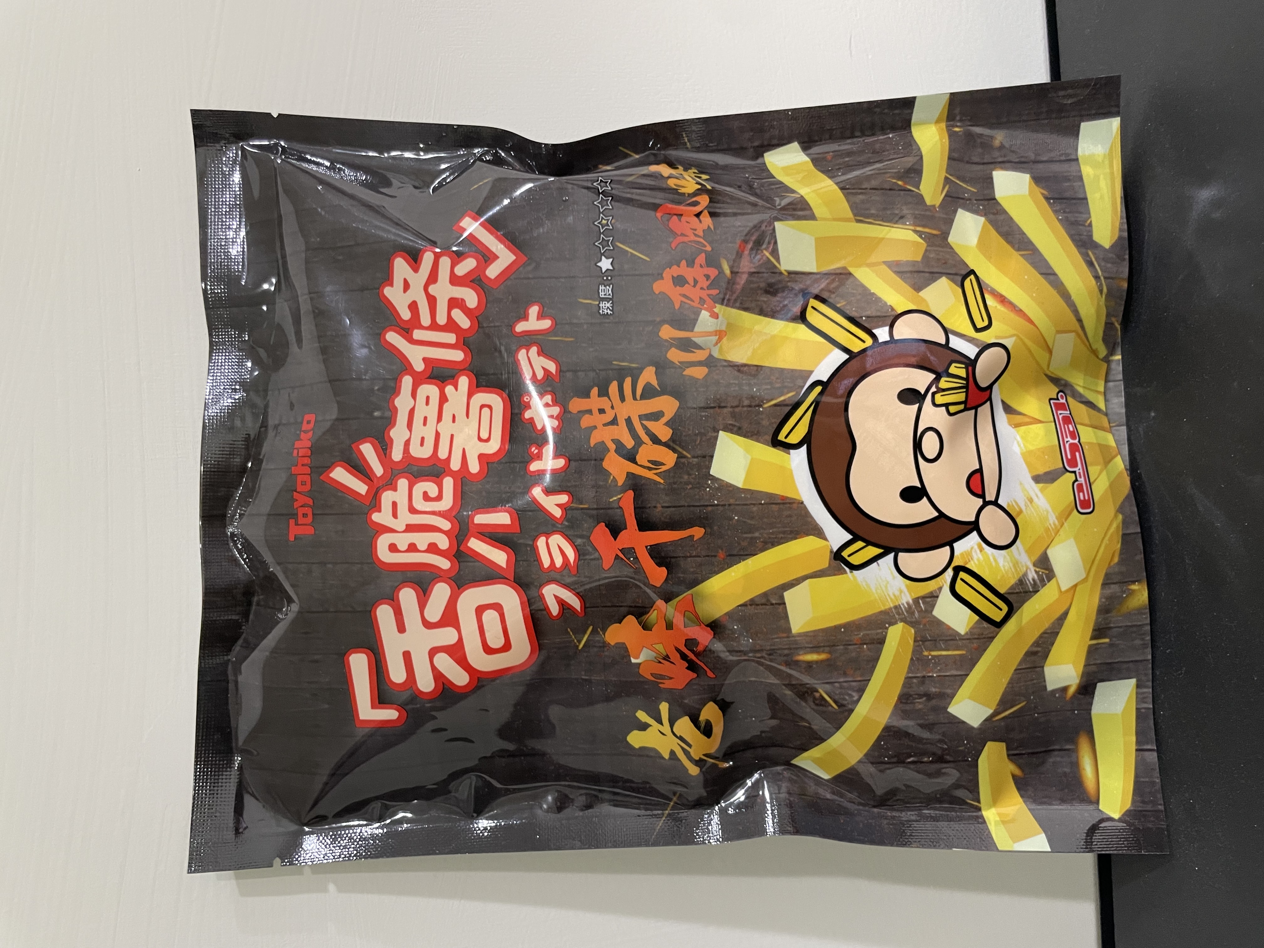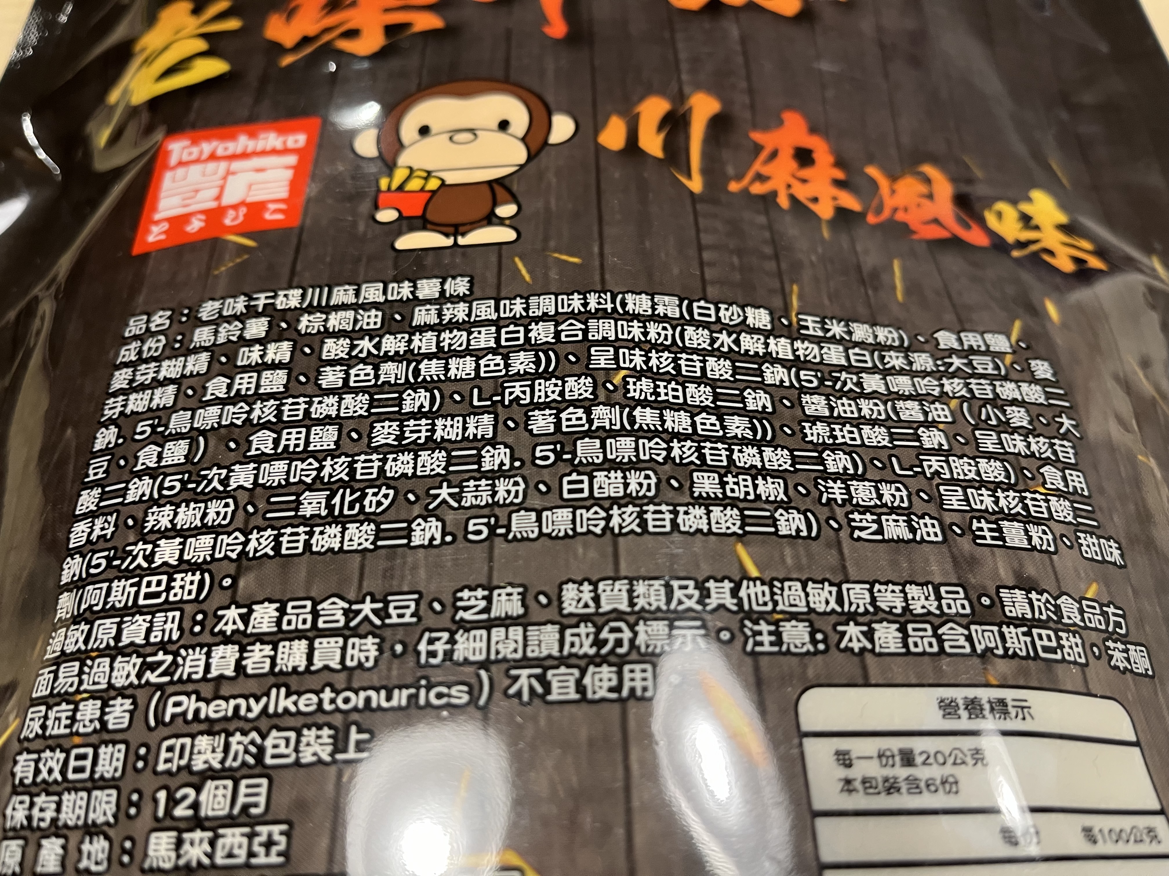 馬鈴薯、棕櫚油、麻辣風味調味料(糖霜(白砂糖、玉米澱粉)、食用鹽、麥芽糊精、味精、酸水解植物蛋白複合味粉(酸水解植物蛋白(來源大豆)麥芽糊精、食用鹽、著色劑(焦糖色素))、呈味核苷酸二鈉(5’-次黃嘌呤核苷磷酸二鈉、5’-鳥嘌呤核苷磷酸二鈉)、L-丙胺酸、琥珀酸二鈉、醬油粉(醬油(小麥、大豆、食鹽)、食用鹽、麥芽糊精、著色劑(焦糖色素)、呈味核苷酸二鈉(5’-次黃嘌呤核苷磷酸二鈉、5’-鳥嘌呤核苷磷酸二鈉)、L-丙胺酸、食用香料、辣椒粉、二氧化矽、大蒜粉、白醋粉、黑胡椒、洋蔥粉、呈味核苷酸二鈉(5’-次黃嘌呤核苷磷酸二鈉、5’-鳥嘌呤核苷磷酸二鈉)、芝麻油、生薑粉、甜味劑(阿斯巴甜)