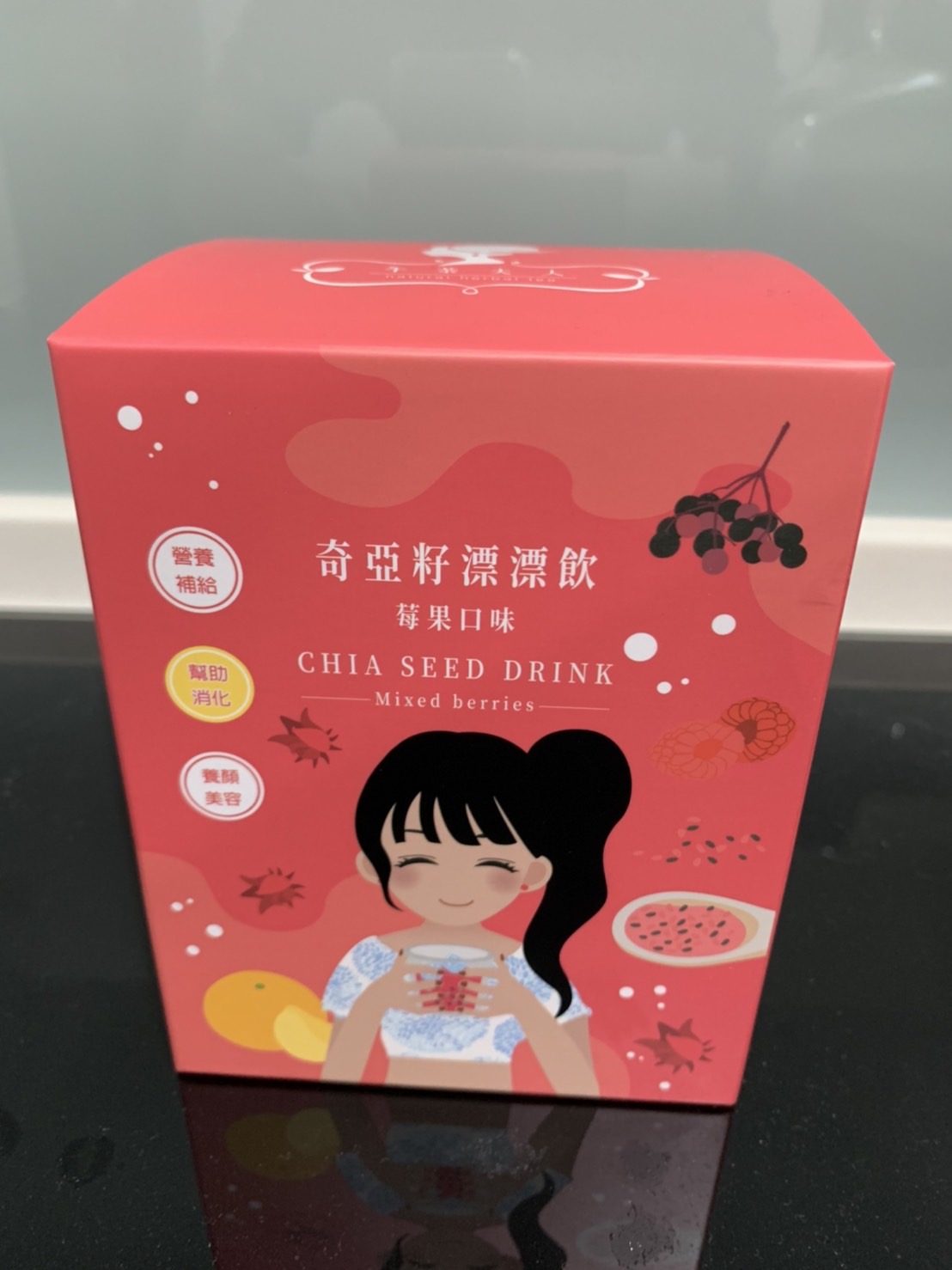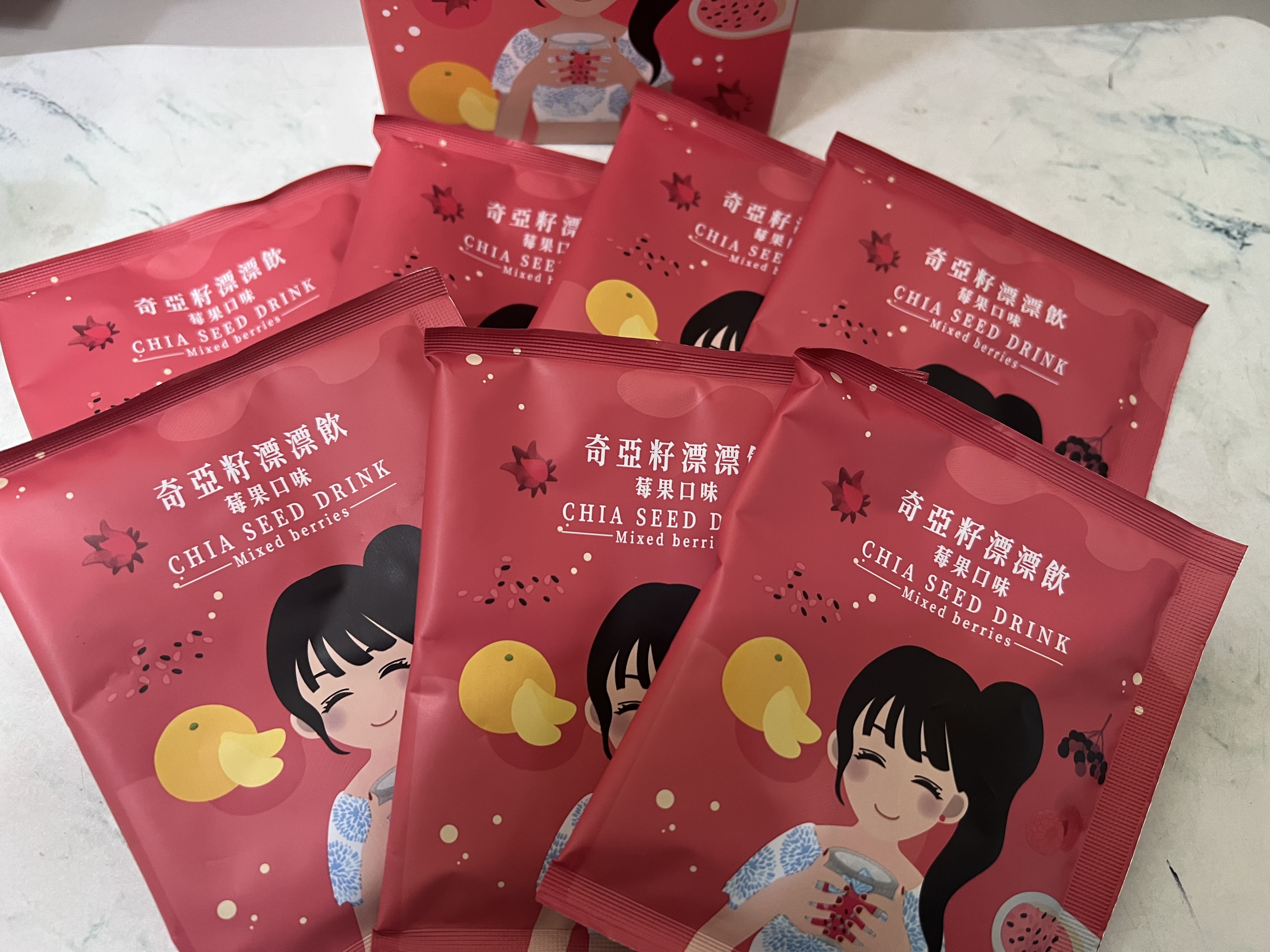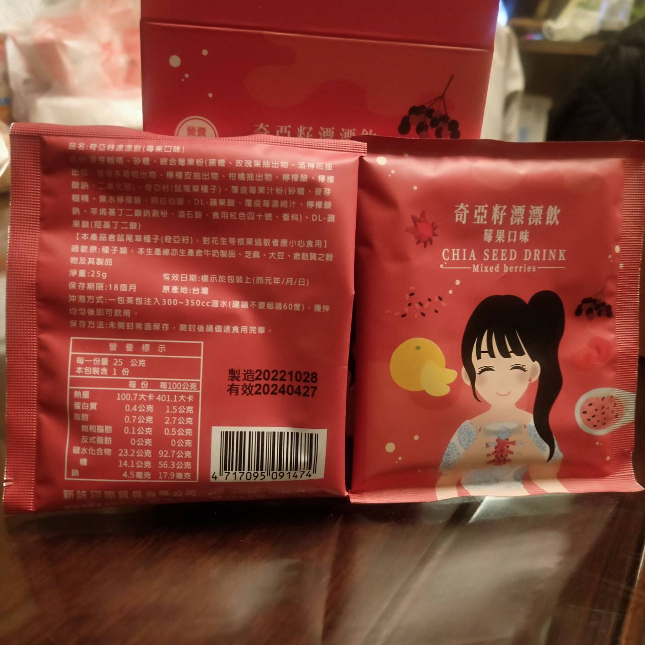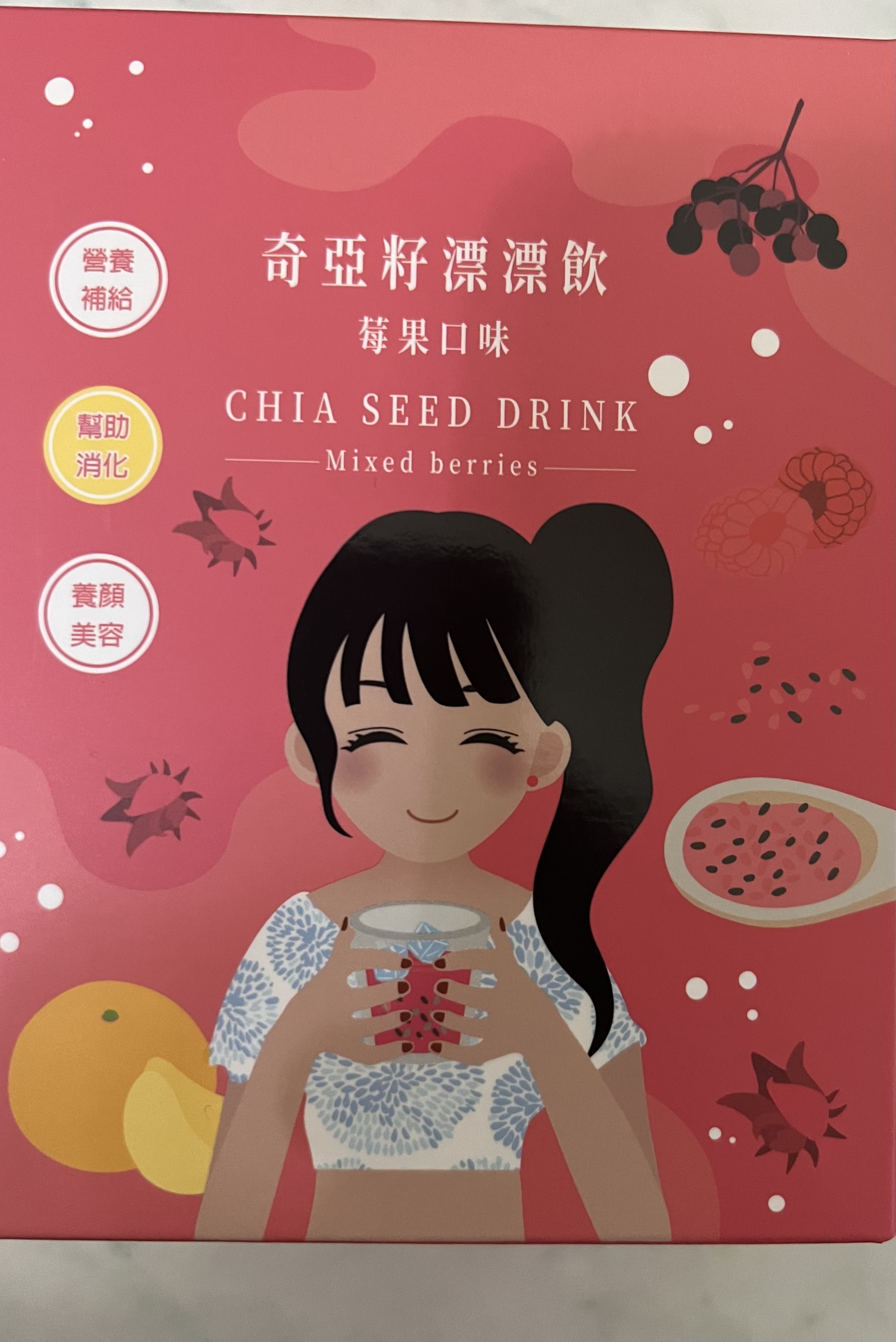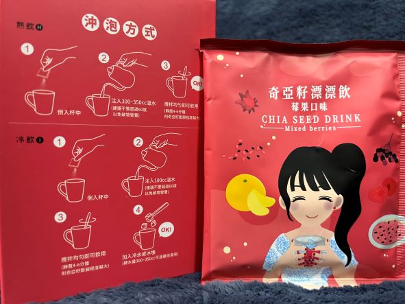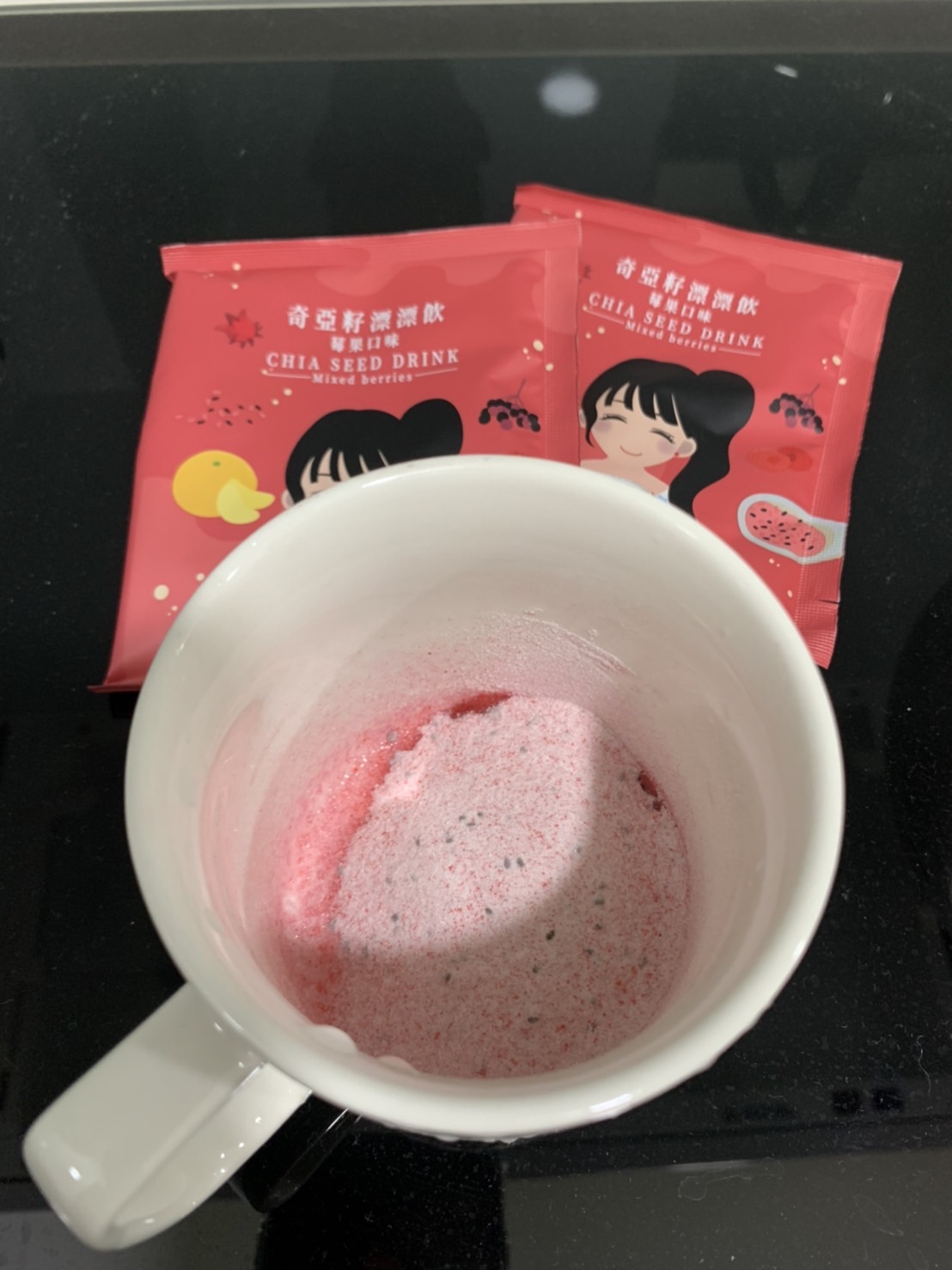 麥芽糊精、砂糖、綜合莓果粉(蔗糖、玫瑰果抽出物、洛神花抽出物、接骨木莓抽出物、檸檬皮抽出物、柑橘抽出物、檸檬酸、檸檬酸鈉、二氧化矽)、奇亞籽(鼠尾草種子)、覆盆莓果汁粉(砂糖、麥芽糊精、無水檸檬酸、阿拉伯膠、DL-蘋果酸、覆盆莓濃縮汁、檸檬酸鈉、辛烯基丁二酸鈉澱粉、酒石酸、食用紅色四十號、香料)、DL-蘋果酸(羥基丁二酸)
