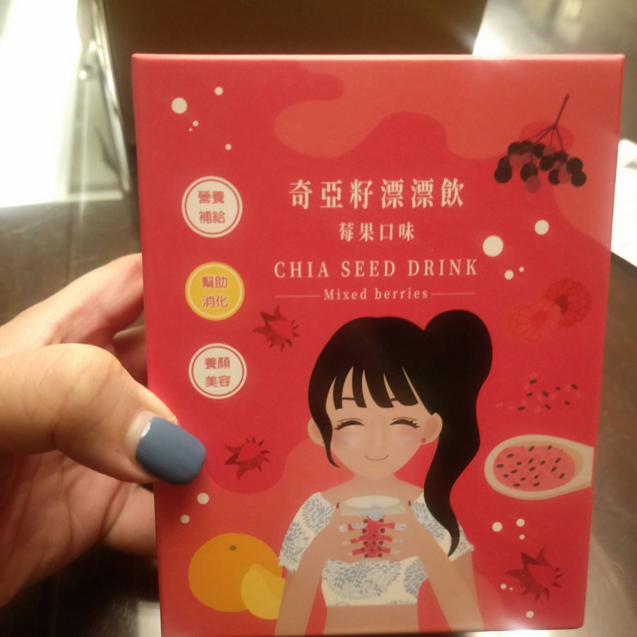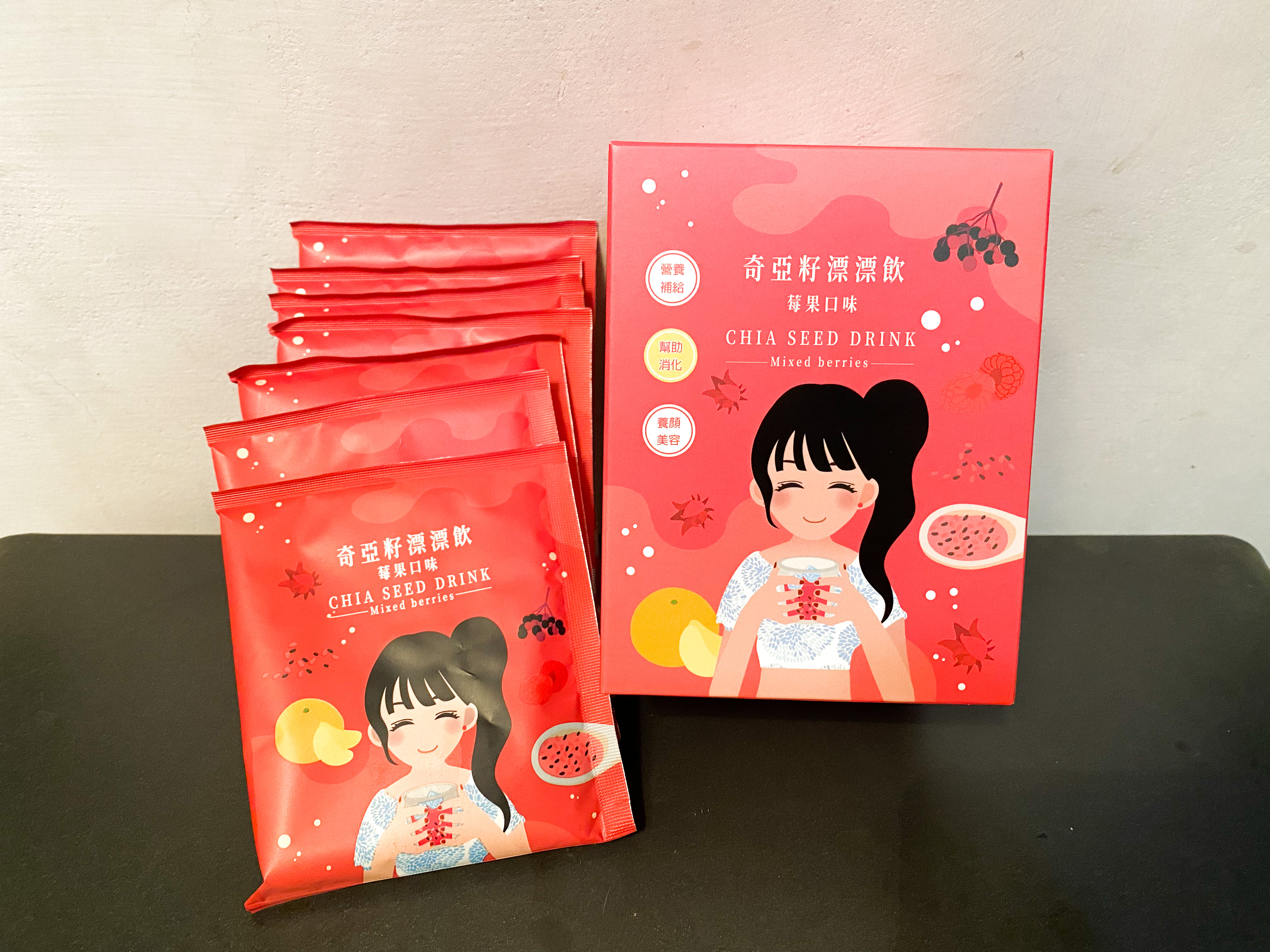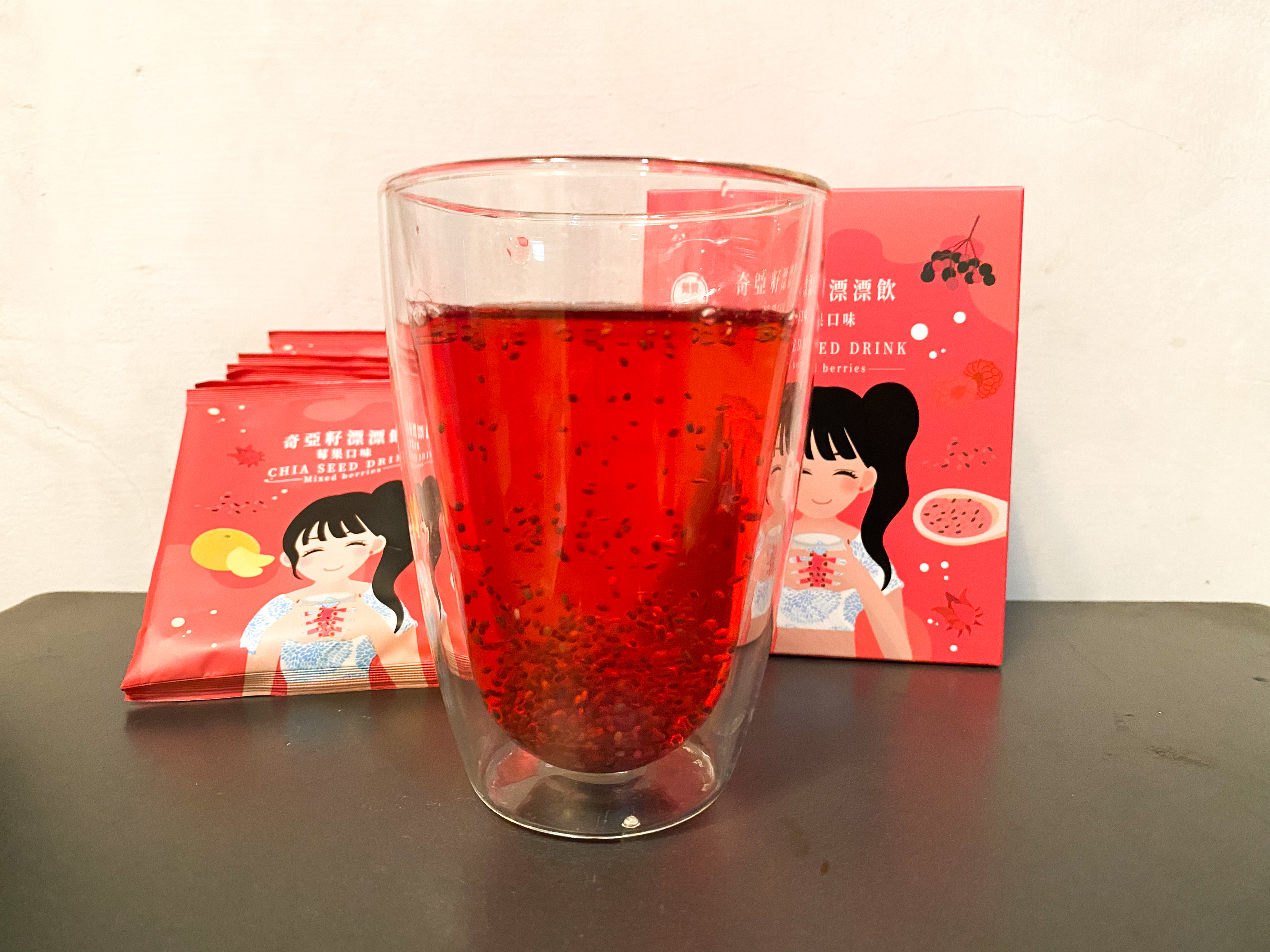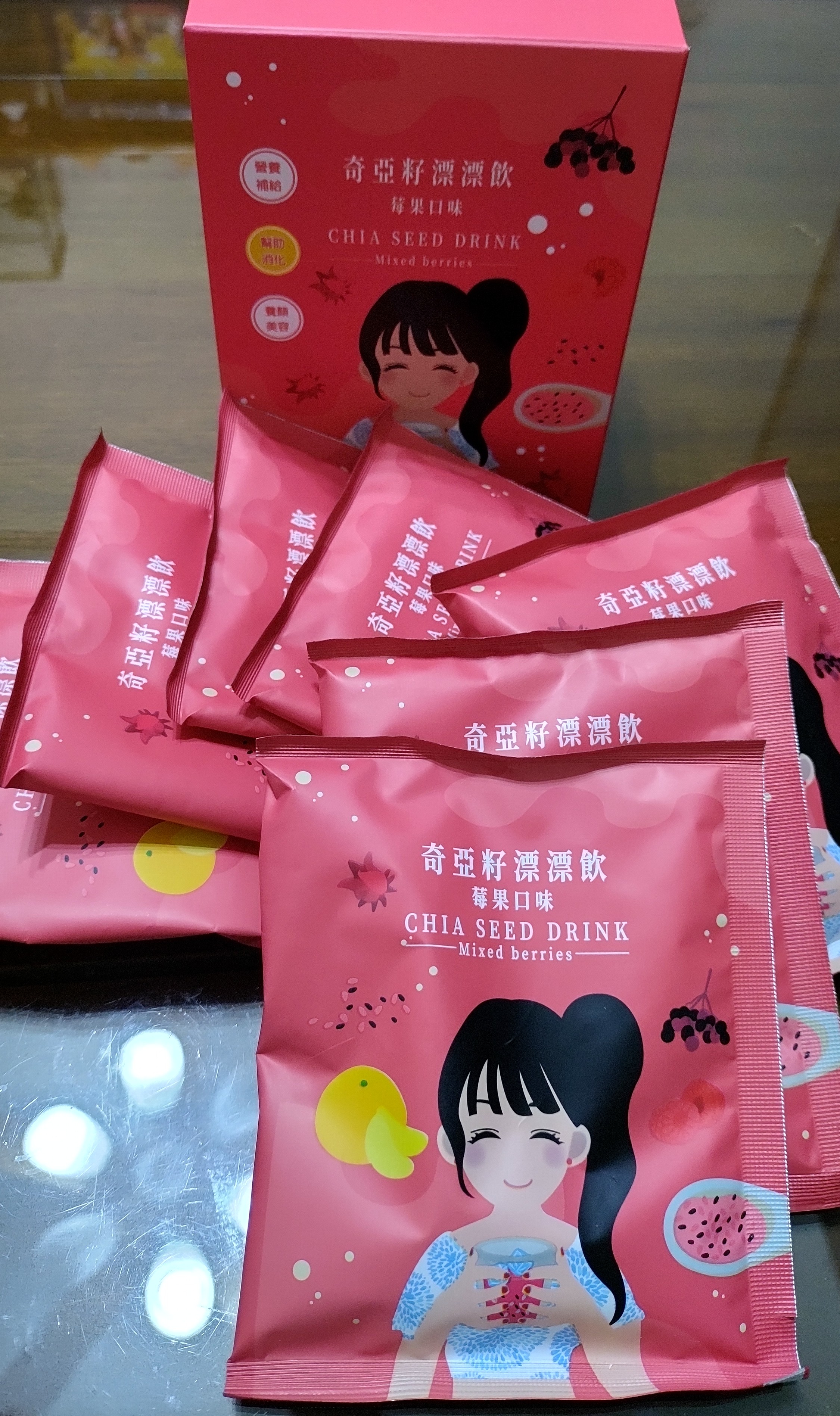 麥芽糊精、砂糖、綜合莓果粉(蔗糖、玫瑰果抽出物、洛神花抽出物、接骨木莓抽出物、檸檬皮抽出物、柑橘抽出物、檸檬酸、檸檬酸鈉、二氧化矽)、奇亞籽(鼠尾草種子)、覆盆莓果汁粉(砂糖、麥芽糊精、無水檸檬酸、阿拉伯膠、DL-蘋果酸、覆盆莓濃縮汁、檸檬酸鈉、辛烯基丁二酸鈉澱粉、酒石酸、食用紅色四十號、香料)、DL-蘋果酸(羥基丁二酸)
