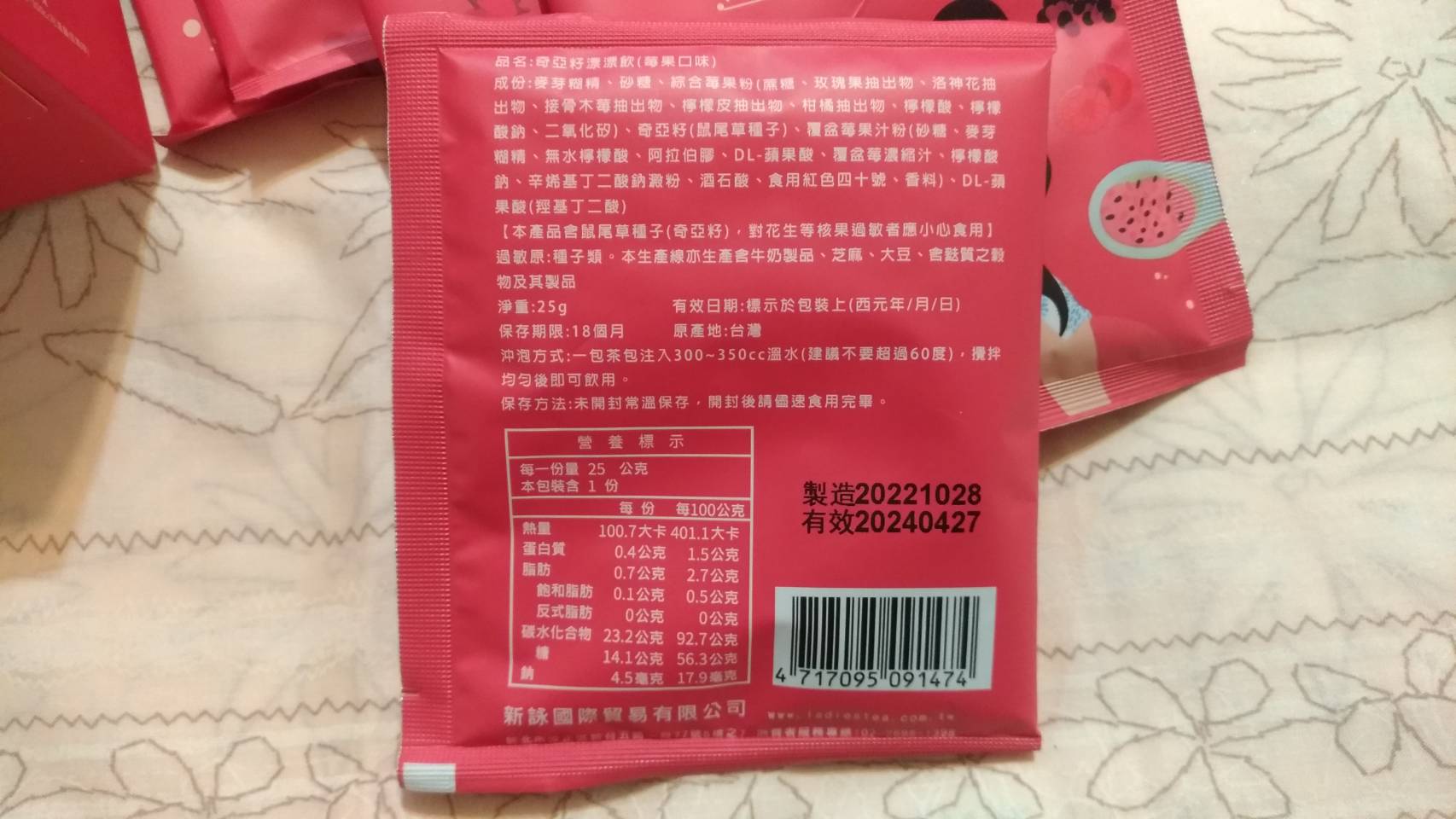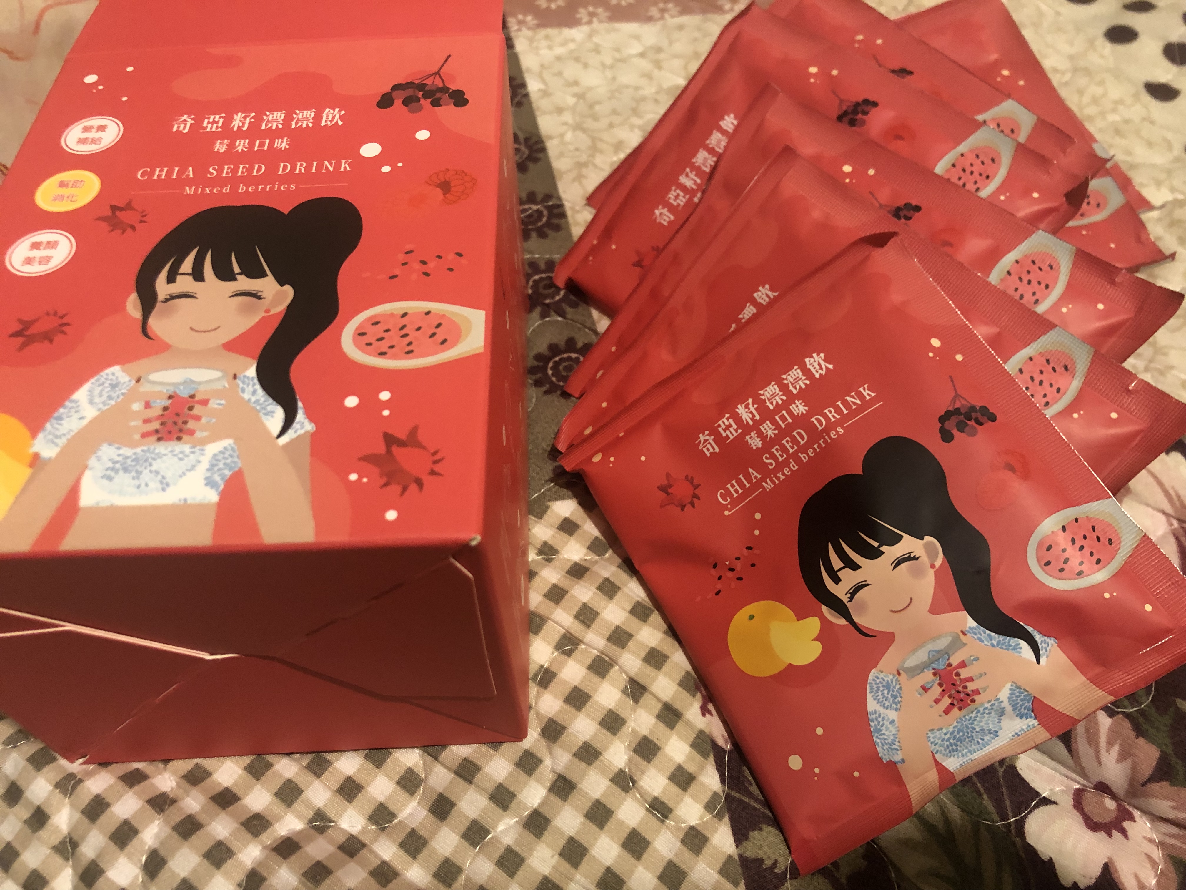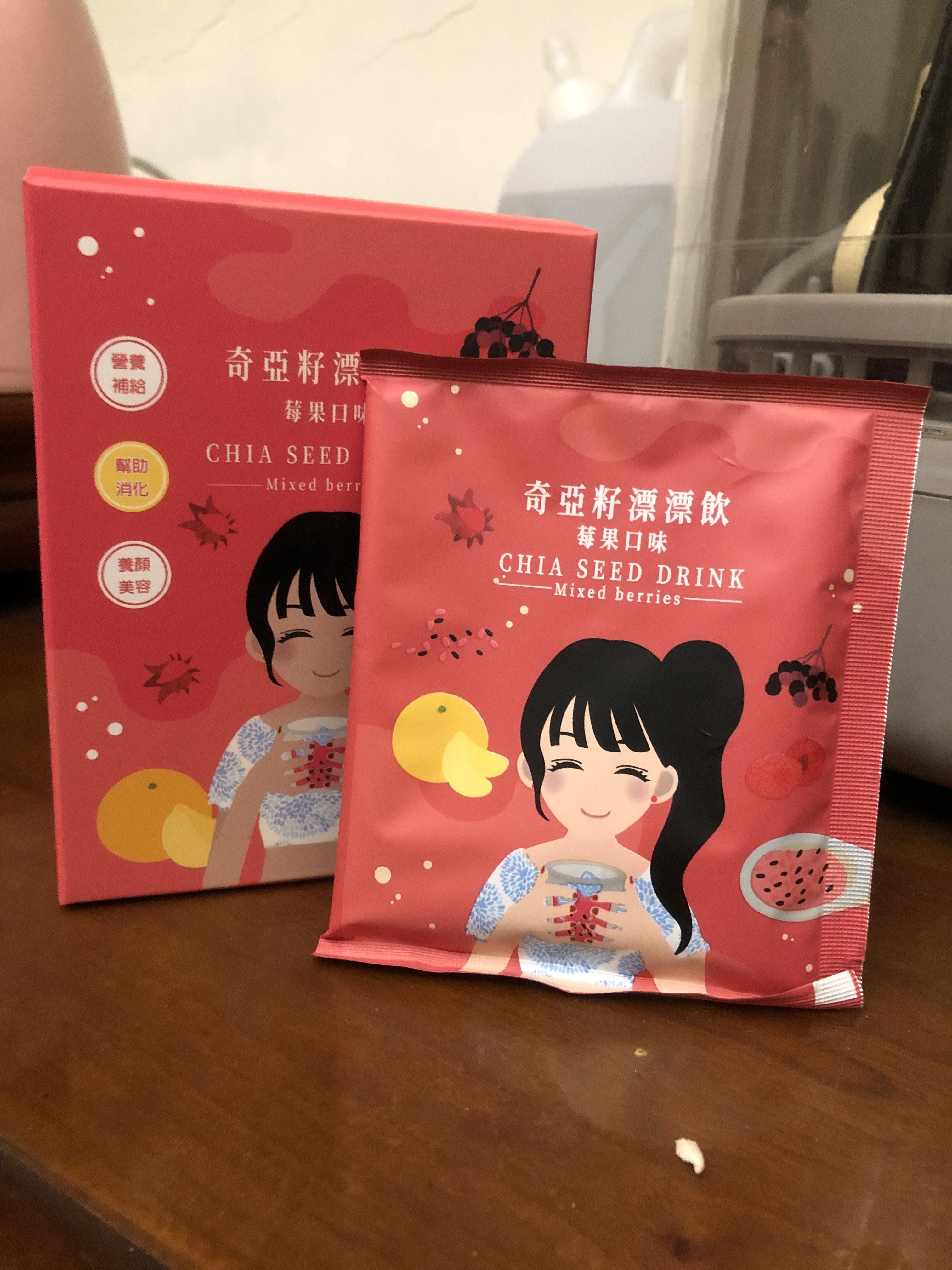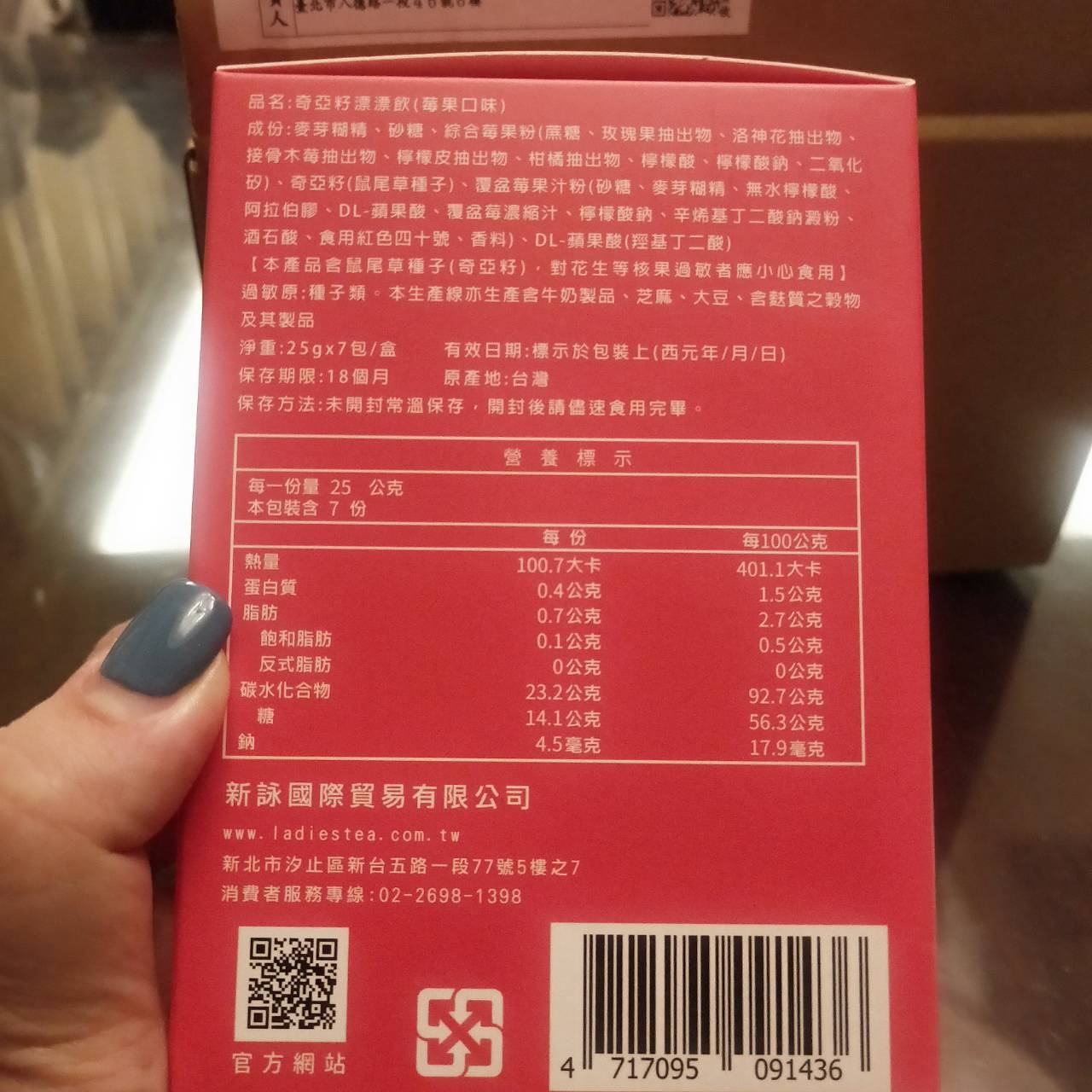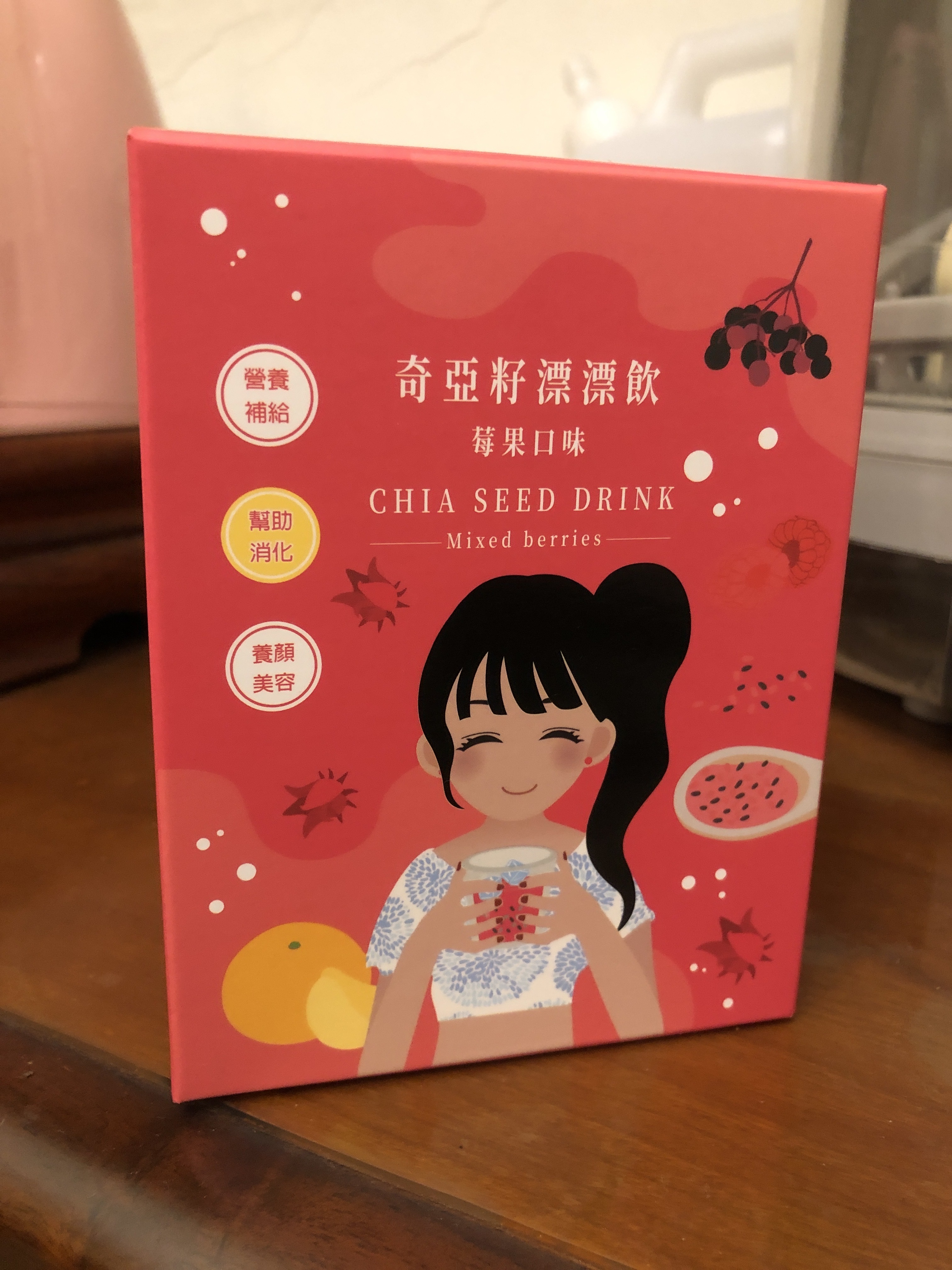 麥芽糊精、砂糖、綜合莓果粉(蔗糖、玫瑰果抽出物、洛神花抽出物、接骨木莓抽出物、檸檬皮抽出物、柑橘抽出物、檸檬酸、檸檬酸鈉、二氧化矽)、奇亞籽(鼠尾草種子)、覆盆莓果汁粉(砂糖、麥芽糊精、無水檸檬酸、阿拉伯膠、DL-蘋果酸、覆盆莓濃縮汁、檸檬酸鈉、辛烯基丁二酸鈉澱粉、酒石酸、食用紅色四十號、香料)、DL-蘋果酸(羥基丁二酸)
