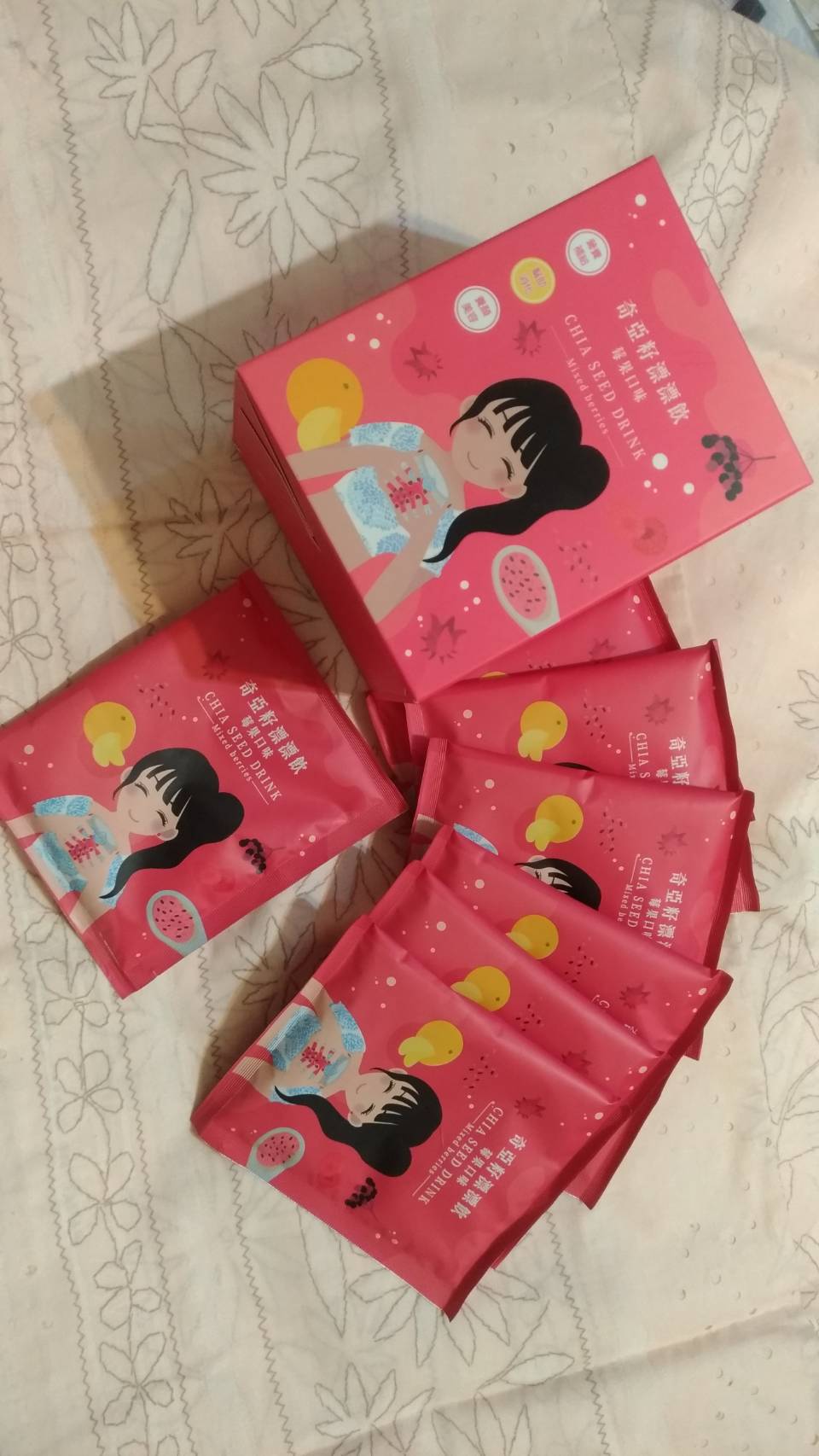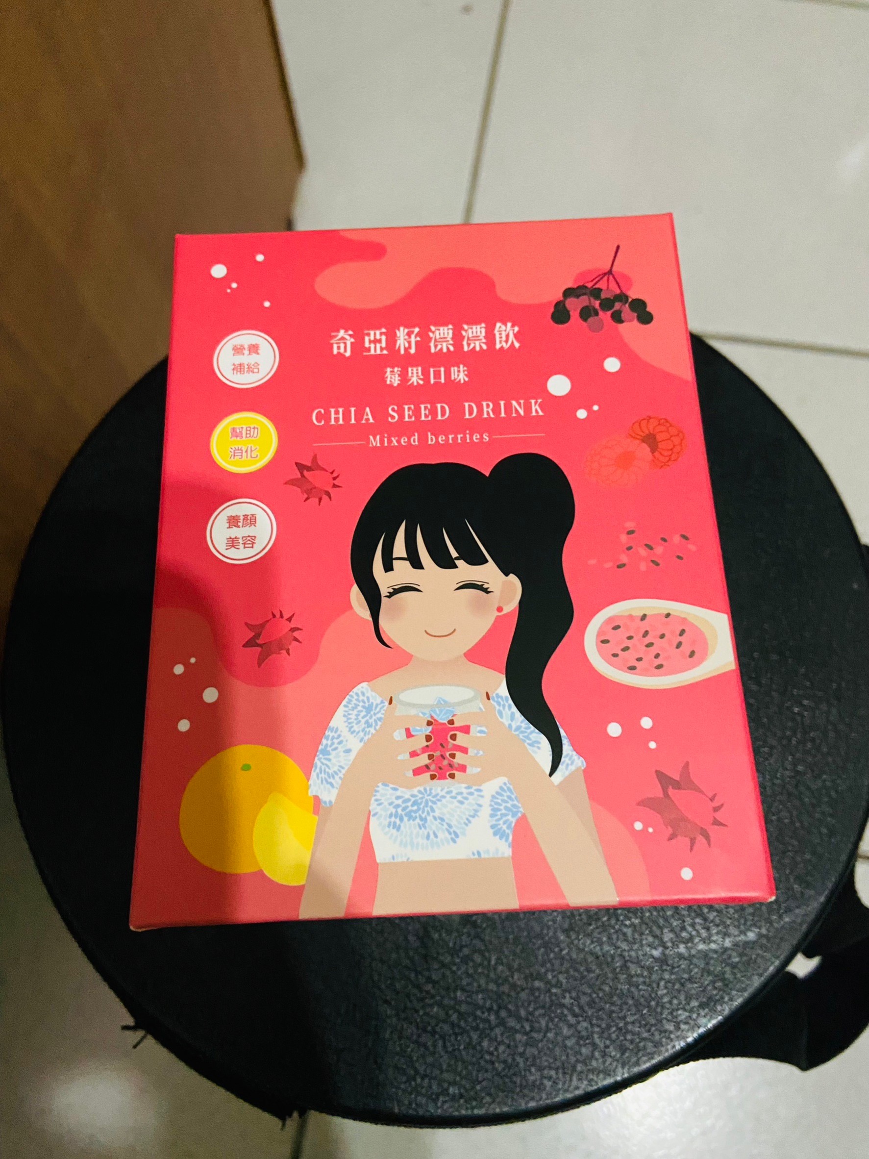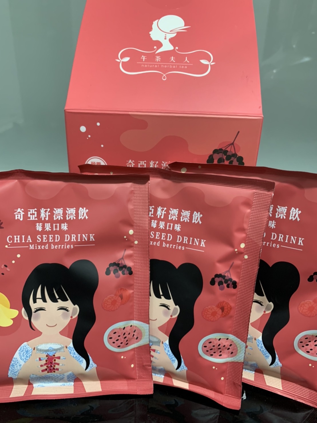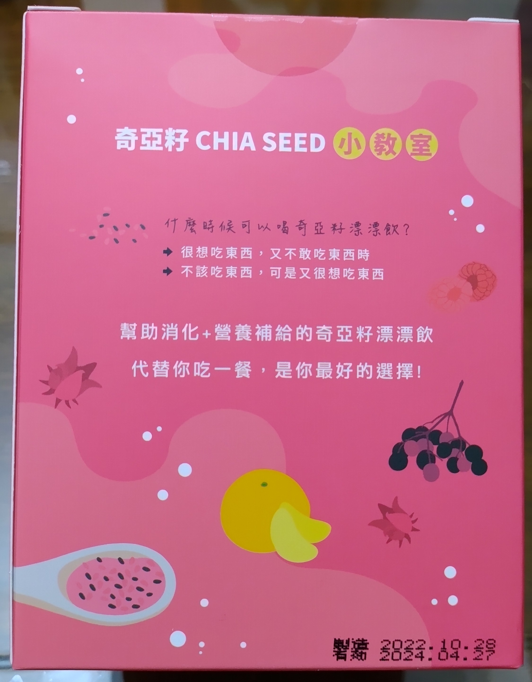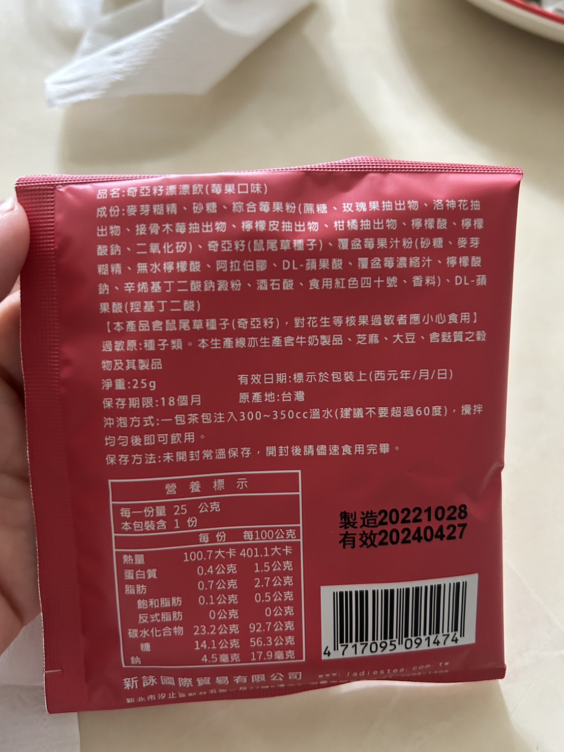 麥芽糊精、砂糖、綜合莓果粉(蔗糖、玫瑰果抽出物、洛神花抽出物、接骨木莓抽出物、檸檬皮抽出物、柑橘抽出物、檸檬酸、檸檬酸鈉、二氧化矽)、奇亞籽(鼠尾草種子)、覆盆莓果汁粉(砂糖、麥芽糊精、無水檸檬酸、阿拉伯膠、DL-蘋果酸、覆盆莓濃縮汁、檸檬酸鈉、辛烯基丁二酸鈉澱粉、酒石酸、食用紅色四十號、香料)、DL-蘋果酸(羥基丁二酸)