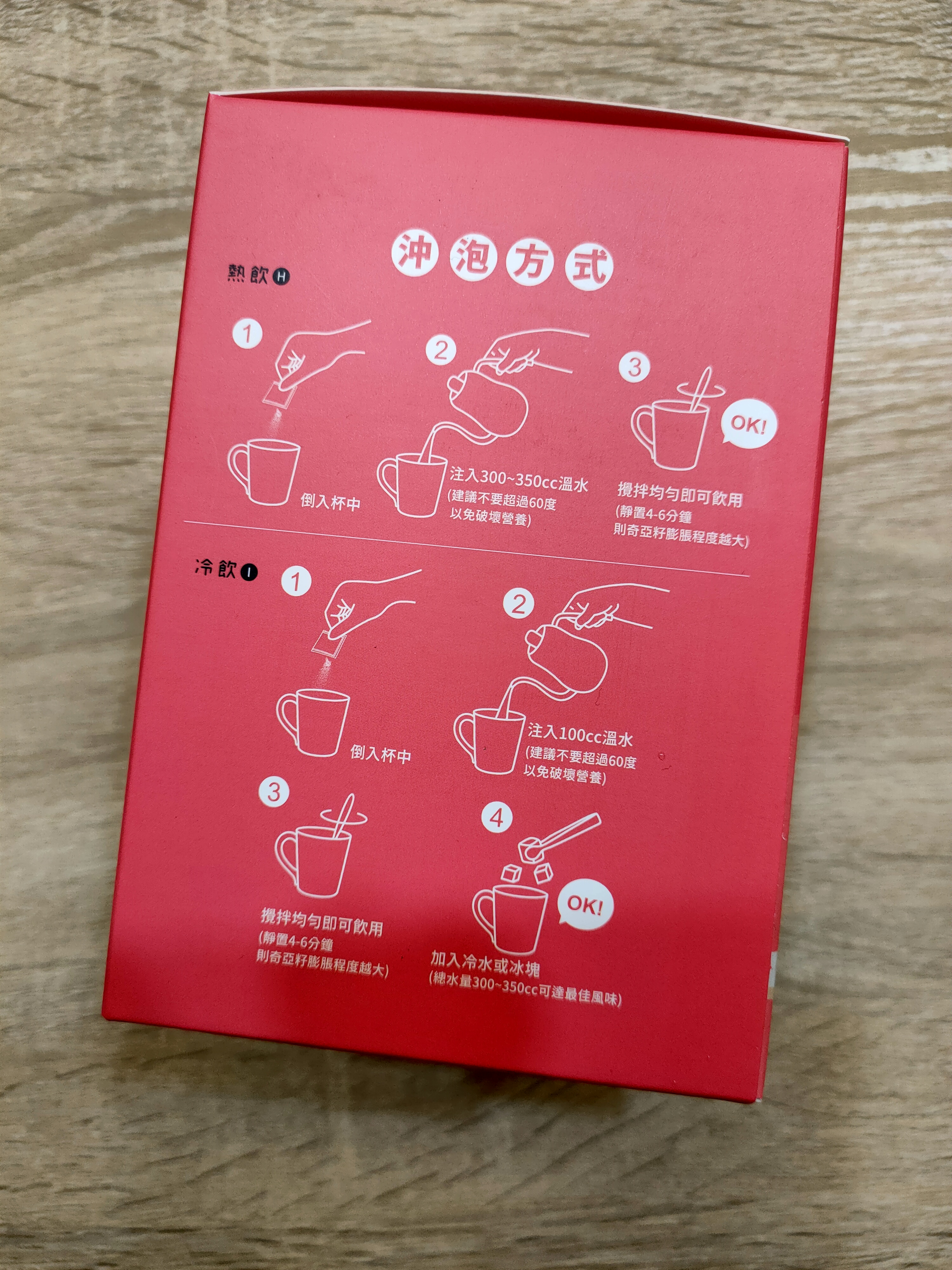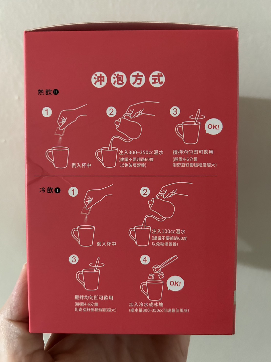 冷飲:注入100 cc溫水,攪拌均勻即可飲用,可再添加冷水或冰塊
