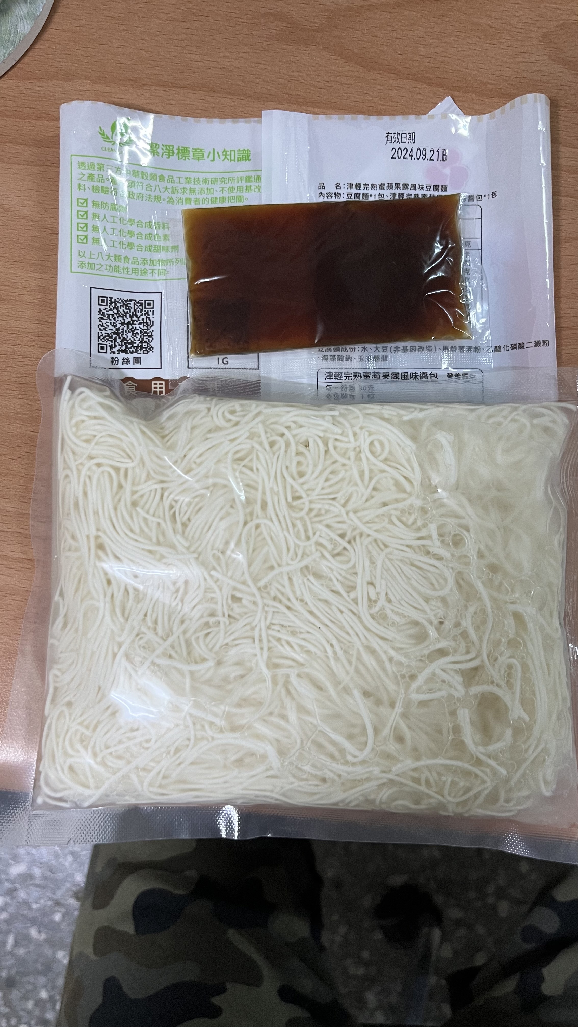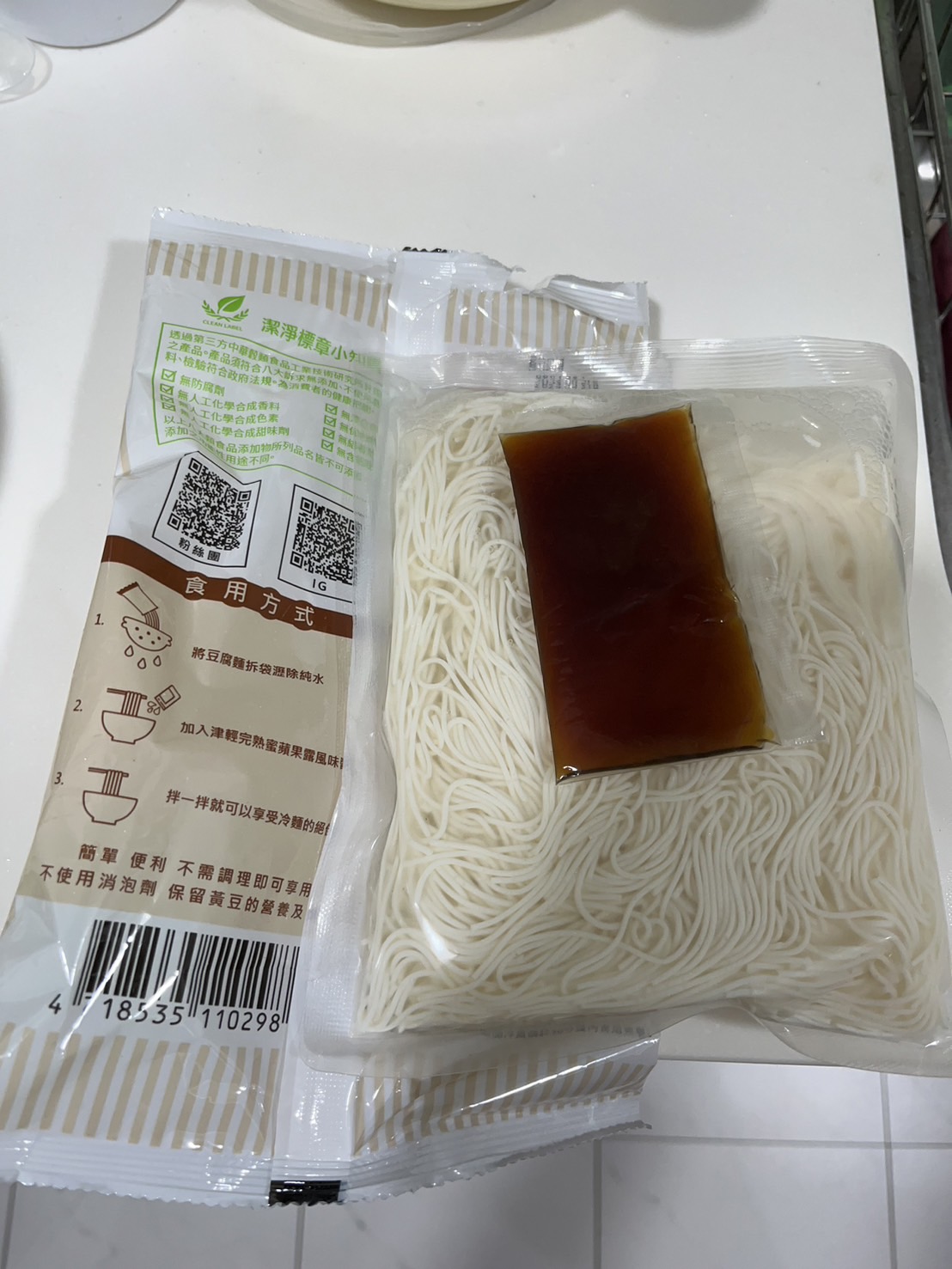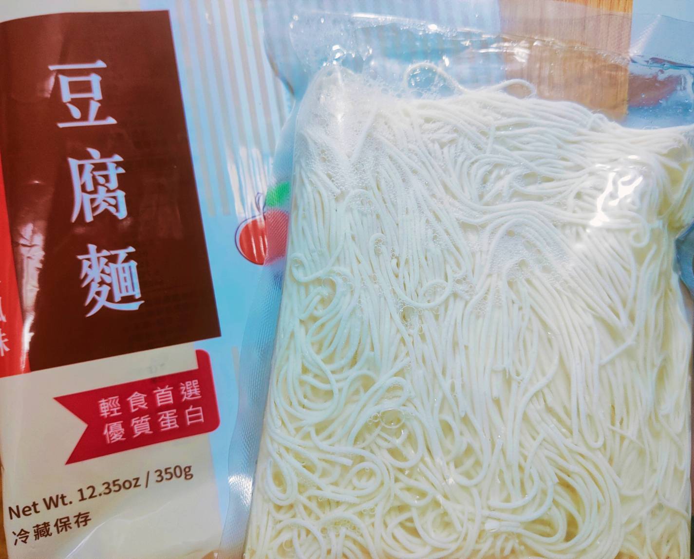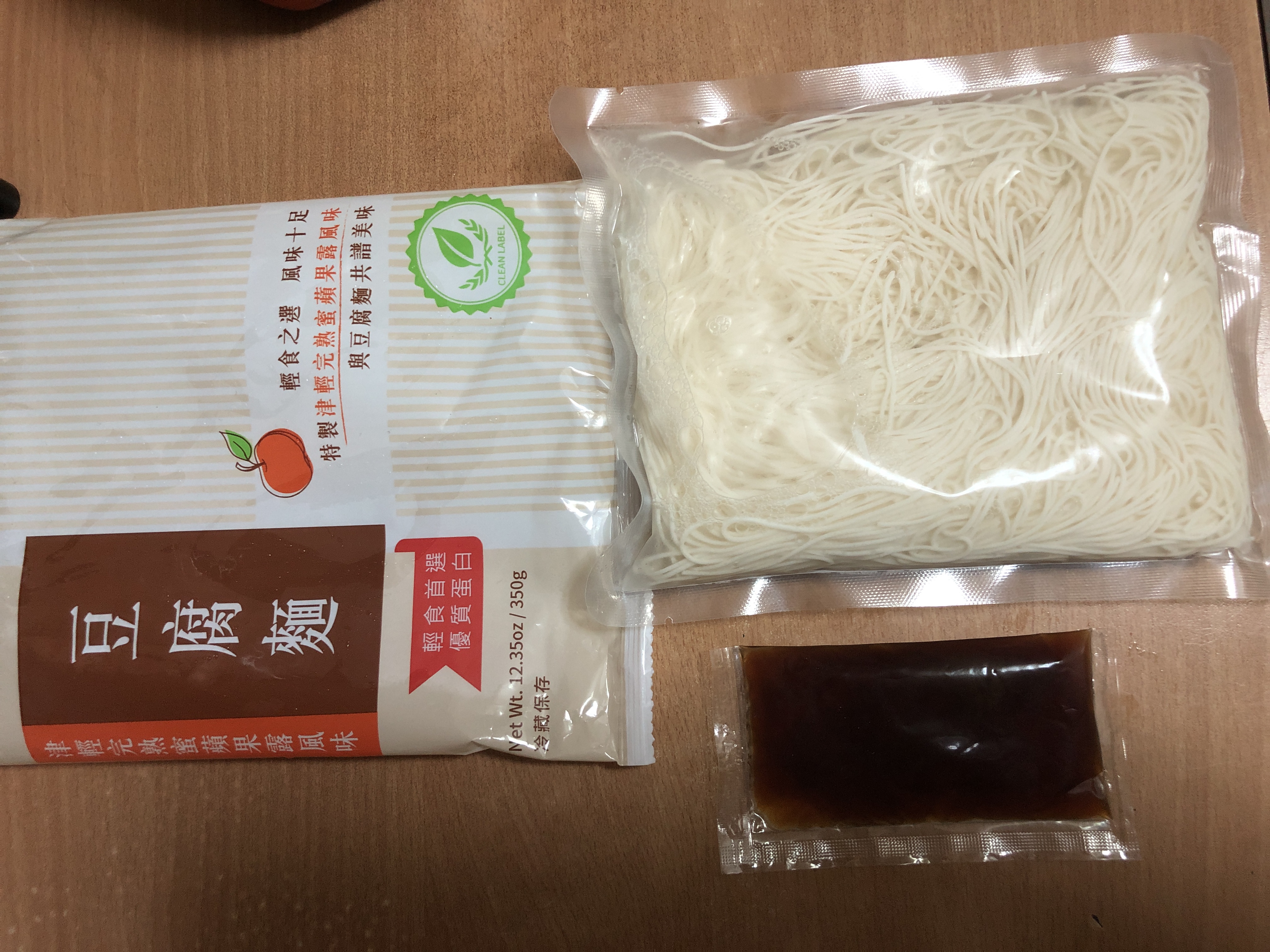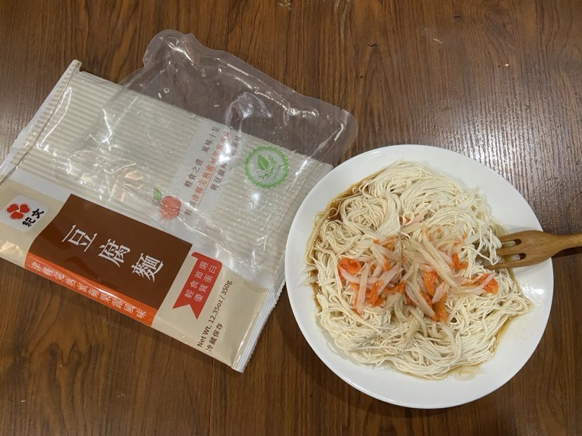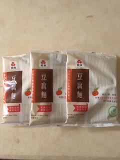 豆腐麵成份:水、大豆(非基因改造)、馬鈴薯澱粉、乙化磷酸二澱粉、海藻酸鈉、玉米糖膠