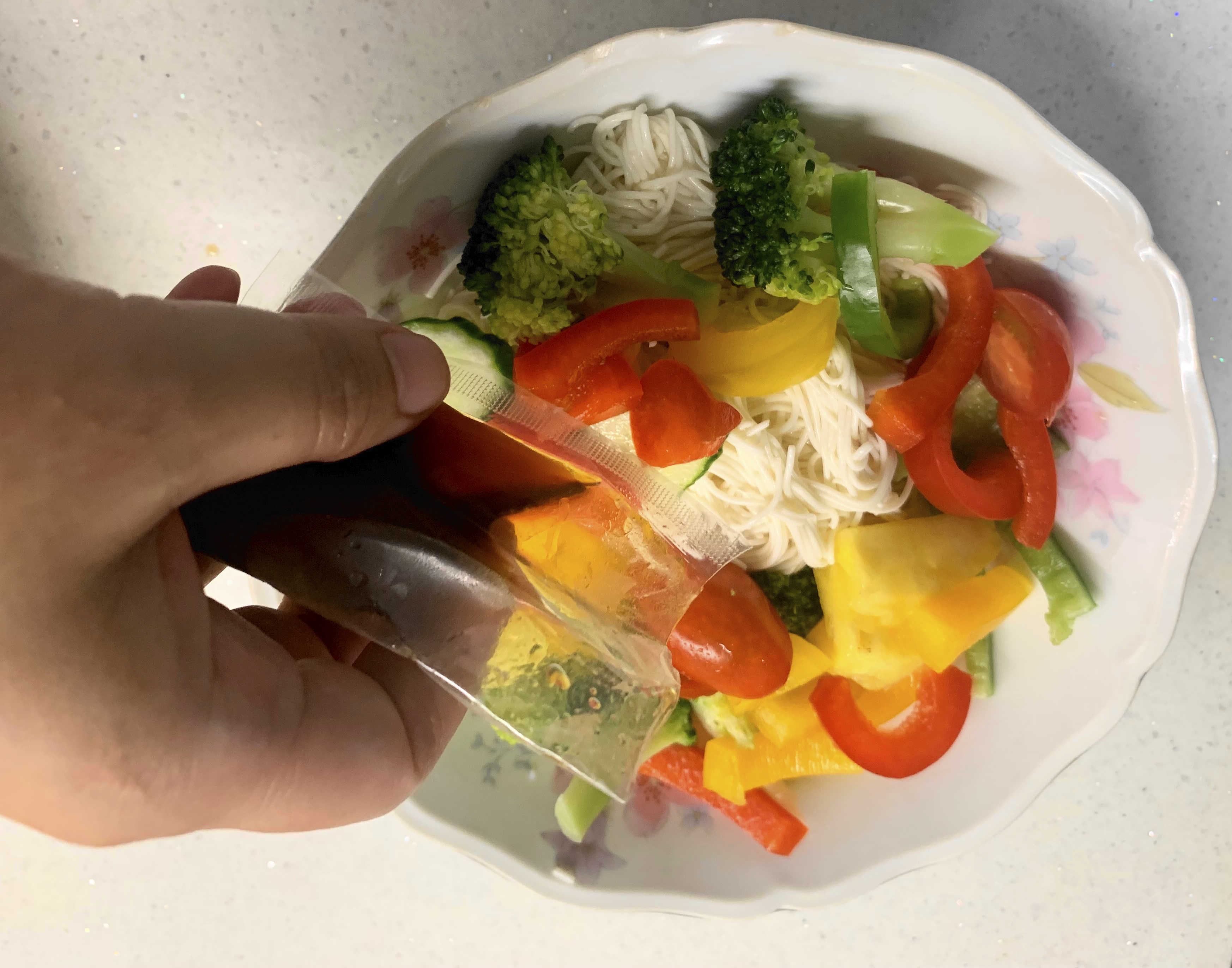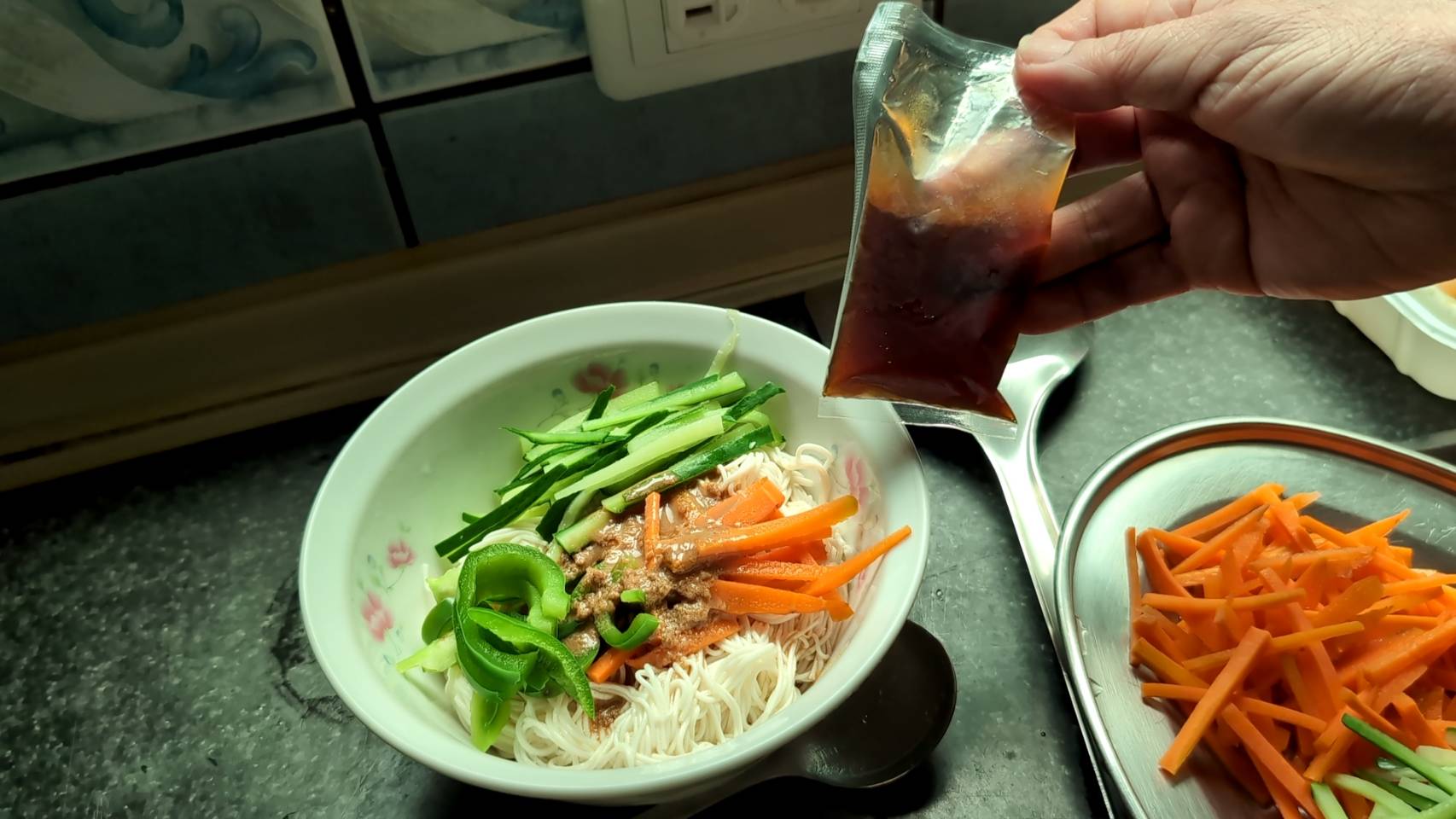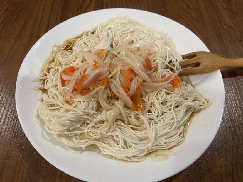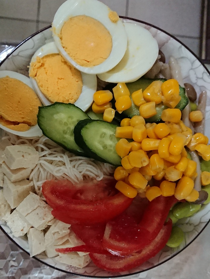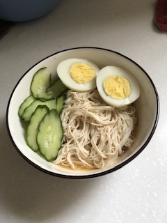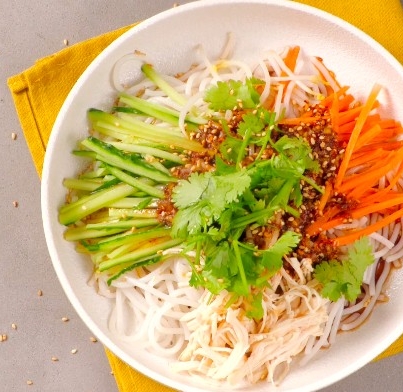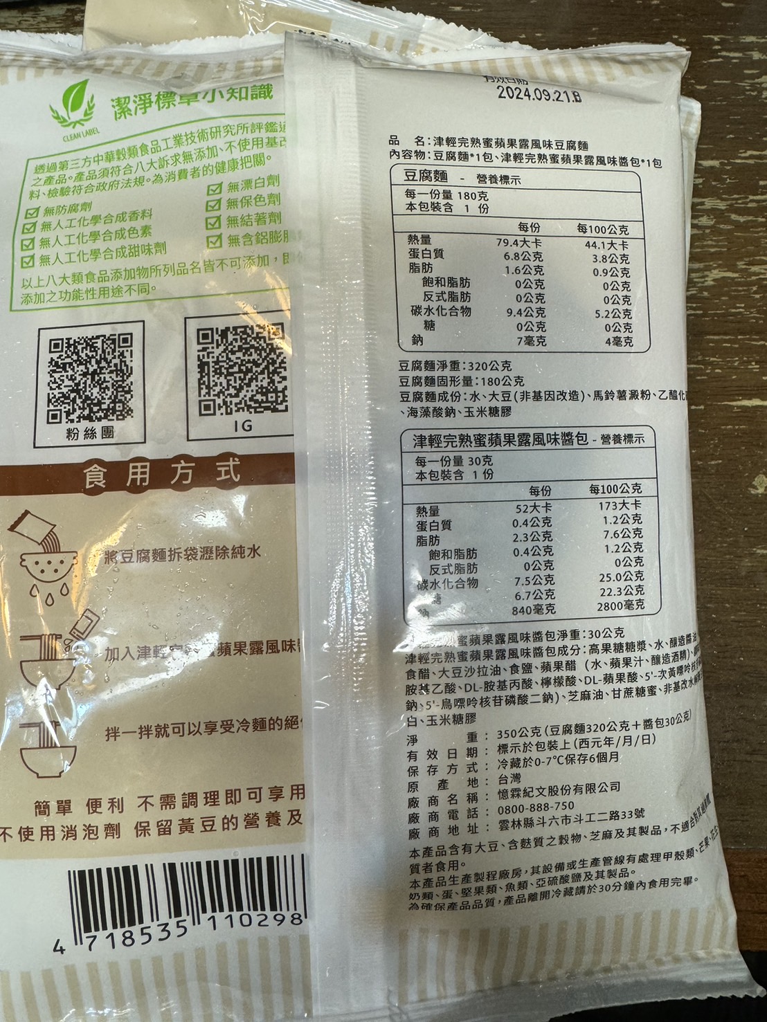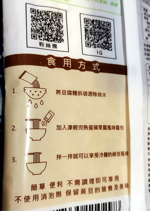豆腐麵拆袋瀝水後,淋上搭配的津輕完熟蜜蘋果露風味醬包即可食用,也可以搭配小黃瓜等配料一起享用。