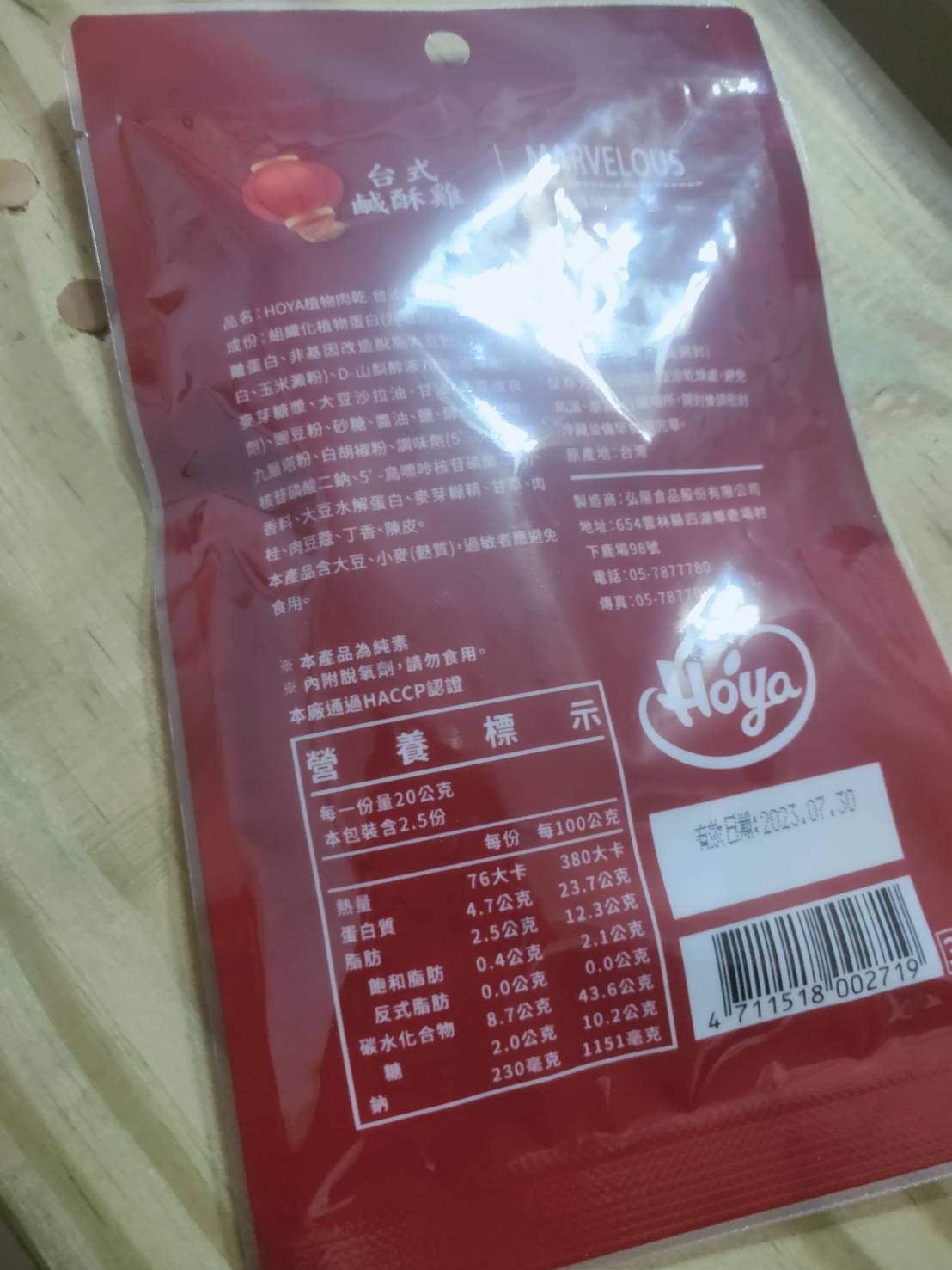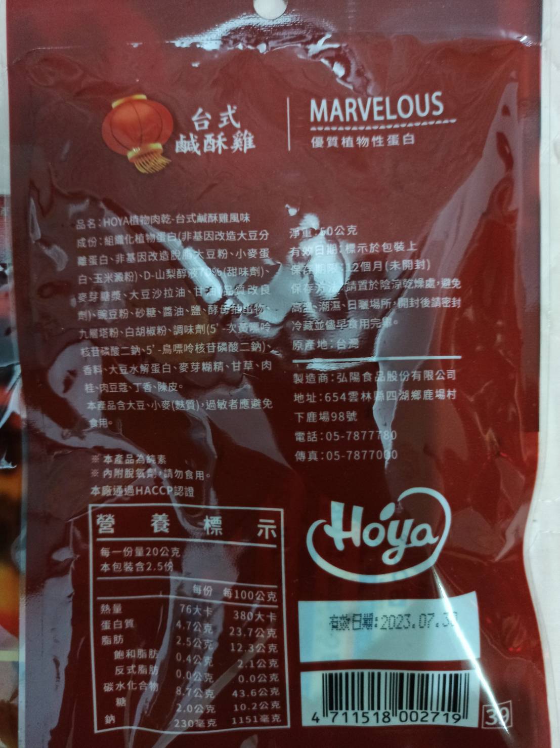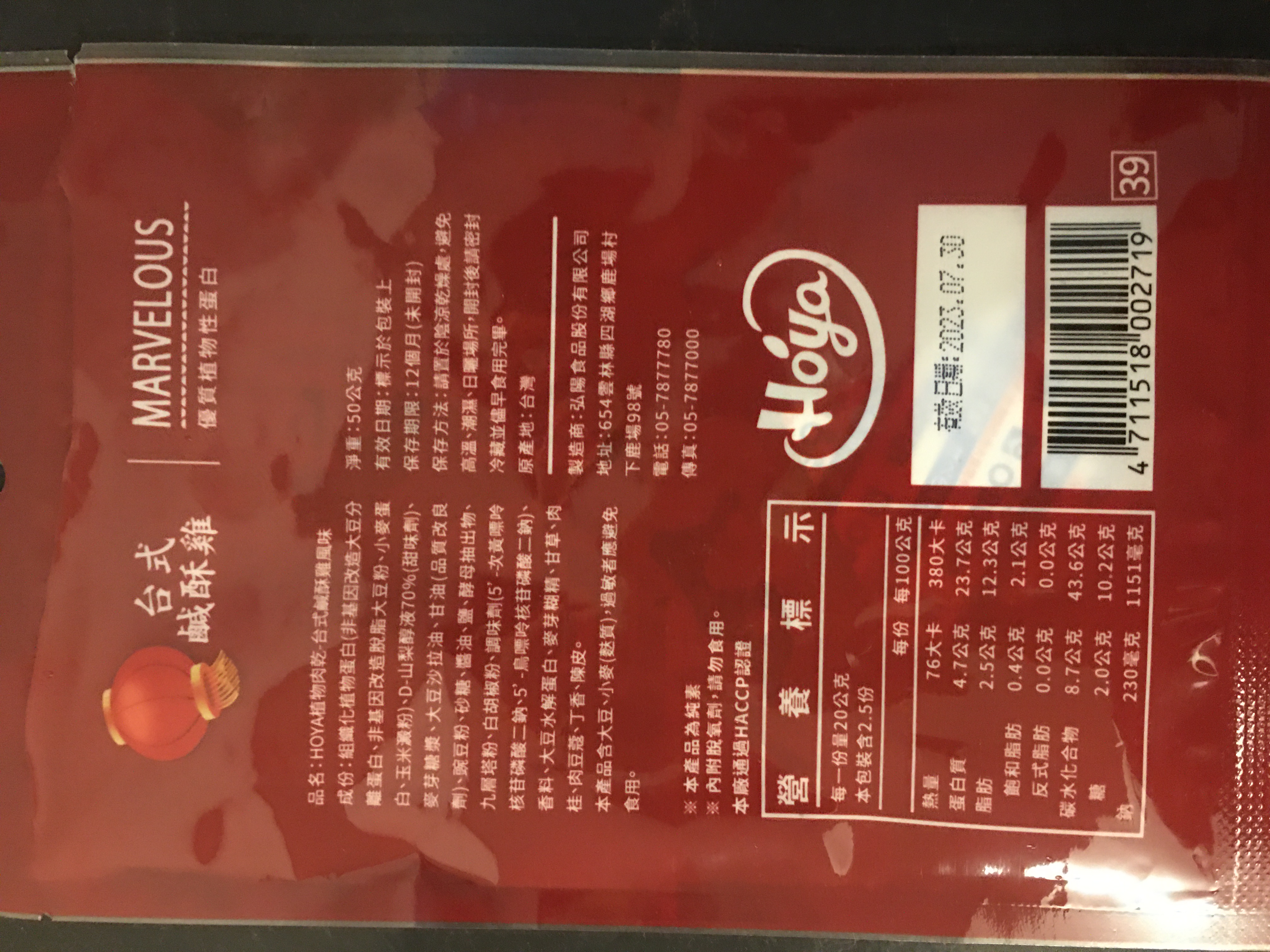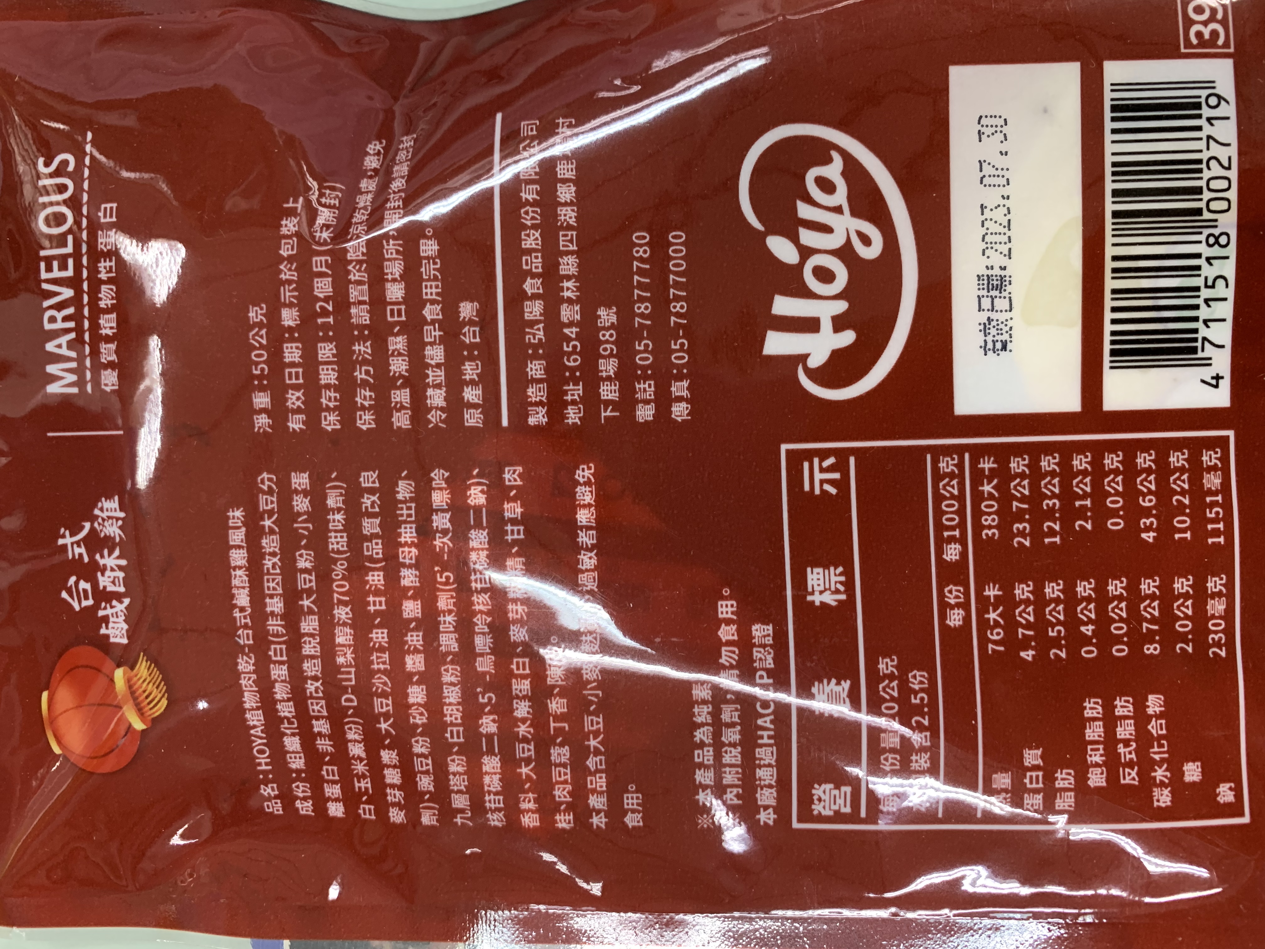 組織化植物蛋白(非基因改造大豆分離蛋白、非基因改造脫脂大豆粉、小麥蛋白、玉米澱粉)、D-山梨醇液70%(甜味劑)、麥芽糖漿、大豆沙拉油、甘油(品質改良劑)、豌豆粉、砂糖、醬油、鹽、酵母抽出物、九層塔粉、白胡椒粉、調味劑(5’-次黃嘌呤核苷磷酸二鈉、5’-鳥嘌呤核苷磷酸二鈉)、香料、大豆水解蛋白、麥芽糊精、甘草、肉桂、肉豆蔻、丁香、陳皮
