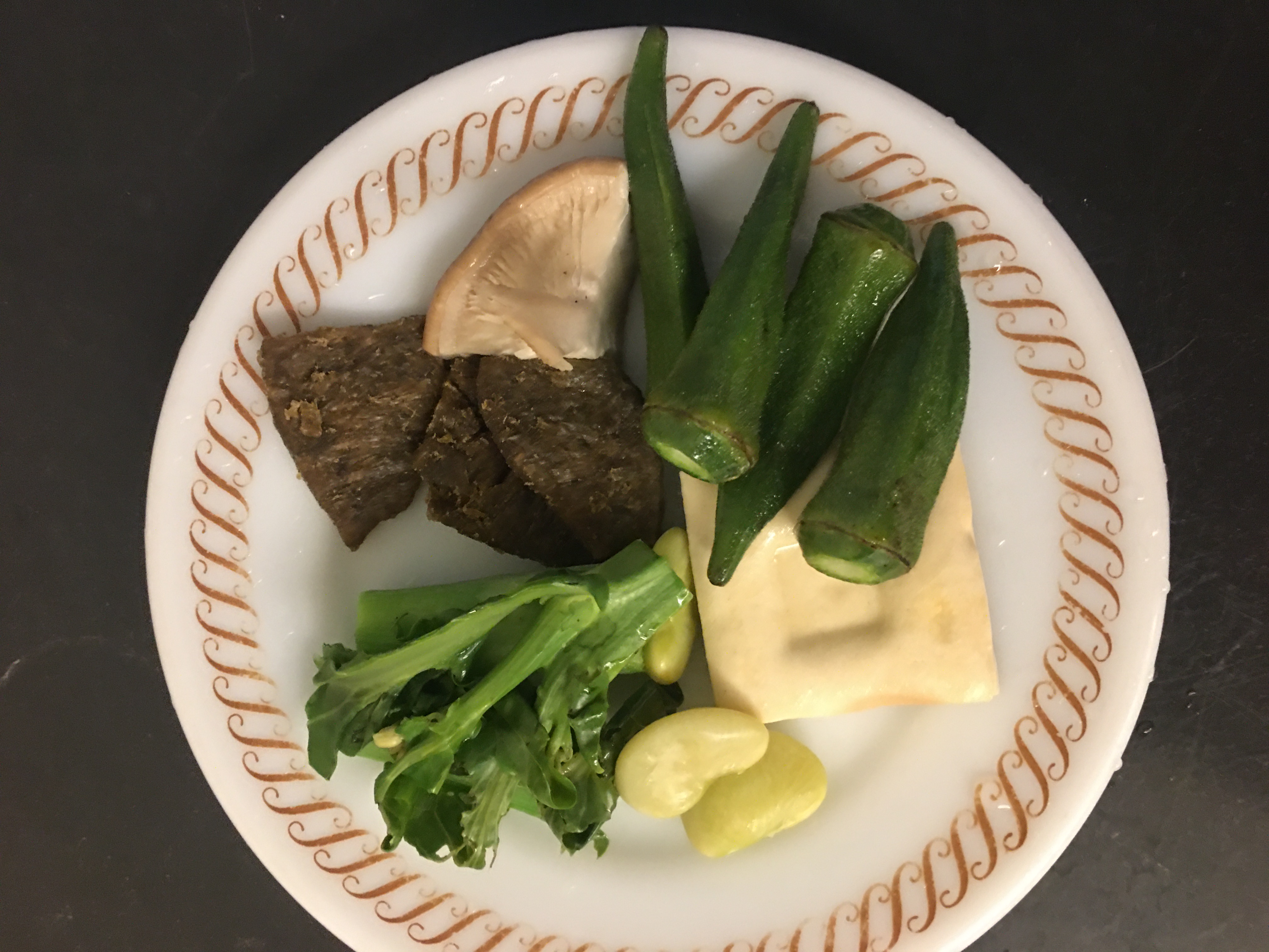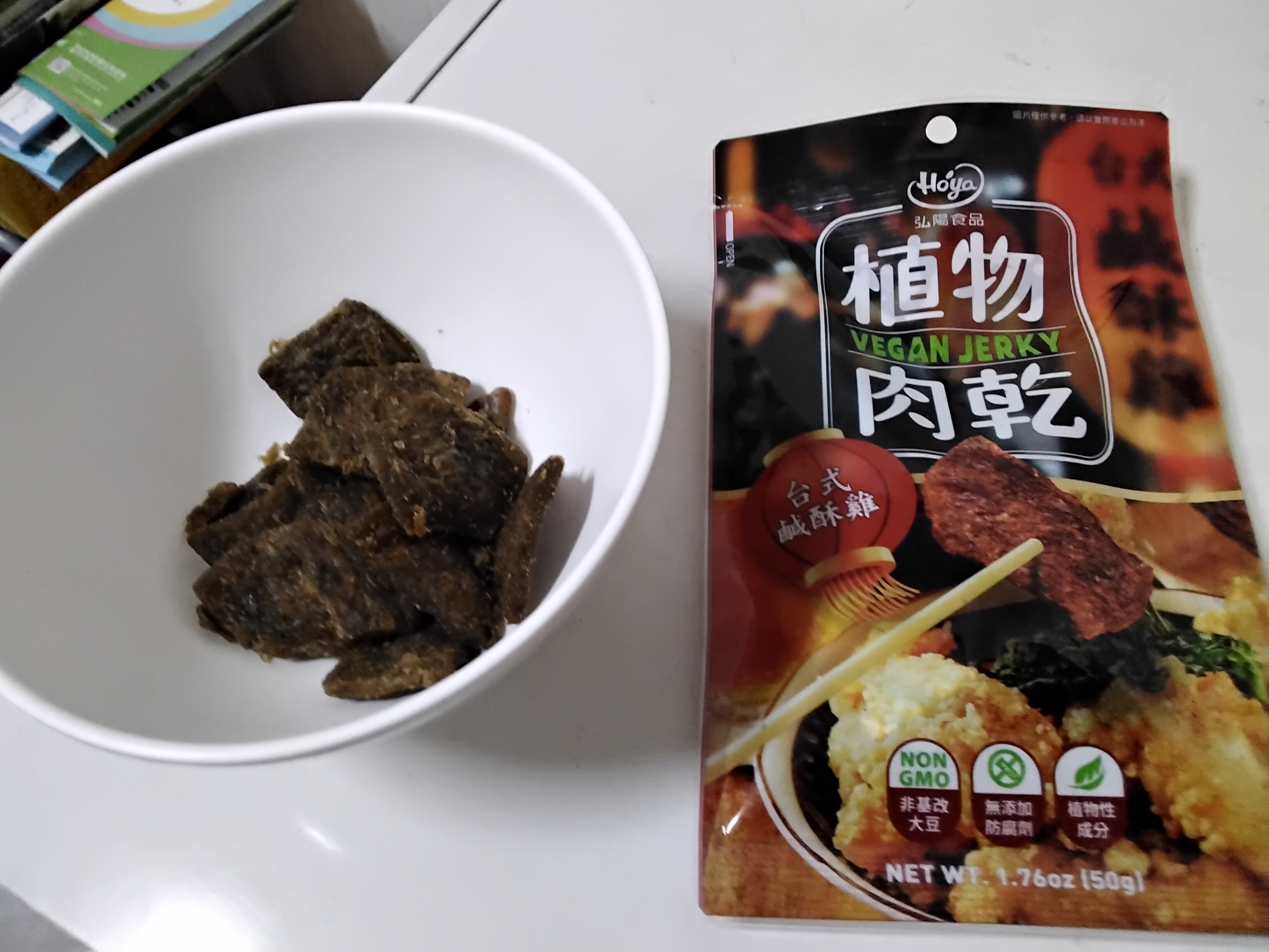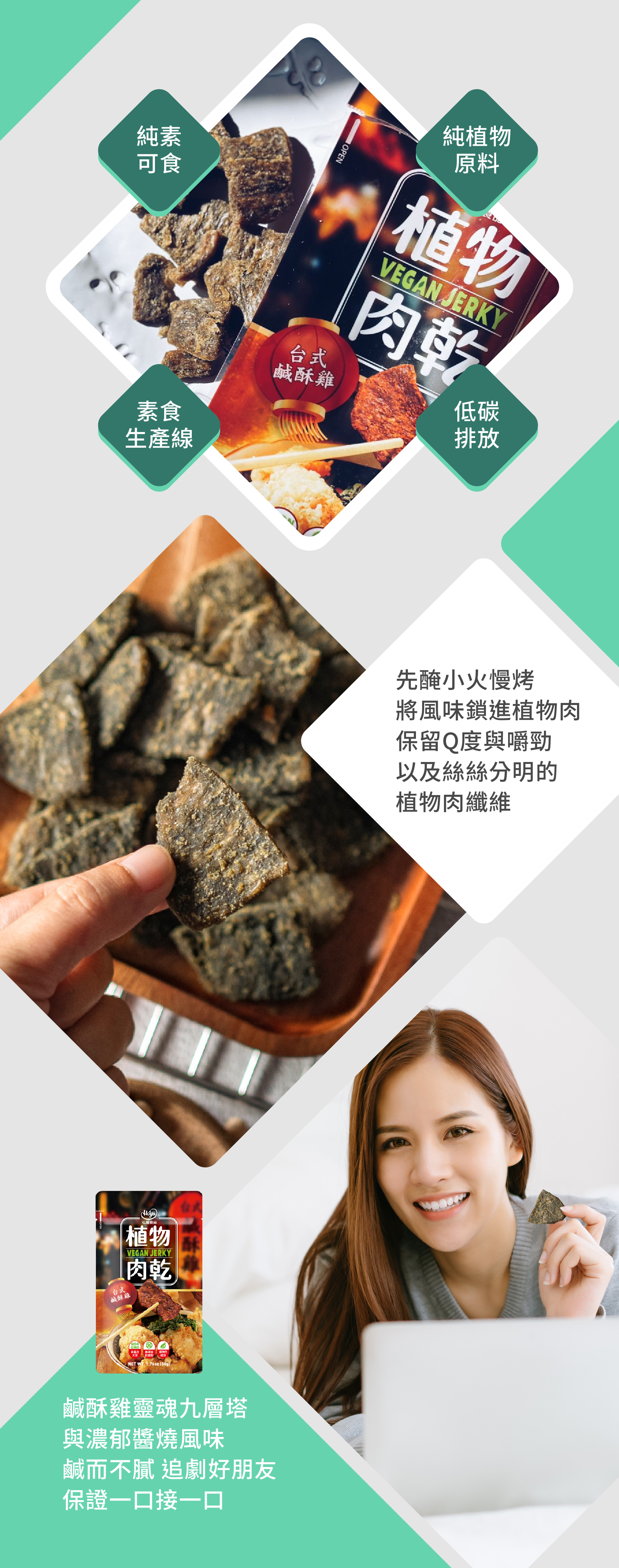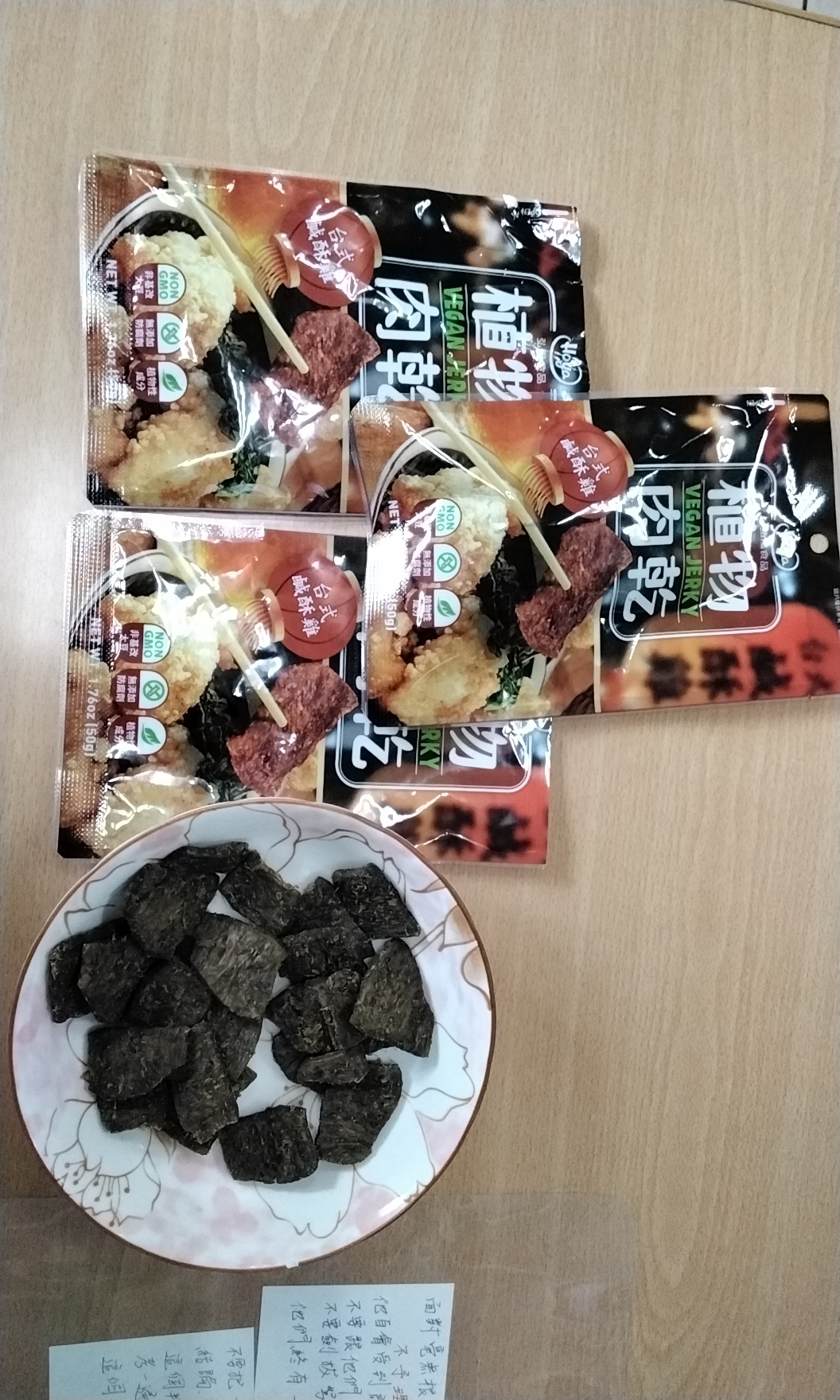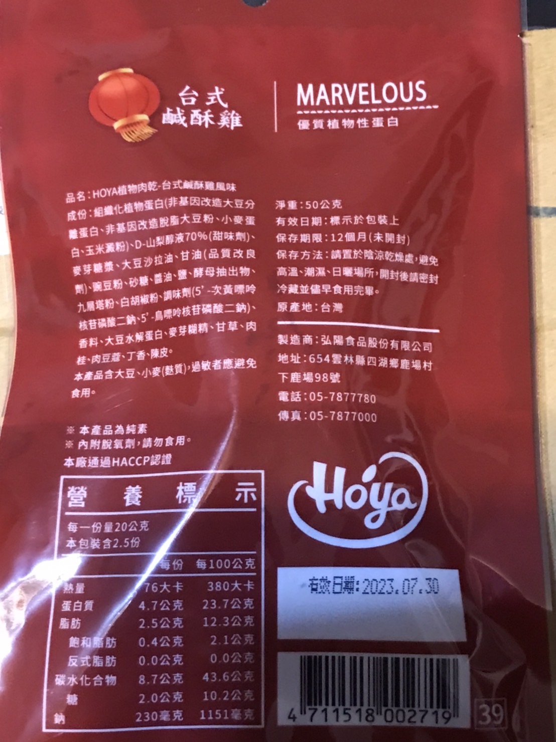 組織化植物蛋白(非基因改造大豆分離蛋白、非基因改造脫脂大豆粉、小麥蛋白、玉米澱粉)、D-山梨醇液70%(甜味劑)、麥芽糖漿、大豆沙拉油、甘油(品質改良劑)、豌豆粉、砂糖、醬油、鹽、酵母抽出物、九層塔粉、白胡椒粉、調味劑(5’-次黃嘌呤核苷磷酸二鈉、5’-鳥嘌呤核苷磷酸二鈉)、香料、大豆水解蛋白、麥芽糊精、甘草、肉桂、肉豆蔻、丁香、陳皮