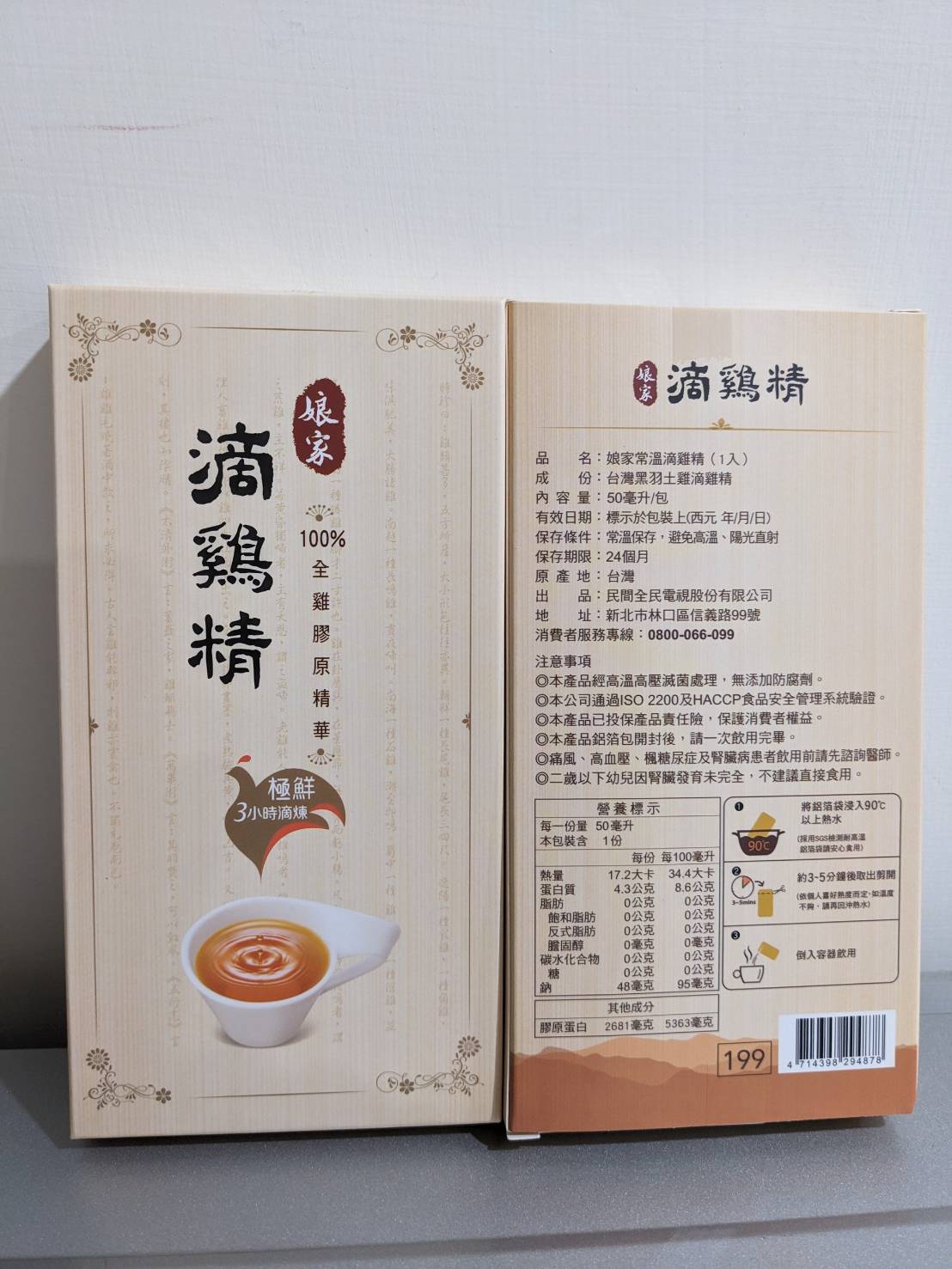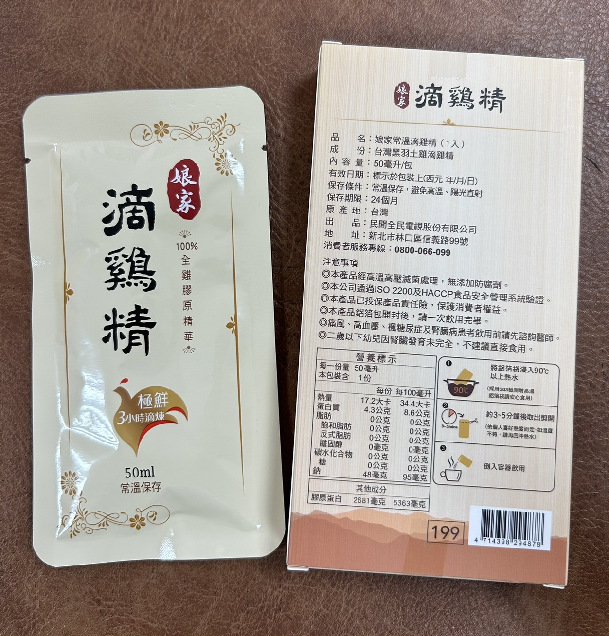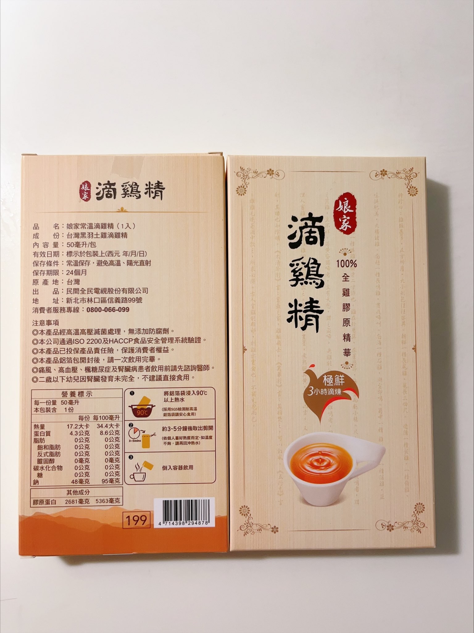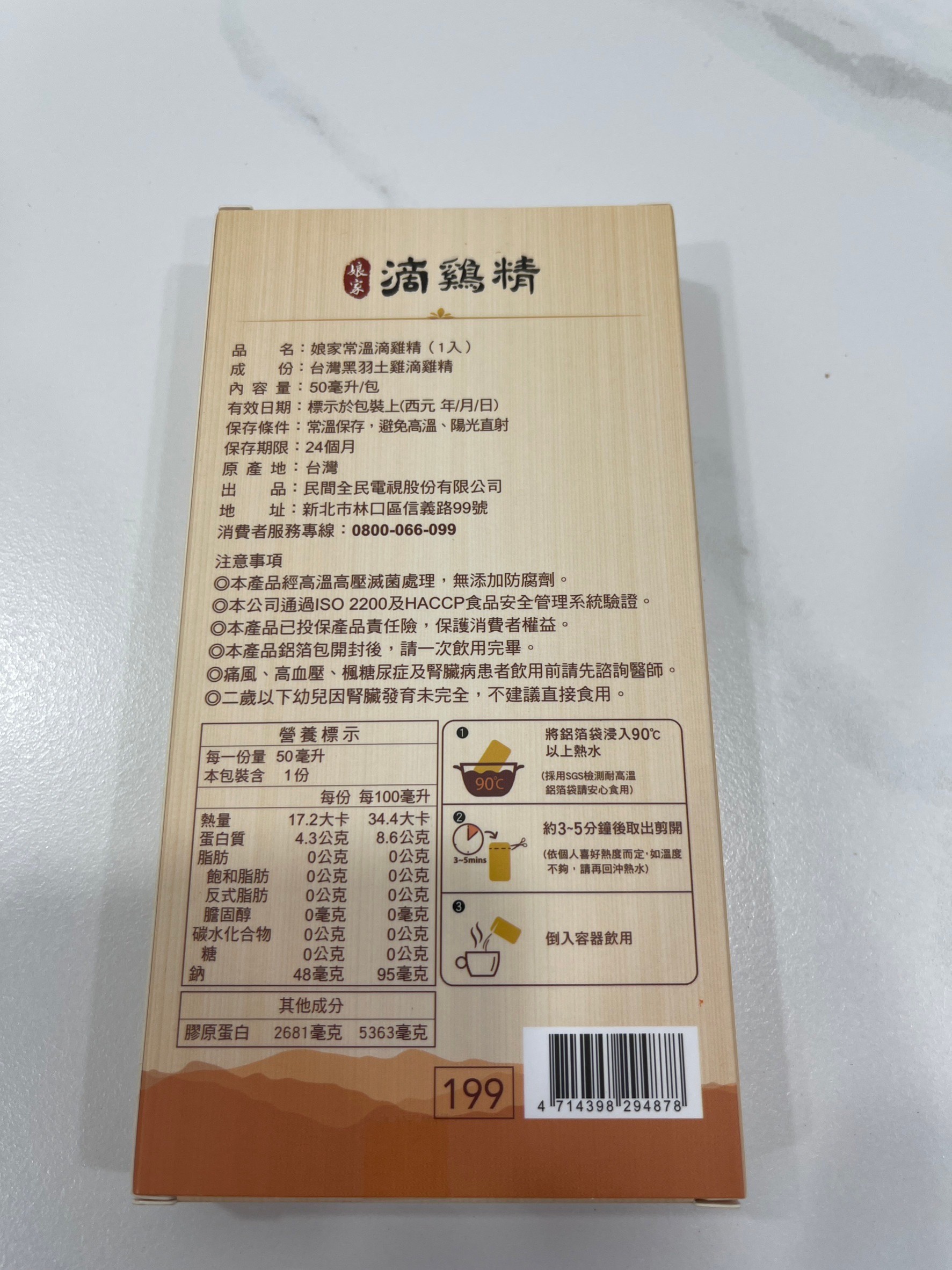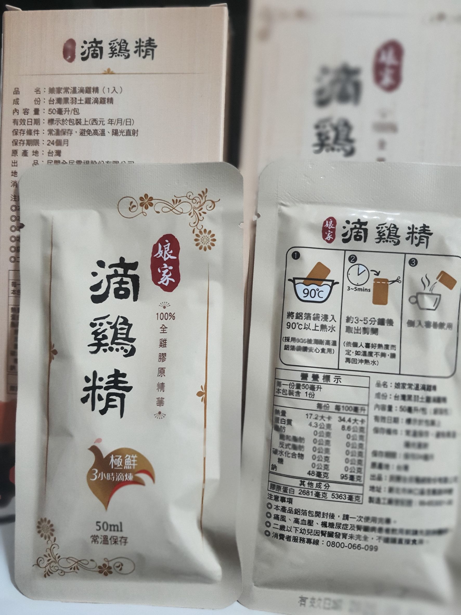 回列表 娘家常溫滴雞精 品質世界肯定 每一口都來自極鮮3小時滴煉 市價199元(免費申請) 所需等級 一般會員以上 所需學分 50 體驗份數 100 關注人數 1457 申請人數 358 申請截止 品牌業者:娘家 負責廠商 民間全民電視股份有限公司 廠商地址 新北市林口區信義路99號 產地 台灣 試用產品規格 2盒(一盒1入) 食品業者登錄字號 E-196975768-00000-9 投保產品責任險字號 0525字第22AML0002428號 心得分享 商品介紹 商品成分 使用方法 注意事項 體驗名單 9.2 娘家常溫滴雞精 香醇濃厚 9.2 好喝無腥味 9.2 滿滿膠原蛋白 8.9 元氣滋補 9.1 推薦送禮/自用保養 9.1 建議推薦 9.1 心得分享 96則 Jessica Su 鑽石達人 40歲 雲林縣 2023/08/18 對娘家常溫滴雞精留下評價 9 感謝食力食驗室這次提供寶貴的機會體驗"娘家常溫滴雞精"產品主打 品質世界肯定 每一口都來自極鮮3小時滴煉推薦"娘家常溫滴雞精"的理由1.娘家這款滴雞精有別於一般市售滴雞精需要冷凍保存,常溫滴雞精可以隨身攜帶,出外旅行帶著喝也很方便~2.直接喝味道滿濃厚,但沒有腥味希望改善的地方:1.定價一小包199,價格有點高。2.一小包用一個紙盒裝,有點過度包裝,希望能考慮減碳環保減少過度包裝感謝食力食驗室提供這次體驗機會,希望下次還能有機會體驗其他產品~~ 陳卡比 金食達人 38歲 臺南市 2023/08/18 對娘家常溫滴雞精留下評價 8 最近因為懷孕的關係開始喝起了滴雞精感謝這次能有機會體驗到不同品牌的滴雞精娘家這款滴雞精很方便的是可以常溫保存,攜帶很方便口味上是純雞精,沒有添加中藥材, 是很純粹的味道喝起來比我之前喝的品牌還要濃郁,雞味比較重不過如果是怕味道太重的人 可能會不太習慣但還是在可接受的範圍內包裝簡潔,有單入的紙盒包裝要送禮時也蠻方便的 張芷瑋 金食達人 40歲 新北市 2023/08/18 對娘家常溫滴雞精留下評價 9 這是我第一次嘗試喝滴雞精,以前不敢喝還以為會有雞腥味,不過這次體驗,讓我對滴雞精印象超好的!平常放常溫就好,不需要冷藏,想喝的時候放進90度的熱水裡隔水加熱,就能吃到香噴噴的滴雞精了,撕開鋁箔袋的瞬間,濃郁的香味撲鼻而來,滴雞精舀起來顏色金黃金黃,看起來就很美味,娘家滴雞精是用黑羽土雞,它的營養價值相當高的因為不加任何一滴水,喝下去味道相當濃郁,很溫暖順口,每一口都能感受到它的純粹,對我這種超忙碌的人來說,真的是很方便補充營養的方式! Lily Liao 鑽石達人 34歲 新北市 2023/08/20 對娘家常溫滴雞精留下評價 7 感謝食力給予機會試吃娘家常溫滴雞精。此款滴雞精標榜極鮮3小時滴煉,含有100%全雞膠原精華,先前我只喝過冷凍保存的滴雞精,很好奇常溫的滴雞精是什麼味道。食用方法是浸入90℃以上的水3~5分鐘後取出剪開倒入容器,我得老實說90℃讓我滿困擾的,我知道水滾是100℃但我不知道該怎麼在沒有溫度計下的方式測量90℃,所以我就是等水滾,關火後就把滴雞精放進去計時5分鐘。剪開倒入容器後先聞到一個非常明顯的雞精味,這味道讓我有點害怕,以前喝瓶裝雞精都得捏著鼻子皺著臉才有辦法喝下去,一聞到就跟我過去的經驗做連結,先有了比較負面的印象,不過實際上喝下肚後,並沒有讓我害怕的雞精味,感覺上比較像雞湯,然而香氣沒有很足,就是一款還不錯的常溫滴雞精。雖然沒有比我之前試吃的冷凍滴雞精好喝,但常溫保存方便許多,這一點就略勝一籌,價格上也更實惠,我覺得是個很好的選擇。 AK Stein 鑽石達人 44歲 花蓮縣 2023/08/21 對娘家常溫滴雞精留下評價 9 包裝收納得很好,每包滴雞精都密封得很紮實平整,娘家滴雞精是目前喝完後覺得喝過的滴雞精中接受度最高的。娘家滴精雞精的份量介於中等,成分夠,適量的補充。製造日期直接壓印在每一包包裝上,而不是只有統一印於外盒,這樣每一包都有清楚效時間,設計很貼心。娘家滴雞精採用全程封存全雞的原汁精華,利用獨特的蒸氣不回流技術,每一隻三公斤的黑羽土雞只能滴出大概2包左右的娘家滴雞精,油脂分離零脂肪,滴滴甘醇不油膩。 irene yang 金食達人 32歲 新北市 2023/08/22 對娘家常溫滴雞精留下評價 10 很榮幸抽到試喝"娘家常溫滴雞精",真的讓我超驚艷的!首先,它的味道鮮美,帶有濃濃的雞香卻不人工也沒加任何一滴水,喝了一包還覺得不後夠。不同以往古早口味不大眾的雞精,喝起來超順口,一點都沒有腥味或是難嚥的感覺,就像喝了一碗超濃縮卻營養十足的雞湯。最方便的是,它簡單隔水加熱,隨時隨地都能喝到暖胃的雞湯,真的太方便了!對於忙碌的上班族,終於找到可以隨時補充能量的好拍擋。 陳昭安 鑽石達人 34歲 雲林縣 2023/08/23 對娘家常溫滴雞精留下評價 10 很開心能參與這次食驗室-「娘家常溫滴雞精」的試吃體驗,*外包裝:有明顯產品名稱、熱量、商品成分、保存期限以及外盒有說明食用方式。*商品成分內容物為: 台灣黑羽土雞滴雞精。*食用方式【隔水加熱】1. 將鋁箔包直接浸入90度c以上熱水。2. 約3-5分鐘後取出。3. 剪開鋁箔包,倒入容器內飲用。*試吃心得: 1.包裝隔水加熱預熱快。2.食用方式有圖解清楚明瞭。3.味道不腥不膩。4.隨身包好攜帶。5.很推薦大家食用。 涂秀英 鑽石達人 37歲 臺北市 2023/08/24 對娘家常溫滴雞精留下評價 10 市面上琳瑯滿目的雞精品牌,今天我要慎重推薦娘家100%全雞膠原精華滴雞精.拆開來就可以聞到淡淡的香氣,一般來說雞湯冷了會浮一