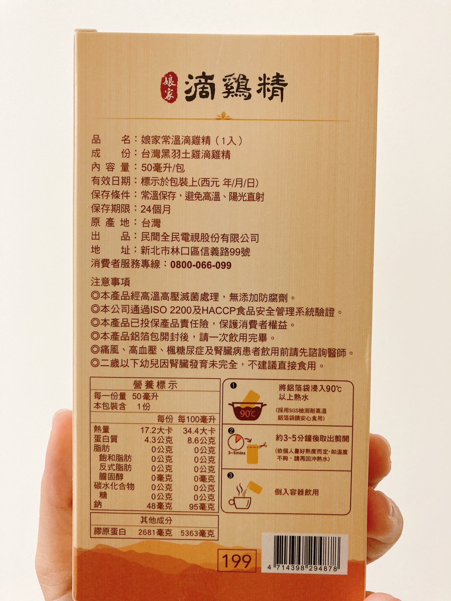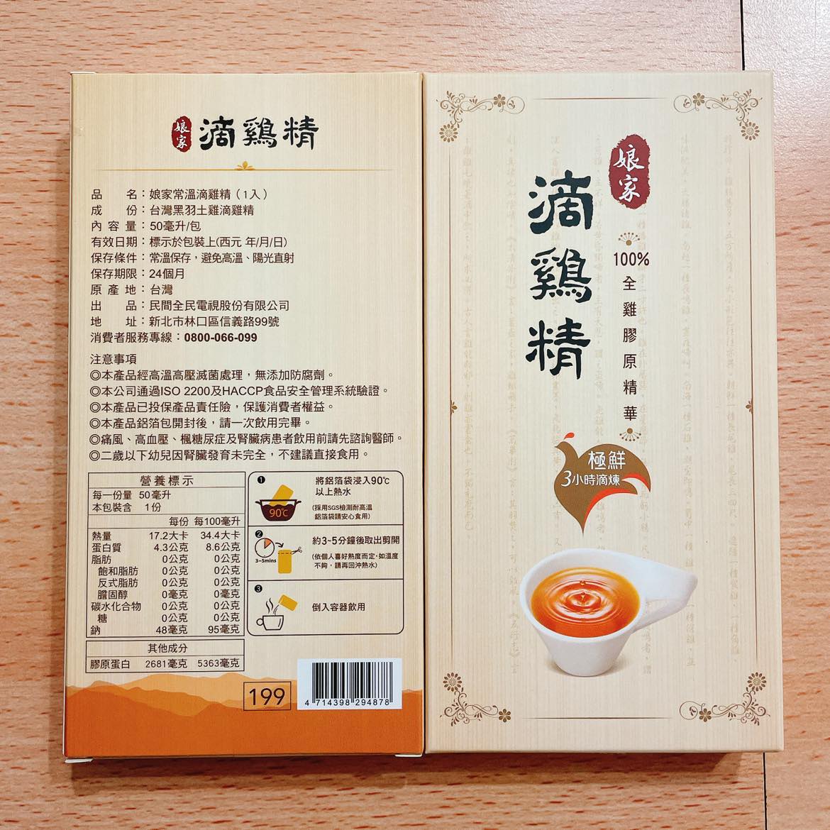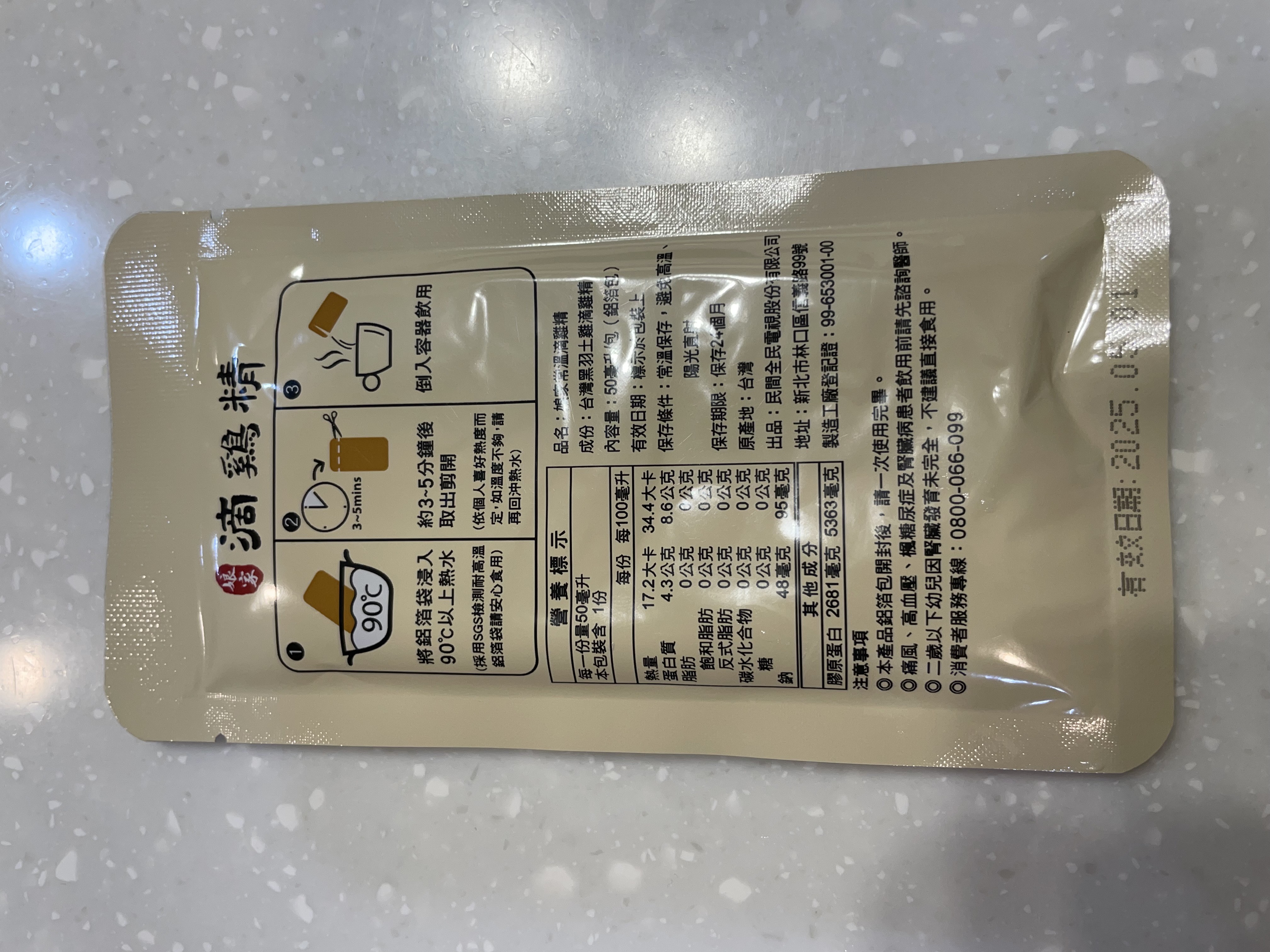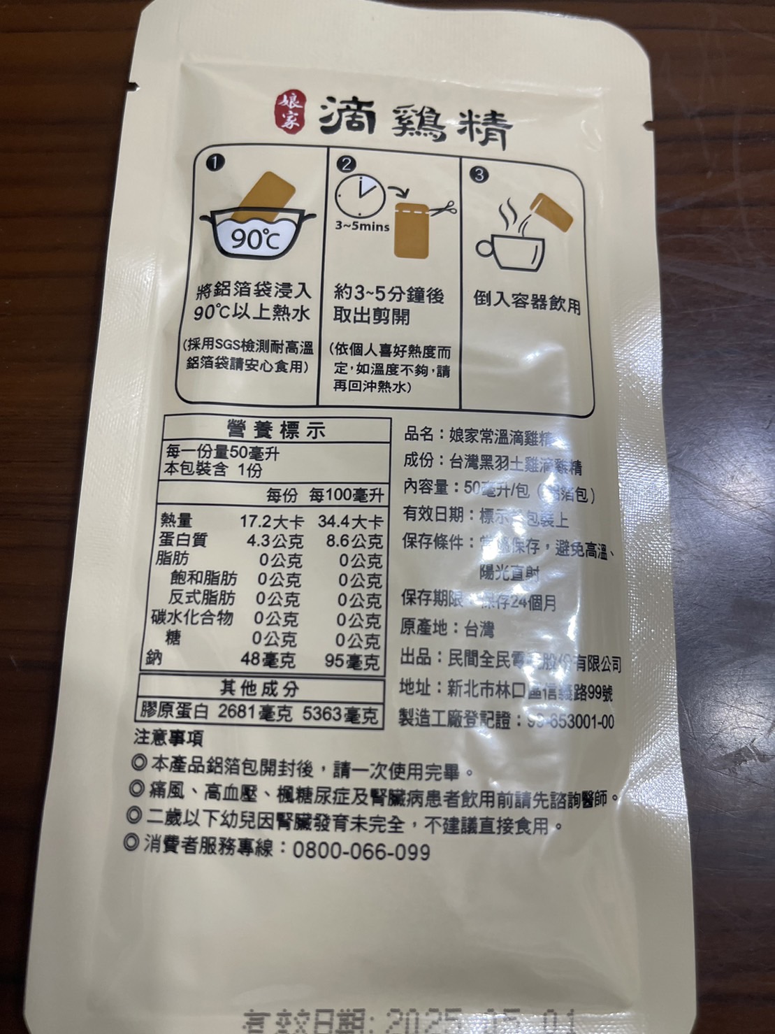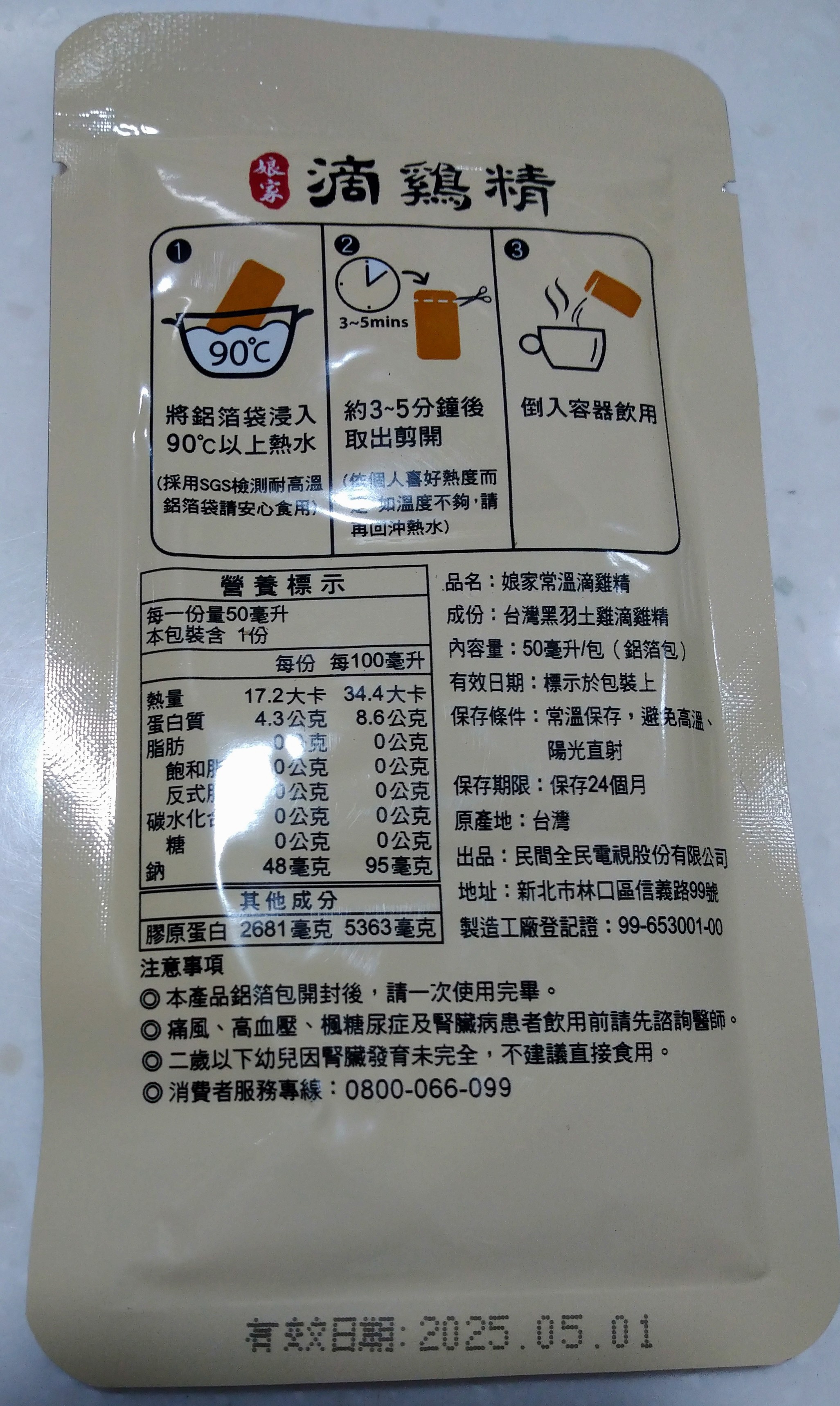 回列表 娘家常溫滴雞精 品質世界肯定 每一口都來自極鮮3小時滴煉 市價199元(免費申請) 所需等級 一般會員以上 所需學分 50 體驗份數 100 關注人數 1457 申請人數 358 申請截止 品牌業者:娘家 負責廠商 民間全民電視股份有限公司 廠商地址 新北市林口區信義路99號 產地 台灣 試用產品規格 2盒(一盒1入) 食品業者登錄字號 E-196975768-00000-9 投保產品責任險字號 0525字第22AML0002428號 心得分享 商品介紹 商品成分 使用方法 注意事項 體驗名單 9.2 娘家常溫滴雞精 香醇濃厚 9.2 好喝無腥味 9.2 滿滿膠原蛋白 8.9 元氣滋補 9.1 推薦送禮/自用保養 9.1 建議推薦 9.1 心得分享 96則 Jessica Su 鑽石達人 40歲 雲林縣 2023/08/18 對娘家常溫滴雞精留下評價 9 感謝食力食驗室這次提供寶貴的機會體驗"娘家常溫滴雞精"產品主打 品質世界肯定 每一口都來自極鮮3小時滴煉推薦"娘家常溫滴雞精"的理由1.娘家這款滴雞精有別於一般市售滴雞精需要冷凍保存,常溫滴雞精可以隨身攜帶,出外旅行帶著喝也很方便~2.直接喝味道滿濃厚,但沒有腥味希望改善的地方:1.定價一小包199,價格有點高。2.一小包用一個紙盒裝,有點過度包裝,希望能考慮減碳環保減少過度包裝感謝食力食驗室提供這次體驗機會,希望下次還能有機會體驗其他產品~~ 陳卡比 金食達人 38歲 臺南市 2023/08/18 對娘家常溫滴雞精留下評價 8 最近因為懷孕的關係開始喝起了滴雞精感謝這次能有機會體驗到不同品牌的滴雞精娘家這款滴雞精很方便的是可以常溫保存,攜帶很方便口味上是純雞精,沒有添加中藥材, 是很純粹的味道喝起來比我之前喝的品牌還要濃郁,雞味比較重不過如果是怕味道太重的人 可能會不太習慣但還是在可接受的範圍內包裝簡潔,有單入的紙盒包裝要送禮時也蠻方便的 張芷瑋 金食達人 40歲 新北市 2023/08/18 對娘家常溫滴雞精留下評價 9 這是我第一次嘗試喝滴雞精,以前不敢喝還以為會有雞腥味,不過這次體驗,讓我對滴雞精印象超好的!平常放常溫就好,不需要冷藏,想喝的時候放進90度的熱水裡隔水加熱,就能吃到香噴噴的滴雞精了,撕開鋁箔袋的瞬間,濃郁的香味撲鼻而來,滴雞精舀起來顏色金黃金黃,看起來就很美味,娘家滴雞精是用黑羽土雞,它的營養價值相當高的因為不加任何一滴水,喝下去味道相當濃郁,很溫暖順口,每一口都能感受到它的純粹,對我這種超忙碌的人來說,真的是很方便補充營養的方式! Lily Liao 鑽石達人 34歲 新北市 2023/08/20 對娘家常溫滴雞精留下評價 7 感謝食力給予機會試吃娘家常溫滴雞精。此款滴雞精標榜極鮮3小時滴煉,含有100%全雞膠原精華,先前我只喝過冷凍保存的滴雞精,很好奇常溫的滴雞精是什麼味道。食用方法是浸入90℃以上的水3~5分鐘後取出剪開倒入容器,我得老實說90℃讓我滿困擾的,我知道水滾是100℃但我不知道該怎麼在沒有溫度計下的方式測量90℃,所以我就是等水滾,關火後就把滴雞精放進去計時5分鐘。剪開倒入容器後先聞到一個非常明顯的雞精味,這味道讓我有點害怕,以前喝瓶裝雞精都得捏著鼻子皺著臉才有辦法喝下去,一聞到就跟我過去的經驗做連結,先有了比較負面的印象,不過實際上喝下肚後,並沒有讓我害怕的雞精味,感覺上比較像雞湯,然而香氣沒有很足,就是一款還不錯的常溫滴雞精。雖然沒有比我之前試吃的冷凍滴雞精好喝,但常溫保存方便許多,這一點就略勝一籌,價格上也更實惠,我覺得是個很好的選擇。 AK Stein 鑽石達人 44歲 花蓮縣 2023/08/21 對娘家常溫滴雞精留下評價 9 包裝收納得很好,每包滴雞精都密封得很紮實平整,娘家滴雞精是目前喝完後覺得喝過的滴雞精中接受度最高的。娘家滴精雞精的份量介於中等,成分夠,適量的補充。製造日期直接壓印在每一包包裝上,而不是只有統一印於外盒,這樣每一包都有清楚效時間,設計很貼心。娘家滴雞精採用全程封存全雞的原汁精華,利用獨特的蒸氣不回流技術,每一隻三公斤的黑羽土雞只能滴出大概2包左右的娘家滴雞精,油脂分離零脂肪,滴滴甘醇不油膩。 irene yang 金食達人 32歲 新北市 2023/08/22 對娘家常溫滴雞精留下評價 10 很榮幸抽到試喝"娘家常溫滴雞精",真的讓我超驚艷的!首先,它的味道鮮美,帶有濃濃的雞香卻不人工也沒加任何一滴水,喝了一包還覺得不後夠。不同以往古早口味不大眾的雞精,喝起來超順口,一點都沒有腥味或是難嚥的感覺,就像喝了一碗超濃縮卻營養十足的雞湯。最方便的是,它簡單隔水加熱,隨時隨地都能喝到暖胃的雞湯,真的太方便了!對於忙碌的上班族,終於找到可以隨時補充能量的好拍擋。 陳昭安 鑽石達人 34歲 雲林縣 2023/08/23 對娘家常溫滴雞精留下評價 10 很開心能參與這次食驗室-「娘家常溫滴雞精」的試吃體驗,*外包裝:有明顯產品名稱、熱量、商品成分、保存期限以及外盒有說明食用方式。*商品成分內容物為: 台灣黑羽土雞滴雞精。*食用方式【隔水加熱】1. 將鋁箔包直接浸入90度c以上熱水。2. 約3-5分鐘後取出。3. 剪開鋁箔包,倒入容器內飲用。*試吃心得: 1.包裝隔水加熱預熱快。2.食用方式有圖解清楚明瞭。3.味道不腥不膩。4.隨身包好攜帶。5.很推薦大家食用。 涂秀英 鑽石達人 37歲 臺北市 2023/08/24 對娘家常溫滴雞精留下評價 10 市面上琳瑯滿目的雞精品牌,今天我要慎重推薦娘家100%全雞膠原精華滴雞精.拆開來就可以聞到淡淡的香氣,一般來說雞湯冷了會浮一