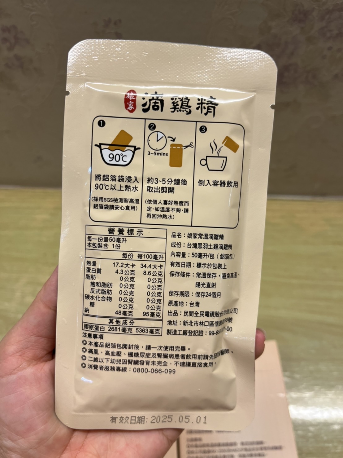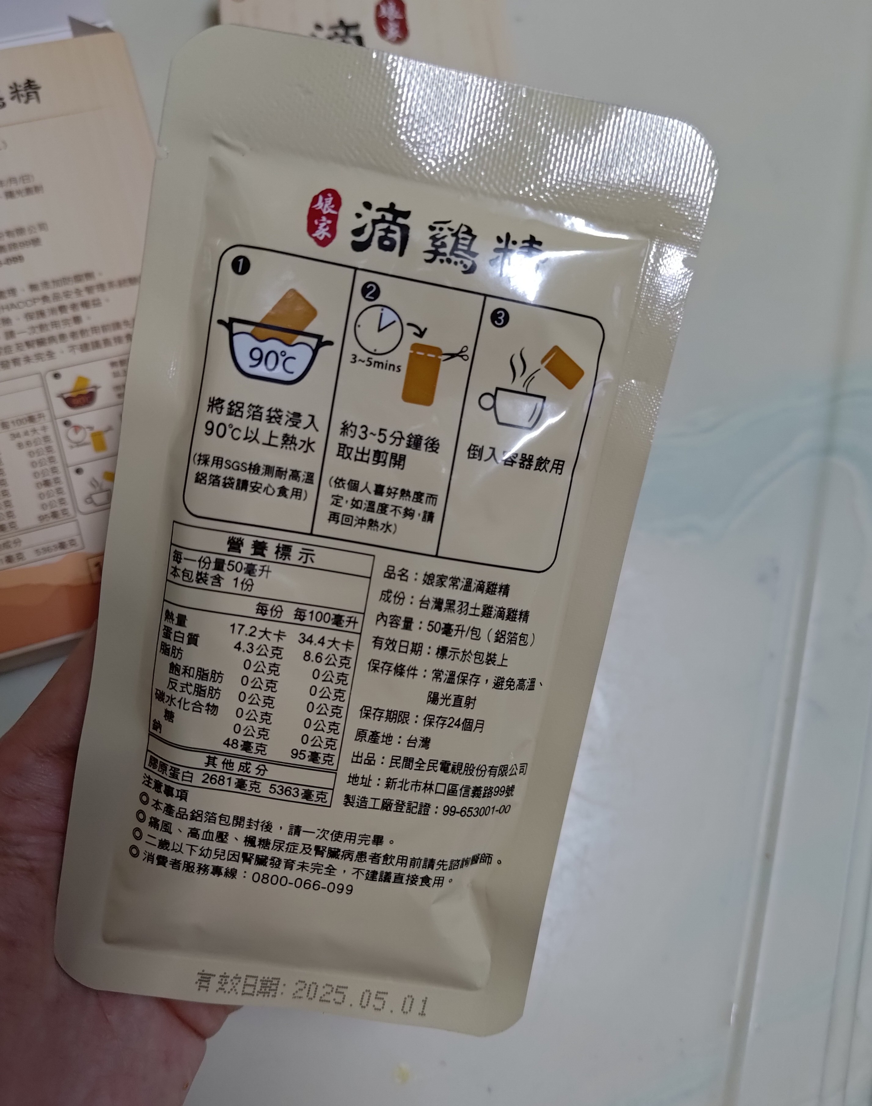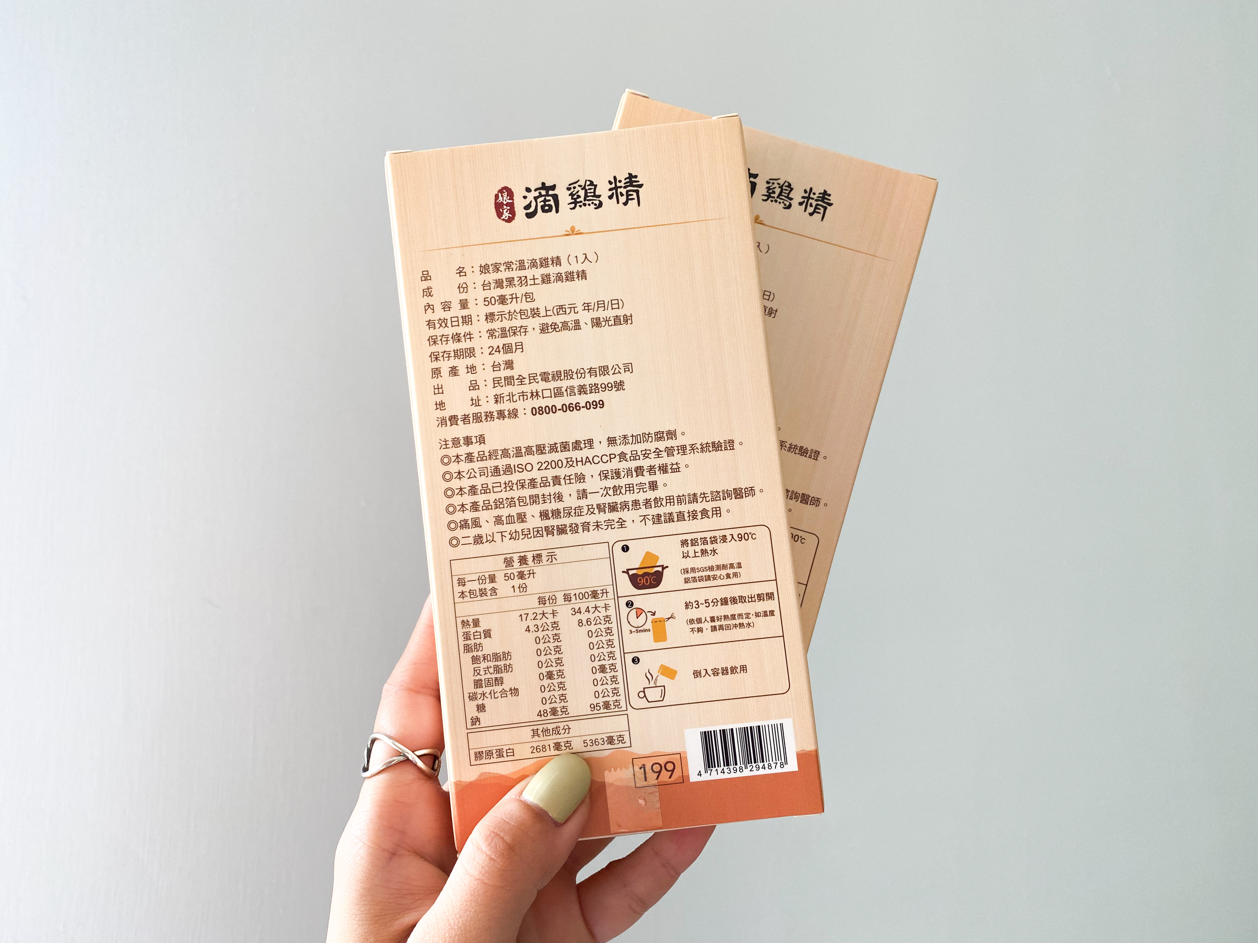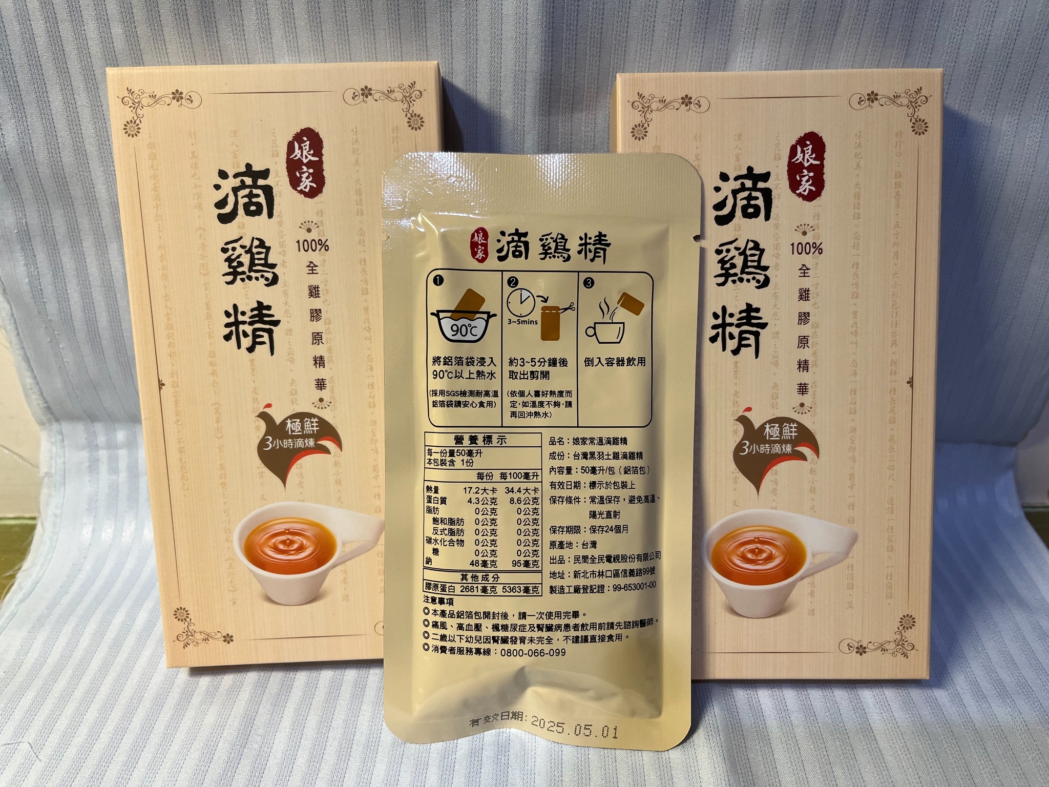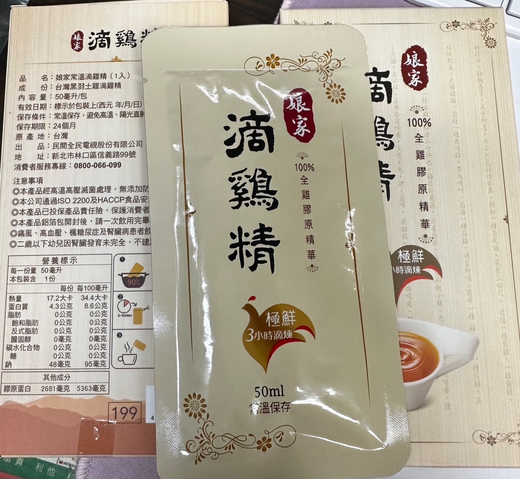 回列表 娘家常溫滴雞精 品質世界肯定 每一口都來自極鮮3小時滴煉 市價199元(免費申請) 所需等級 一般會員以上 所需學分 50 體驗份數 100 關注人數 1457 申請人數 358 申請截止 品牌業者:娘家 負責廠商 民間全民電視股份有限公司 廠商地址 新北市林口區信義路99號 產地 台灣 試用產品規格 2盒(一盒1入) 食品業者登錄字號 E-196975768-00000-9 投保產品責任險字號 0525字第22AML0002428號 心得分享 商品介紹 商品成分 使用方法 注意事項 體驗名單 9.2 娘家常溫滴雞精 香醇濃厚 9.2 好喝無腥味 9.2 滿滿膠原蛋白 8.9 元氣滋補 9.1 推薦送禮/自用保養 9.1 建議推薦 9.1 心得分享 96則 Jessica Su 鑽石達人 40歲 雲林縣 2023/08/18 對娘家常溫滴雞精留下評價 9 感謝食力食驗室這次提供寶貴的機會體驗"娘家常溫滴雞精"產品主打 品質世界肯定 每一口都來自極鮮3小時滴煉推薦"娘家常溫滴雞精"的理由1.娘家這款滴雞精有別於一般市售滴雞精需要冷凍保存,常溫滴雞精可以隨身攜帶,出外旅行帶著喝也很方便~2.直接喝味道滿濃厚,但沒有腥味希望改善的地方:1.定價一小包199,價格有點高。2.一小包用一個紙盒裝,有點過度包裝,希望能考慮減碳環保減少過度包裝感謝食力食驗室提供這次體驗機會,希望下次還能有機會體驗其他產品~~ 陳卡比 金食達人 38歲 臺南市 2023/08/18 對娘家常溫滴雞精留下評價 8 最近因為懷孕的關係開始喝起了滴雞精感謝這次能有機會體驗到不同品牌的滴雞精娘家這款滴雞精很方便的是可以常溫保存,攜帶很方便口味上是純雞精,沒有添加中藥材, 是很純粹的味道喝起來比我之前喝的品牌還要濃郁,雞味比較重不過如果是怕味道太重的人 可能會不太習慣但還是在可接受的範圍內包裝簡潔,有單入的紙盒包裝要送禮時也蠻方便的 張芷瑋 金食達人 40歲 新北市 2023/08/18 對娘家常溫滴雞精留下評價 9 這是我第一次嘗試喝滴雞精,以前不敢喝還以為會有雞腥味,不過這次體驗,讓我對滴雞精印象超好的!平常放常溫就好,不需要冷藏,想喝的時候放進90度的熱水裡隔水加熱,就能吃到香噴噴的滴雞精了,撕開鋁箔袋的瞬間,濃郁的香味撲鼻而來,滴雞精舀起來顏色金黃金黃,看起來就很美味,娘家滴雞精是用黑羽土雞,它的營養價值相當高的因為不加任何一滴水,喝下去味道相當濃郁,很溫暖順口,每一口都能感受到它的純粹,對我這種超忙碌的人來說,真的是很方便補充營養的方式! Lily Liao 鑽石達人 34歲 新北市 2023/08/20 對娘家常溫滴雞精留下評價 7 感謝食力給予機會試吃娘家常溫滴雞精。此款滴雞精標榜極鮮3小時滴煉,含有100%全雞膠原精華,先前我只喝過冷凍保存的滴雞精,很好奇常溫的滴雞精是什麼味道。食用方法是浸入90℃以上的水3~5分鐘後取出剪開倒入容器,我得老實說90℃讓我滿困擾的,我知道水滾是100℃但我不知道該怎麼在沒有溫度計下的方式測量90℃,所以我就是等水滾,關火後就把滴雞精放進去計時5分鐘。剪開倒入容器後先聞到一個非常明顯的雞精味,這味道讓我有點害怕,以前喝瓶裝雞精都得捏著鼻子皺著臉才有辦法喝下去,一聞到就跟我過去的經驗做連結,先有了比較負面的印象,不過實際上喝下肚後,並沒有讓我害怕的雞精味,感覺上比較像雞湯,然而香氣沒有很足,就是一款還不錯的常溫滴雞精。雖然沒有比我之前試吃的冷凍滴雞精好喝,但常溫保存方便許多,這一點就略勝一籌,價格上也更實惠,我覺得是個很好的選擇。 AK Stein 鑽石達人 44歲 花蓮縣 2023/08/21 對娘家常溫滴雞精留下評價 9 包裝收納得很好,每包滴雞精都密封得很紮實平整,娘家滴雞精是目前喝完後覺得喝過的滴雞精中接受度最高的。娘家滴精雞精的份量介於中等,成分夠,適量的補充。製造日期直接壓印在每一包包裝上,而不是只有統一印於外盒,這樣每一包都有清楚效時間,設計很貼心。娘家滴雞精採用全程封存全雞的原汁精華,利用獨特的蒸氣不回流技術,每一隻三公斤的黑羽土雞只能滴出大概2包左右的娘家滴雞精,油脂分離零脂肪,滴滴甘醇不油膩。 irene yang 金食達人 32歲 新北市 2023/08/22 對娘家常溫滴雞精留下評價 10 很榮幸抽到試喝"娘家常溫滴雞精",真的讓我超驚艷的!首先,它的味道鮮美,帶有濃濃的雞香卻不人工也沒加任何一滴水,喝了一包還覺得不後夠。不同以往古早口味不大眾的雞精,喝起來超順口,一點都沒有腥味或是難嚥的感覺,就像喝了一碗超濃縮卻營養十足的雞湯。最方便的是,它簡單隔水加熱,隨時隨地都能喝到暖胃的雞湯,真的太方便了!對於忙碌的上班族,終於找到可以隨時補充能量的好拍擋。 陳昭安 鑽石達人 34歲 雲林縣 2023/08/23 對娘家常溫滴雞精留下評價 10 很開心能參與這次食驗室-「娘家常溫滴雞精」的試吃體驗,*外包裝:有明顯產品名稱、熱量、商品成分、保存期限以及外盒有說明食用方式。*商品成分內容物為: 台灣黑羽土雞滴雞精。*食用方式【隔水加熱】1. 將鋁箔包直接浸入90度c以上熱水。2. 約3-5分鐘後取出。3. 剪開鋁箔包,倒入容器內飲用。*試吃心得: 1.包裝隔水加熱預熱快。2.食用方式有圖解清楚明瞭。3.味道不腥不膩。4.隨身包好攜帶。5.很推薦大家食用。 涂秀英 鑽石達人 37歲 臺北市 2023/08/24 對娘家常溫滴雞精留下評價 10 市面上琳瑯滿目的雞精品牌,今天我要慎重推薦娘家100%全雞膠原精華滴雞精.拆開來就可以聞到淡淡的香氣,一般來說雞湯冷了會浮一