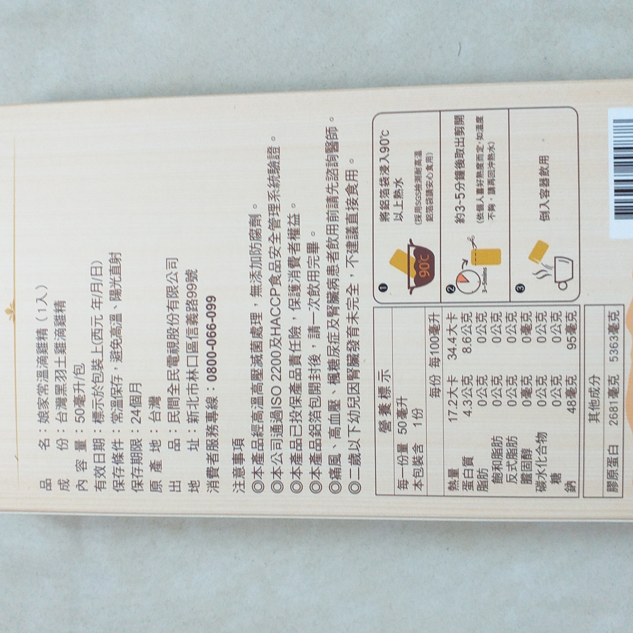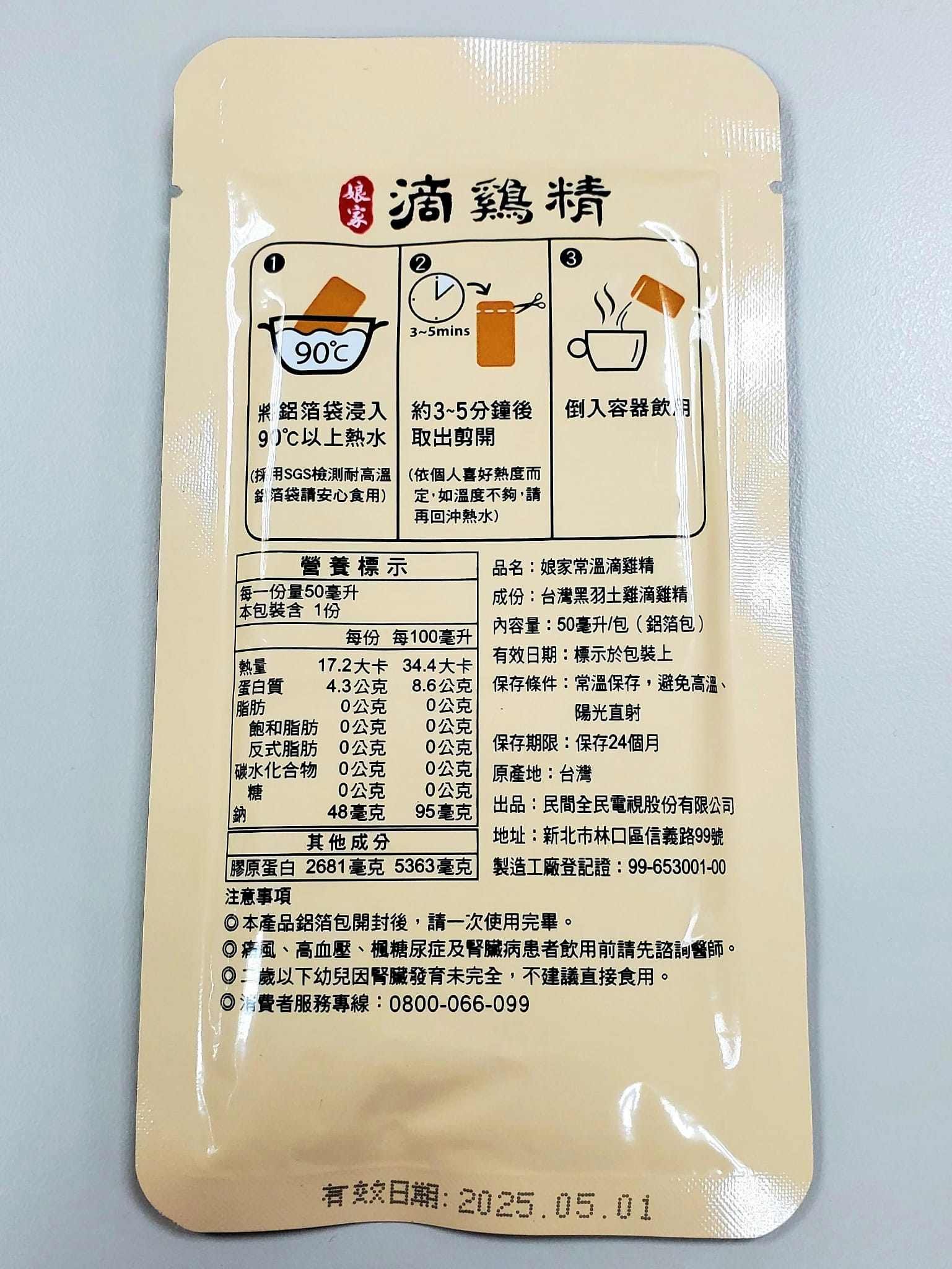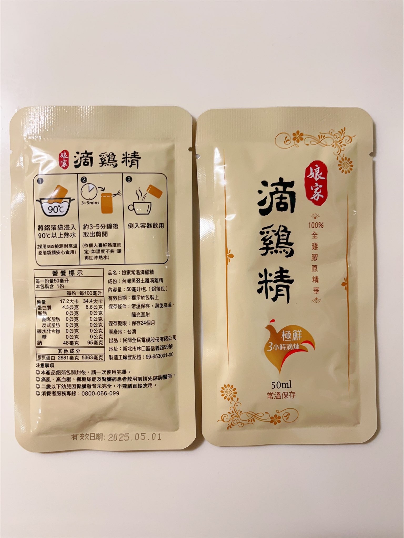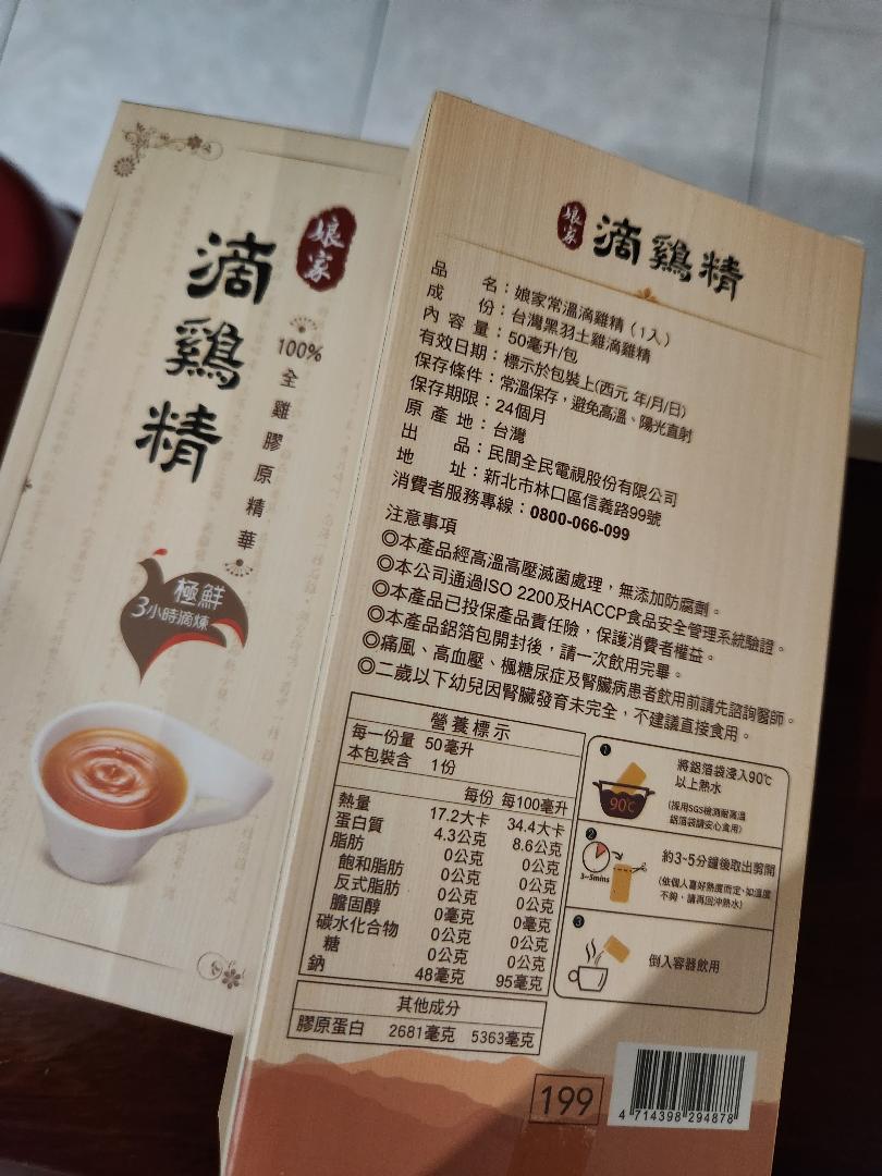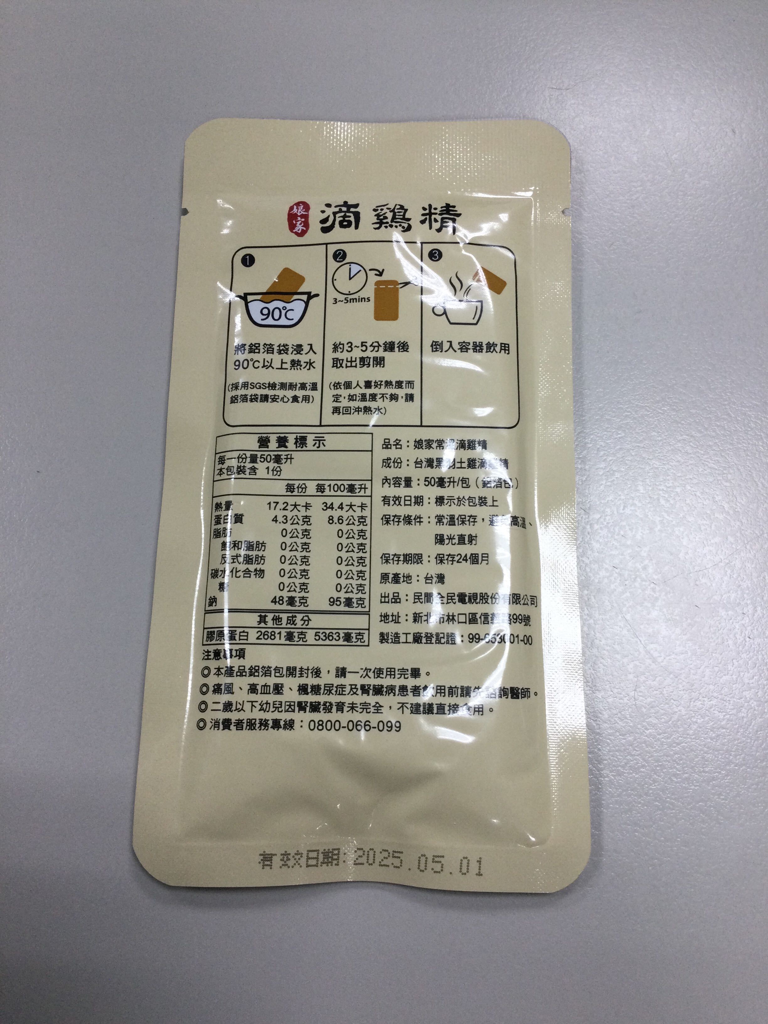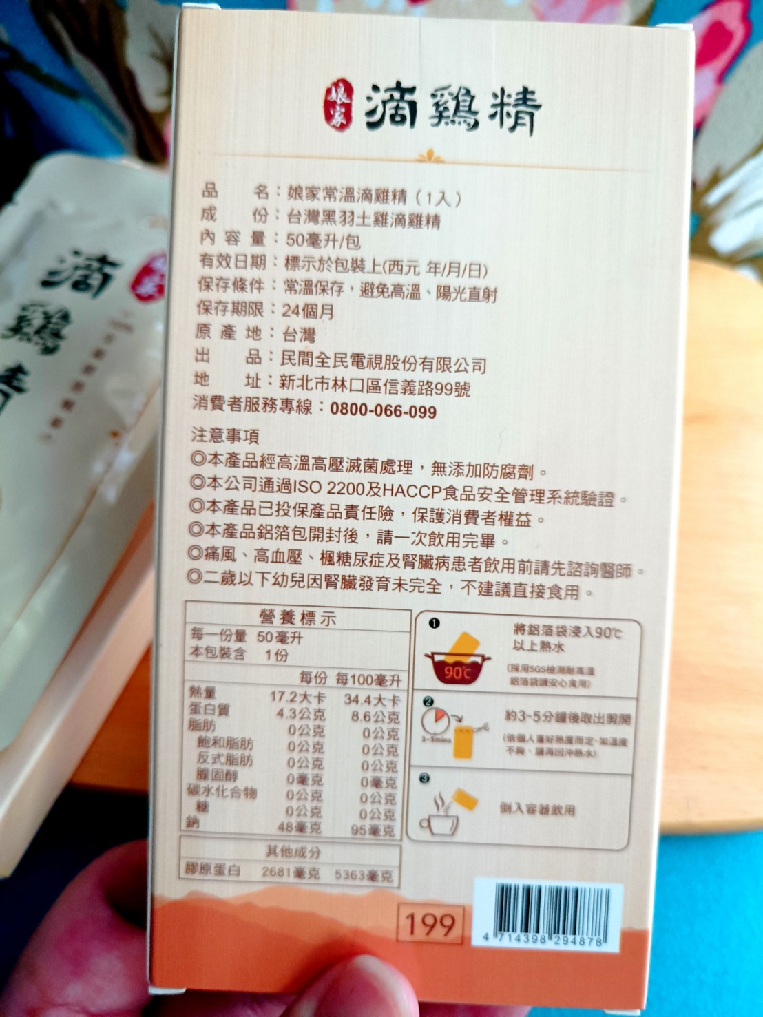 回列表 娘家常溫滴雞精 品質世界肯定 每一口都來自極鮮3小時滴煉 市價199元(免費申請) 所需等級 一般會員以上 所需學分 50 體驗份數 100 關注人數 1457 申請人數 358 申請截止 品牌業者:娘家 負責廠商 民間全民電視股份有限公司 廠商地址 新北市林口區信義路99號 產地 台灣 試用產品規格 2盒(一盒1入) 食品業者登錄字號 E-196975768-00000-9 投保產品責任險字號 0525字第22AML0002428號 心得分享 商品介紹 商品成分 使用方法 注意事項 體驗名單 9.2 娘家常溫滴雞精 香醇濃厚 9.2 好喝無腥味 9.2 滿滿膠原蛋白 8.9 元氣滋補 9.1 推薦送禮/自用保養 9.1 建議推薦 9.1 心得分享 96則 Jessica Su 鑽石達人 40歲 雲林縣 2023/08/18 對娘家常溫滴雞精留下評價 9 感謝食力食驗室這次提供寶貴的機會體驗"娘家常溫滴雞精"產品主打 品質世界肯定 每一口都來自極鮮3小時滴煉推薦"娘家常溫滴雞精"的理由1.娘家這款滴雞精有別於一般市售滴雞精需要冷凍保存,常溫滴雞精可以隨身攜帶,出外旅行帶著喝也很方便~2.直接喝味道滿濃厚,但沒有腥味希望改善的地方:1.定價一小包199,價格有點高。2.一小包用一個紙盒裝,有點過度包裝,希望能考慮減碳環保減少過度包裝感謝食力食驗室提供這次體驗機會,希望下次還能有機會體驗其他產品~~ 陳卡比 金食達人 38歲 臺南市 2023/08/18 對娘家常溫滴雞精留下評價 8 最近因為懷孕的關係開始喝起了滴雞精感謝這次能有機會體驗到不同品牌的滴雞精娘家這款滴雞精很方便的是可以常溫保存,攜帶很方便口味上是純雞精,沒有添加中藥材, 是很純粹的味道喝起來比我之前喝的品牌還要濃郁,雞味比較重不過如果是怕味道太重的人 可能會不太習慣但還是在可接受的範圍內包裝簡潔,有單入的紙盒包裝要送禮時也蠻方便的 張芷瑋 金食達人 40歲 新北市 2023/08/18 對娘家常溫滴雞精留下評價 9 這是我第一次嘗試喝滴雞精,以前不敢喝還以為會有雞腥味,不過這次體驗,讓我對滴雞精印象超好的!平常放常溫就好,不需要冷藏,想喝的時候放進90度的熱水裡隔水加熱,就能吃到香噴噴的滴雞精了,撕開鋁箔袋的瞬間,濃郁的香味撲鼻而來,滴雞精舀起來顏色金黃金黃,看起來就很美味,娘家滴雞精是用黑羽土雞,它的營養價值相當高的因為不加任何一滴水,喝下去味道相當濃郁,很溫暖順口,每一口都能感受到它的純粹,對我這種超忙碌的人來說,真的是很方便補充營養的方式! Lily Liao 鑽石達人 34歲 新北市 2023/08/20 對娘家常溫滴雞精留下評價 7 感謝食力給予機會試吃娘家常溫滴雞精。此款滴雞精標榜極鮮3小時滴煉,含有100%全雞膠原精華,先前我只喝過冷凍保存的滴雞精,很好奇常溫的滴雞精是什麼味道。食用方法是浸入90℃以上的水3~5分鐘後取出剪開倒入容器,我得老實說90℃讓我滿困擾的,我知道水滾是100℃但我不知道該怎麼在沒有溫度計下的方式測量90℃,所以我就是等水滾,關火後就把滴雞精放進去計時5分鐘。剪開倒入容器後先聞到一個非常明顯的雞精味,這味道讓我有點害怕,以前喝瓶裝雞精都得捏著鼻子皺著臉才有辦法喝下去,一聞到就跟我過去的經驗做連結,先有了比較負面的印象,不過實際上喝下肚後,並沒有讓我害怕的雞精味,感覺上比較像雞湯,然而香氣沒有很足,就是一款還不錯的常溫滴雞精。雖然沒有比我之前試吃的冷凍滴雞精好喝,但常溫保存方便許多,這一點就略勝一籌,價格上也更實惠,我覺得是個很好的選擇。 AK Stein 鑽石達人 44歲 花蓮縣 2023/08/21 對娘家常溫滴雞精留下評價 9 包裝收納得很好,每包滴雞精都密封得很紮實平整,娘家滴雞精是目前喝完後覺得喝過的滴雞精中接受度最高的。娘家滴精雞精的份量介於中等,成分夠,適量的補充。製造日期直接壓印在每一包包裝上,而不是只有統一印於外盒,這樣每一包都有清楚效時間,設計很貼心。娘家滴雞精採用全程封存全雞的原汁精華,利用獨特的蒸氣不回流技術,每一隻三公斤的黑羽土雞只能滴出大概2包左右的娘家滴雞精,油脂分離零脂肪,滴滴甘醇不油膩。 irene yang 金食達人 32歲 新北市 2023/08/22 對娘家常溫滴雞精留下評價 10 很榮幸抽到試喝"娘家常溫滴雞精",真的讓我超驚艷的!首先,它的味道鮮美,帶有濃濃的雞香卻不人工也沒加任何一滴水,喝了一包還覺得不後夠。不同以往古早口味不大眾的雞精,喝起來超順口,一點都沒有腥味或是難嚥的感覺,就像喝了一碗超濃縮卻營養十足的雞湯。最方便的是,它簡單隔水加熱,隨時隨地都能喝到暖胃的雞湯,真的太方便了!對於忙碌的上班族,終於找到可以隨時補充能量的好拍擋。 陳昭安 鑽石達人 34歲 雲林縣 2023/08/23 對娘家常溫滴雞精留下評價 10 很開心能參與這次食驗室-「娘家常溫滴雞精」的試吃體驗,*外包裝:有明顯產品名稱、熱量、商品成分、保存期限以及外盒有說明食用方式。*商品成分內容物為: 台灣黑羽土雞滴雞精。*食用方式【隔水加熱】1. 將鋁箔包直接浸入90度c以上熱水。2. 約3-5分鐘後取出。3. 剪開鋁箔包,倒入容器內飲用。*試吃心得: 1.包裝隔水加熱預熱快。2.食用方式有圖解清楚明瞭。3.味道不腥不膩。4.隨身包好攜帶。5.很推薦大家食用。 涂秀英 鑽石達人 37歲 臺北市 2023/08/24 對娘家常溫滴雞精留下評價 10 市面上琳瑯滿目的雞精品牌,今天我要慎重推薦娘家100%全雞膠原精華滴雞精.拆開來就可以聞到淡淡的香氣,一般來說雞湯冷了會浮一