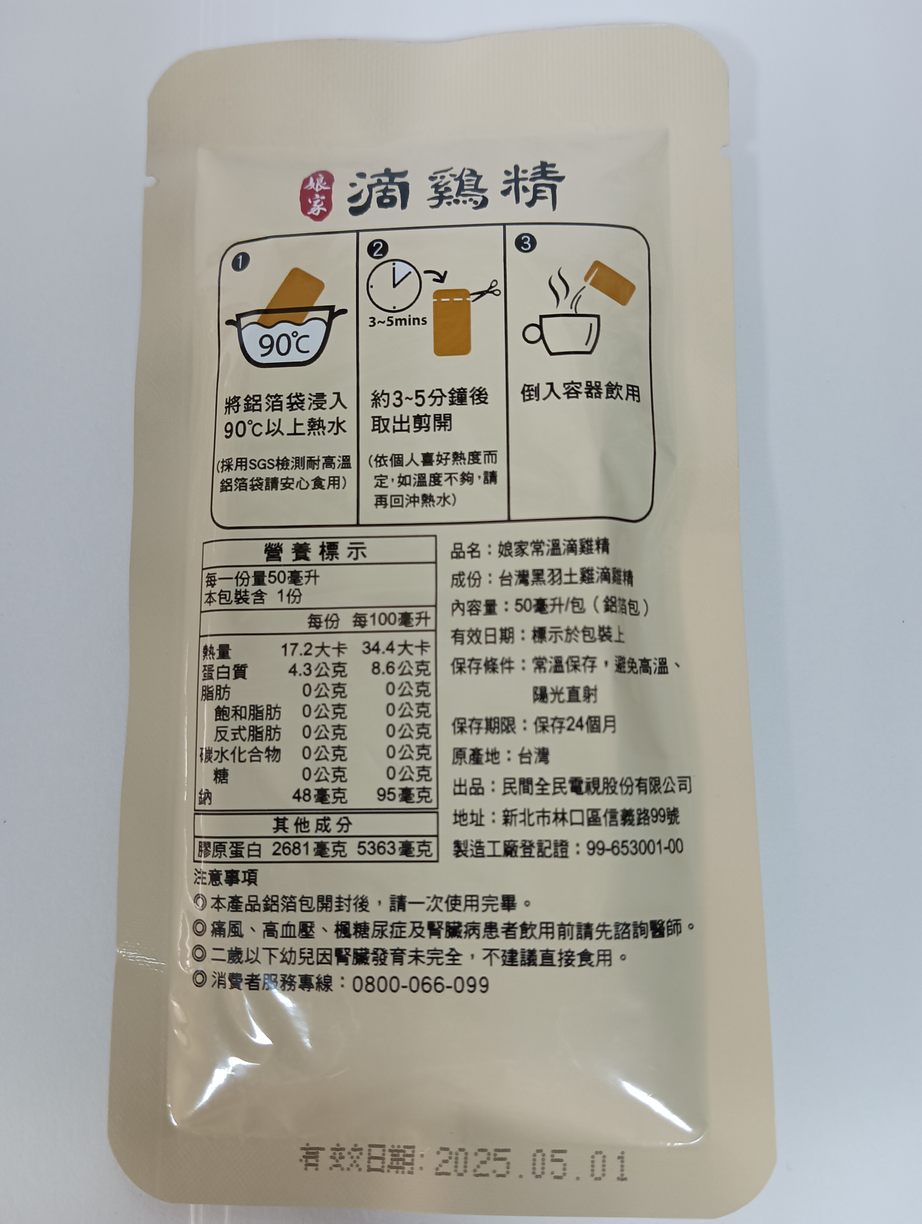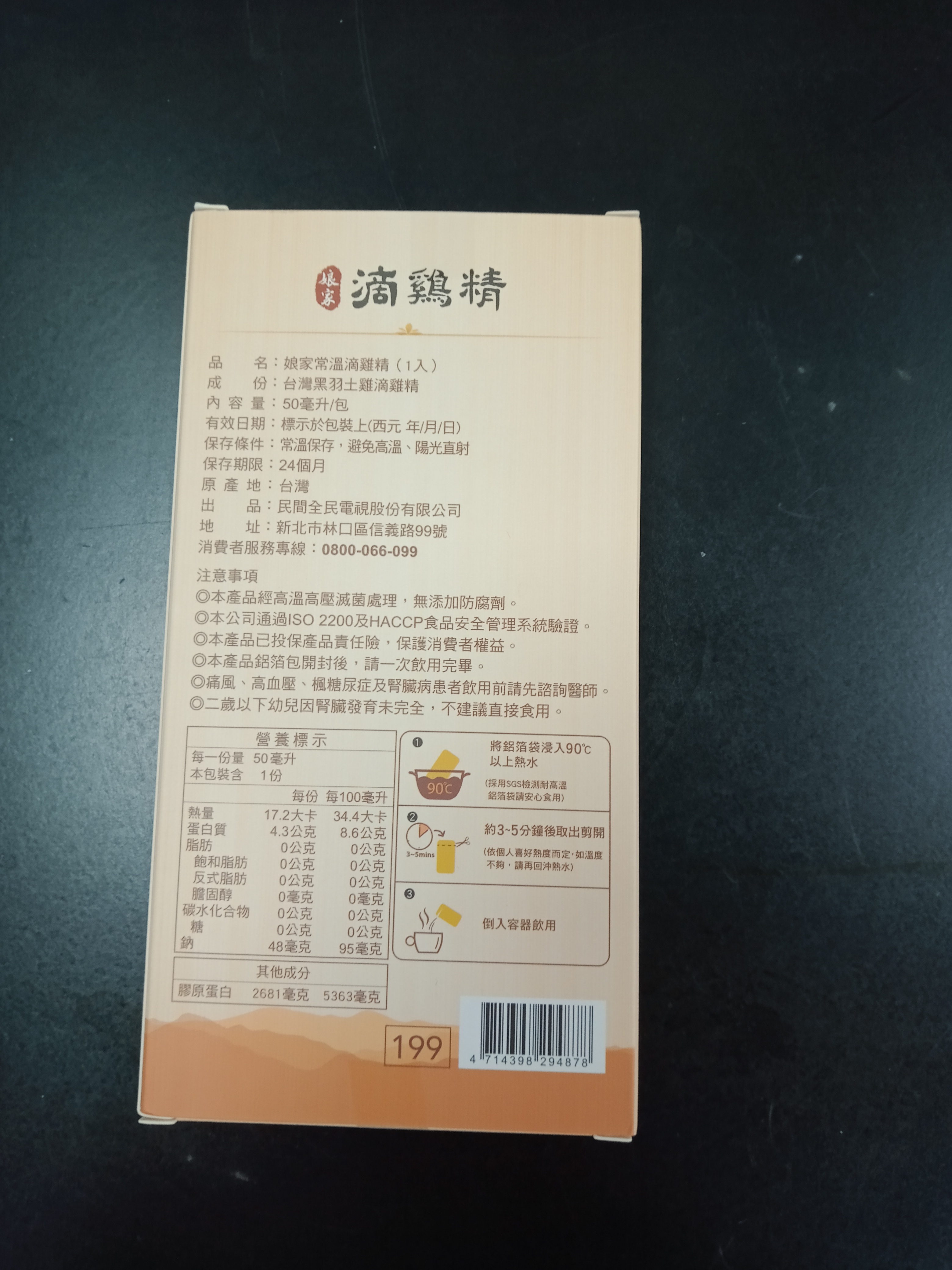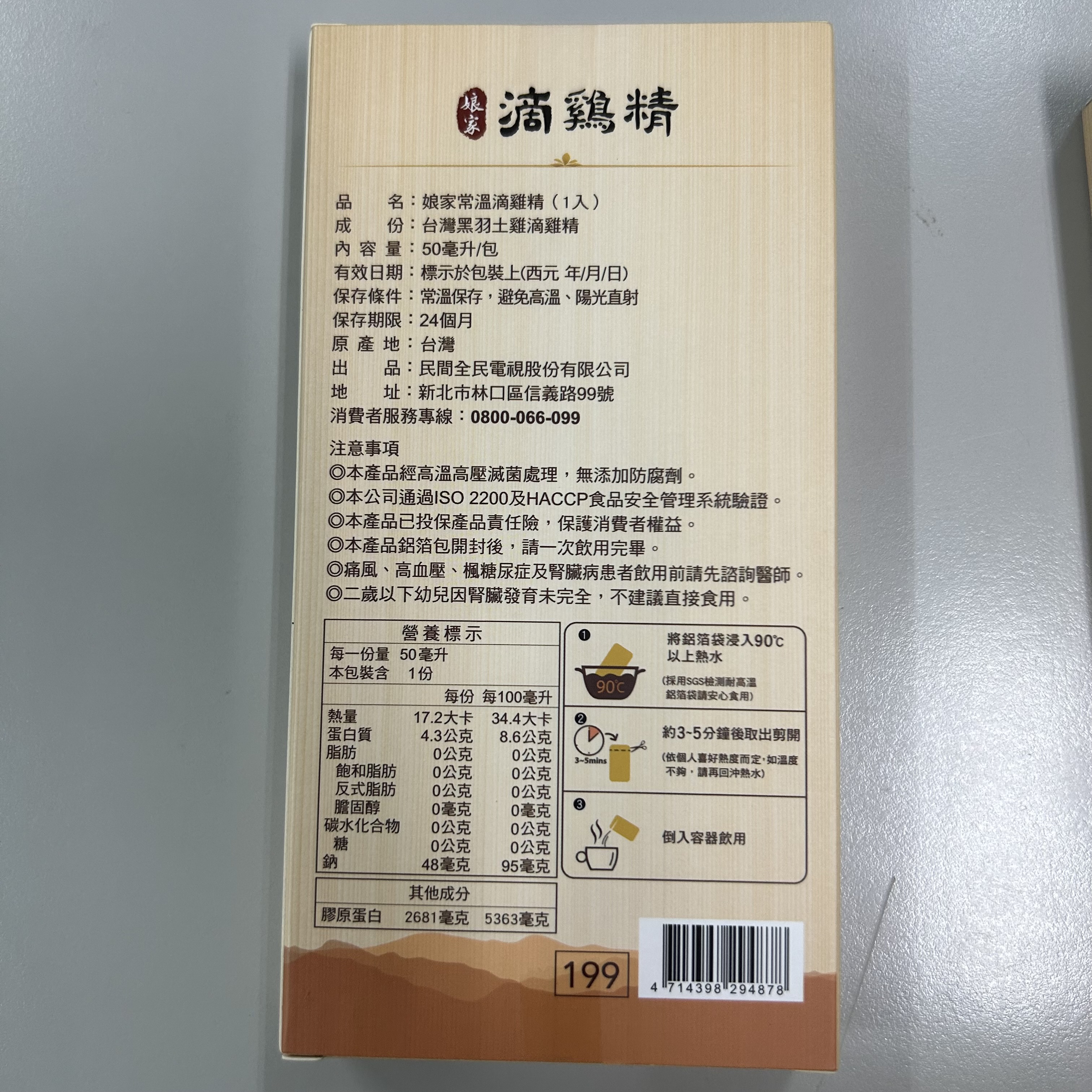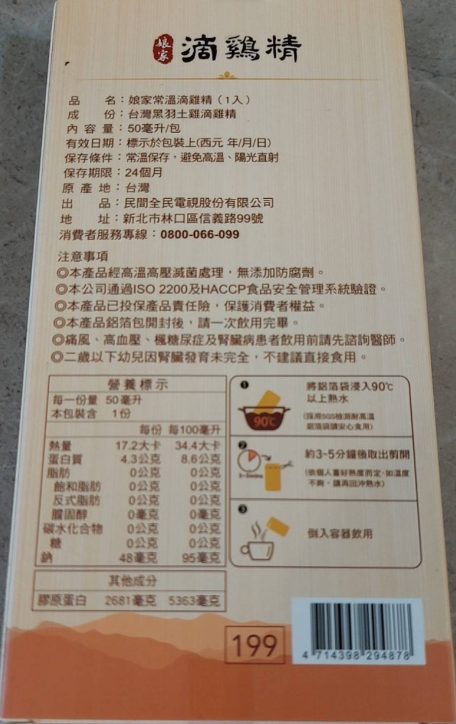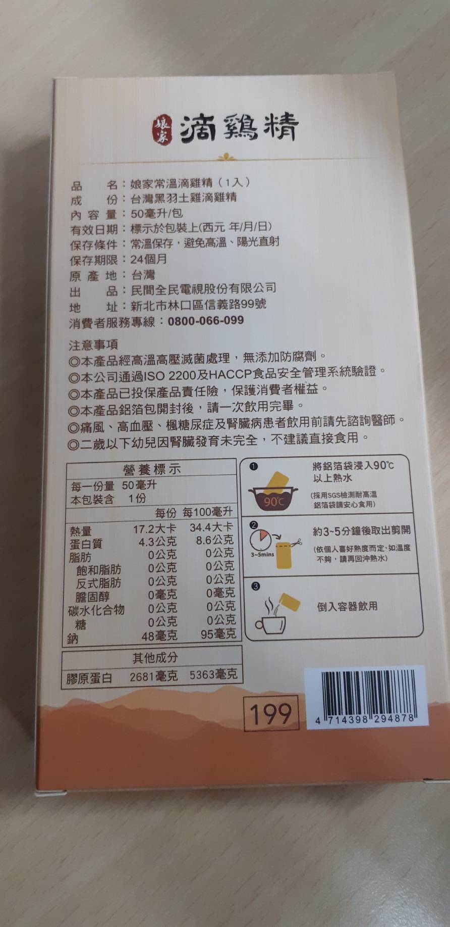 回列表 娘家常溫滴雞精 品質世界肯定 每一口都來自極鮮3小時滴煉 市價199元(免費申請) 所需等級 一般會員以上 所需學分 50 體驗份數 100 關注人數 1457 申請人數 358 申請截止 品牌業者:娘家 負責廠商 民間全民電視股份有限公司 廠商地址 新北市林口區信義路99號 產地 台灣 試用產品規格 2盒(一盒1入) 食品業者登錄字號 E-196975768-00000-9 投保產品責任險字號 0525字第22AML0002428號 心得分享 商品介紹 商品成分 使用方法 注意事項 體驗名單 9.2 娘家常溫滴雞精 香醇濃厚 9.2 好喝無腥味 9.2 滿滿膠原蛋白 8.9 元氣滋補 9.1 推薦送禮/自用保養 9.1 建議推薦 9.1 心得分享 96則 Jessica Su 鑽石達人 40歲 雲林縣 2023/08/18 對娘家常溫滴雞精留下評價 9 感謝食力食驗室這次提供寶貴的機會體驗"娘家常溫滴雞精"產品主打 品質世界肯定 每一口都來自極鮮3小時滴煉推薦"娘家常溫滴雞精"的理由1.娘家這款滴雞精有別於一般市售滴雞精需要冷凍保存,常溫滴雞精可以隨身攜帶,出外旅行帶著喝也很方便~2.直接喝味道滿濃厚,但沒有腥味希望改善的地方:1.定價一小包199,價格有點高。2.一小包用一個紙盒裝,有點過度包裝,希望能考慮減碳環保減少過度包裝感謝食力食驗室提供這次體驗機會,希望下次還能有機會體驗其他產品~~ 陳卡比 金食達人 38歲 臺南市 2023/08/18 對娘家常溫滴雞精留下評價 8 最近因為懷孕的關係開始喝起了滴雞精感謝這次能有機會體驗到不同品牌的滴雞精娘家這款滴雞精很方便的是可以常溫保存,攜帶很方便口味上是純雞精,沒有添加中藥材, 是很純粹的味道喝起來比我之前喝的品牌還要濃郁,雞味比較重不過如果是怕味道太重的人 可能會不太習慣但還是在可接受的範圍內包裝簡潔,有單入的紙盒包裝要送禮時也蠻方便的 張芷瑋 金食達人 40歲 新北市 2023/08/18 對娘家常溫滴雞精留下評價 9 這是我第一次嘗試喝滴雞精,以前不敢喝還以為會有雞腥味,不過這次體驗,讓我對滴雞精印象超好的!平常放常溫就好,不需要冷藏,想喝的時候放進90度的熱水裡隔水加熱,就能吃到香噴噴的滴雞精了,撕開鋁箔袋的瞬間,濃郁的香味撲鼻而來,滴雞精舀起來顏色金黃金黃,看起來就很美味,娘家滴雞精是用黑羽土雞,它的營養價值相當高的因為不加任何一滴水,喝下去味道相當濃郁,很溫暖順口,每一口都能感受到它的純粹,對我這種超忙碌的人來說,真的是很方便補充營養的方式! Lily Liao 鑽石達人 34歲 新北市 2023/08/20 對娘家常溫滴雞精留下評價 7 感謝食力給予機會試吃娘家常溫滴雞精。此款滴雞精標榜極鮮3小時滴煉,含有100%全雞膠原精華,先前我只喝過冷凍保存的滴雞精,很好奇常溫的滴雞精是什麼味道。食用方法是浸入90℃以上的水3~5分鐘後取出剪開倒入容器,我得老實說90℃讓我滿困擾的,我知道水滾是100℃但我不知道該怎麼在沒有溫度計下的方式測量90℃,所以我就是等水滾,關火後就把滴雞精放進去計時5分鐘。剪開倒入容器後先聞到一個非常明顯的雞精味,這味道讓我有點害怕,以前喝瓶裝雞精都得捏著鼻子皺著臉才有辦法喝下去,一聞到就跟我過去的經驗做連結,先有了比較負面的印象,不過實際上喝下肚後,並沒有讓我害怕的雞精味,感覺上比較像雞湯,然而香氣沒有很足,就是一款還不錯的常溫滴雞精。雖然沒有比我之前試吃的冷凍滴雞精好喝,但常溫保存方便許多,這一點就略勝一籌,價格上也更實惠,我覺得是個很好的選擇。 AK Stein 鑽石達人 44歲 花蓮縣 2023/08/21 對娘家常溫滴雞精留下評價 9 包裝收納得很好,每包滴雞精都密封得很紮實平整,娘家滴雞精是目前喝完後覺得喝過的滴雞精中接受度最高的。娘家滴精雞精的份量介於中等,成分夠,適量的補充。製造日期直接壓印在每一包包裝上,而不是只有統一印於外盒,這樣每一包都有清楚效時間,設計很貼心。娘家滴雞精採用全程封存全雞的原汁精華,利用獨特的蒸氣不回流技術,每一隻三公斤的黑羽土雞只能滴出大概2包左右的娘家滴雞精,油脂分離零脂肪,滴滴甘醇不油膩。 irene yang 金食達人 32歲 新北市 2023/08/22 對娘家常溫滴雞精留下評價 10 很榮幸抽到試喝"娘家常溫滴雞精",真的讓我超驚艷的!首先,它的味道鮮美,帶有濃濃的雞香卻不人工也沒加任何一滴水,喝了一包還覺得不後夠。不同以往古早口味不大眾的雞精,喝起來超順口,一點都沒有腥味或是難嚥的感覺,就像喝了一碗超濃縮卻營養十足的雞湯。最方便的是,它簡單隔水加熱,隨時隨地都能喝到暖胃的雞湯,真的太方便了!對於忙碌的上班族,終於找到可以隨時補充能量的好拍擋。 陳昭安 鑽石達人 34歲 雲林縣 2023/08/23 對娘家常溫滴雞精留下評價 10 很開心能參與這次食驗室-「娘家常溫滴雞精」的試吃體驗,*外包裝:有明顯產品名稱、熱量、商品成分、保存期限以及外盒有說明食用方式。*商品成分內容物為: 台灣黑羽土雞滴雞精。*食用方式【隔水加熱】1. 將鋁箔包直接浸入90度c以上熱水。2. 約3-5分鐘後取出。3. 剪開鋁箔包,倒入容器內飲用。*試吃心得: 1.包裝隔水加熱預熱快。2.食用方式有圖解清楚明瞭。3.味道不腥不膩。4.隨身包好攜帶。5.很推薦大家食用。 涂秀英 鑽石達人 37歲 臺北市 2023/08/24 對娘家常溫滴雞精留下評價 10 市面上琳瑯滿目的雞精品牌,今天我要慎重推薦娘家100%全雞膠原精華滴雞精.拆開來就可以聞到淡淡的香氣,一般來說雞湯冷了會浮一