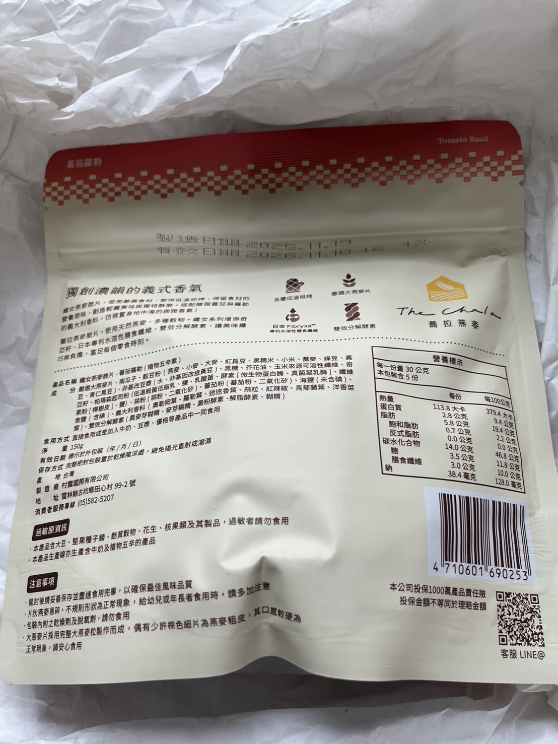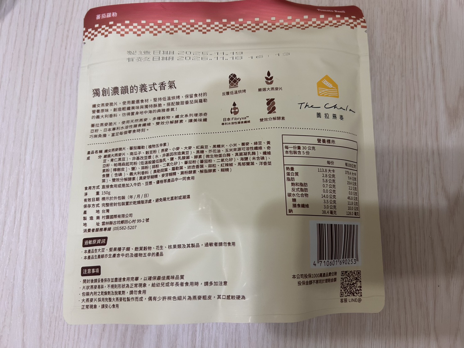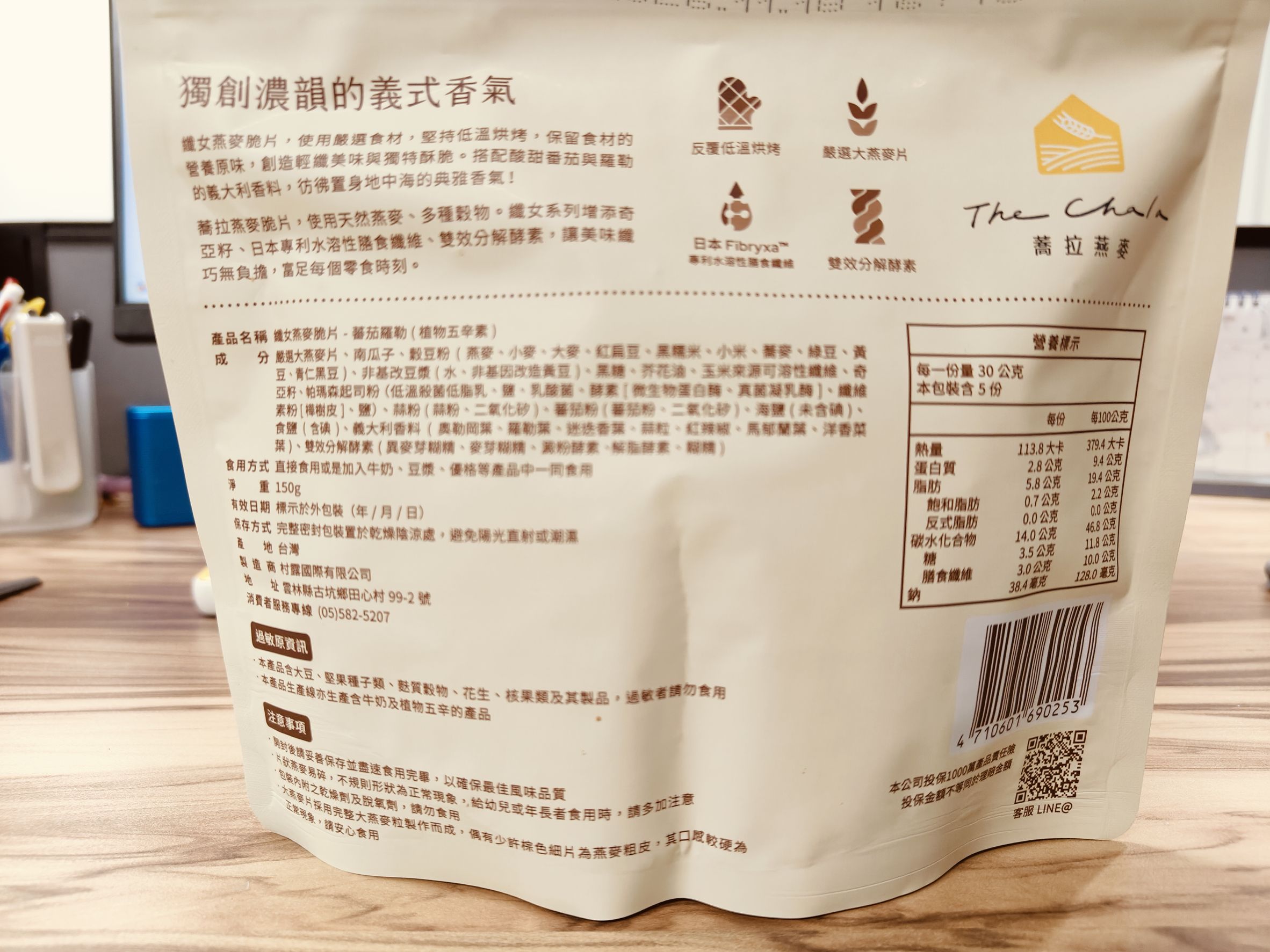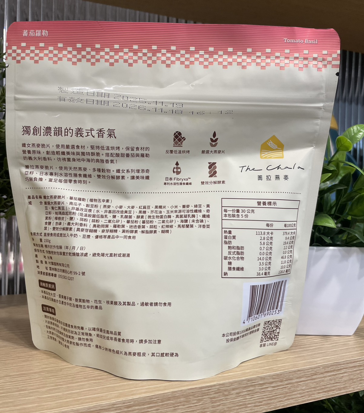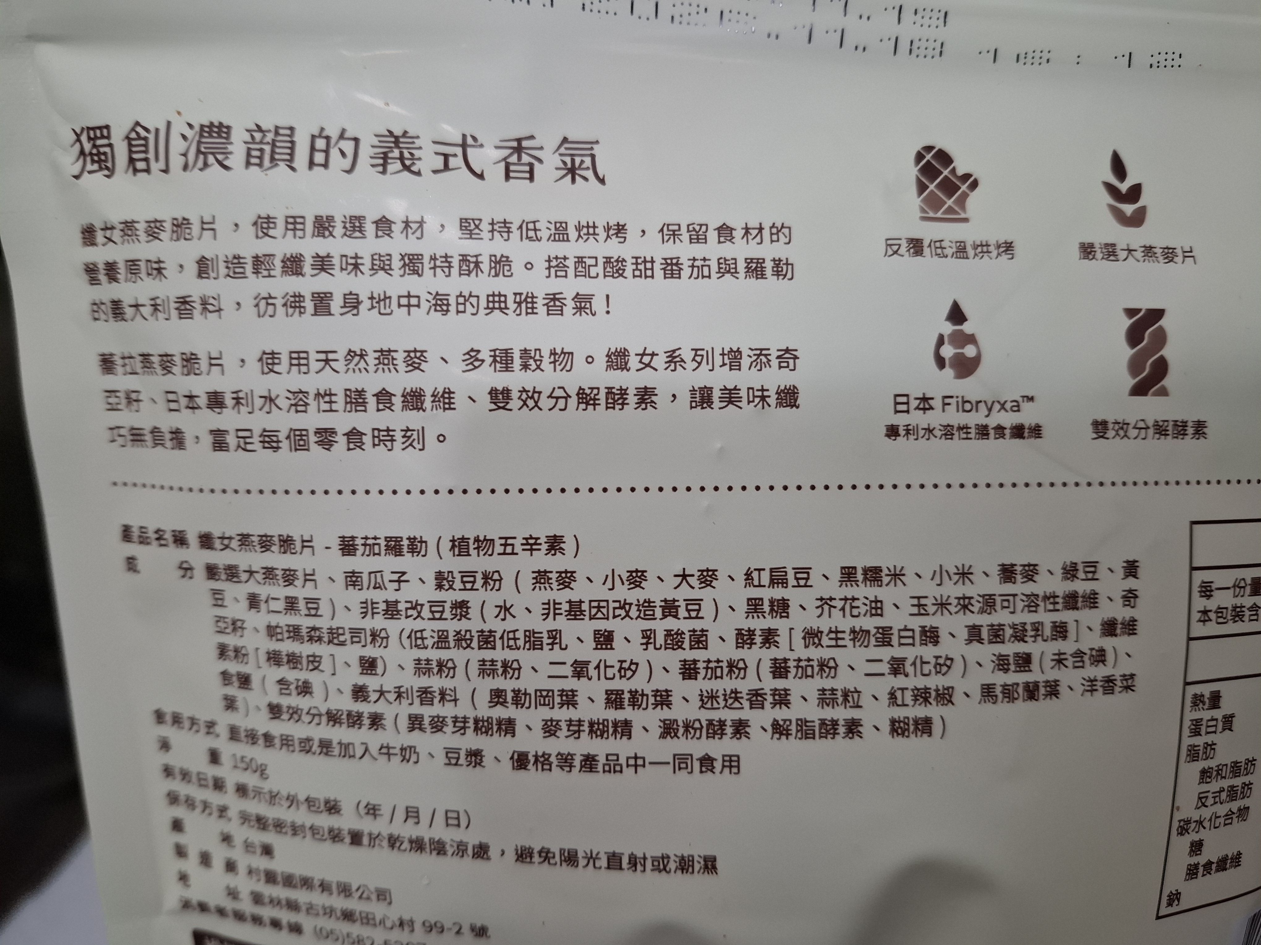 嚴選大燕麥片、南瓜子、穀豆粉(燕麥、小麥、大麥、紅扁豆、黑糯米、小米、蕎麥、綠豆、黃豆、青仁黑豆)、非基改豆漿(水、非基因改造黃豆)、黑糖、芥花油、玉米來源可溶性纖維、奇亞籽、帕瑪森起司粉(低溫殺菌低脂乳、鹽、乳酸菌、酵素[微生物蛋白酶、真菌凝乳酶]、纖維素粉[樺樹皮]、鹽)、蒜粉(蒜粉、二氧化矽)、蕃茄粉(蕃茄粉、二氧化矽)、海鹽(未含碘)、食鹽(含碘)、義大利香料(奧勒岡葉、羅勒葉、迷迭香葉、蒜粒、紅辣椒、馬郁蘭葉、洋香菜葉)、雙效分解酵素(異麥芽糊精、麥芽糊精、澱粉酵素、 解脂酵素、糊精)