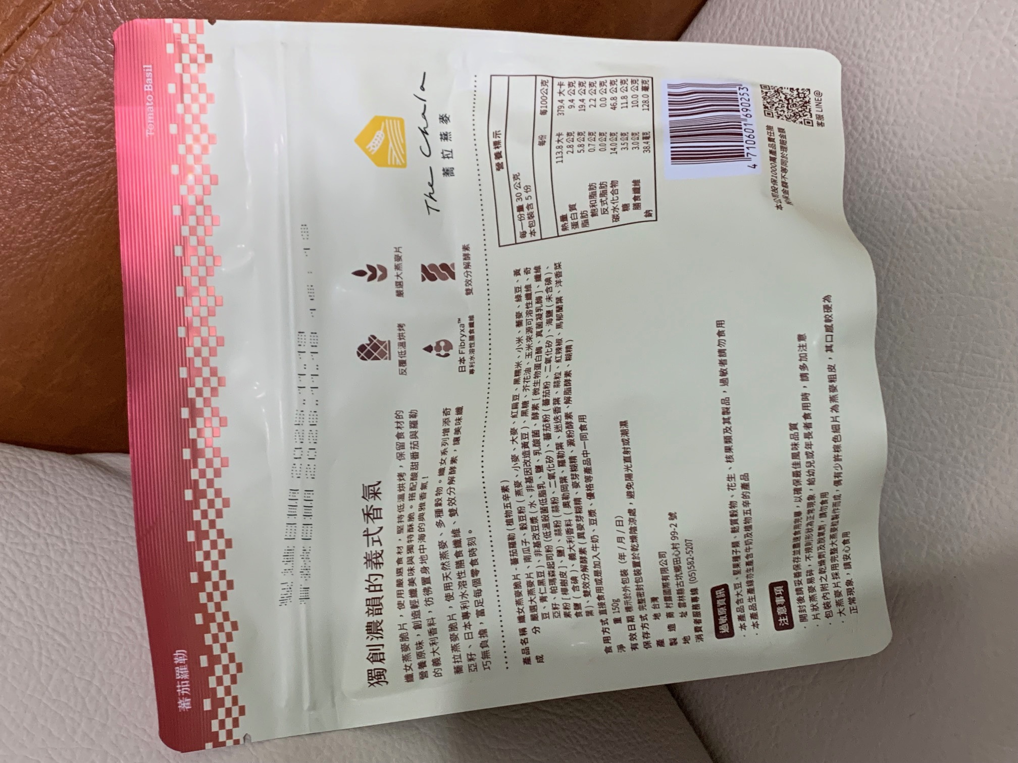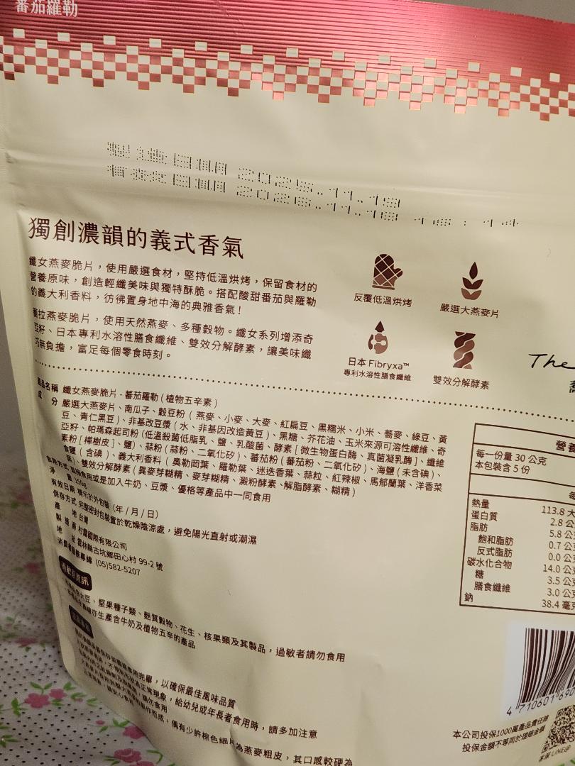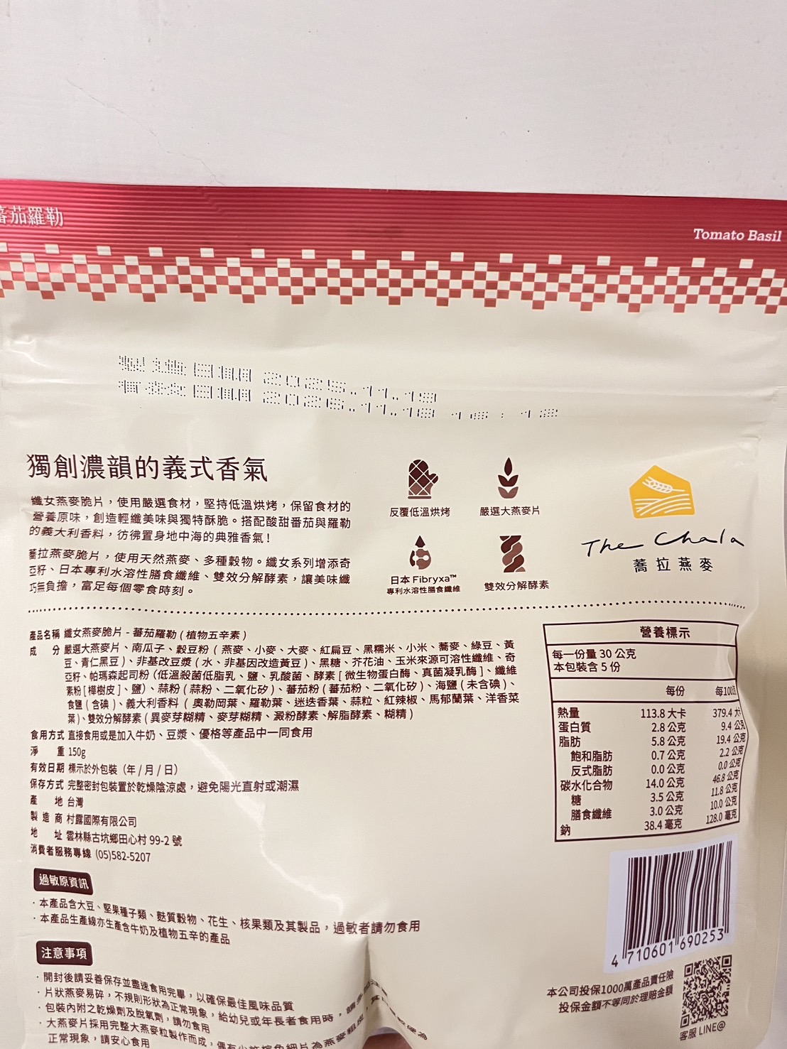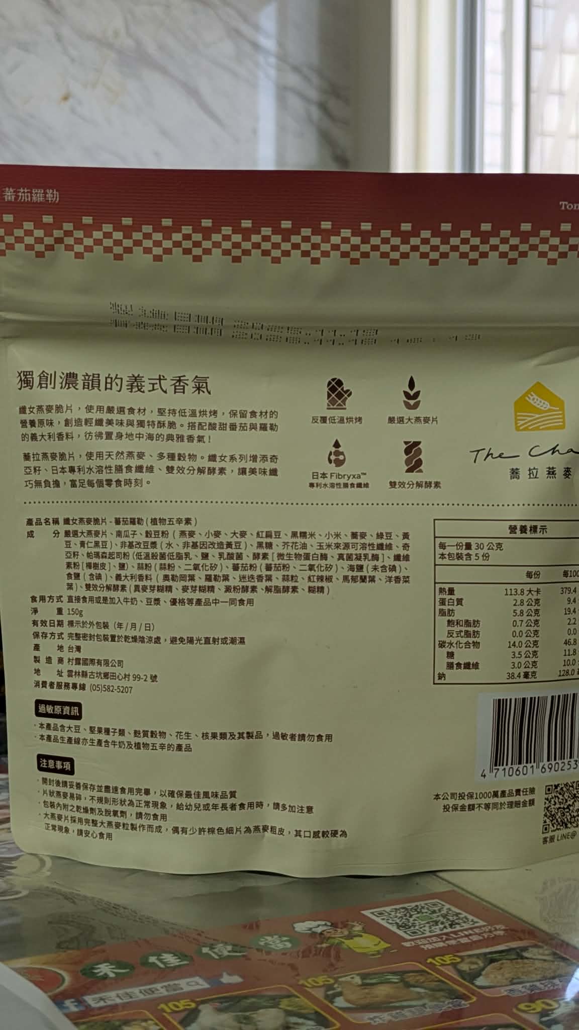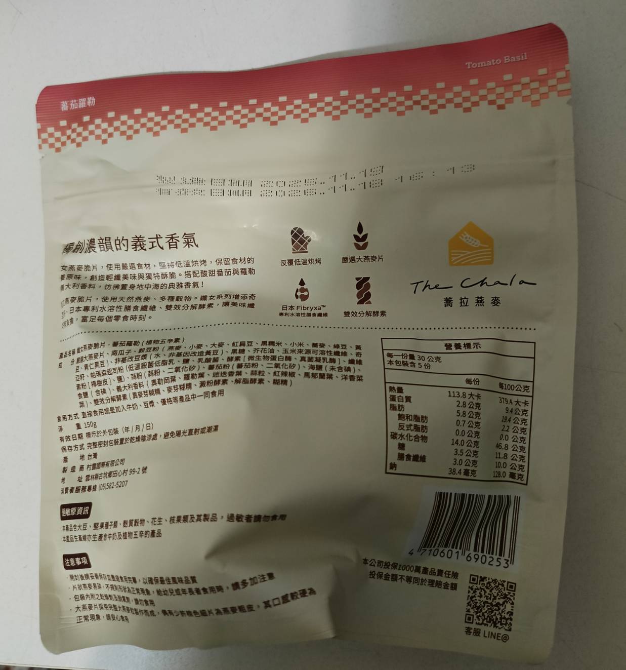嚴選大燕麥片、南瓜子、穀豆粉(燕麥、小麥、大麥、紅扁豆、黑糯米、小米、蕎麥、綠豆、黃豆、青仁黑豆)、非基改豆漿(水、非基因改造黃豆)、黑糖、芥花油、玉米來源可溶性纖維、奇亞籽、帕瑪森起司粉(低溫殺菌低脂乳、鹽、乳酸菌、酵素[微生物蛋白酶、真菌凝乳酶]、纖維素粉[樺樹皮]、鹽)、蒜粉(蒜粉、二氧化矽)、蕃茄粉(蕃茄粉、二氧化矽)、海鹽(未含碘)、食鹽(含碘)、義大利香料(奧勒岡葉、羅勒葉、迷迭香葉、蒜粒、紅辣椒、馬郁蘭葉、洋香菜葉)、雙效分解酵素(異麥芽糊精、麥芽糊精、澱粉酵素、 解脂酵素、糊精)