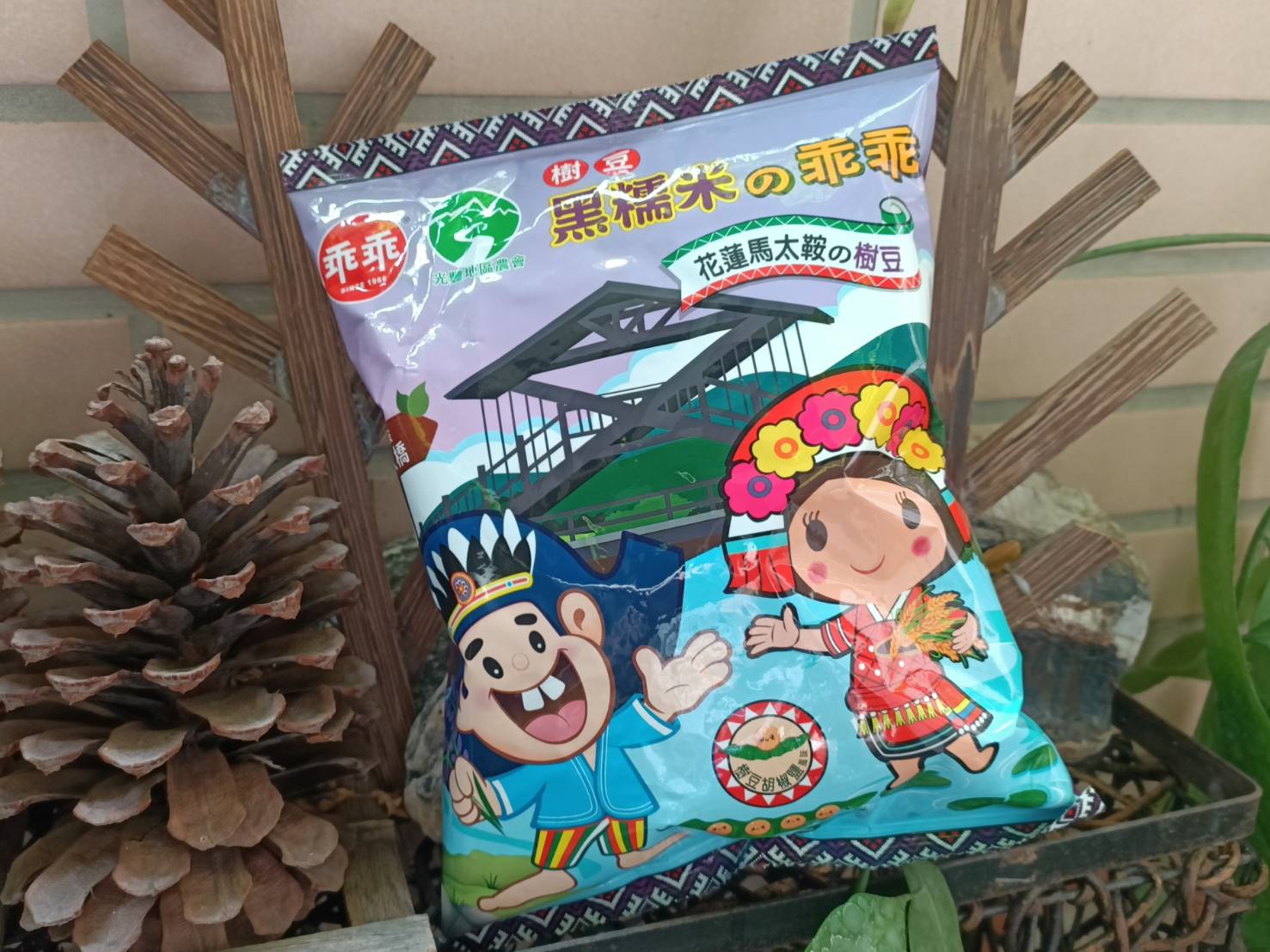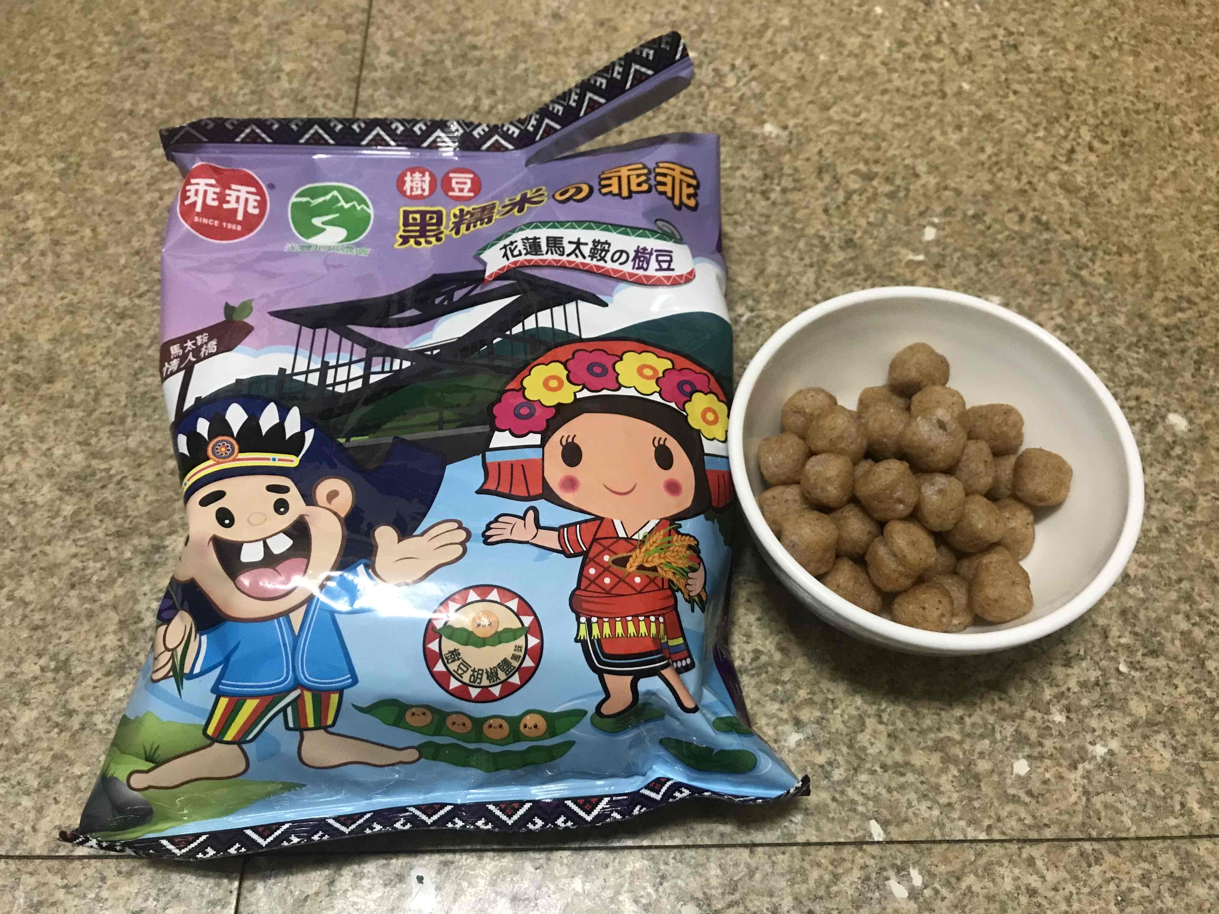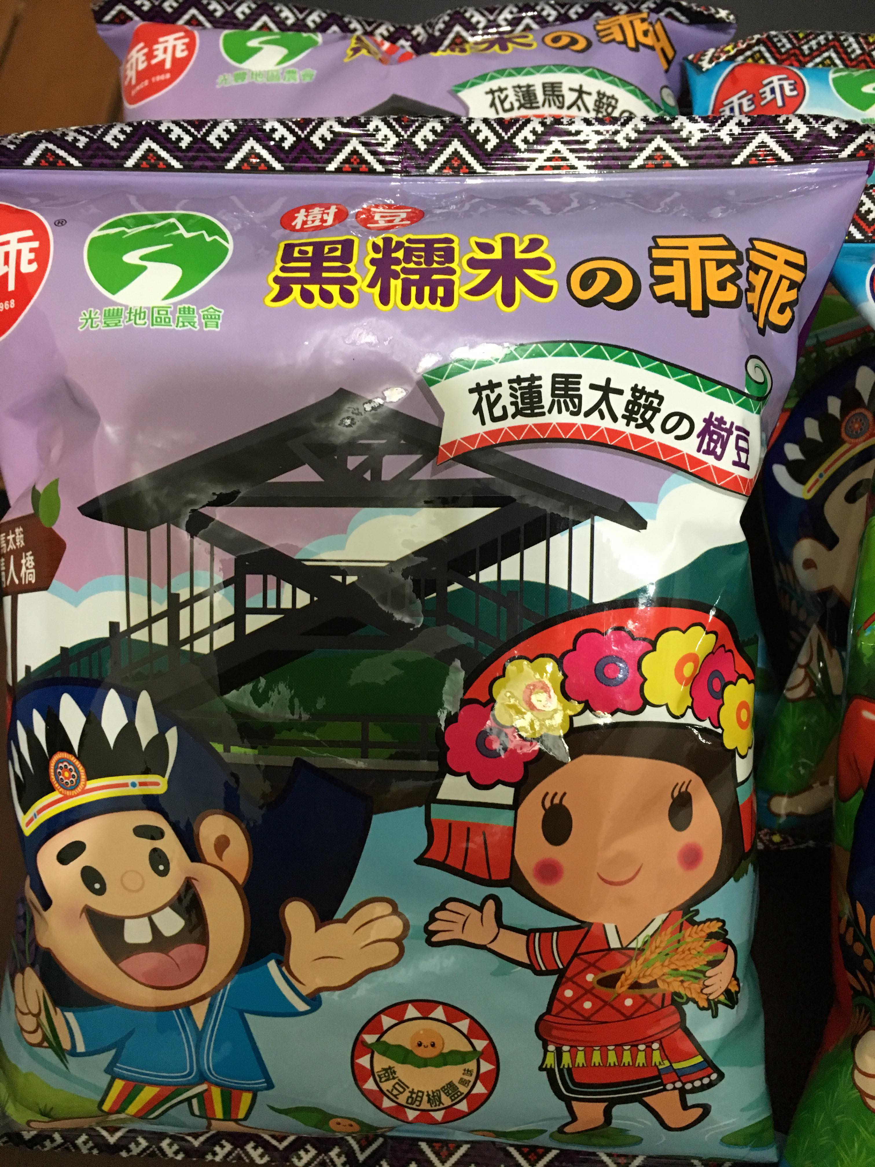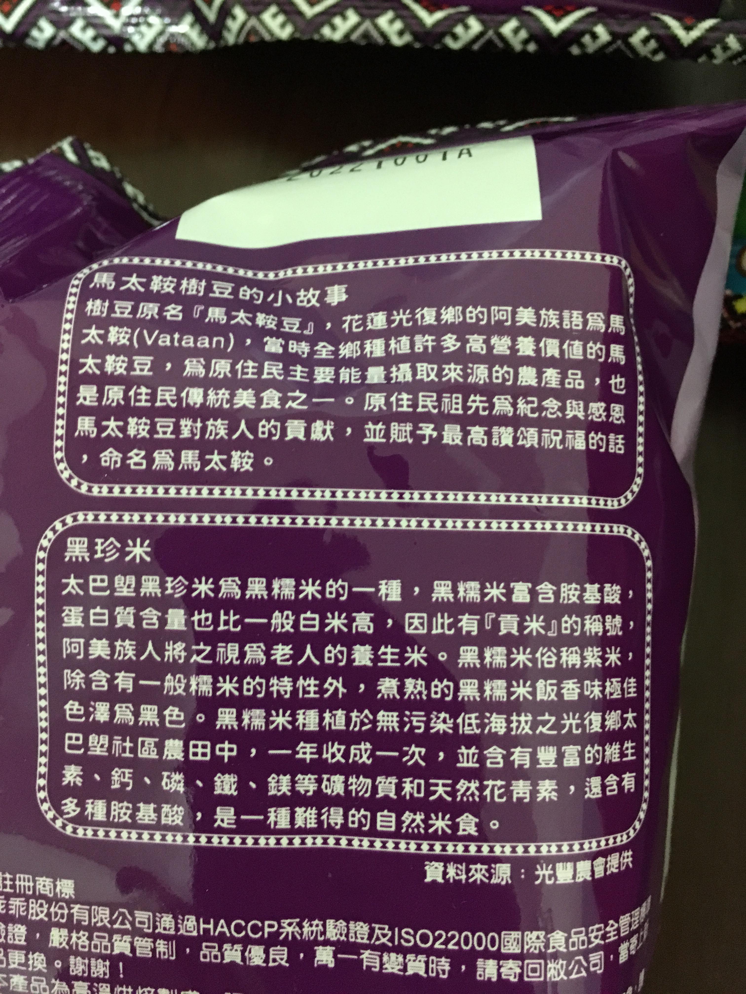 馬太鞍樹豆、黑糯米及椒鹽的樹豆黑米乖乖,是屬於鹹香口味,樹豆本身營養價值高、黑糯米含花青素高,樹豆黑米不但是推廣地方原民文化農特產,也是一種養生食品。