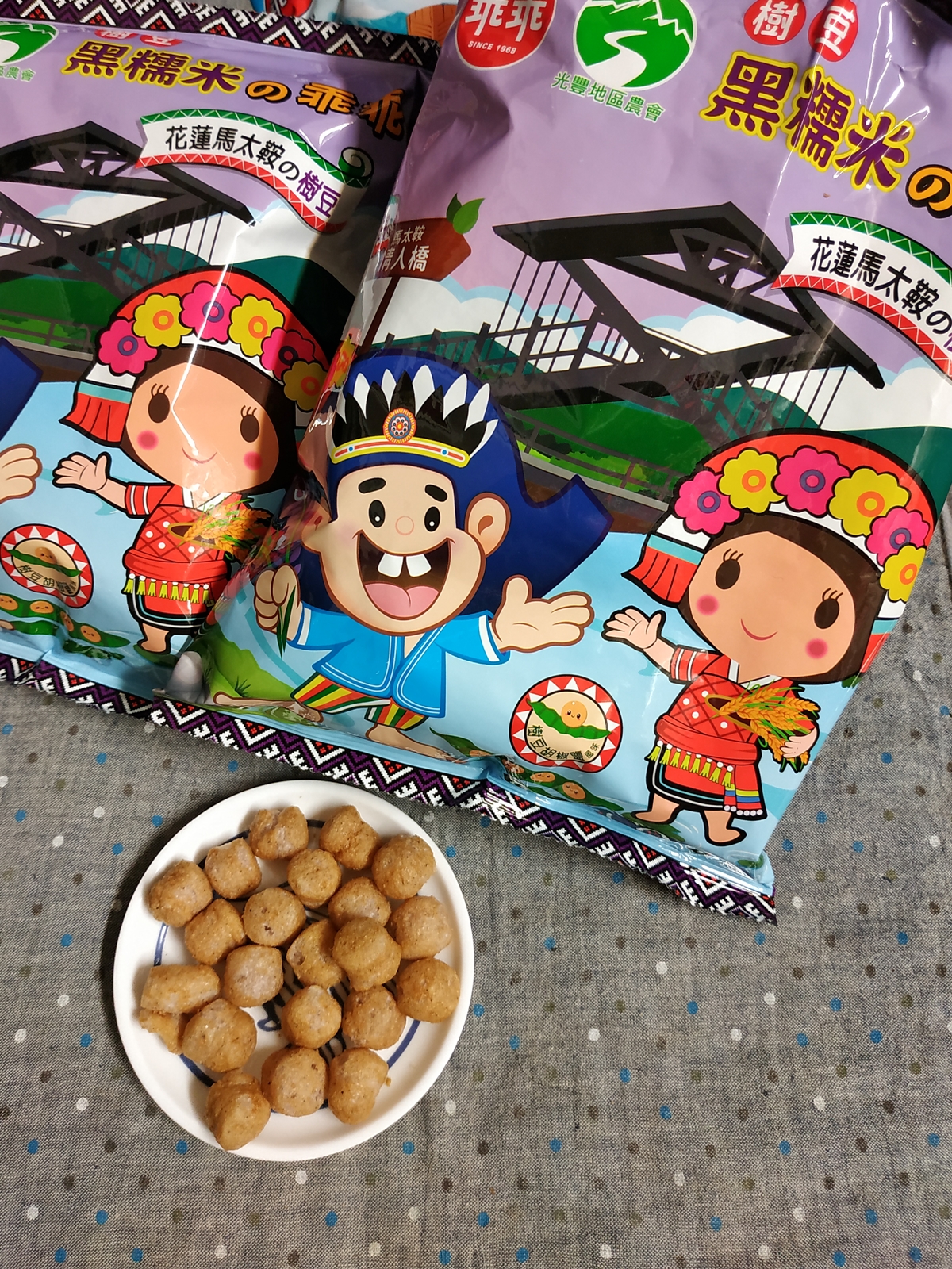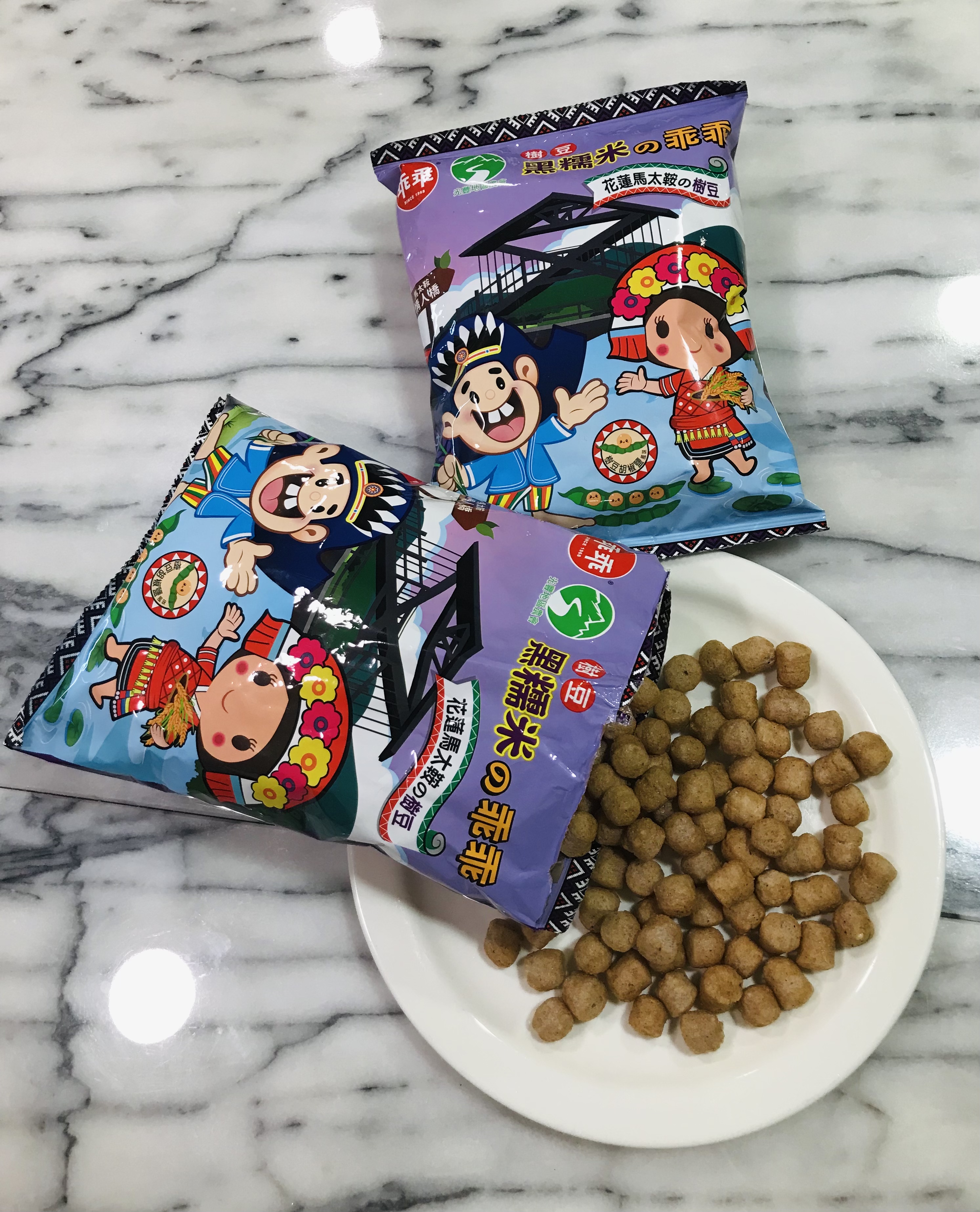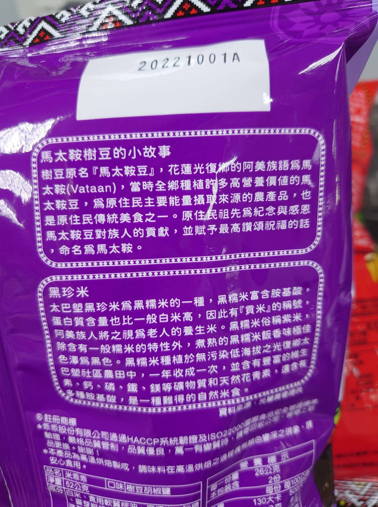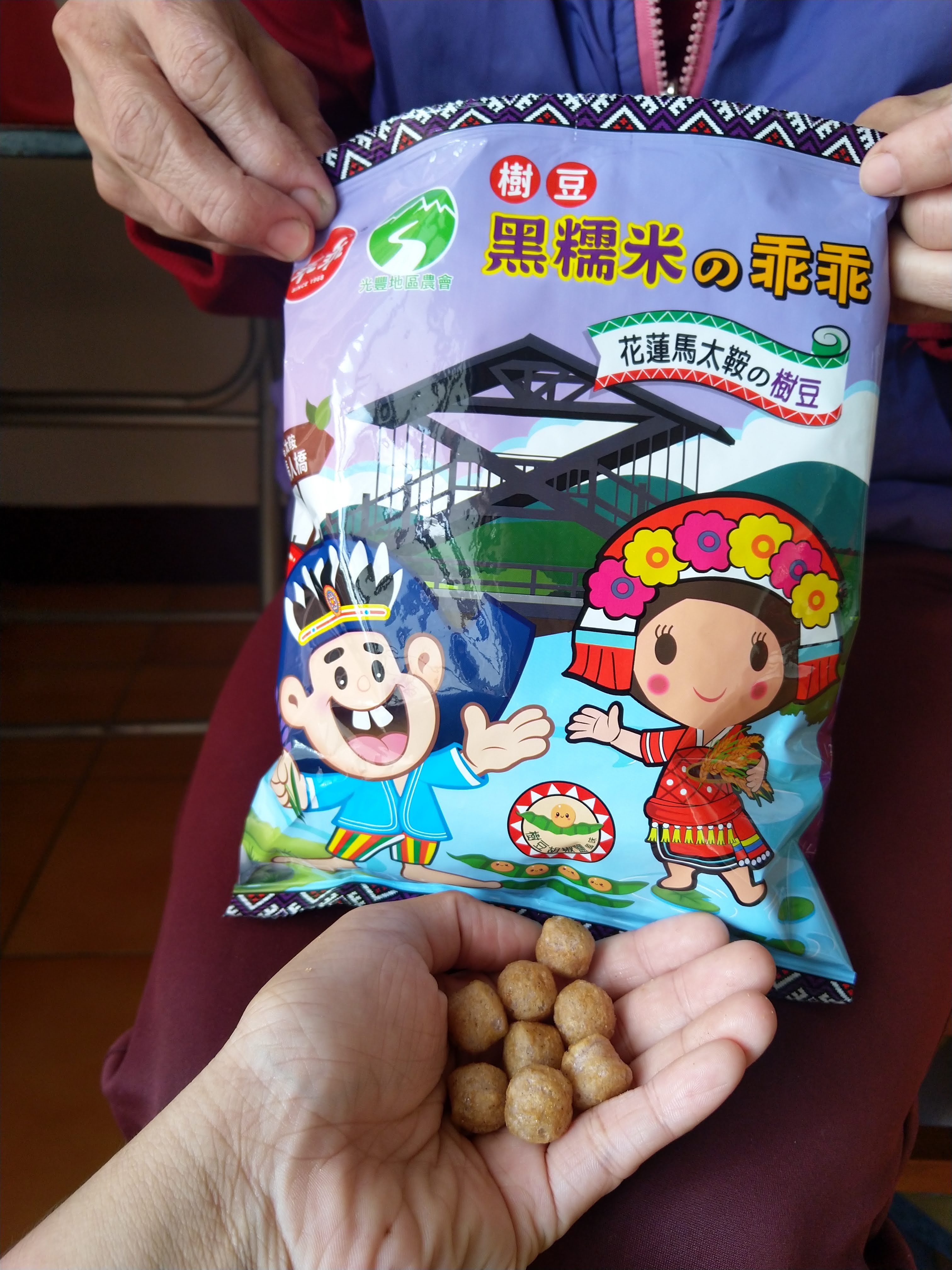 馬太鞍樹豆、黑糯米及椒鹽的樹豆黑米乖乖,是屬於鹹香口味,樹豆本身營養價值高、黑糯米含花青素高,樹豆黑米不但是推廣地方原民文化農特產,也是一種養生食品。