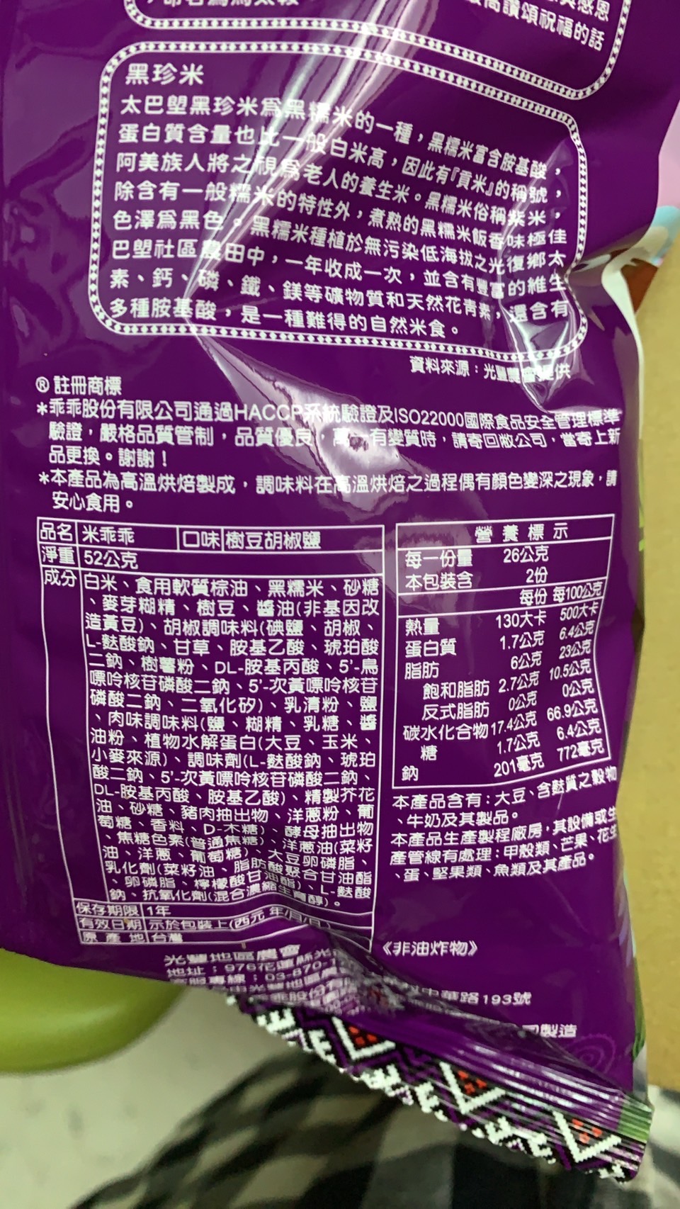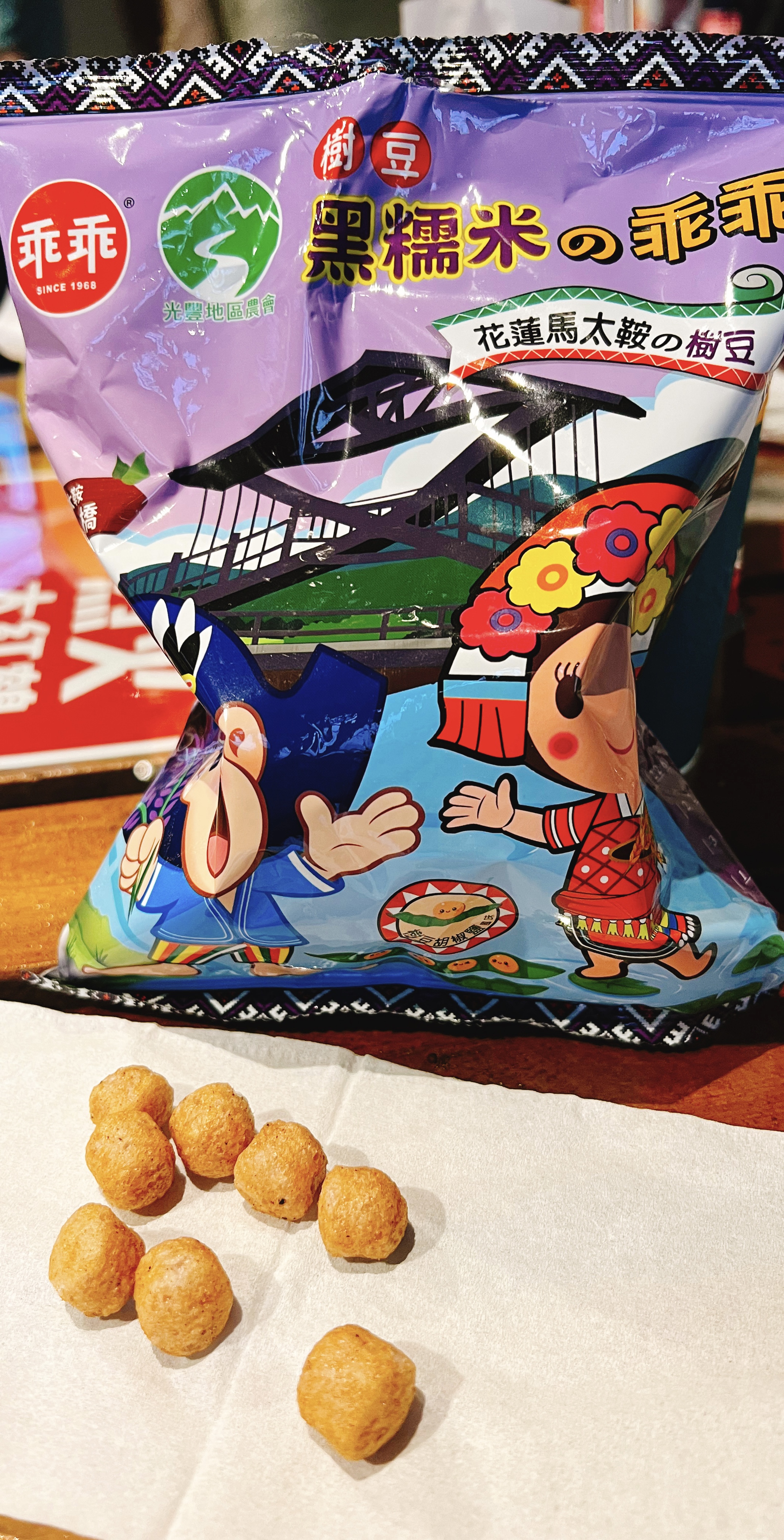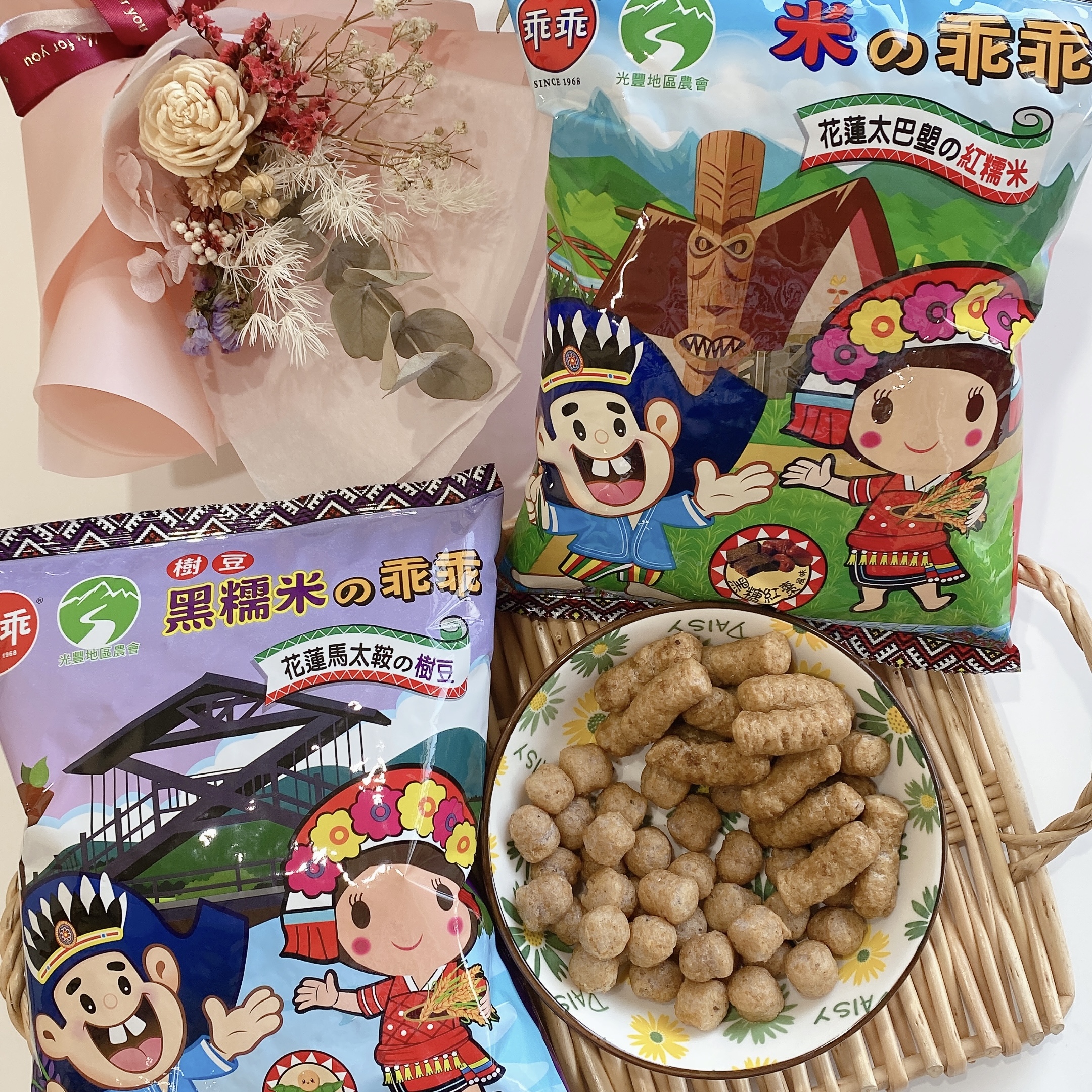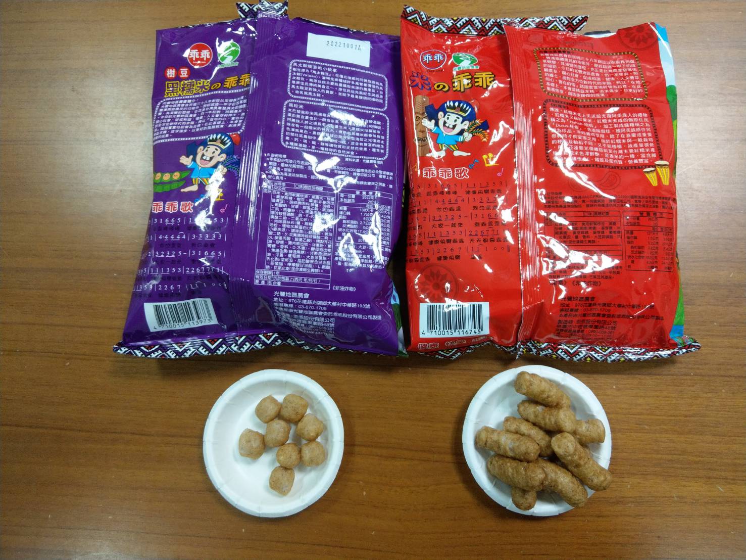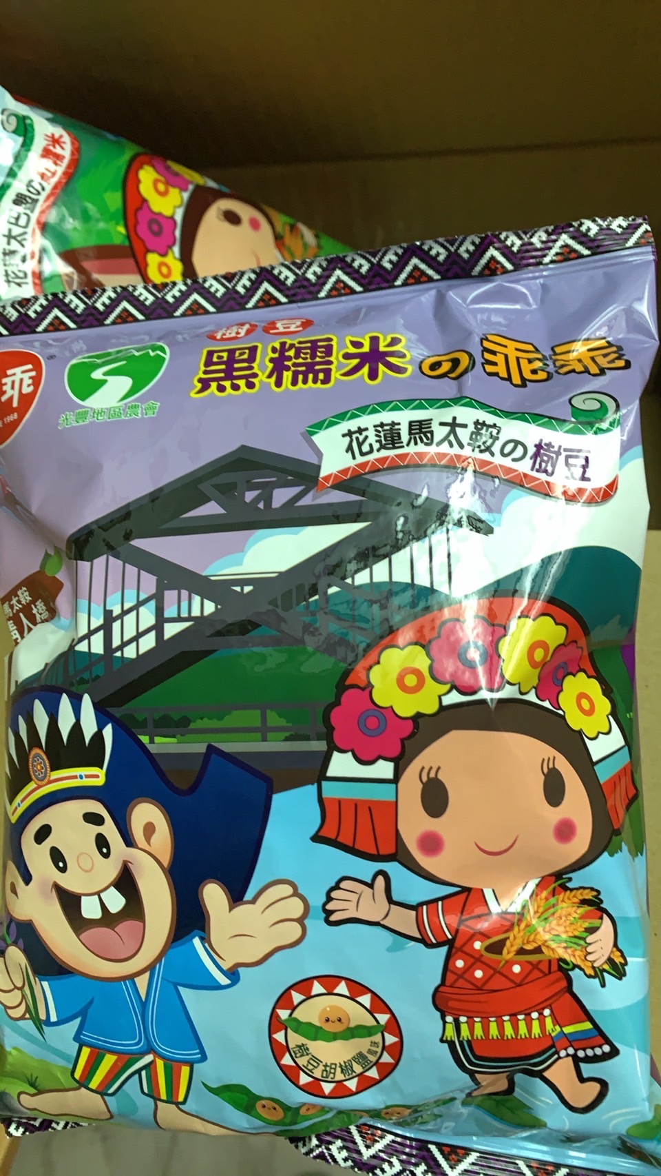 馬太鞍樹豆、黑糯米及椒鹽的樹豆黑米乖乖,是屬於鹹香口味,樹豆本身營養價值高、黑糯米含花青素高,樹豆黑米不但是推廣地方原民文化農特產,也是一種養生食品。