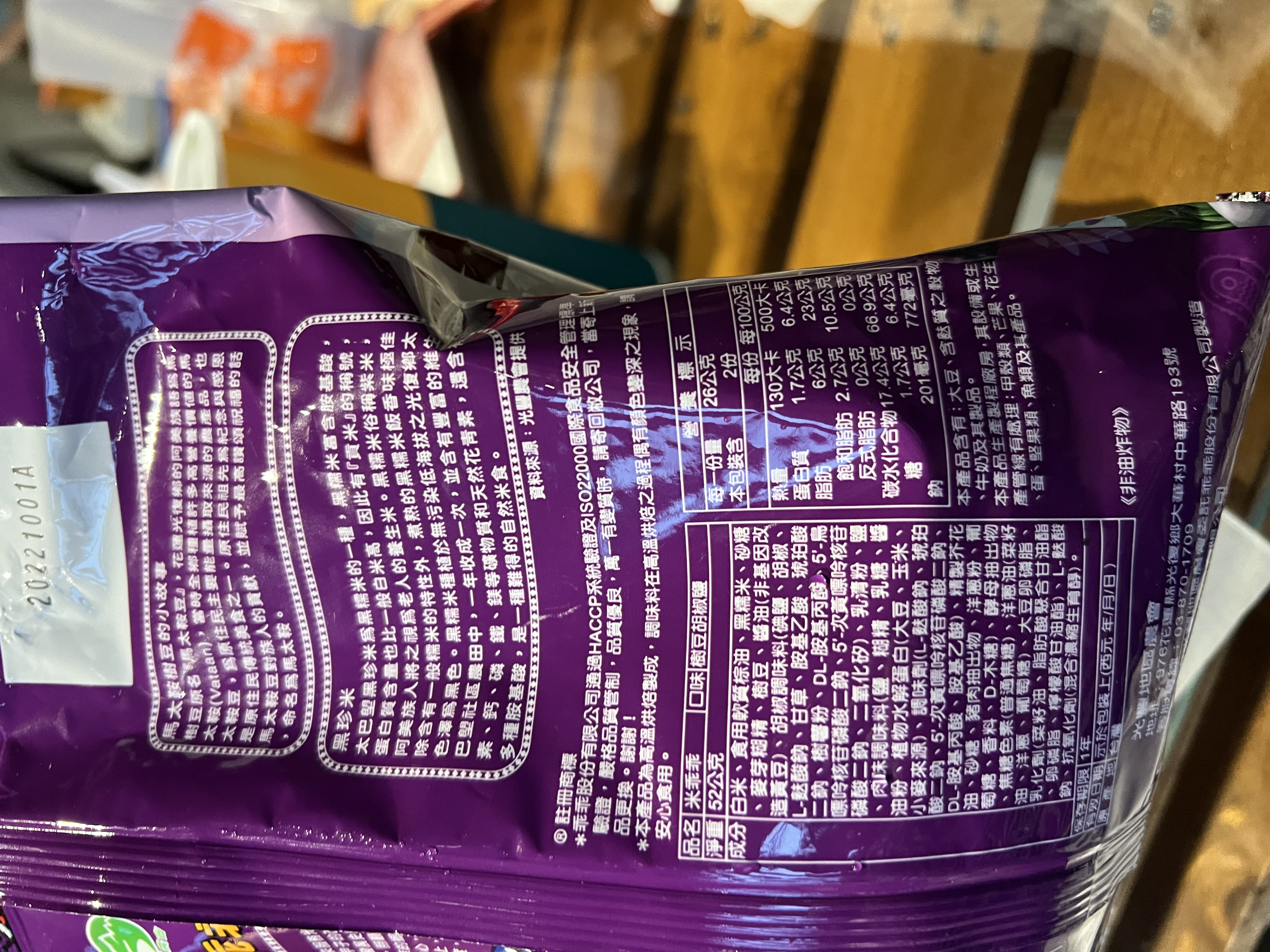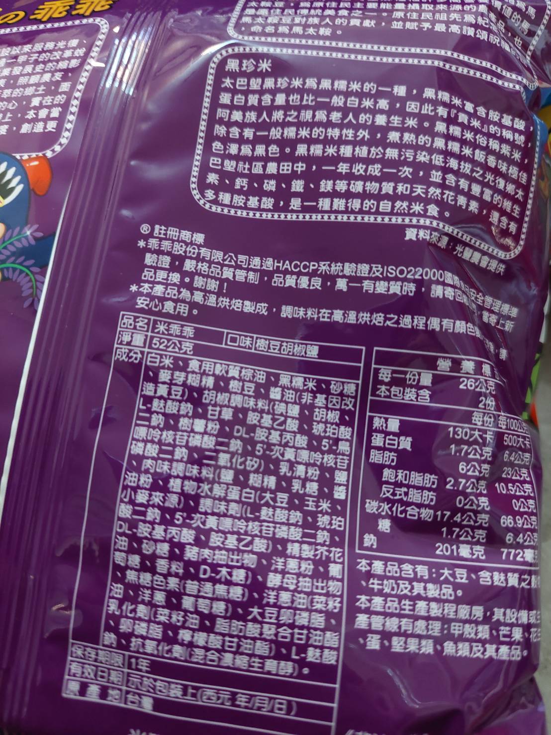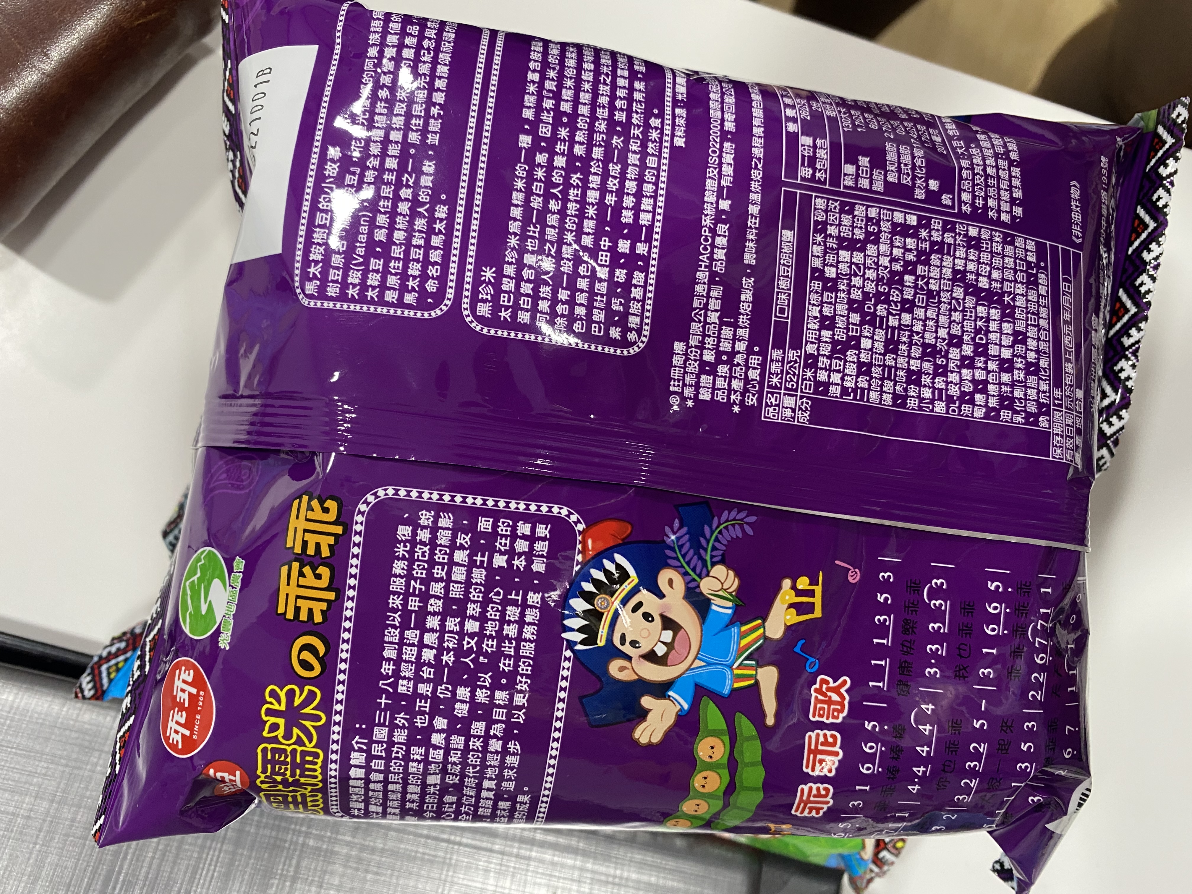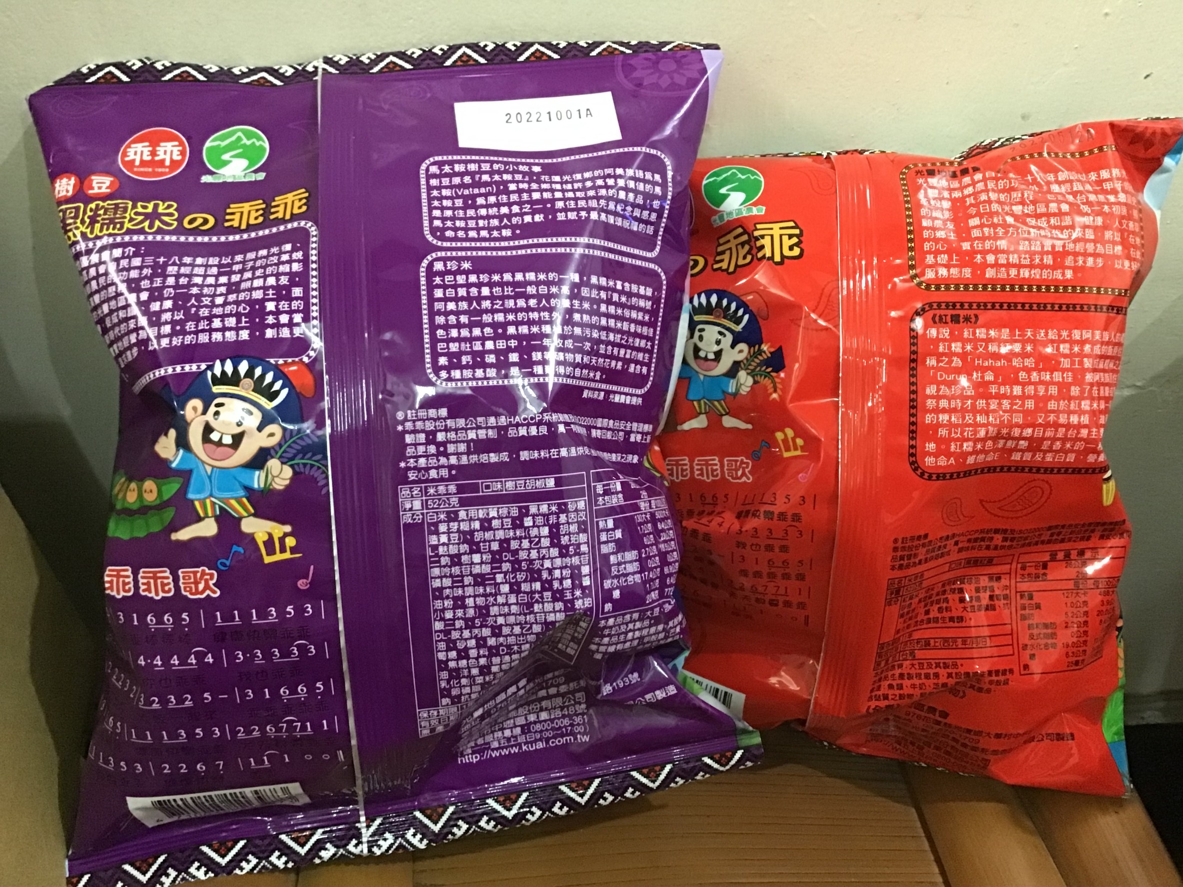 馬太鞍樹豆、黑糯米及椒鹽的樹豆黑米乖乖,是屬於鹹香口味,樹豆本身營養價值高、黑糯米含花青素高,樹豆黑米不但是推廣地方原民文化農特產,也是一種養生食品。