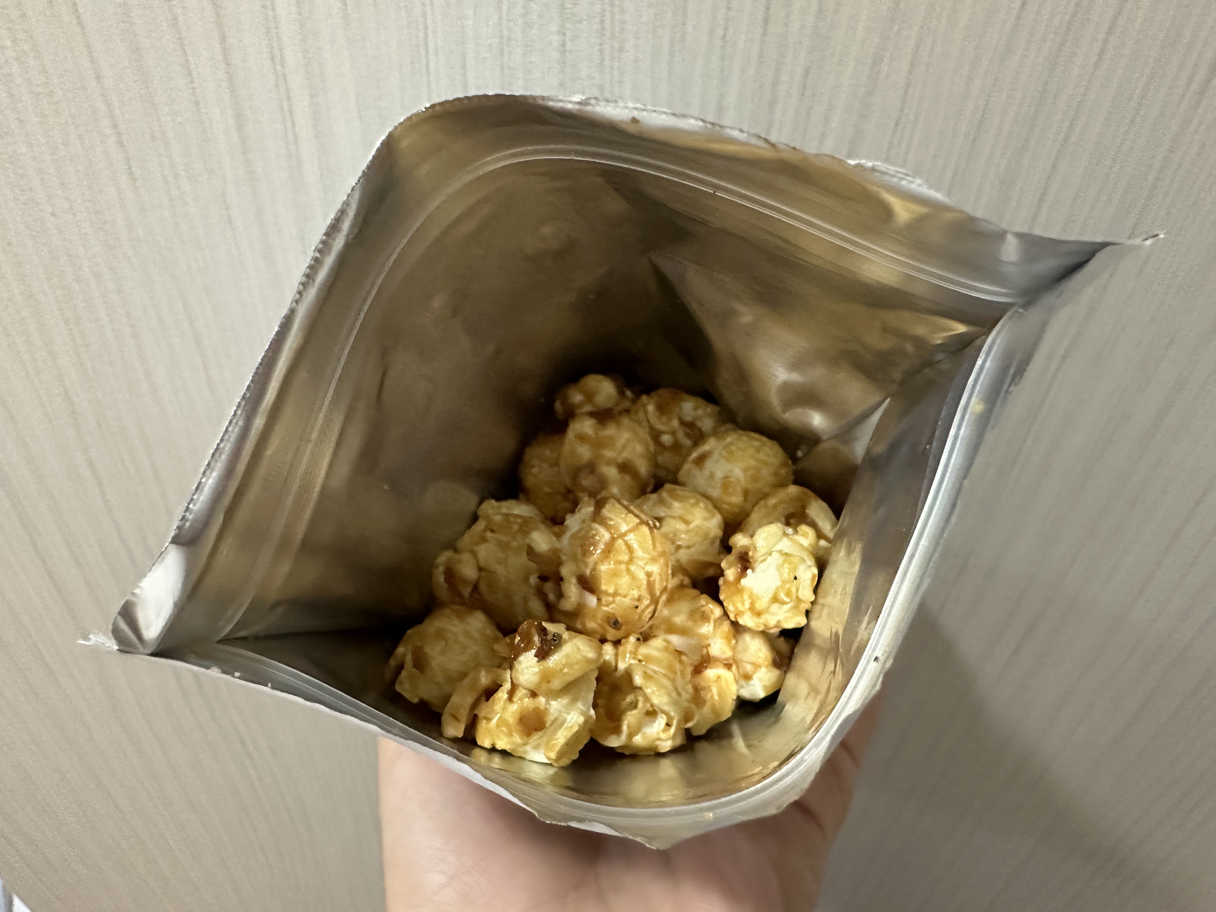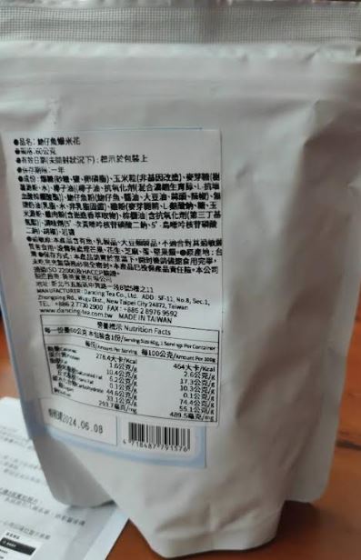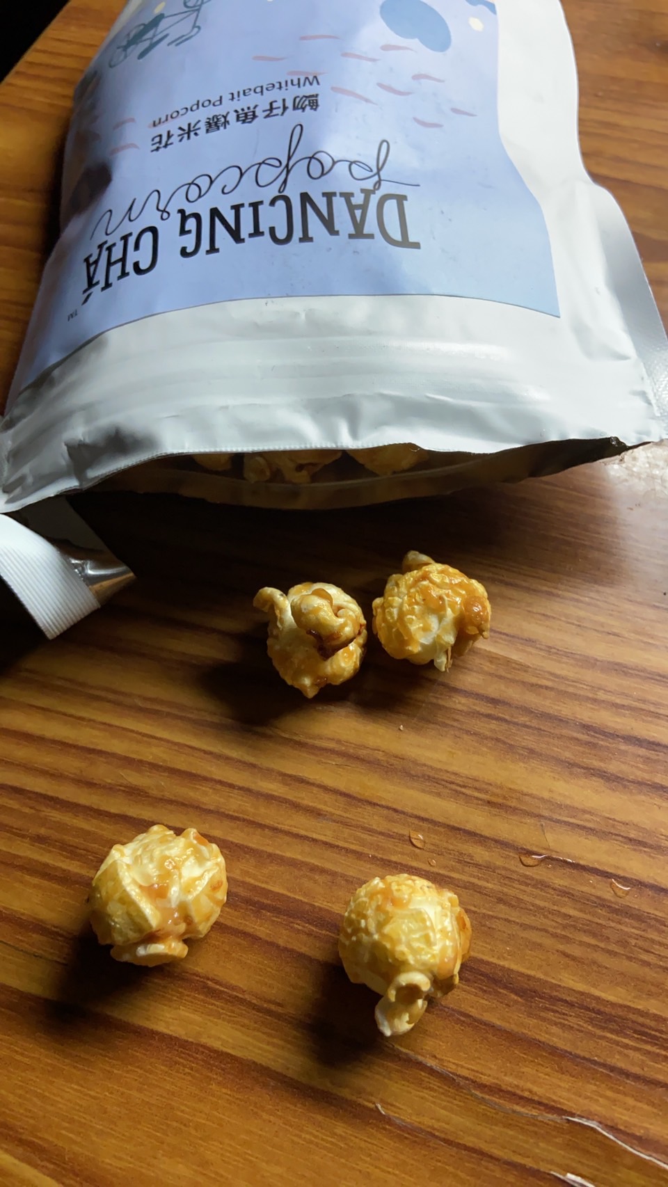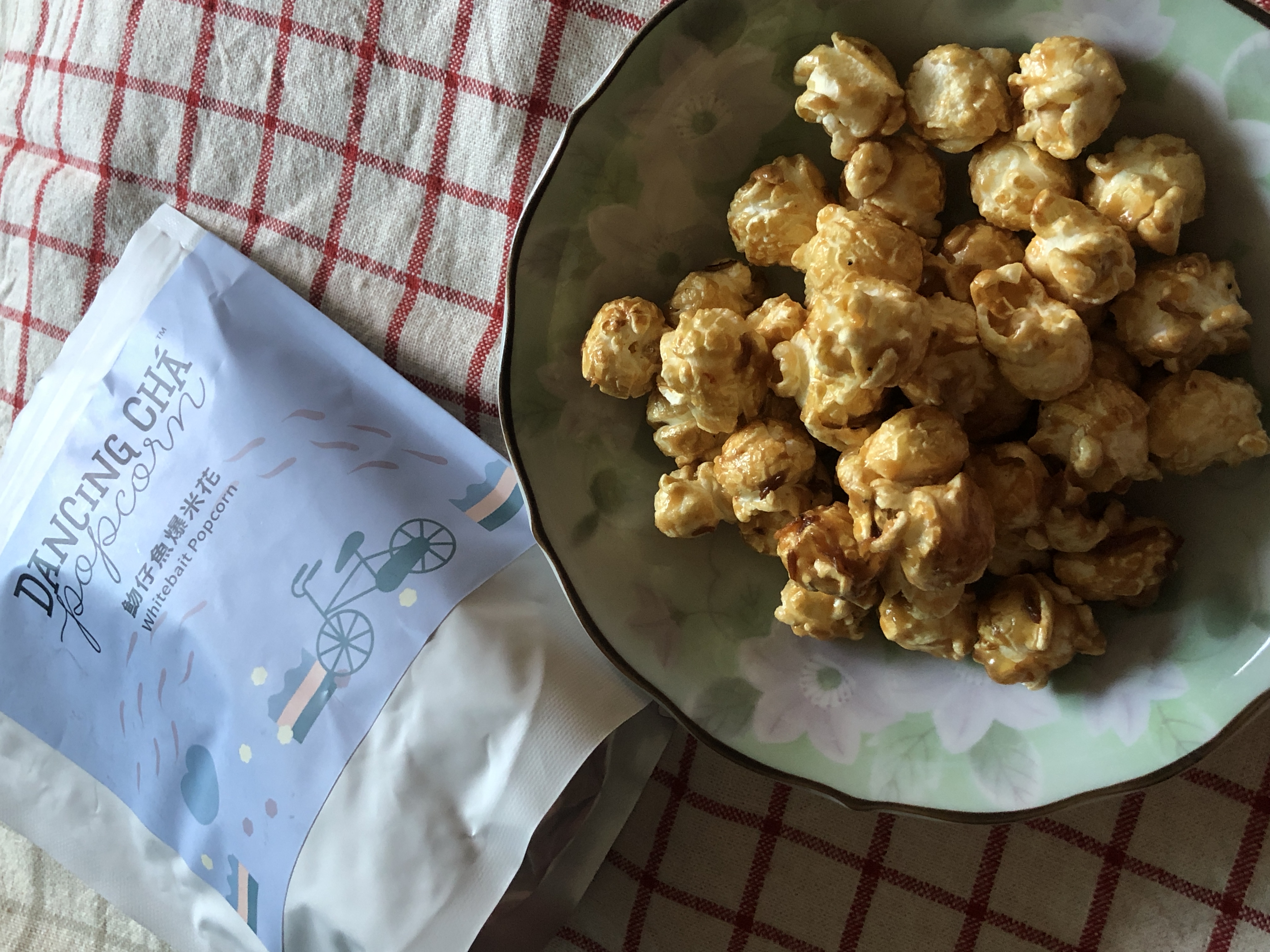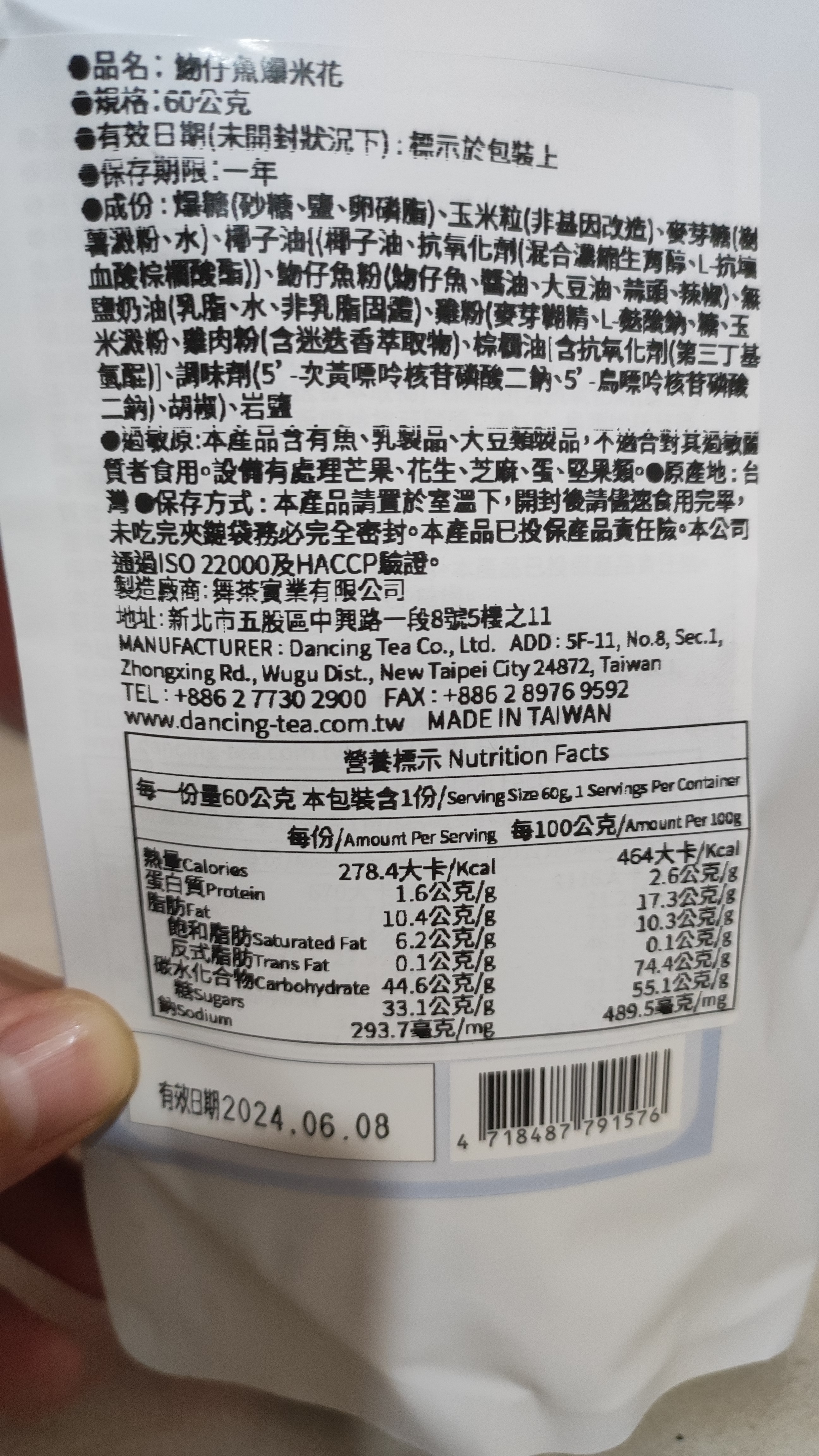 爆糖(砂糖、鹽、卵磷脂)、玉米粒(非基因改造)、麥芽糖(樹薯澱粉、水)、水、椰子油{(椰子油、抗氧化劑(混合濃縮生育醇、L-抗壞血酸棕櫚酸酯))、魩仔魚粉(魩仔魚、醬油、大豆油、蒜頭、辣椒)、無鹽奶油(乳脂、水、非乳脂固體)、雞粉(麥芽糊精、L-麩酸鈉、糖、玉米澱粉、雞肉粉(含迷迭香萃取物)、棕櫚油[含抗氧化劑(第三丁基氫醌)]、調味劑(5’-次黃嘌呤核苷磷酸二鈉、5’-鳥嘌呤核苷磷酸二鈉)、胡椒)、岩鹽