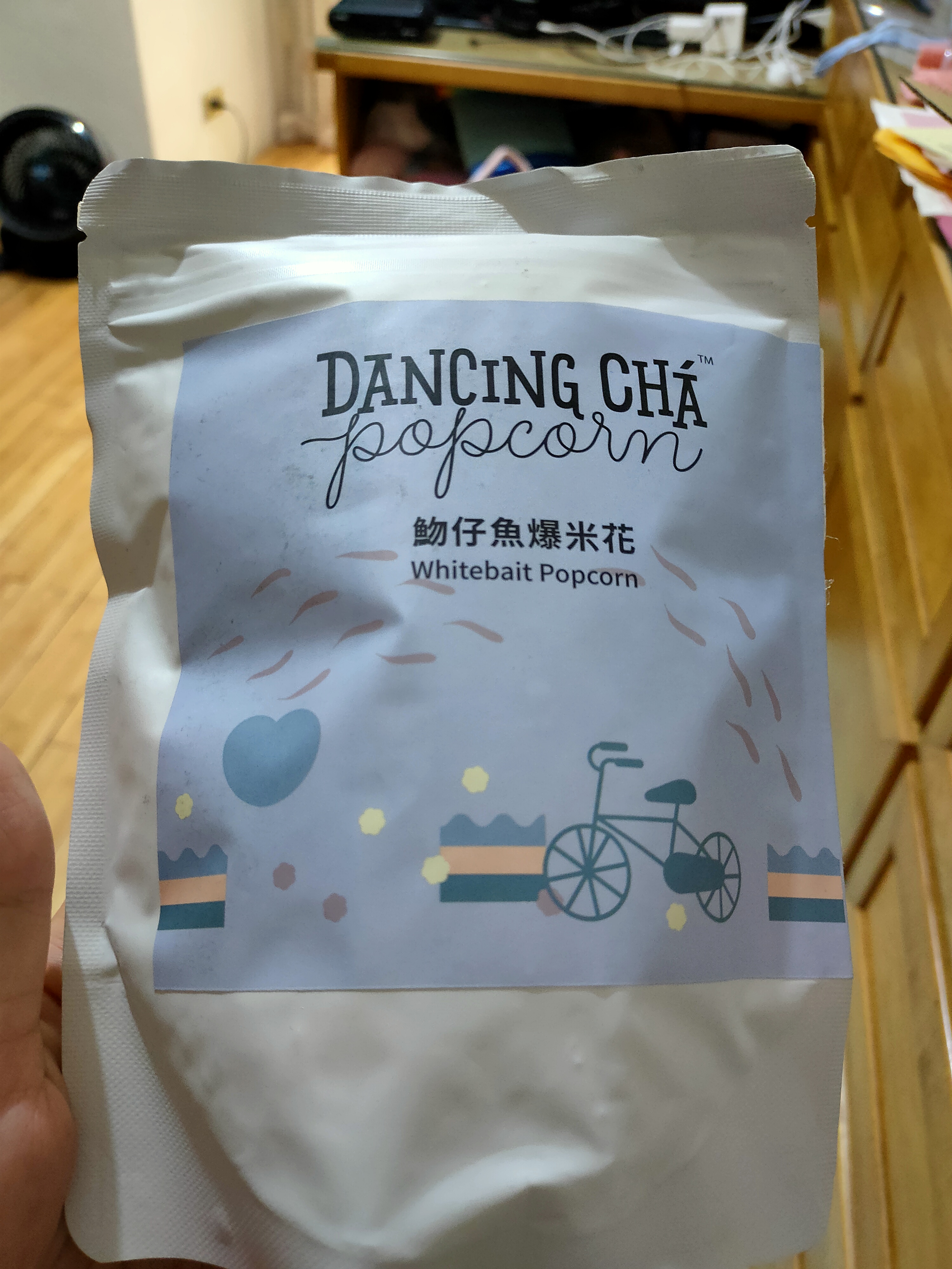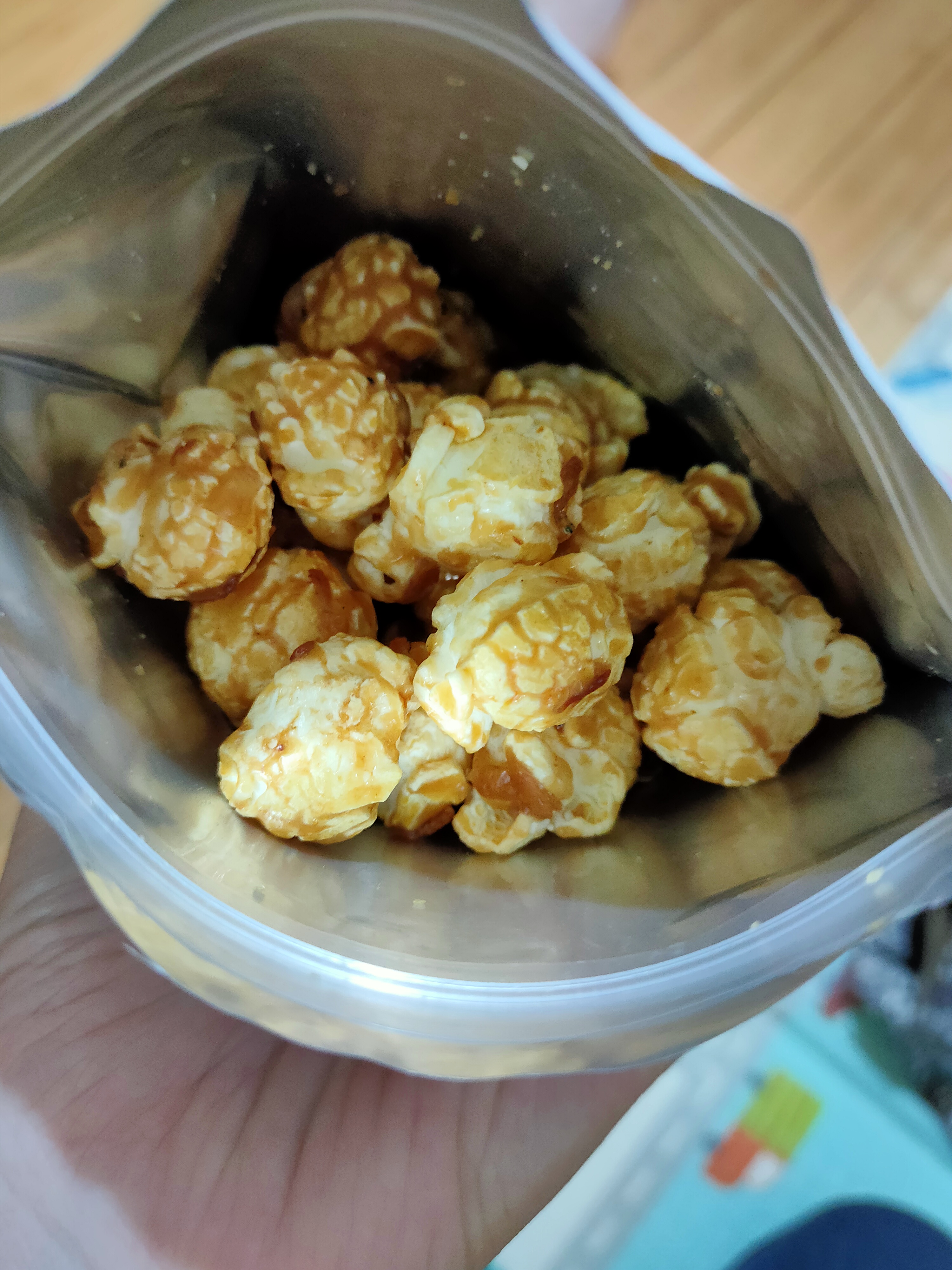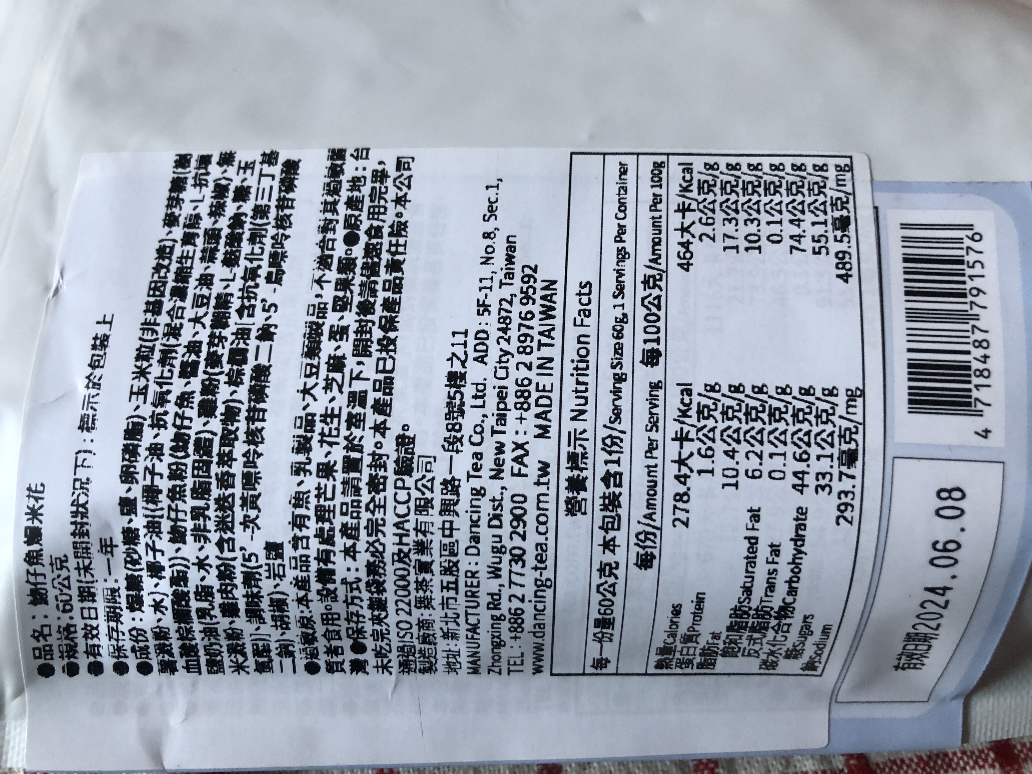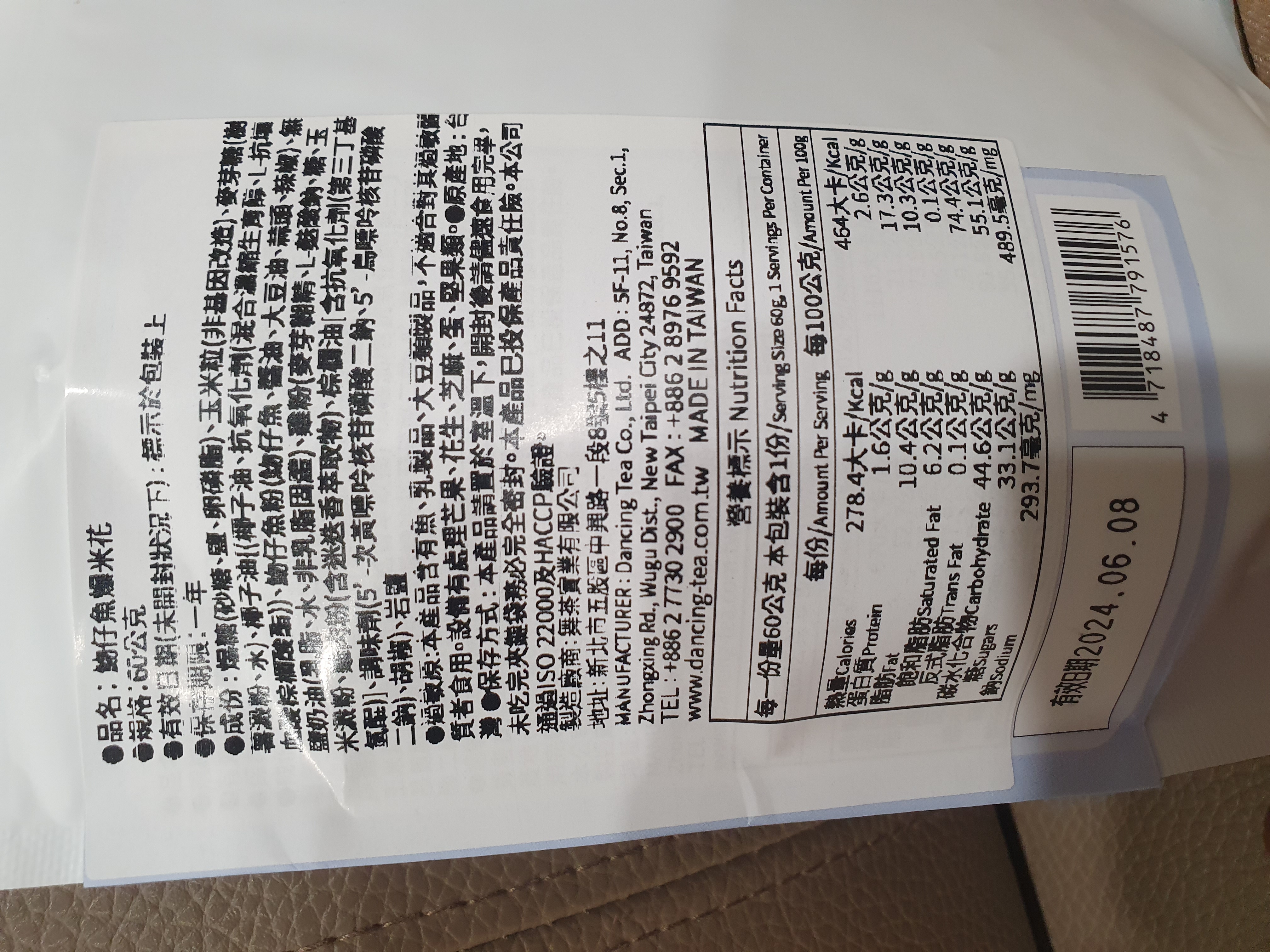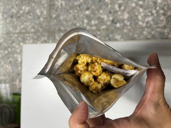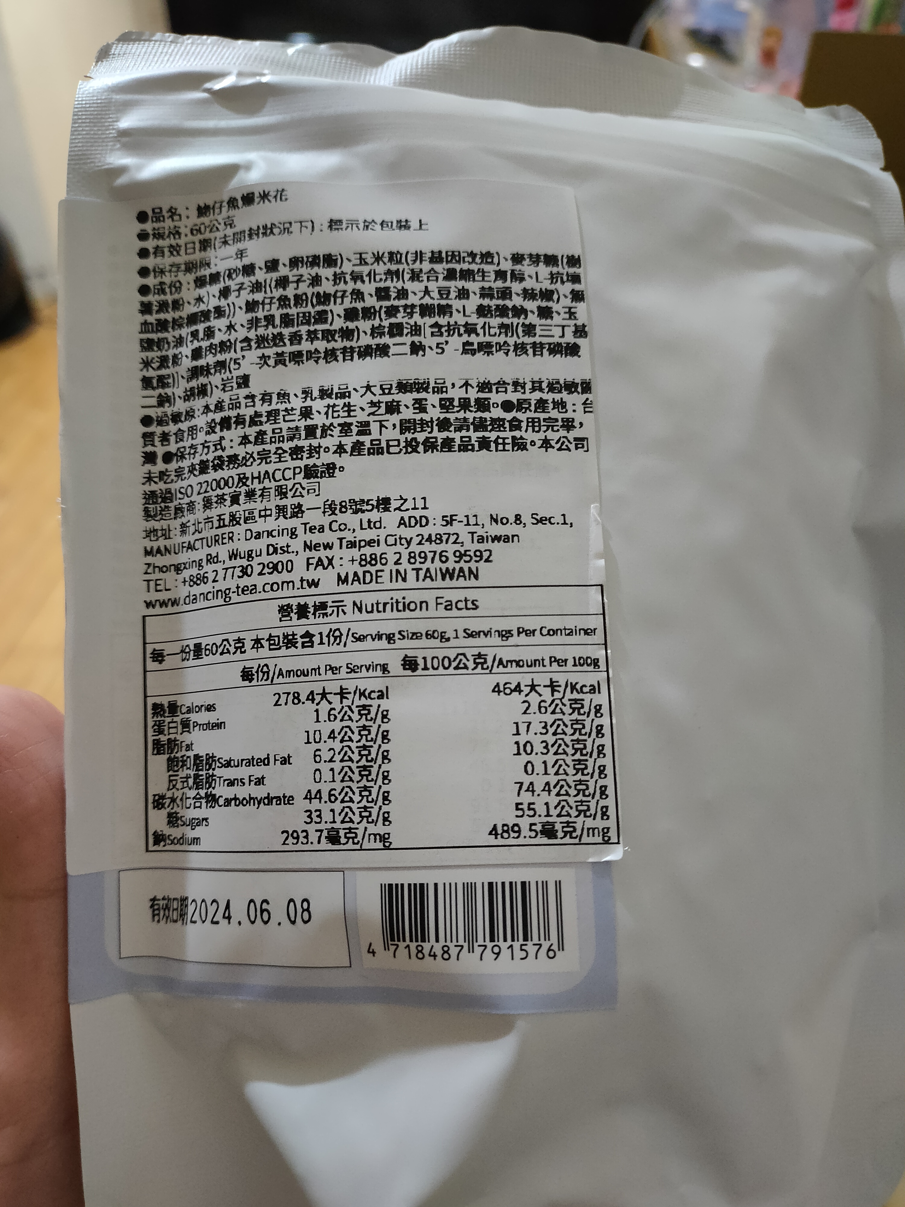 爆糖(砂糖、鹽、卵磷脂)、玉米粒(非基因改造)、麥芽糖(樹薯澱粉、水)、水、椰子油{(椰子油、抗氧化劑(混合濃縮生育醇、L-抗壞血酸棕櫚酸酯))、魩仔魚粉(魩仔魚、醬油、大豆油、蒜頭、辣椒)、無鹽奶油(乳脂、水、非乳脂固體)、雞粉(麥芽糊精、L-麩酸鈉、糖、玉米澱粉、雞肉粉(含迷迭香萃取物)、棕櫚油[含抗氧化劑(第三丁基氫醌)]、調味劑(5’-次黃嘌呤核苷磷酸二鈉、5’-鳥嘌呤核苷磷酸二鈉)、胡椒)、岩鹽