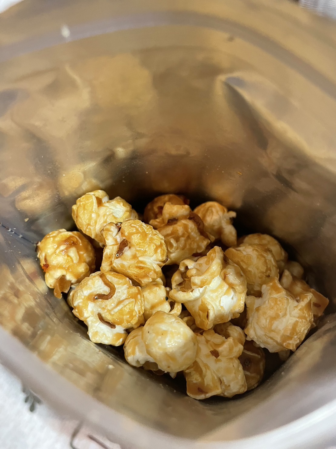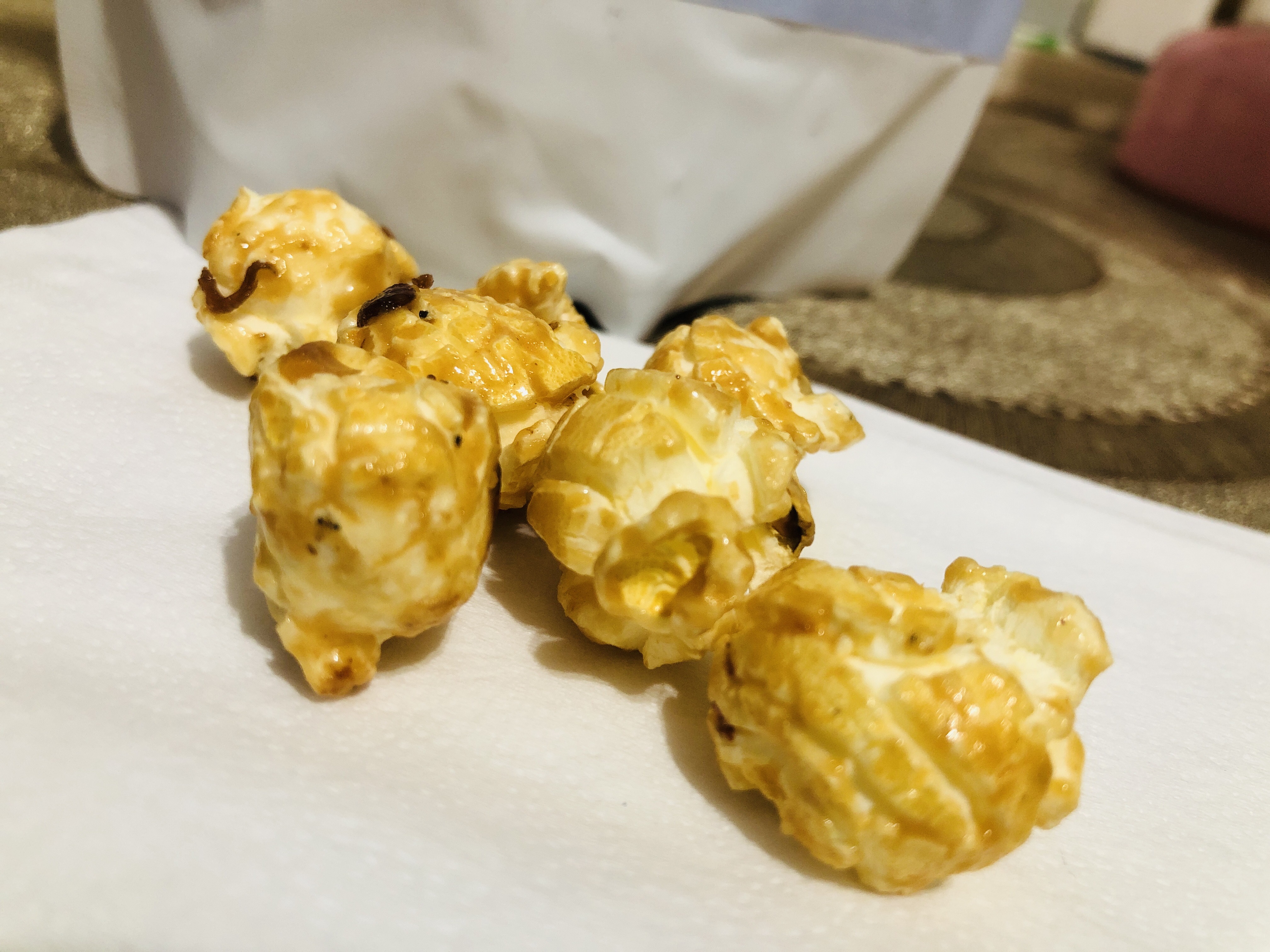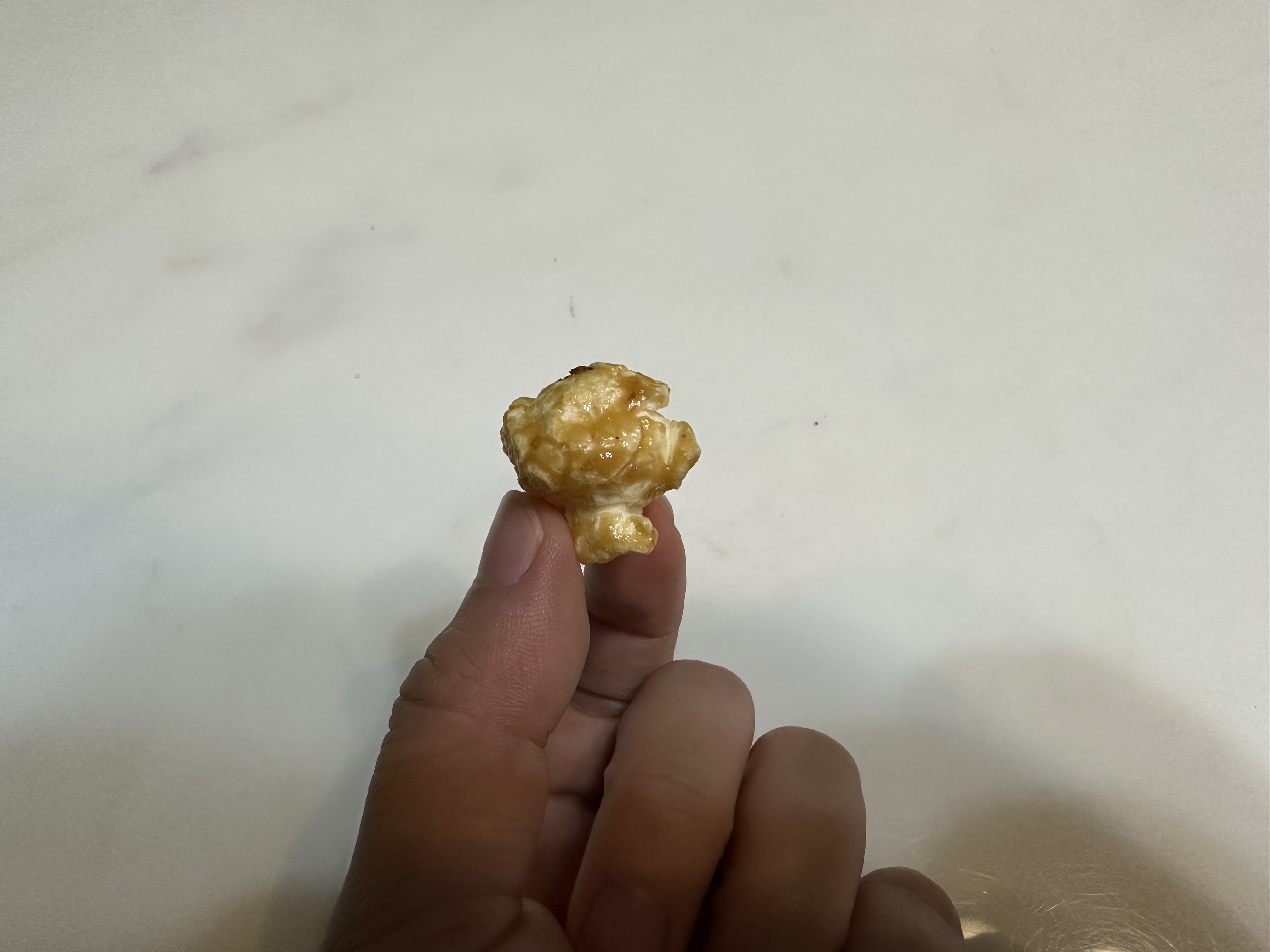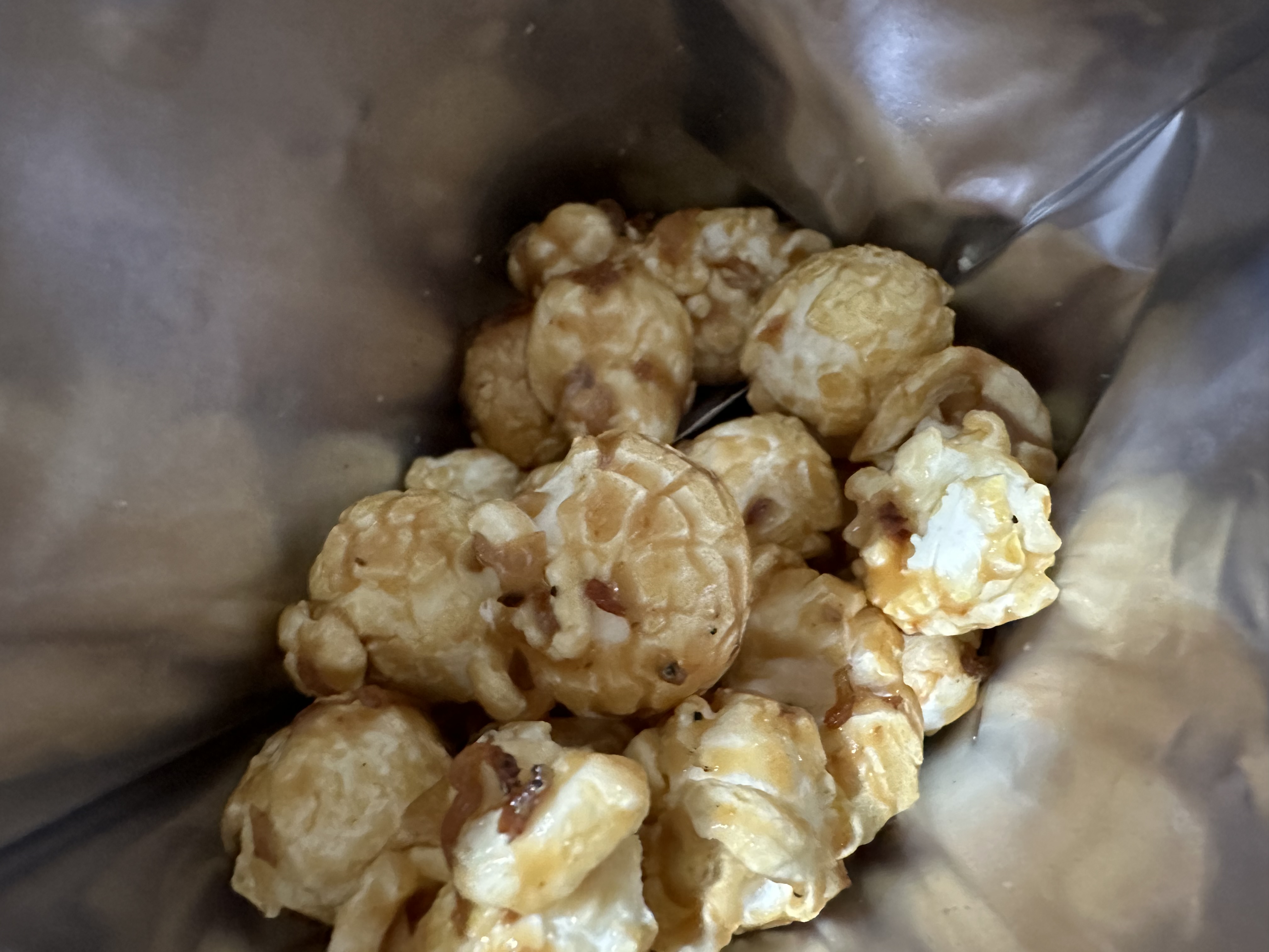 爆糖(砂糖、鹽、卵磷脂)、玉米粒(非基因改造)、麥芽糖(樹薯澱粉、水)、水、椰子油{(椰子油、抗氧化劑(混合濃縮生育醇、L-抗壞血酸棕櫚酸酯))、魩仔魚粉(魩仔魚、醬油、大豆油、蒜頭、辣椒)、無鹽奶油(乳脂、水、非乳脂固體)、雞粉(麥芽糊精、L-麩酸鈉、糖、玉米澱粉、雞肉粉(含迷迭香萃取物)、棕櫚油[含抗氧化劑(第三丁基氫醌)]、調味劑(5’-次黃嘌呤核苷磷酸二鈉、5’-鳥嘌呤核苷磷酸二鈉)、胡椒)、岩鹽