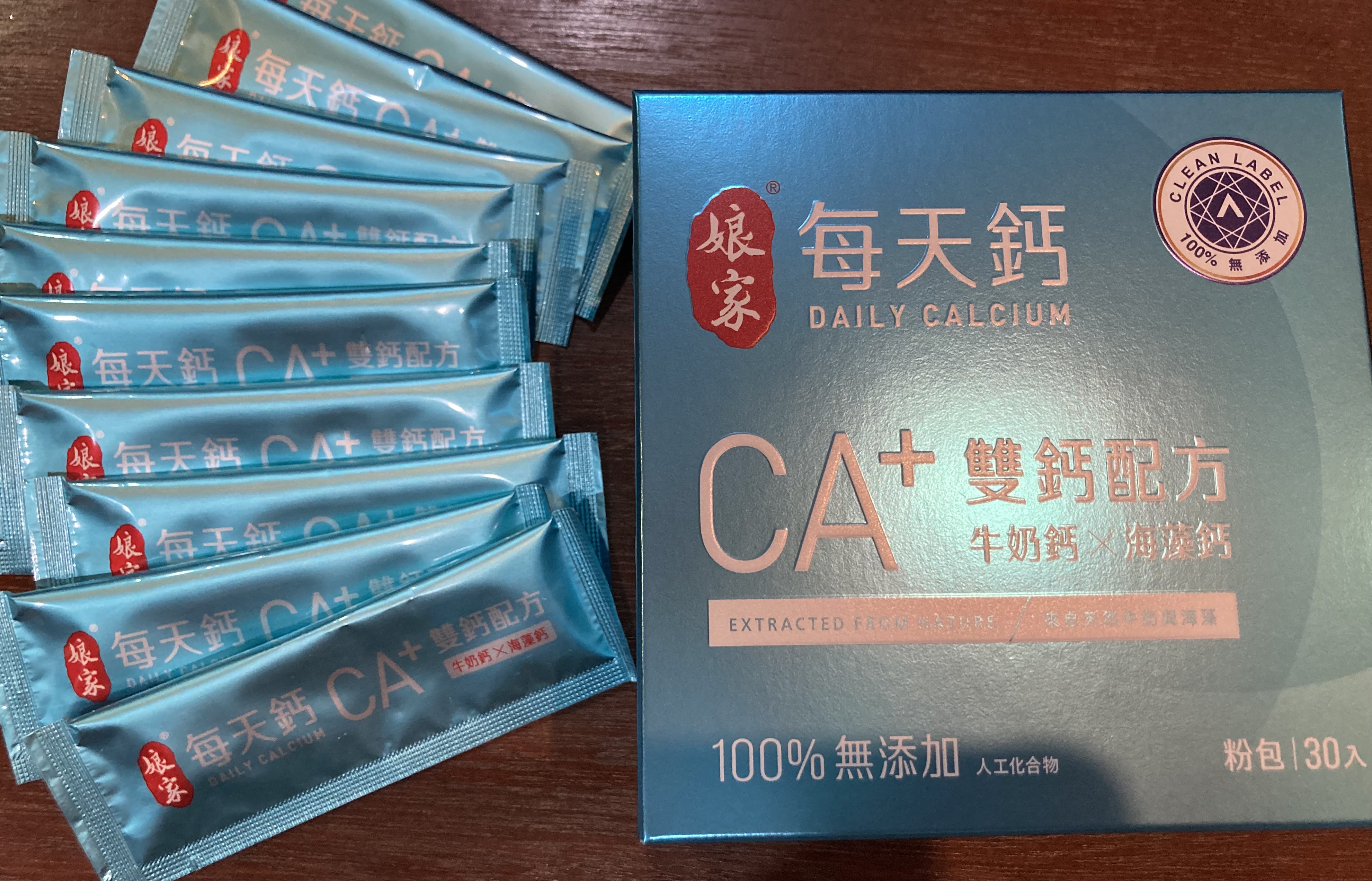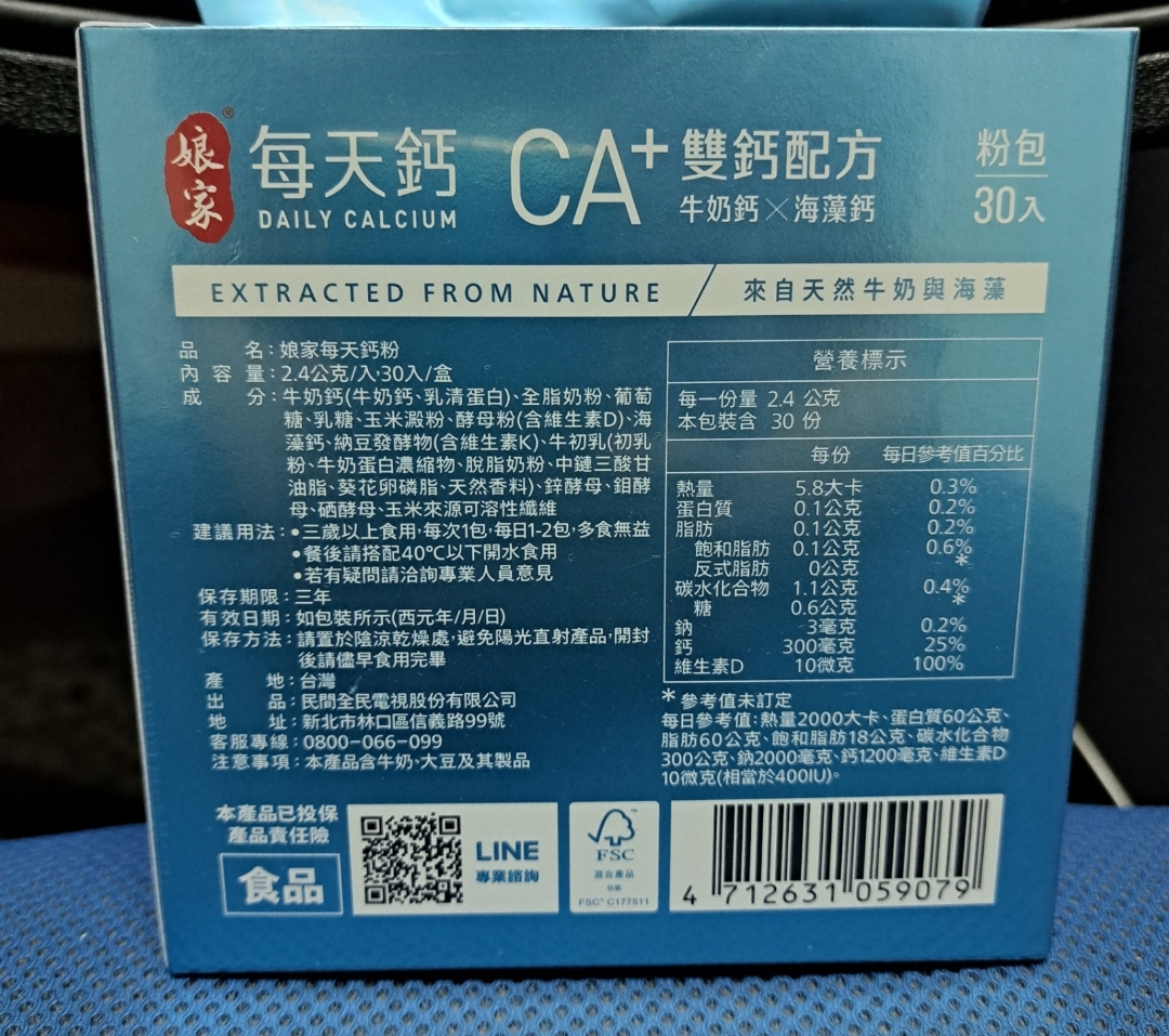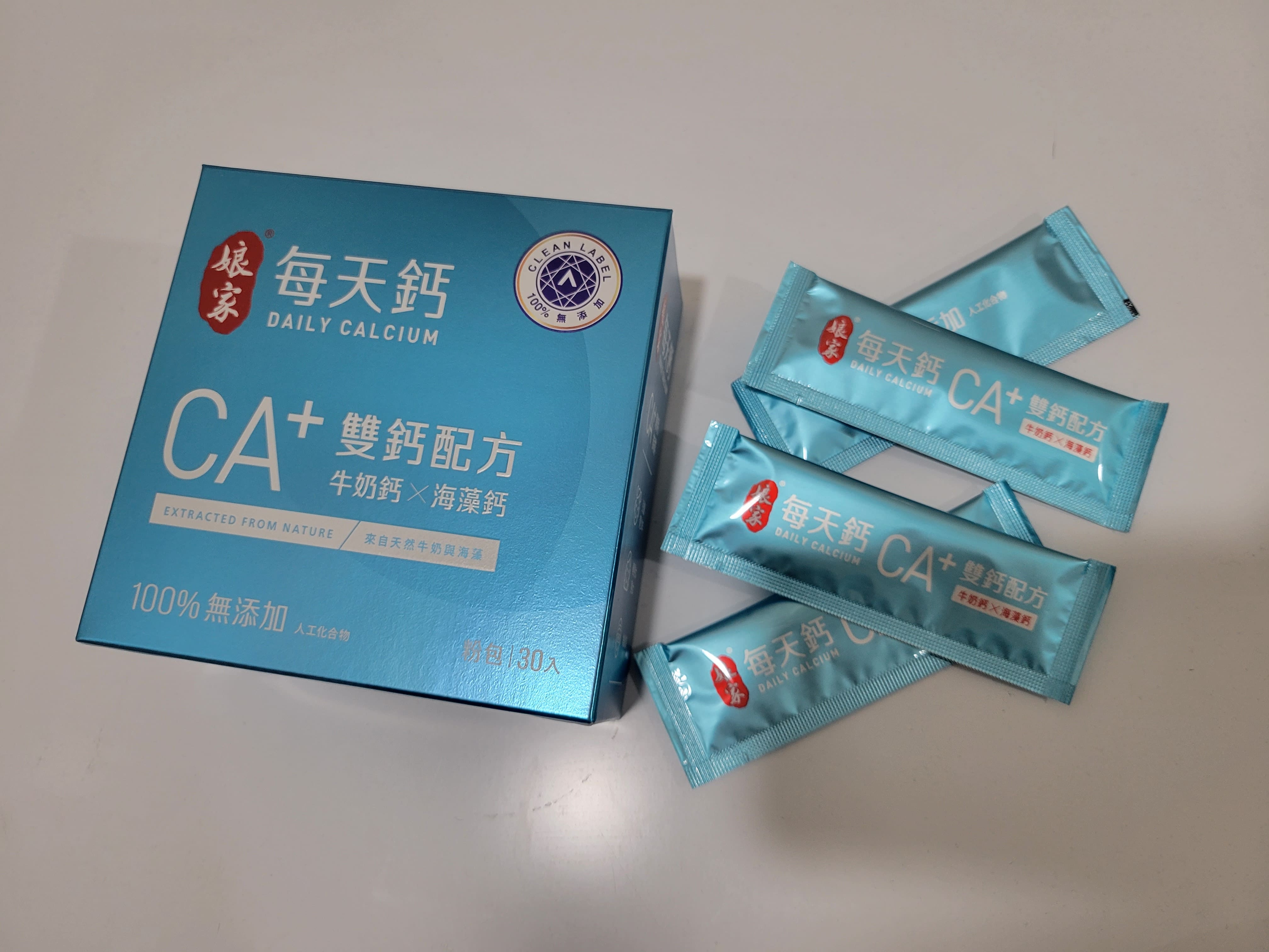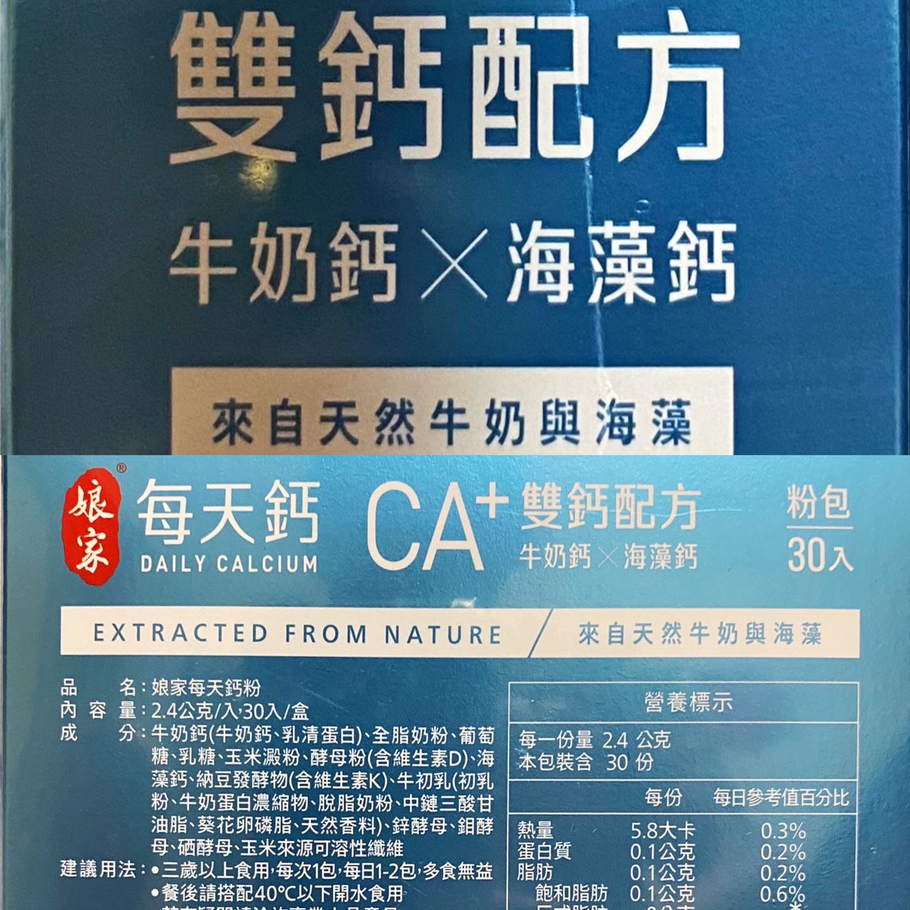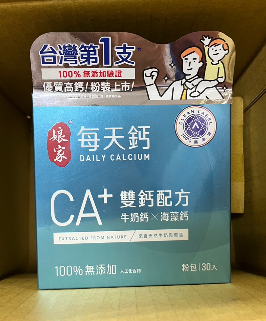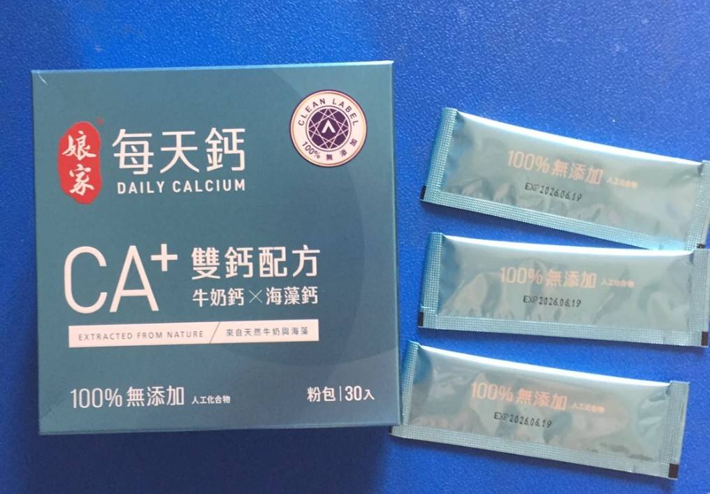 牛奶鈣(牛奶鈣、乳清蛋白)、全脂奶粉、葡萄糖、乳糖、玉米澱粉、酵母粉(含維生素D)、海藻鈣、納豆發酵物(含維生素K)、牛初乳(初乳粉、牛奶蛋白濃縮物、脫脂奶粉、中鏈三酸甘油脂、葵花卵磷脂、天然香料)、鋅酵母、鉬酵母、硒酵母、玉米來源可溶性纖維。