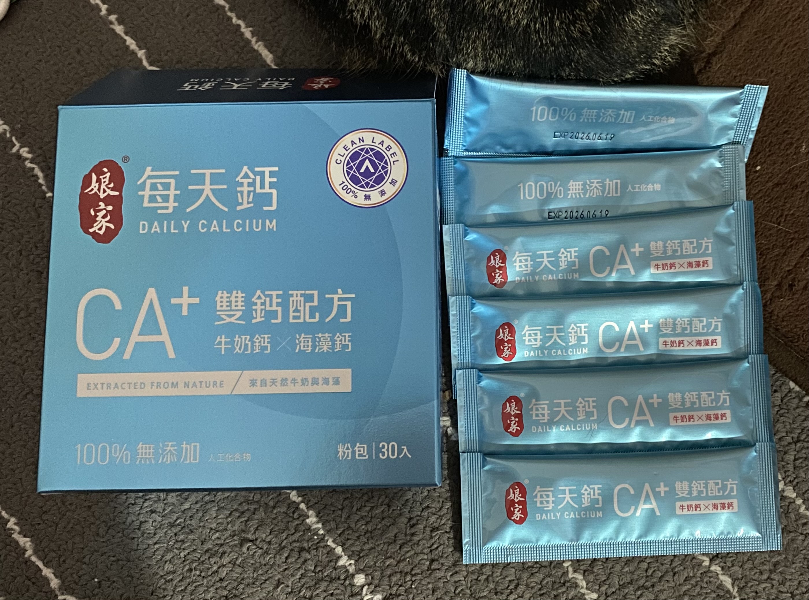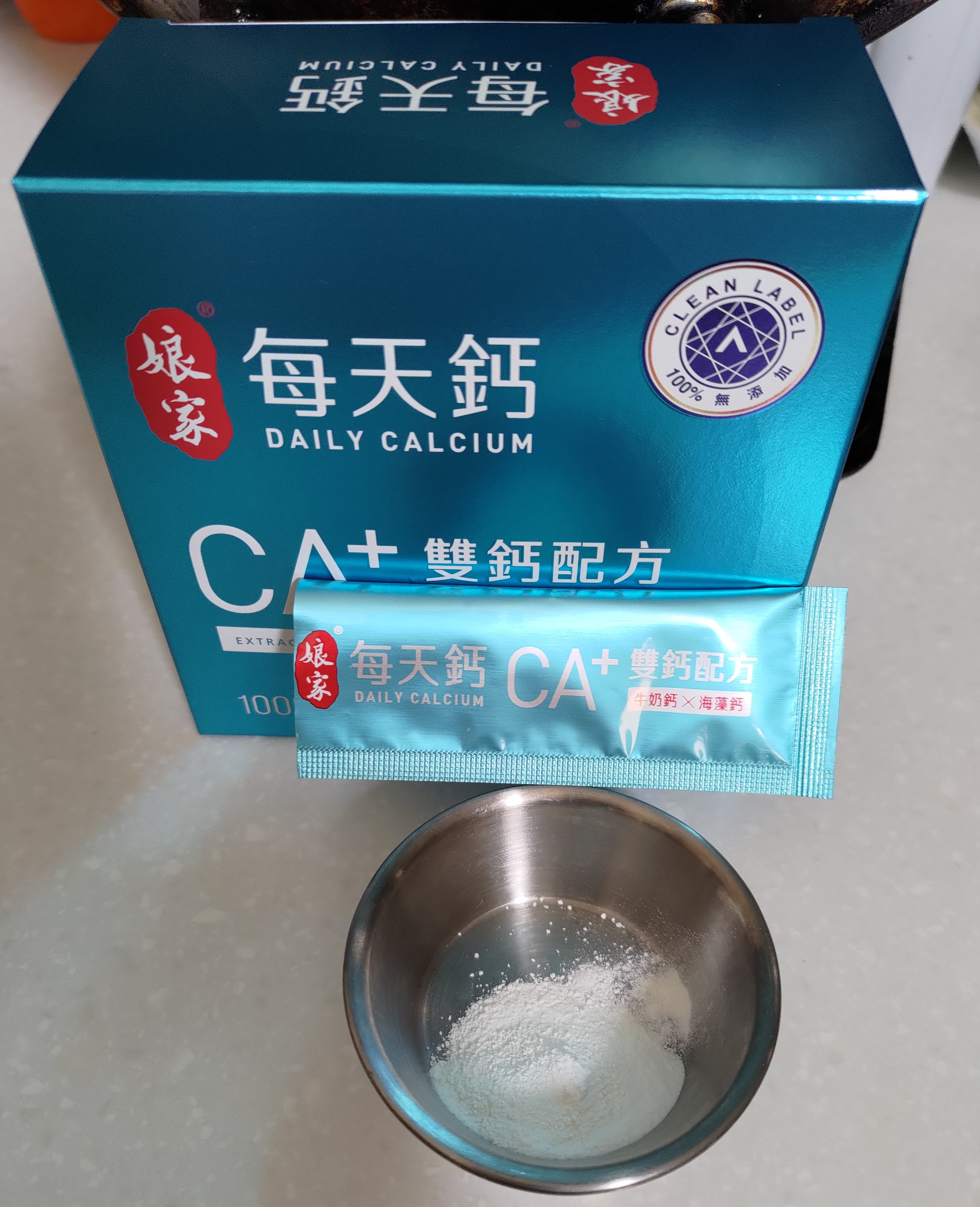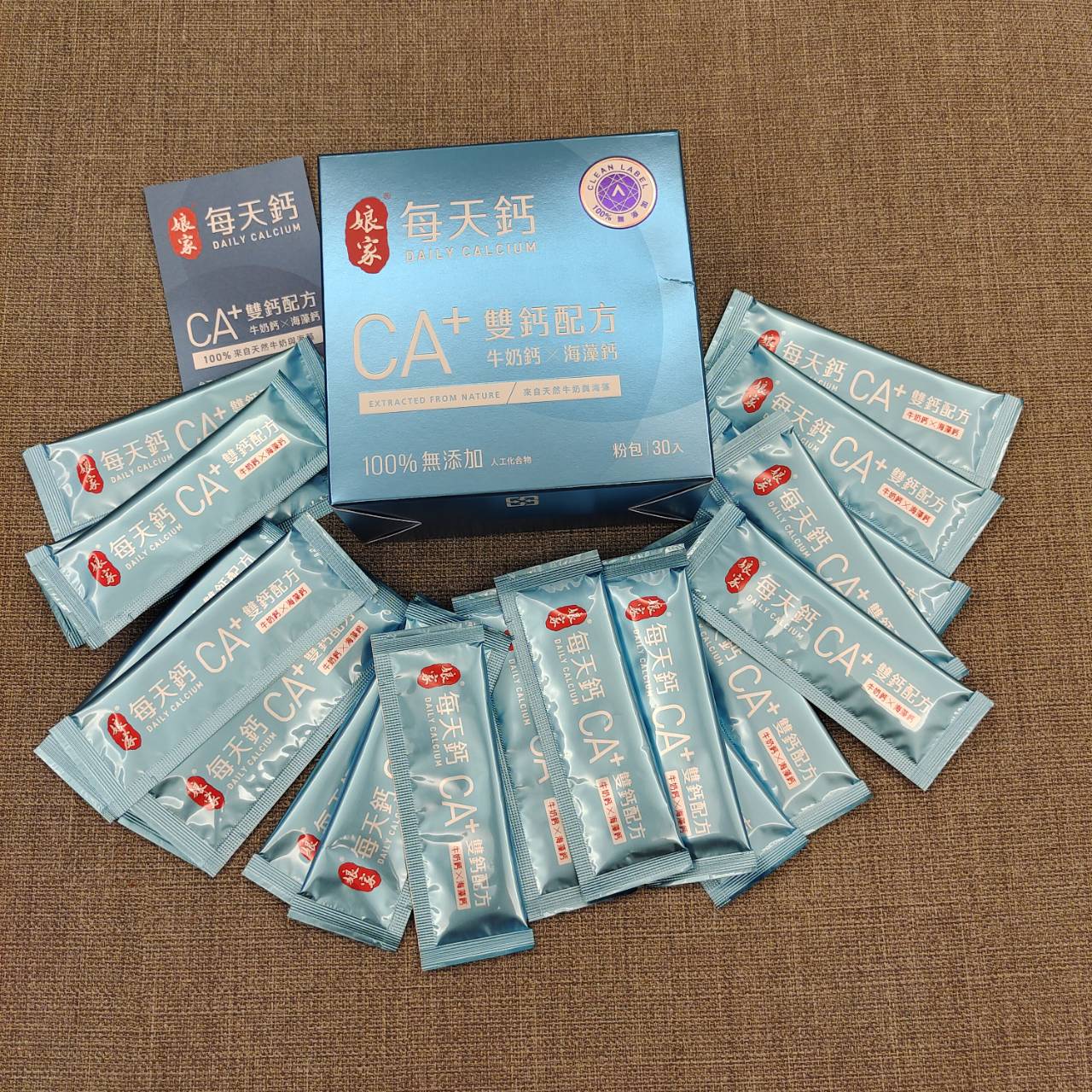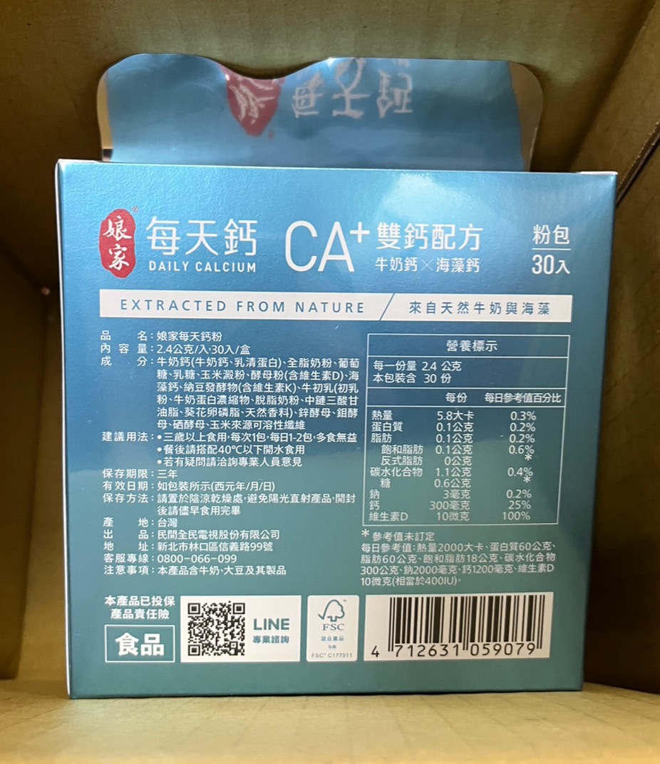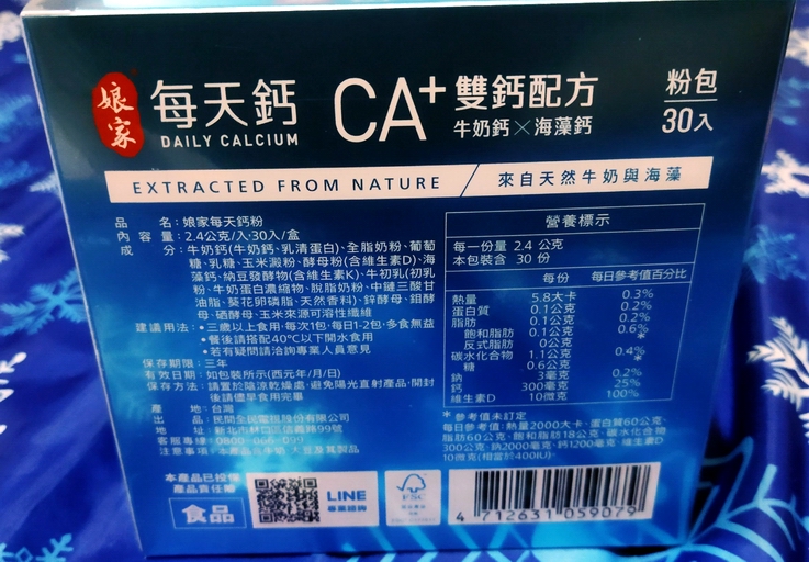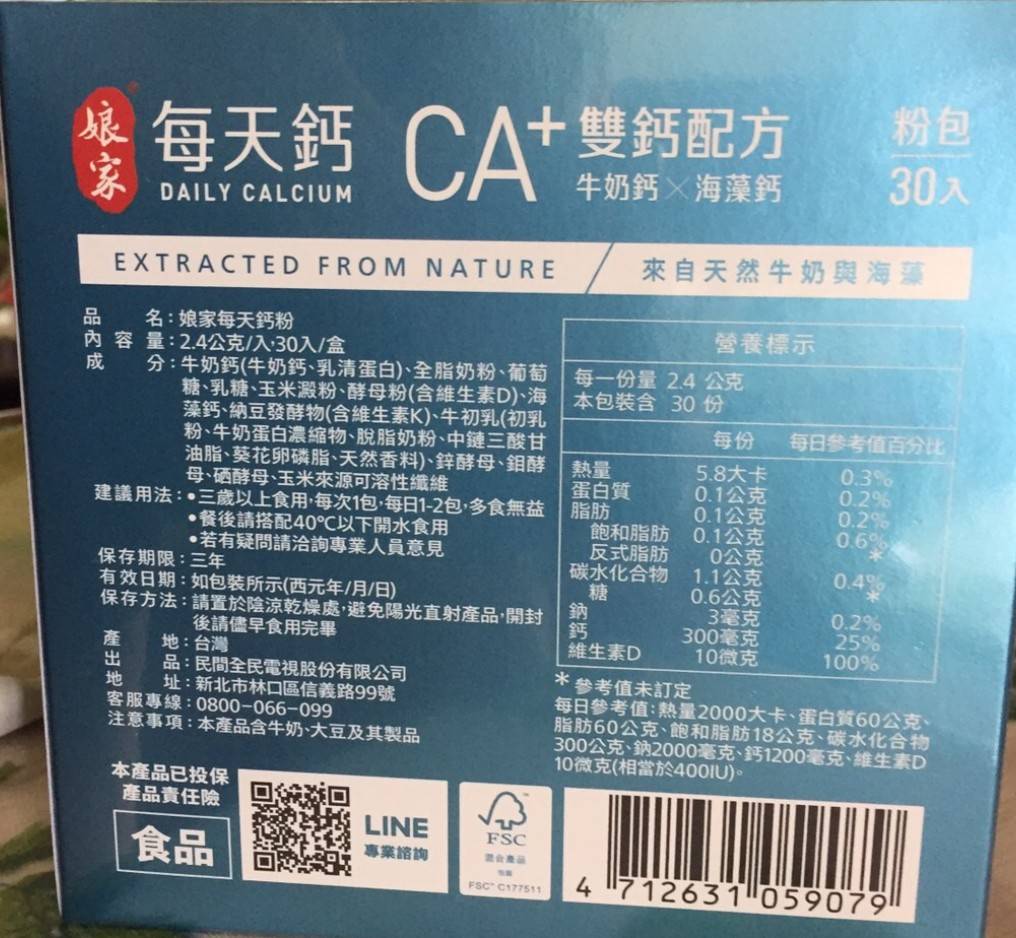 牛奶鈣(牛奶鈣、乳清蛋白)、全脂奶粉、葡萄糖、乳糖、玉米澱粉、酵母粉(含維生素D)、海藻鈣、納豆發酵物(含維生素K)、牛初乳(初乳粉、牛奶蛋白濃縮物、脫脂奶粉、中鏈三酸甘油脂、葵花卵磷脂、天然香料)、鋅酵母、鉬酵母、硒酵母、玉米來源可溶性纖維。