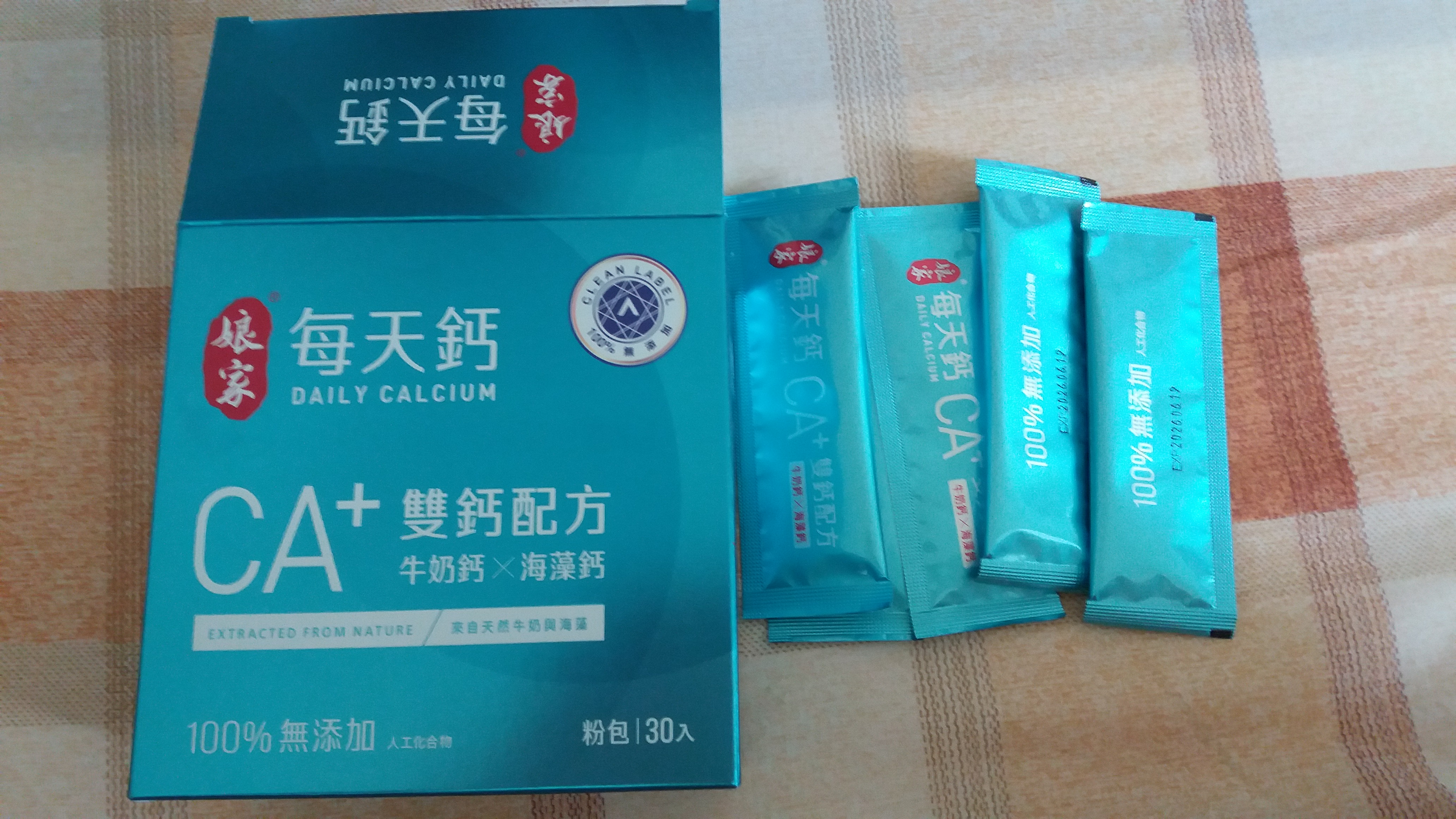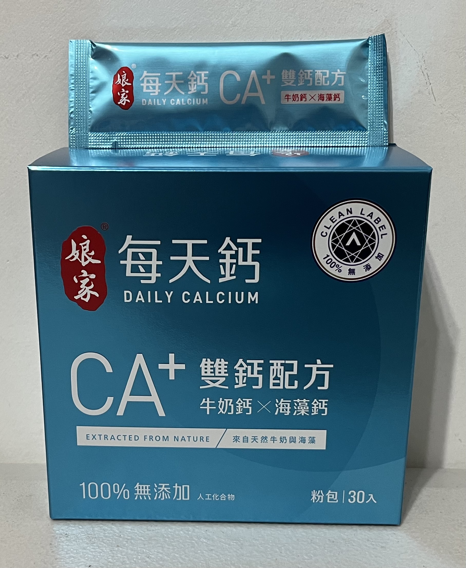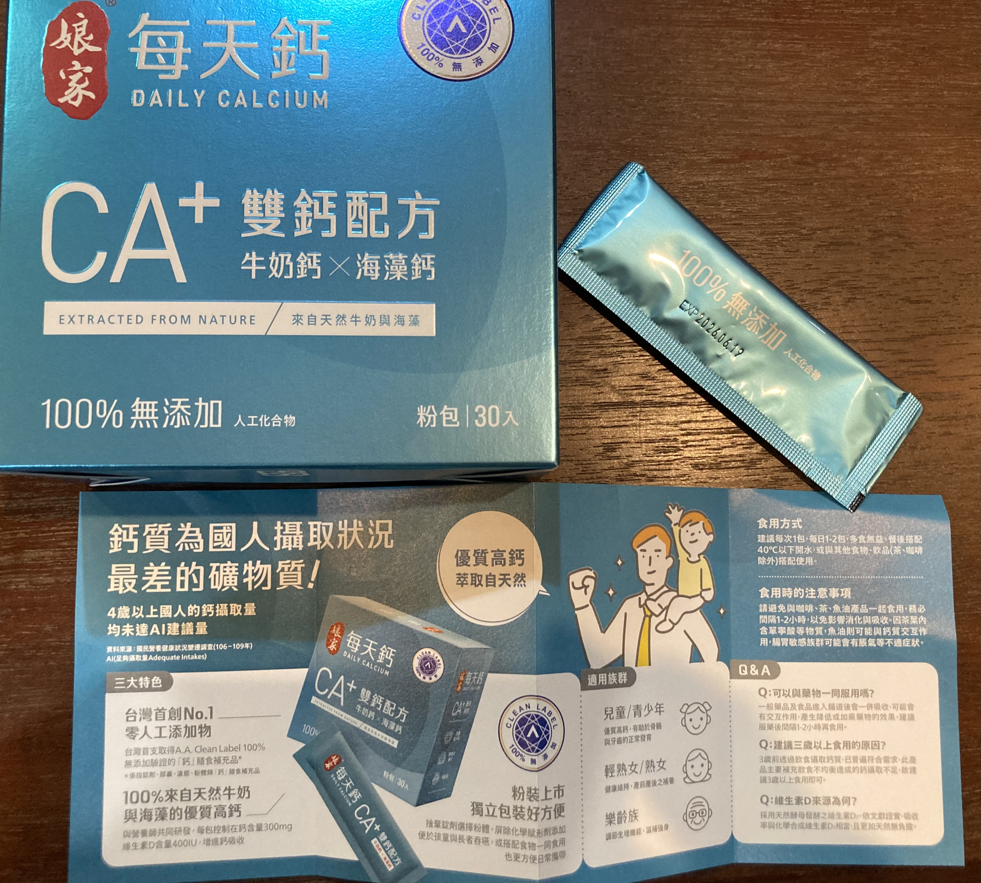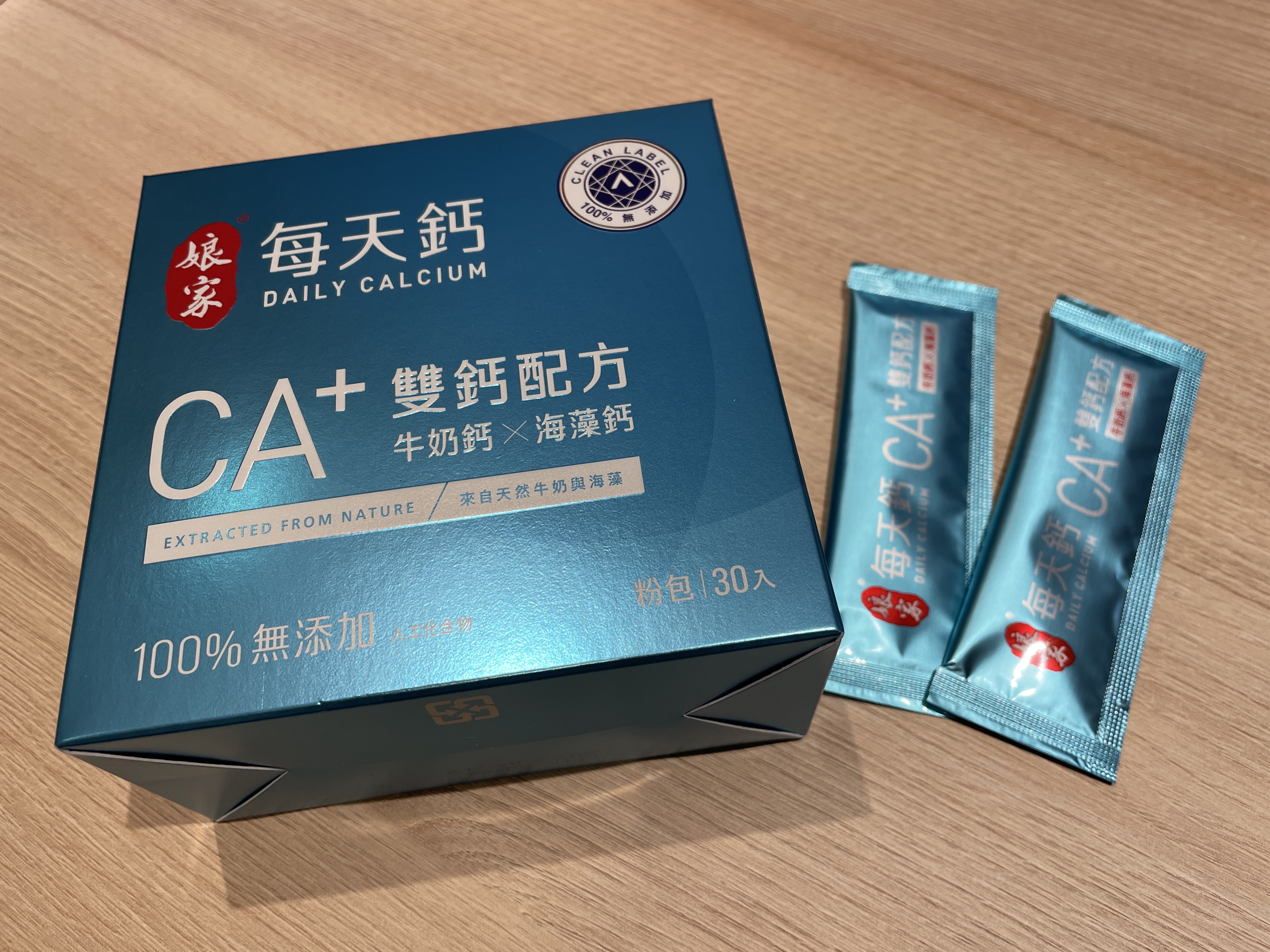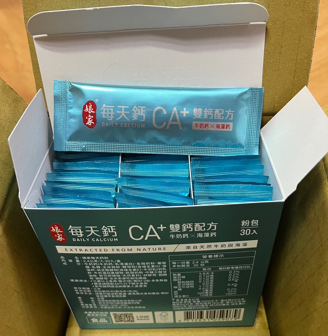 牛奶鈣(牛奶鈣、乳清蛋白)、全脂奶粉、葡萄糖、乳糖、玉米澱粉、酵母粉(含維生素D)、海藻鈣、納豆發酵物(含維生素K)、牛初乳(初乳粉、牛奶蛋白濃縮物、脫脂奶粉、中鏈三酸甘油脂、葵花卵磷脂、天然香料)、鋅酵母、鉬酵母、硒酵母、玉米來源可溶性纖維。